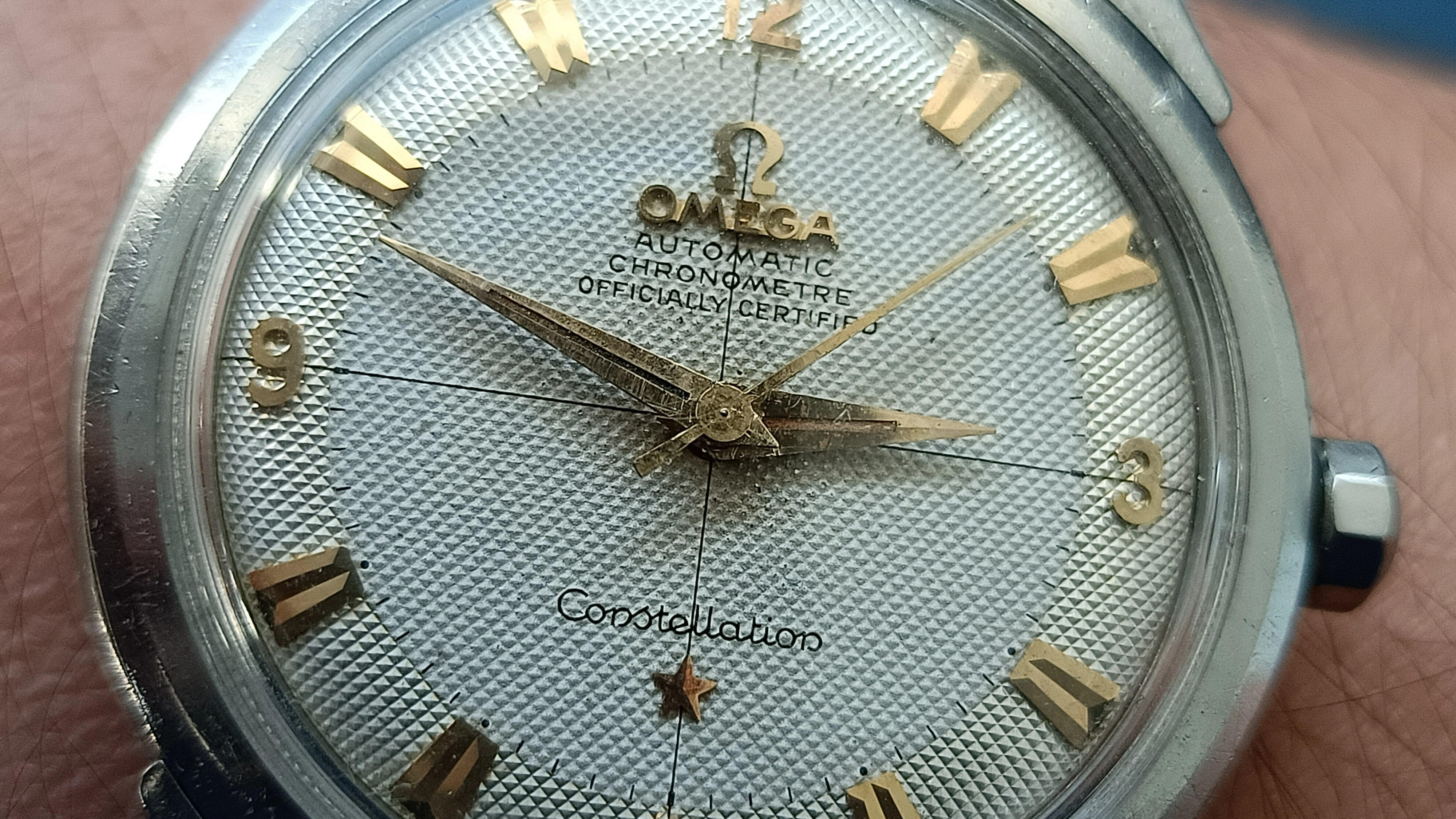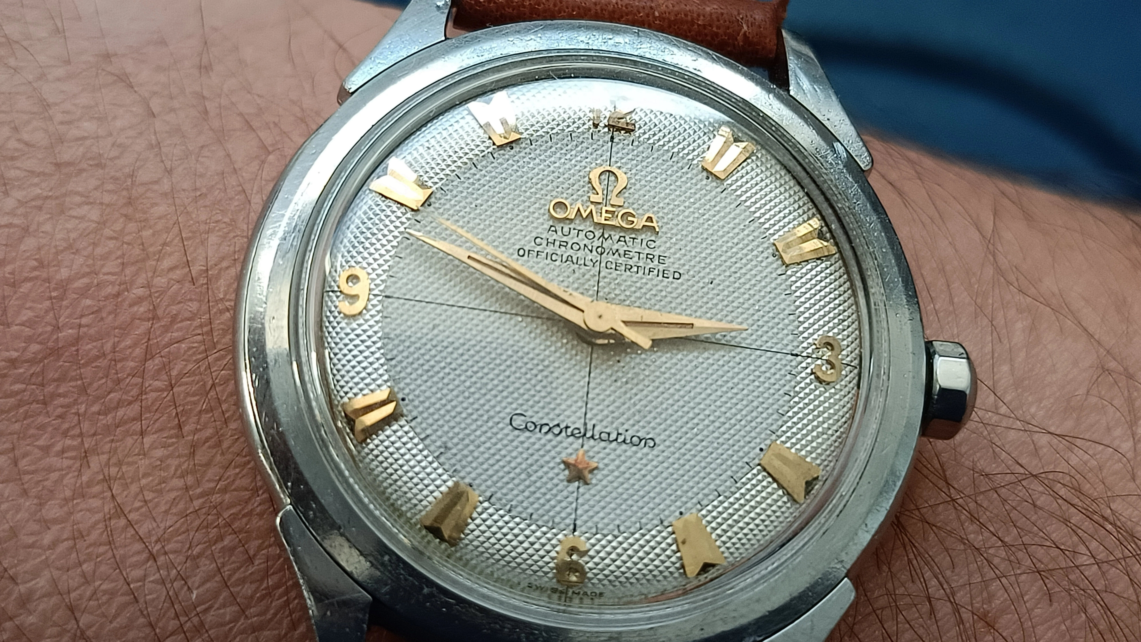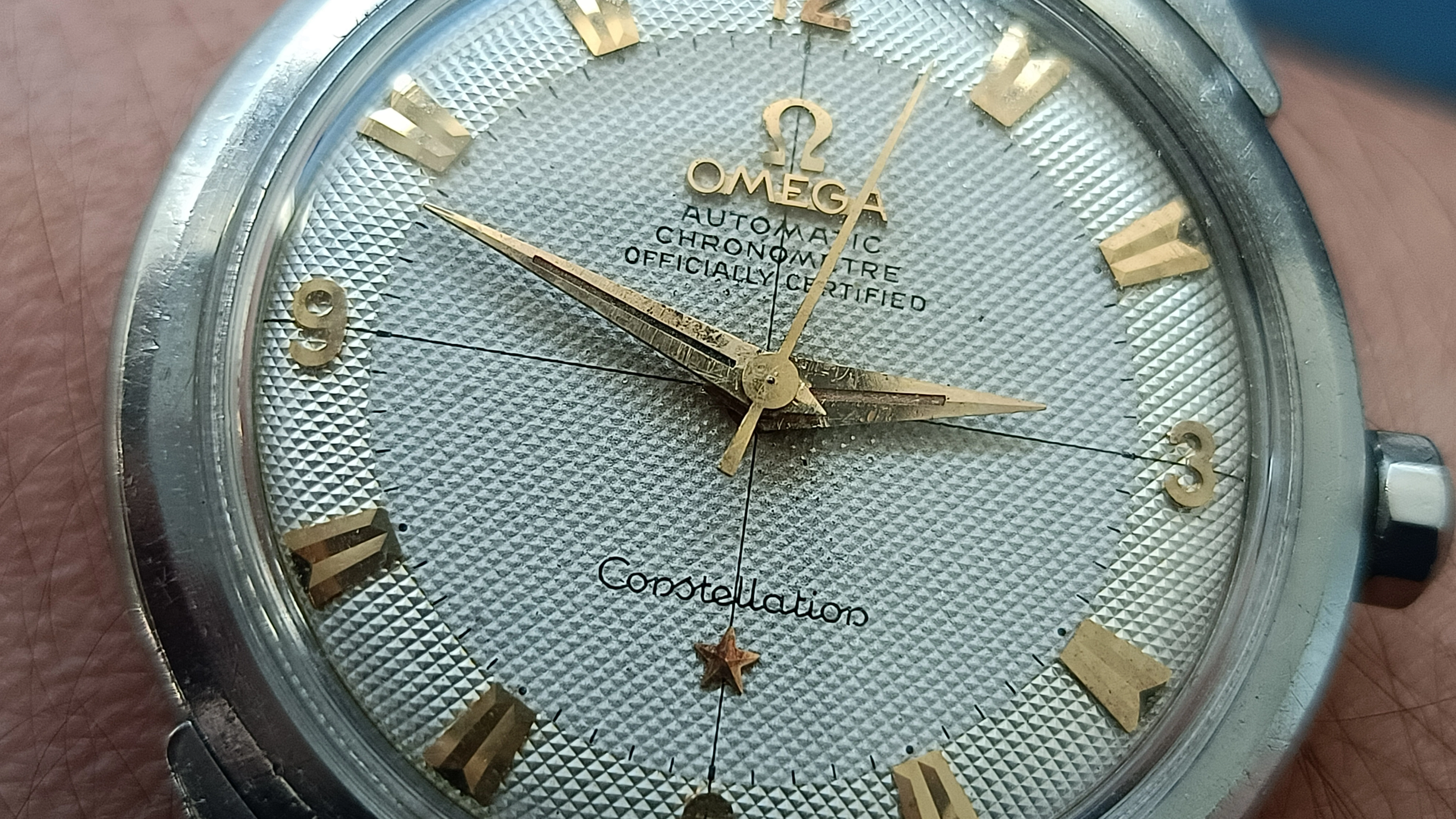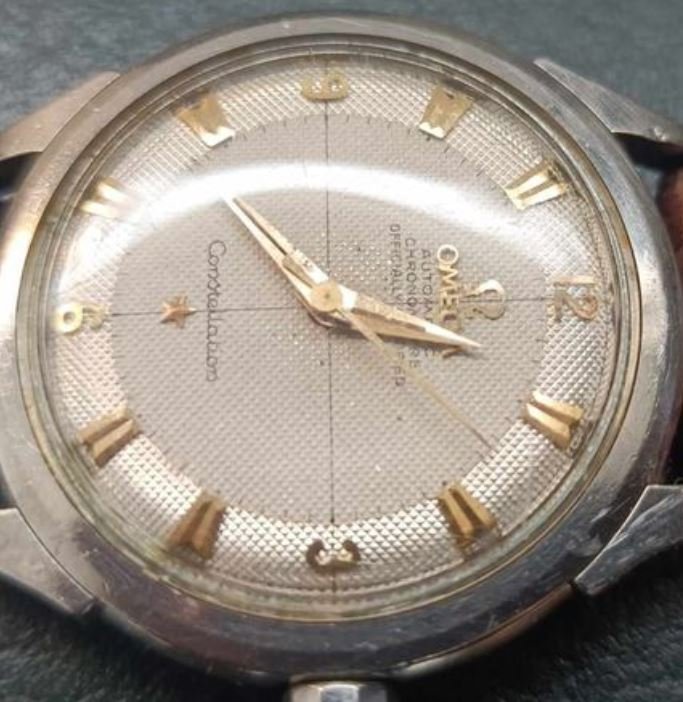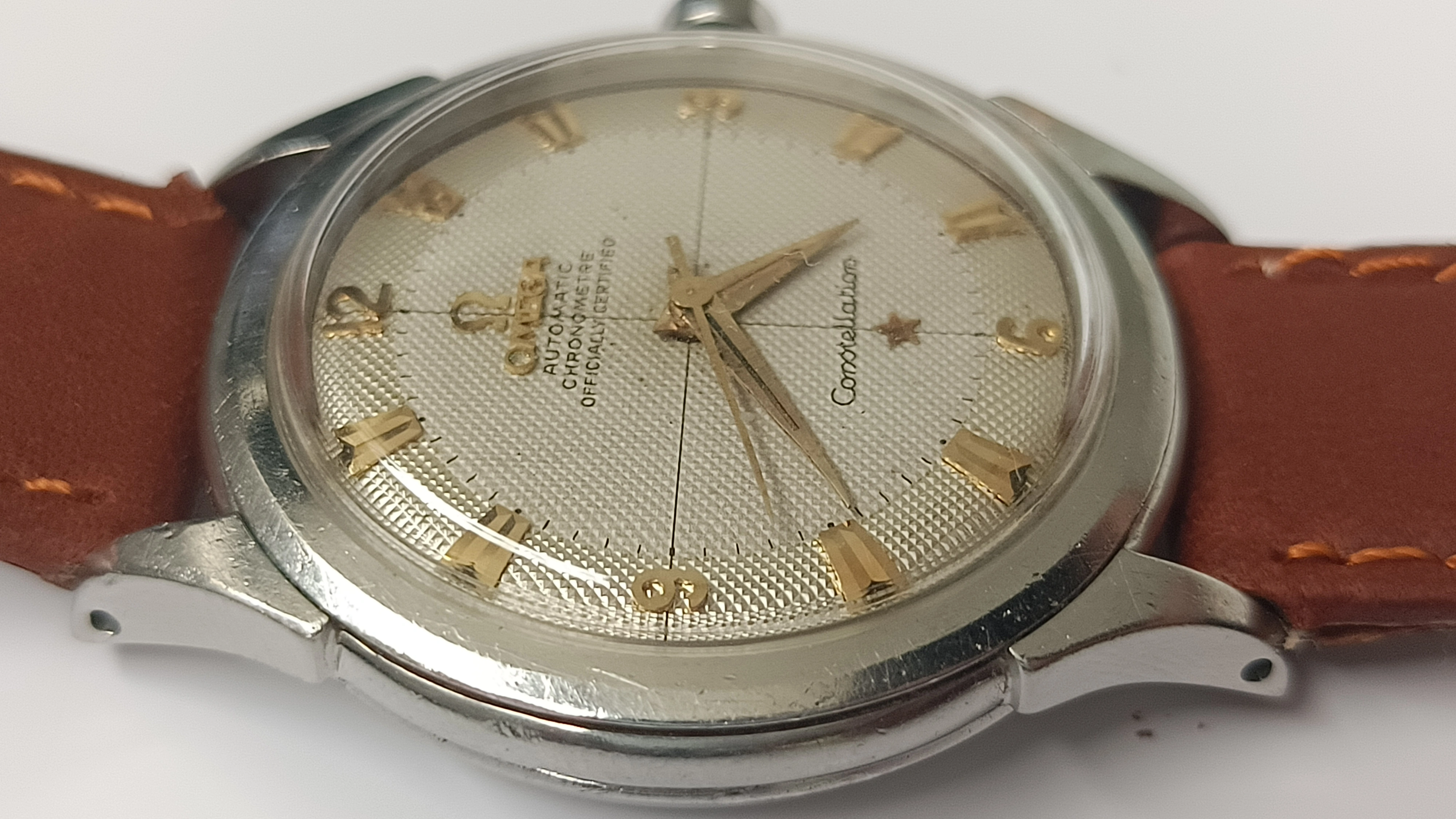 ·1956 Omega Constellation with an uncommon two-tone honeycomb crosshair dial, and flat-foot Omega signed decagon crown.