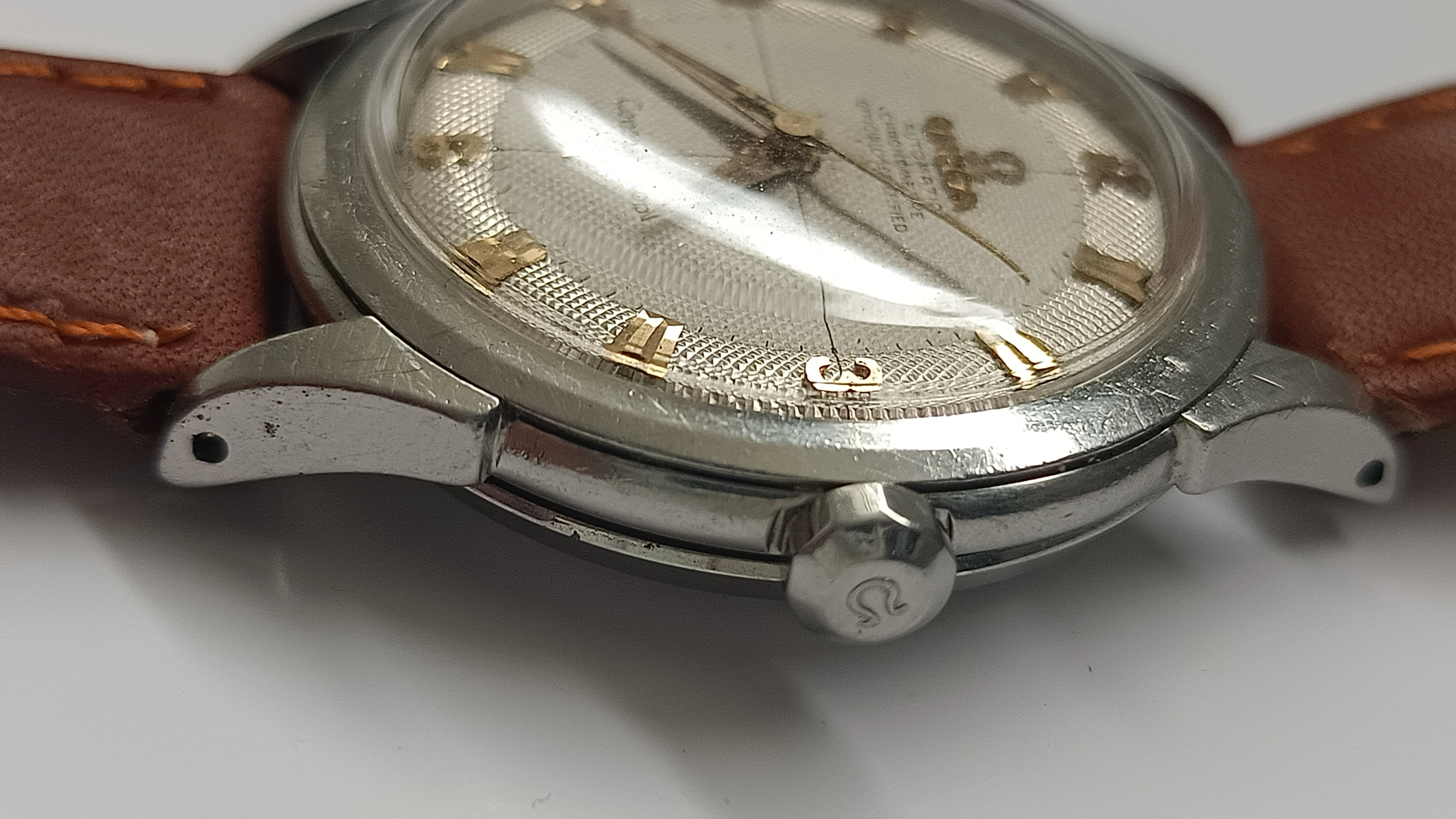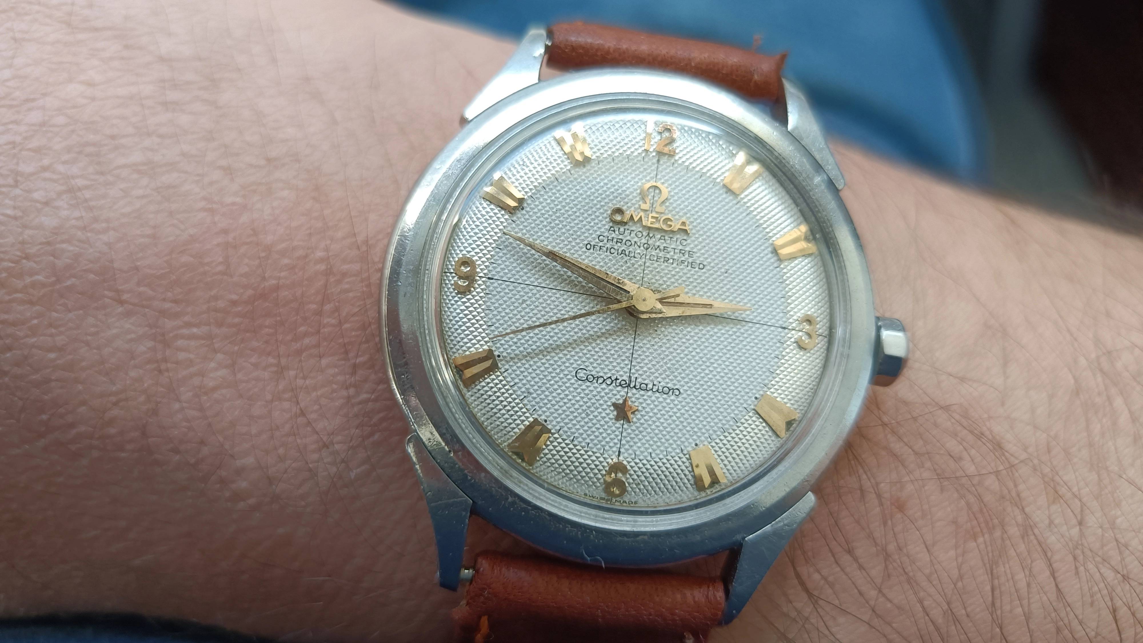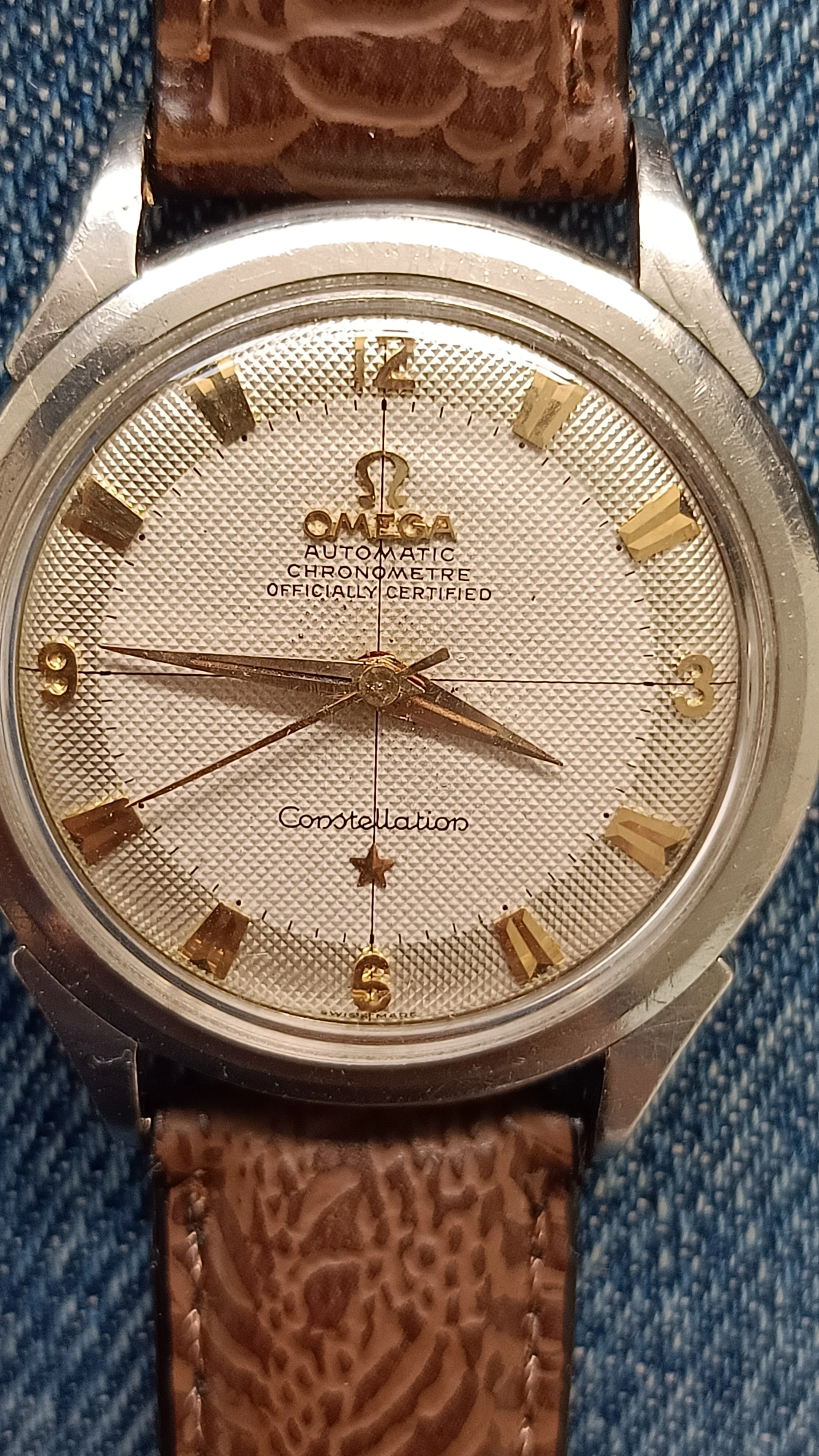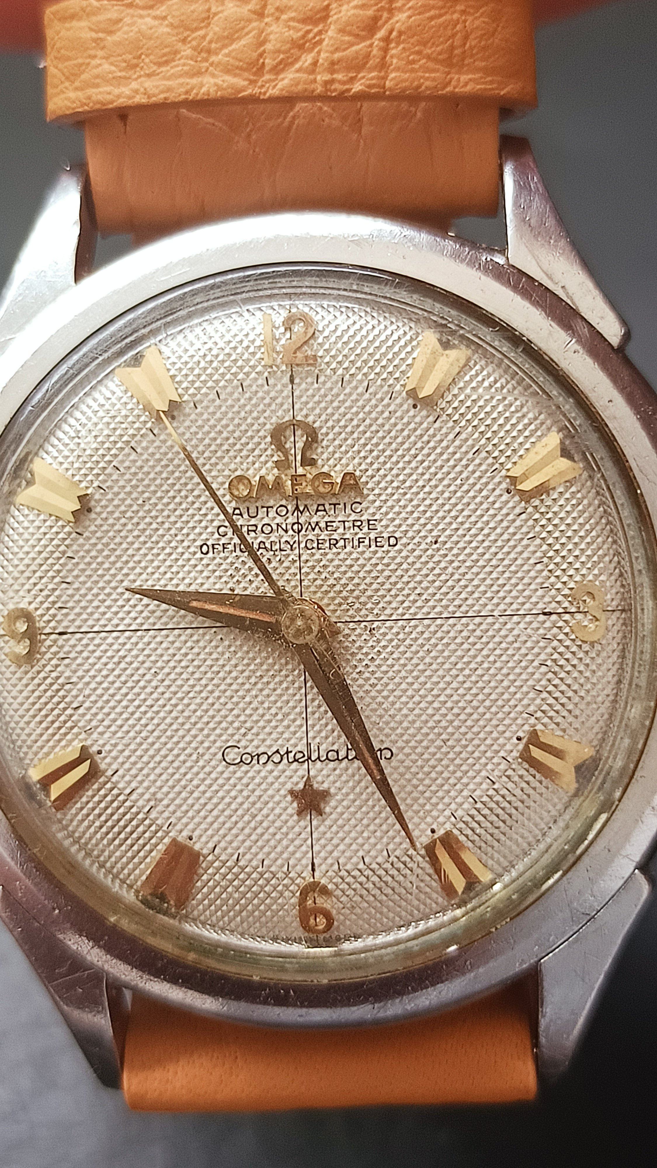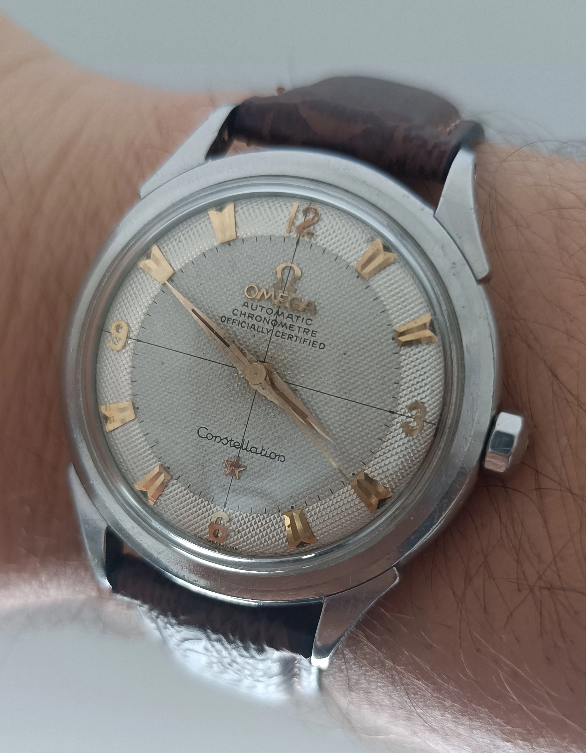 ·1956 Omega Constellation with an uncommon two-tone honeycomb crosshair dial, and flat-foot Omega signed decagon crown.
