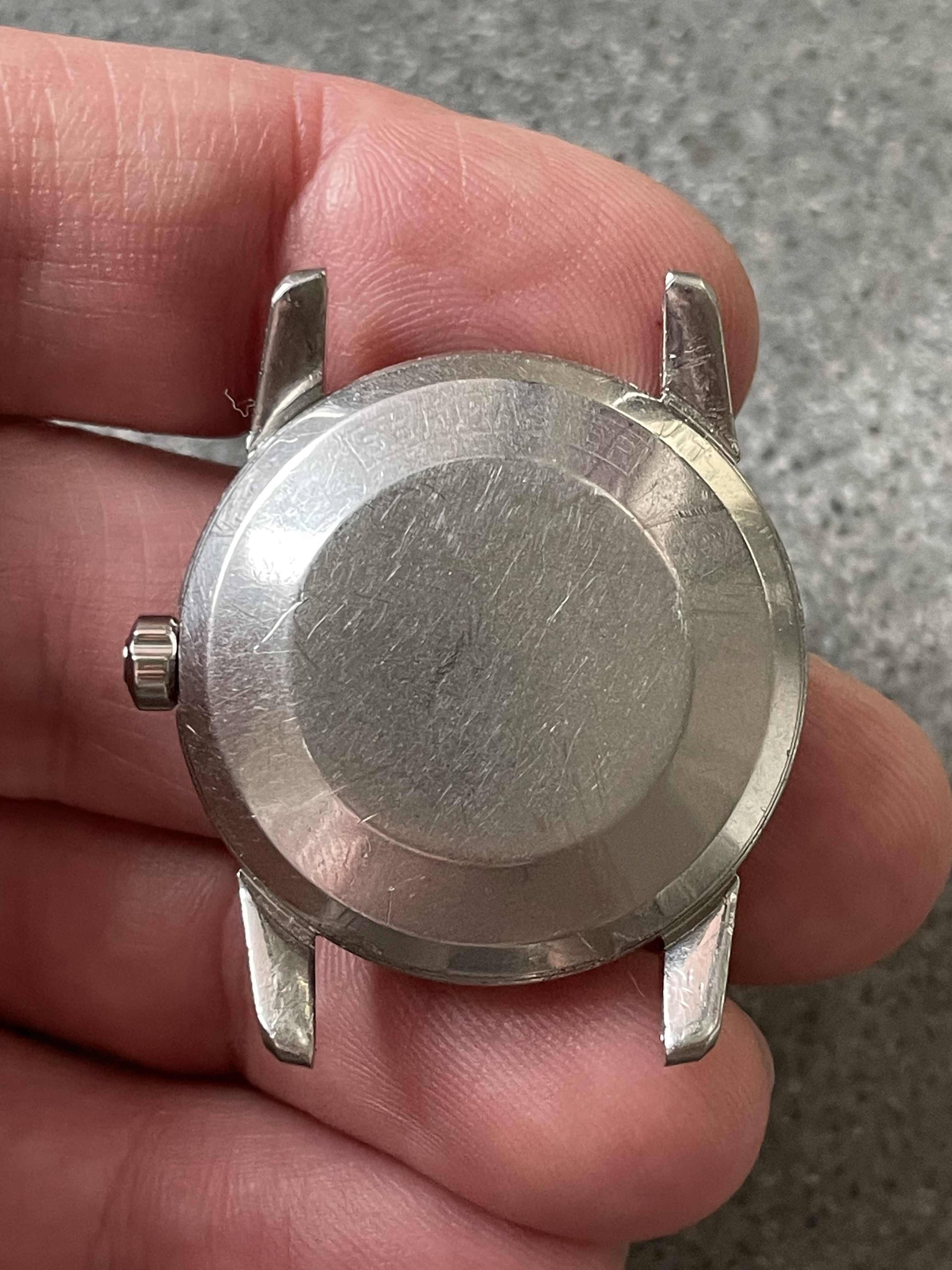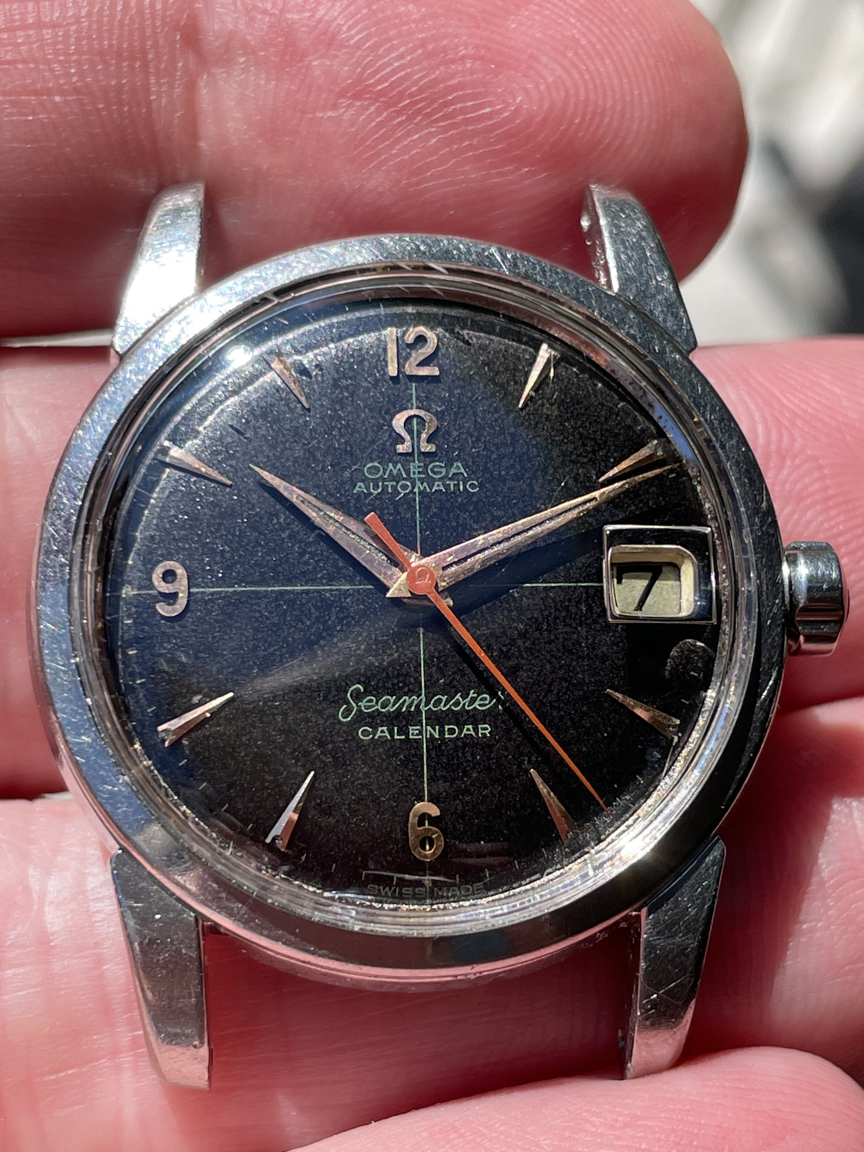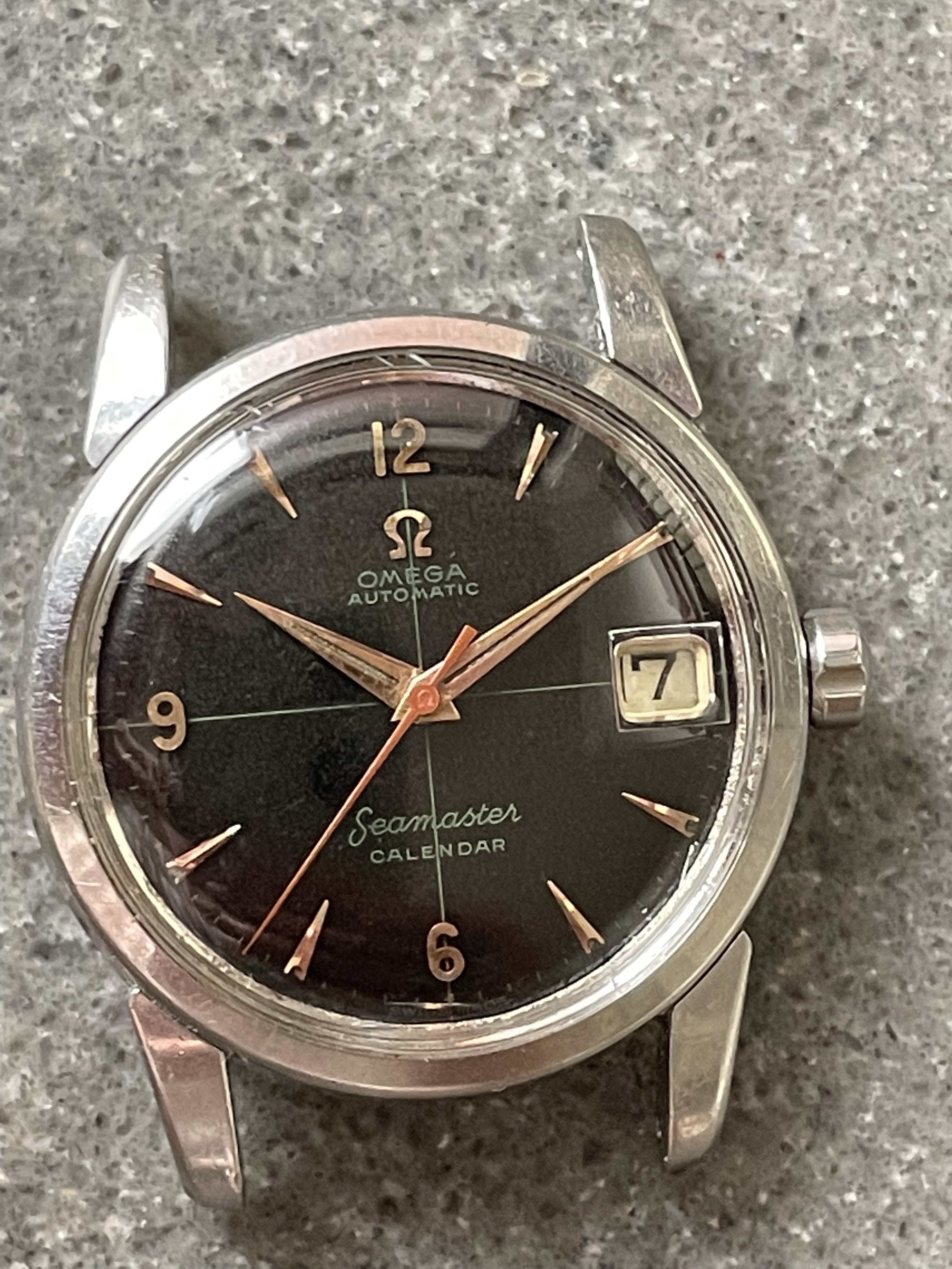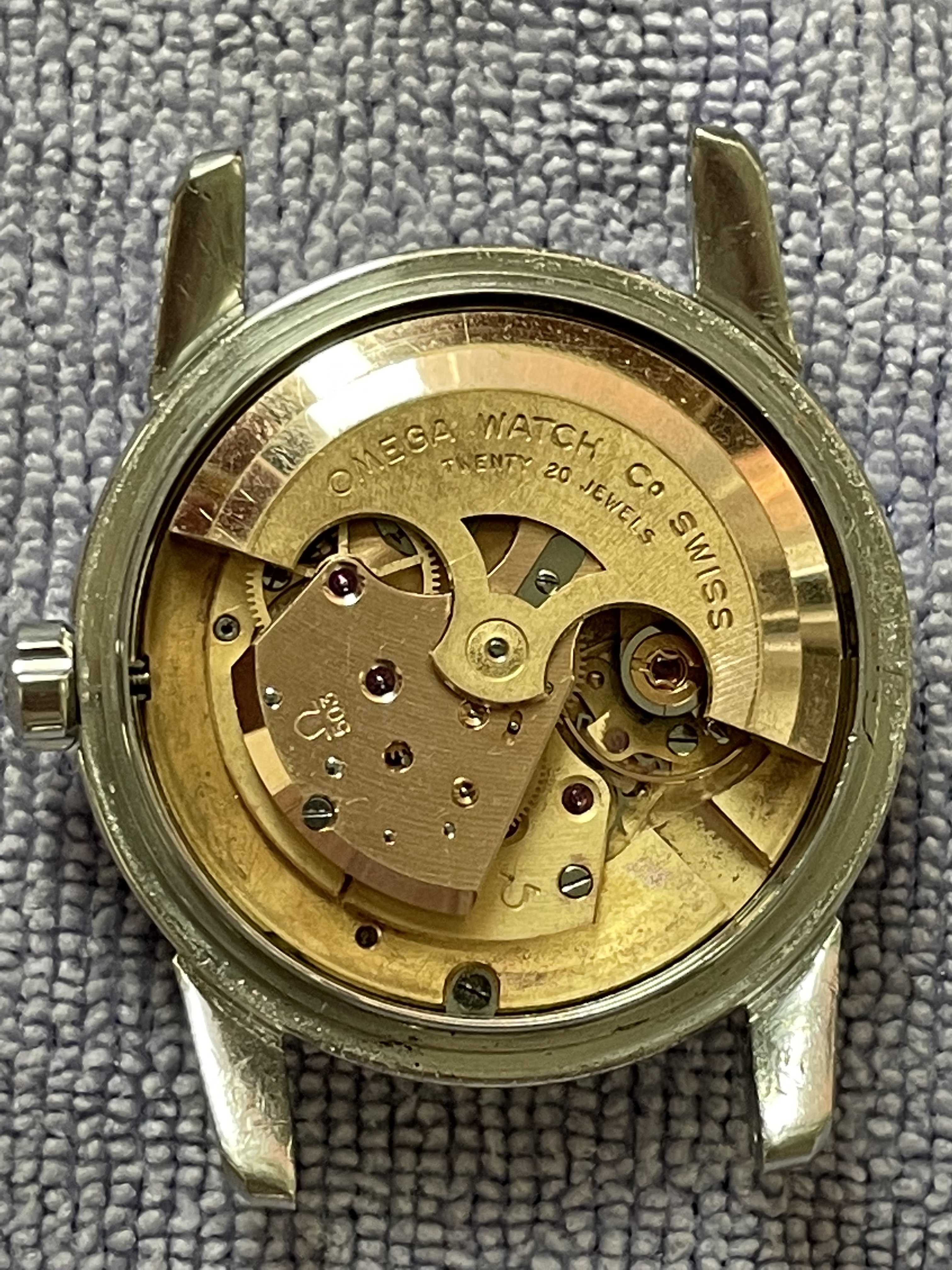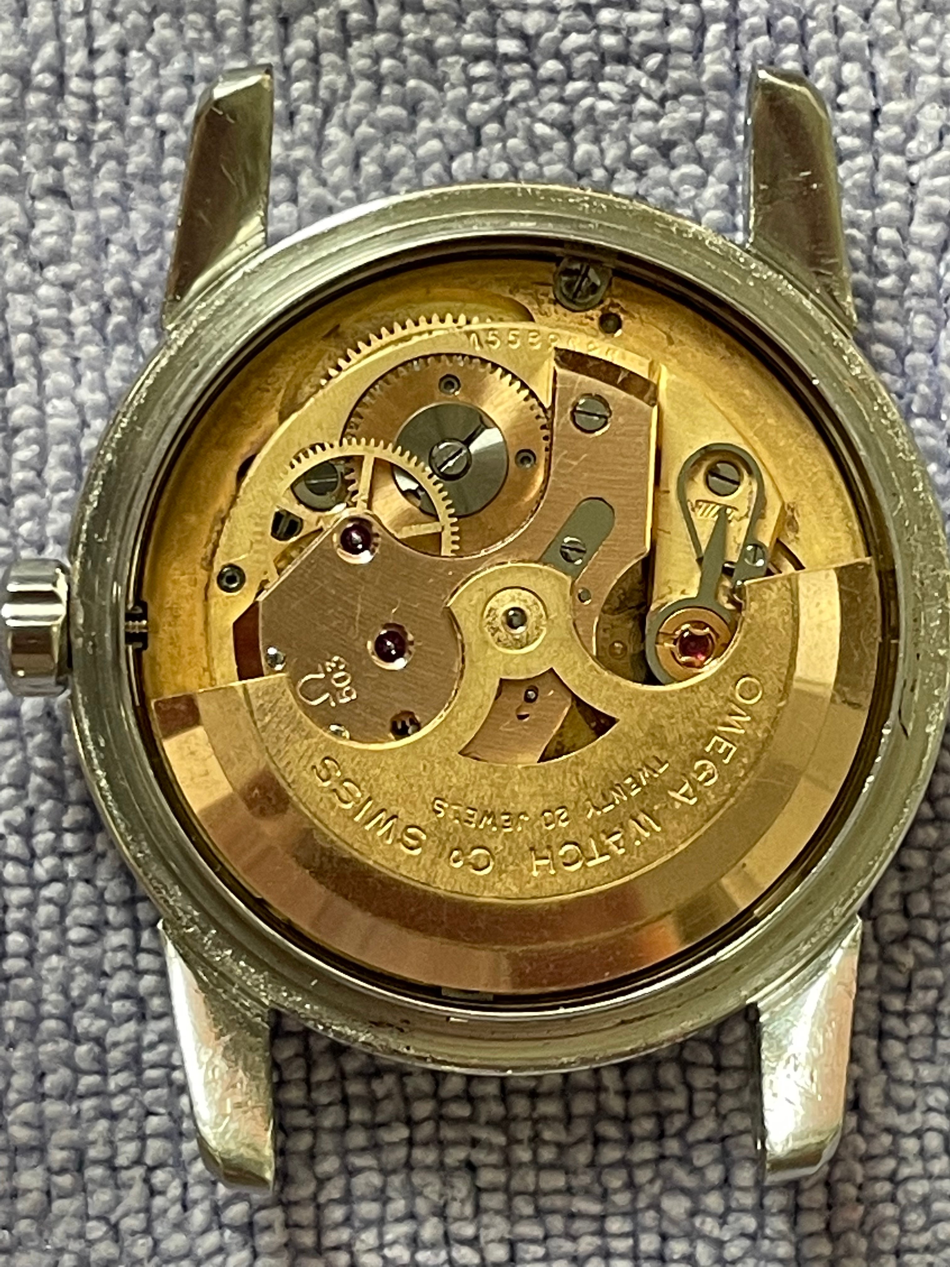 ·CASE: 34mm steel case is in good condition for an object pushing 70 yrs. I'm emphatically not the original owner (I was -22 when it was made), so I have no idea of its history, but it appears to me not to have been polished—the bevels on the outer lug edges are usually the first to go when these cases see a wheel, but the ones on this case are still evident. The caseback etching is still discernable though *very* light. The crown is a clover-leaf, though I'm fairly sure it's a service model, given the logo. The crystal's got a cyclops at 3 and has the Omega symbol; given the markings in the caseback, this was clearly very loved by someone for a very long time.