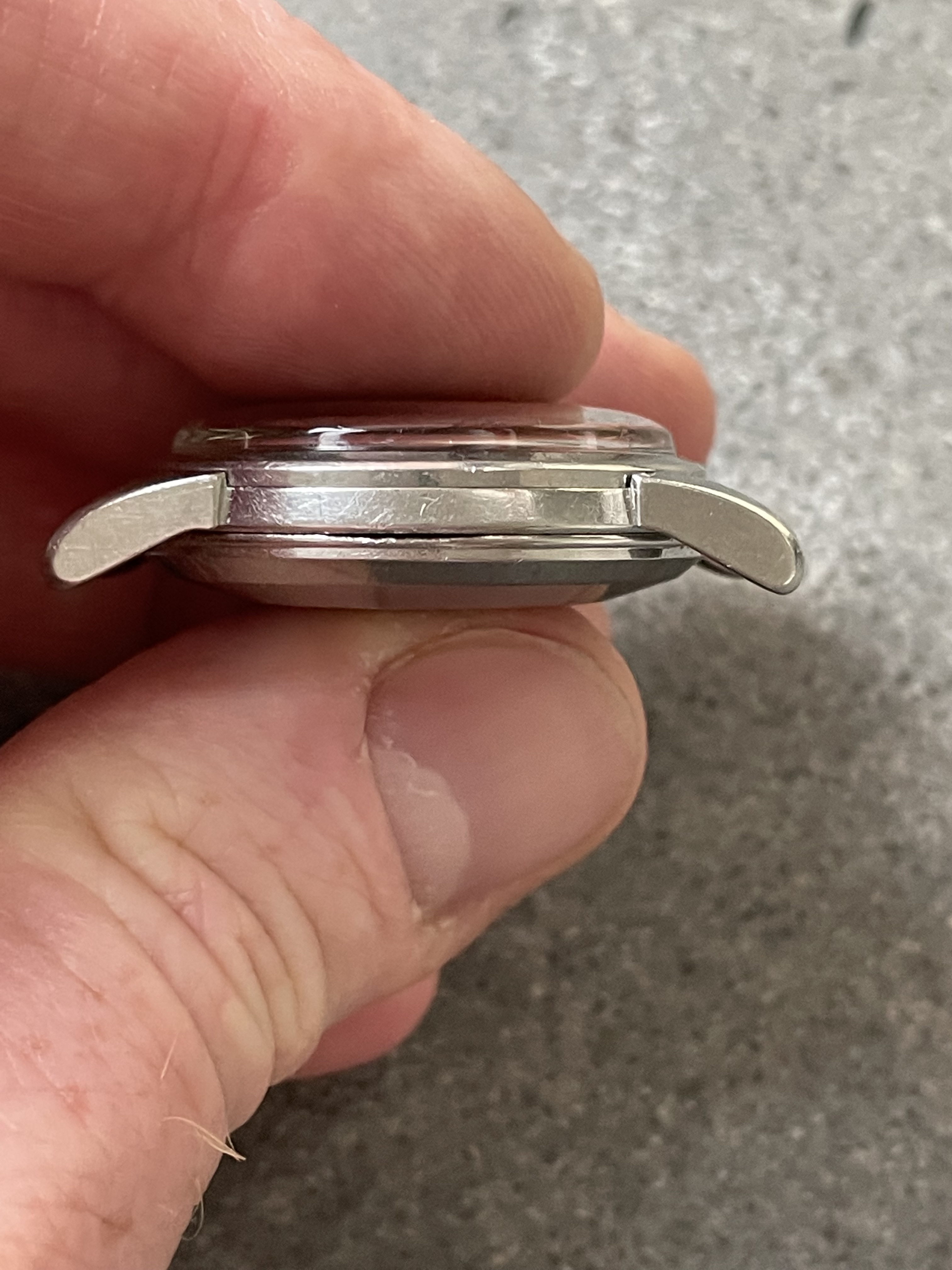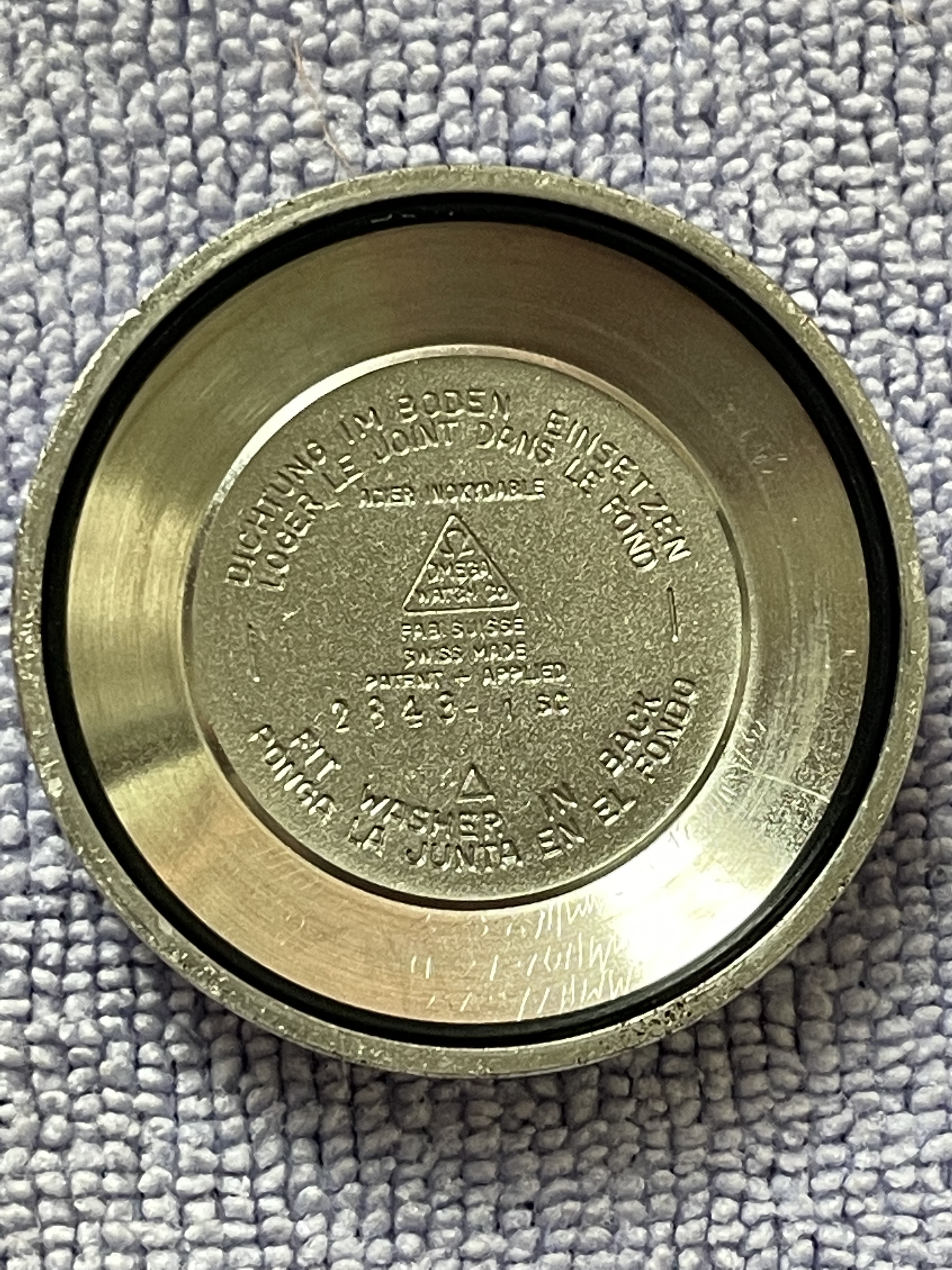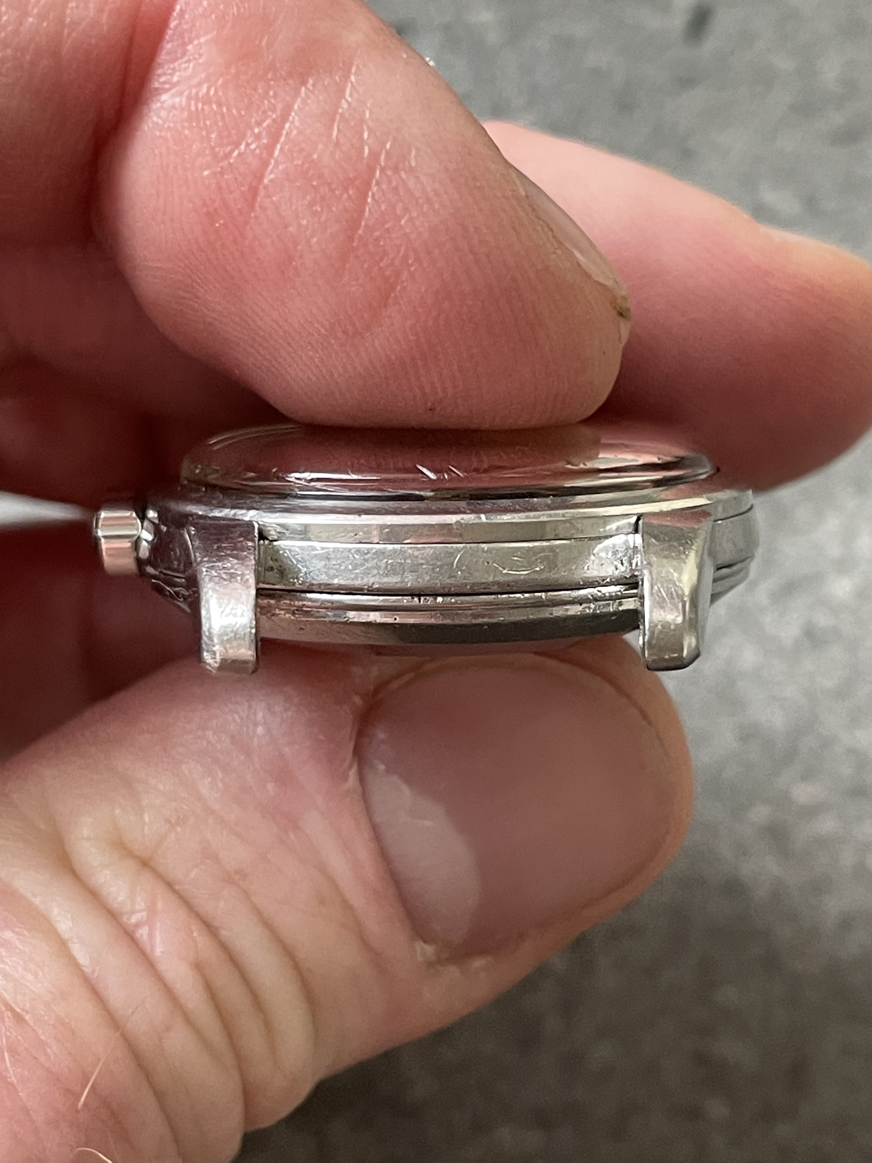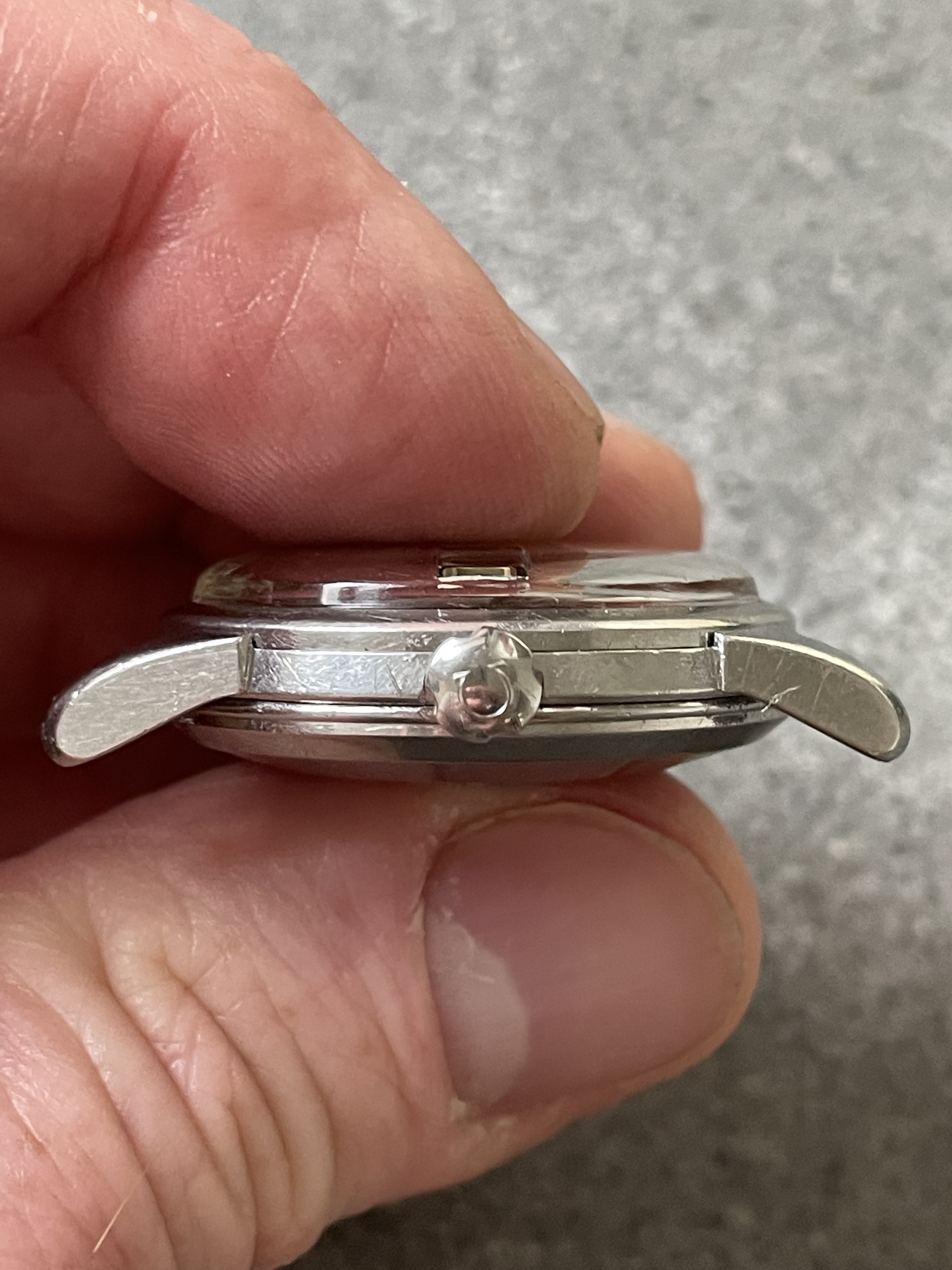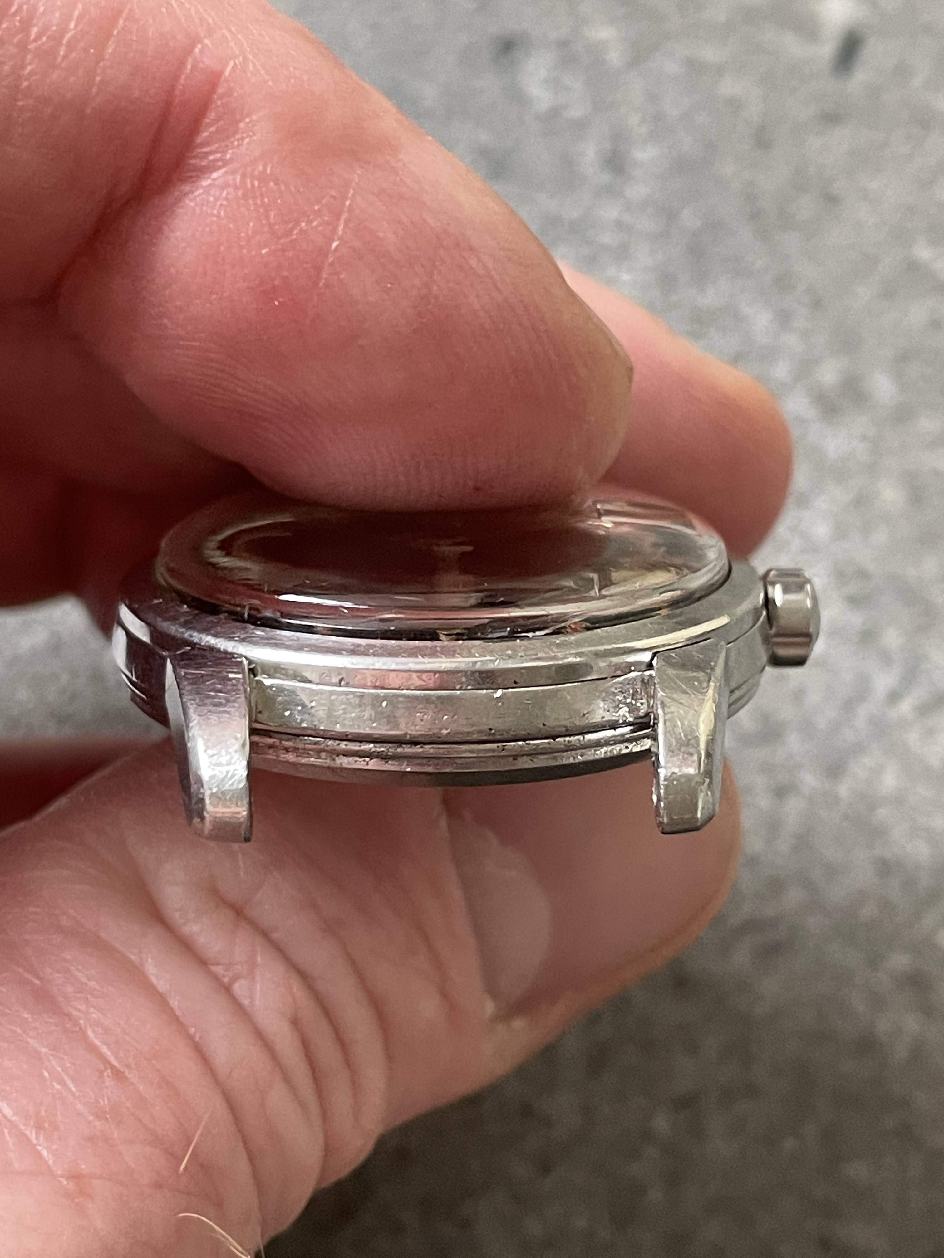 ·CASE: 34mm steel case is in good condition for an object pushing 70 yrs. I'm emphatically not the original owner (I was -22 when it was made), so I have no idea of its history, but it appears to me not to have been polished—the bevels on the outer lug edges are usually the first to go when these cases see a wheel, but the ones on this case are still evident. The caseback etching is still discernable though *very* light. The crown is a clover-leaf, though I'm fairly sure it's a service model, given the logo. The crystal's got a cyclops at 3 and has the Omega symbol; given the markings in the caseback, this was clearly very loved by someone for a very long time.
