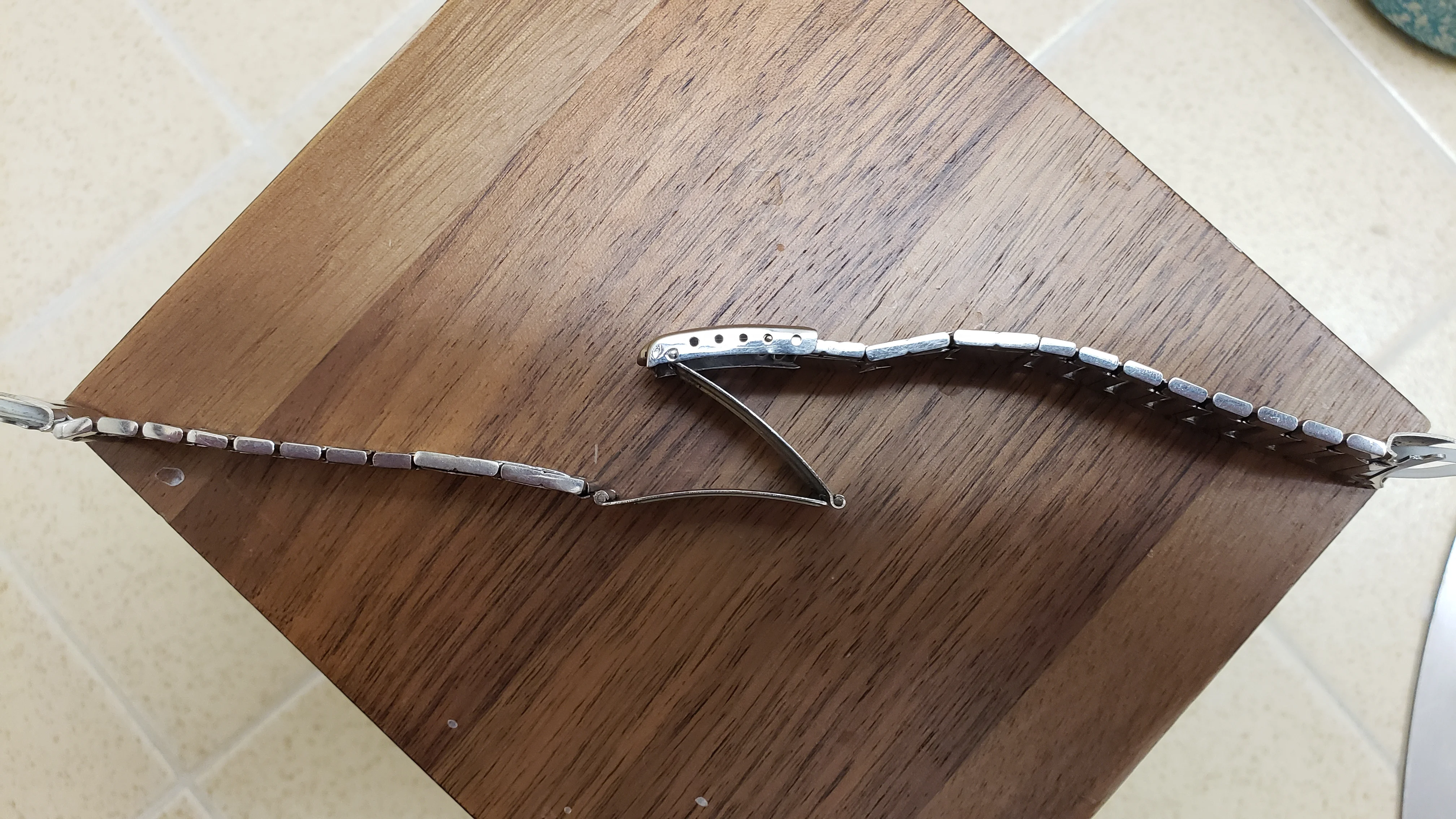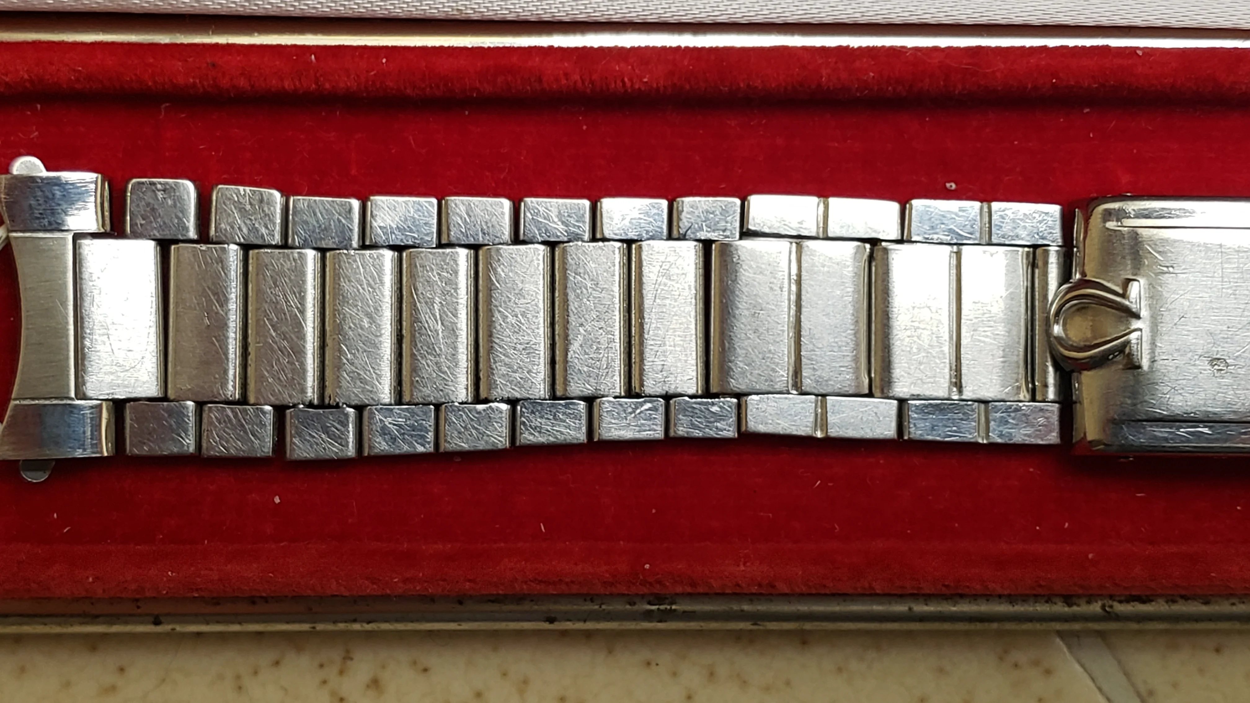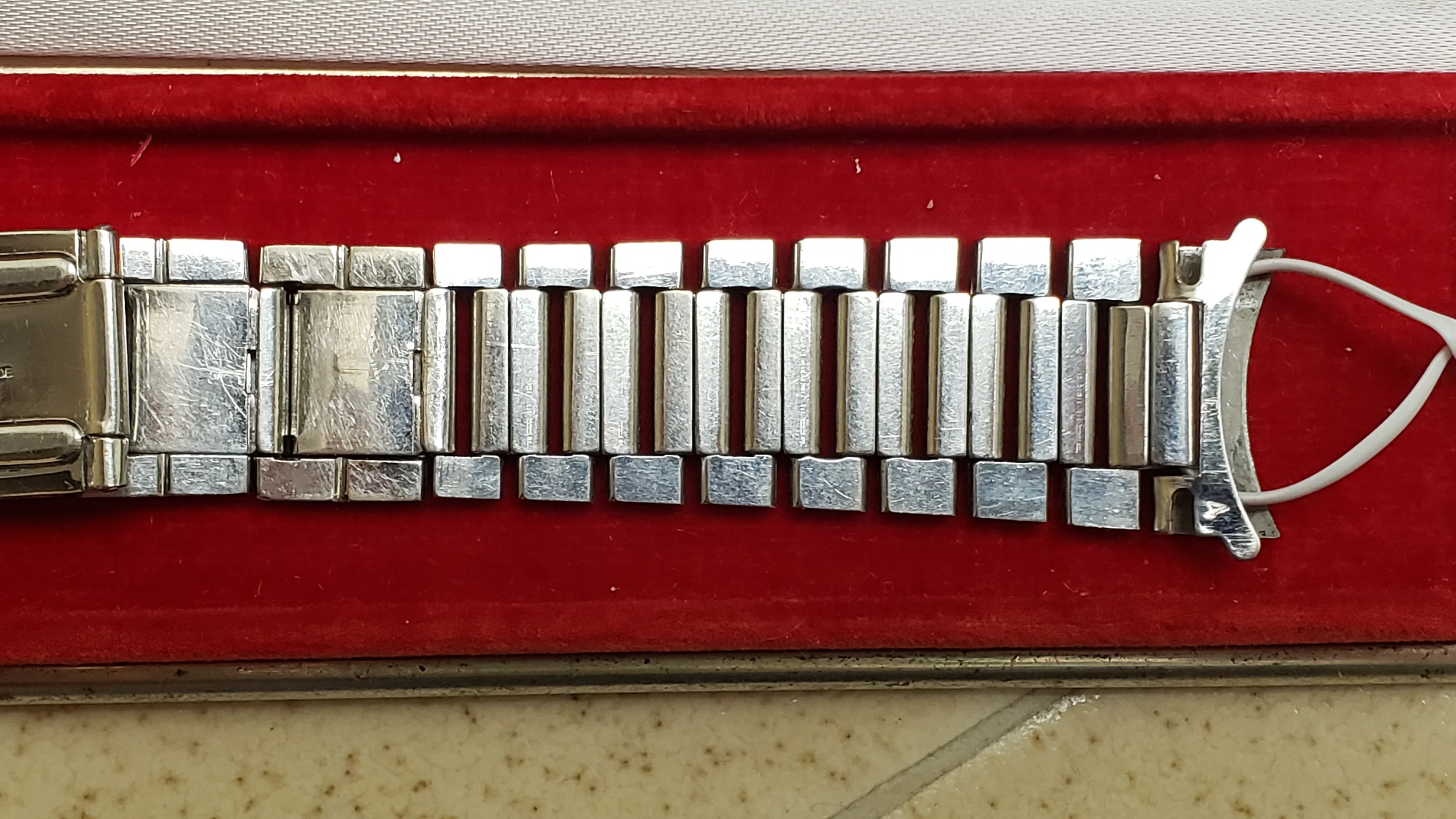 It has a minimal amount of stretch on the 16 solid permanent solid links and the total 5 double spring links have functional springs and stretch and rebound relatively well. The bracelet is unpolished and a couple of the expanding spring links have some wear from previous heavy-handed attempts to open/close the spring compartment.