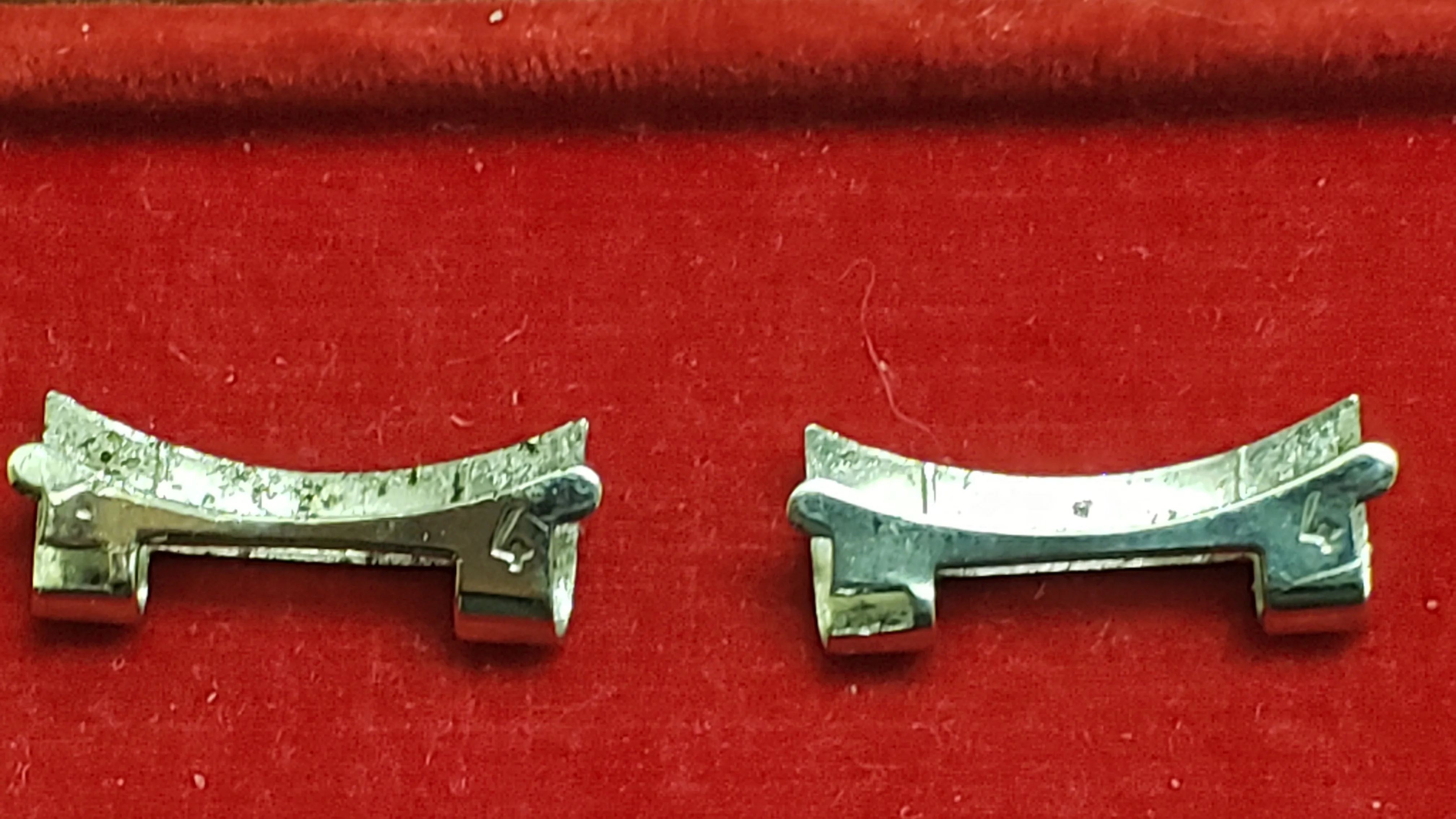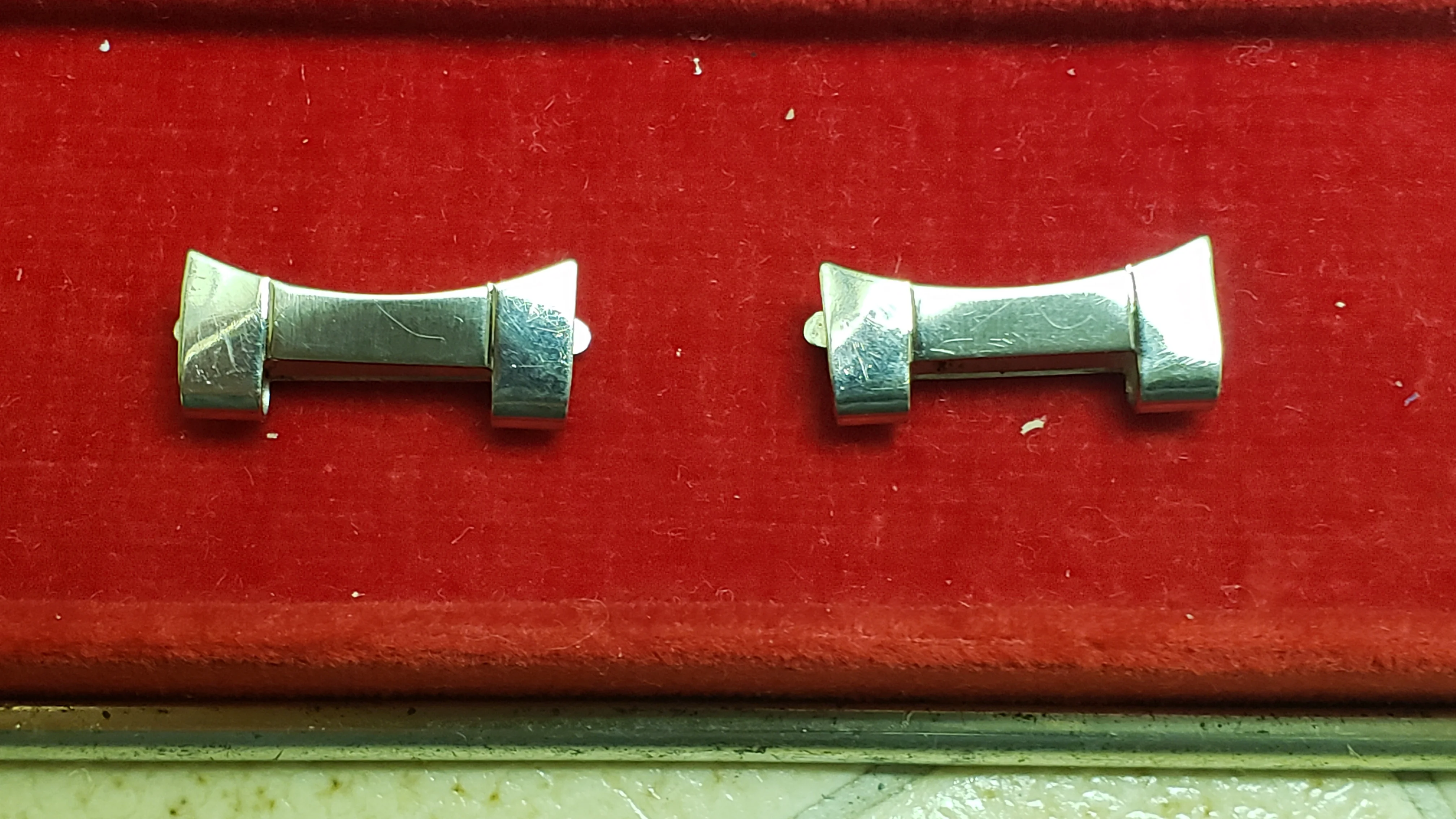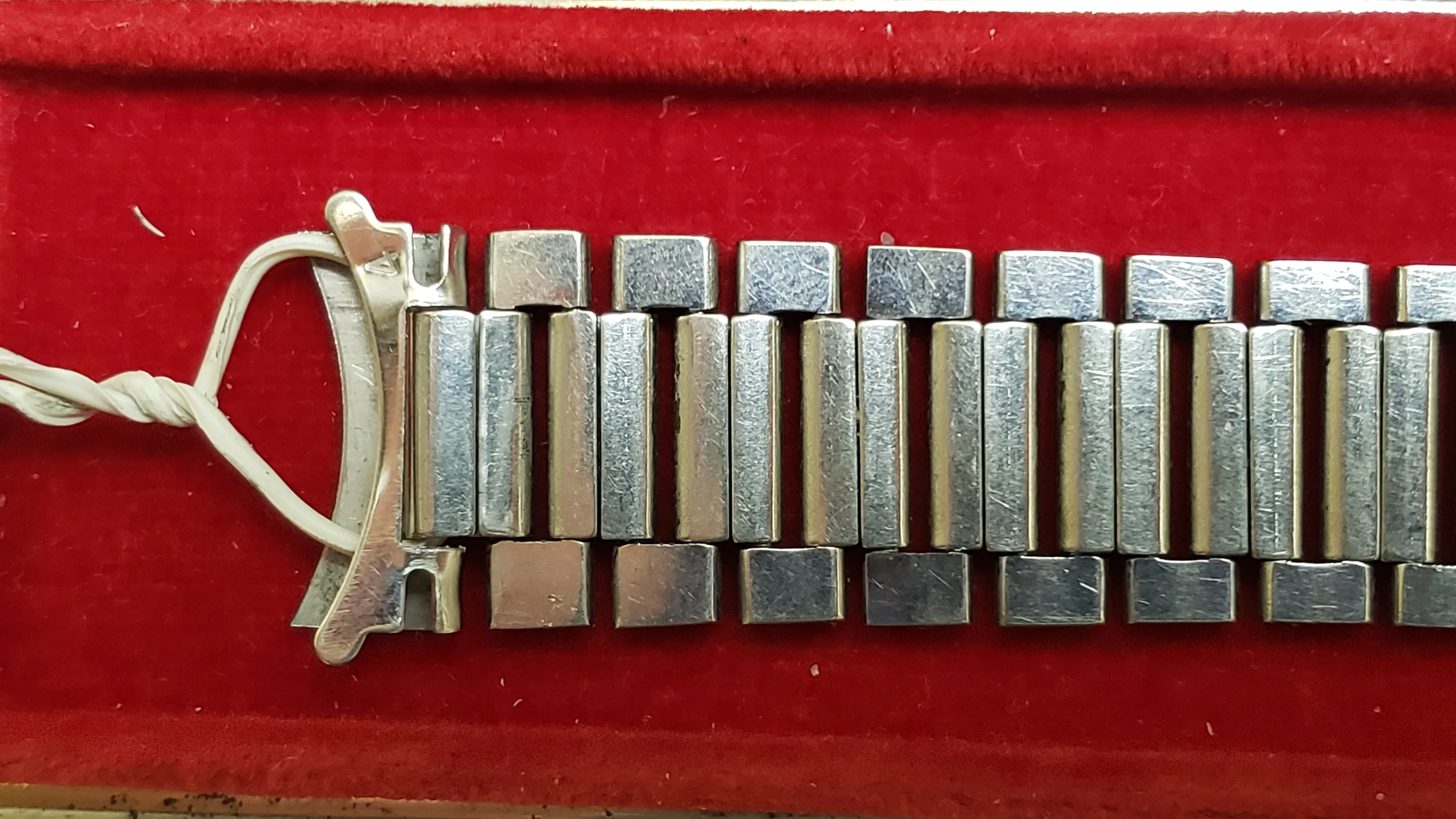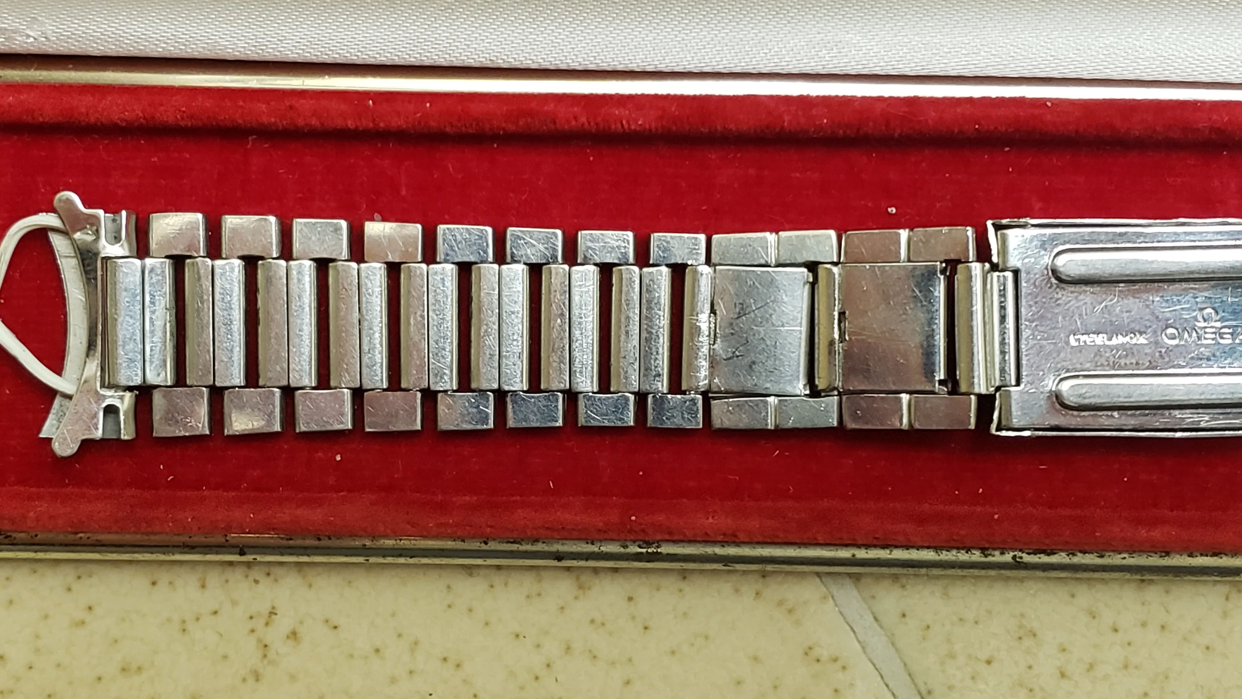 It has a minimal amount of stretch on the 16 solid permanent solid links and the total 5 double spring links have functional springs and stretch and rebound relatively well. The bracelet is unpolished and a couple of the expanding spring links have some wear from previous heavy-handed attempts to open/close the spring compartment.