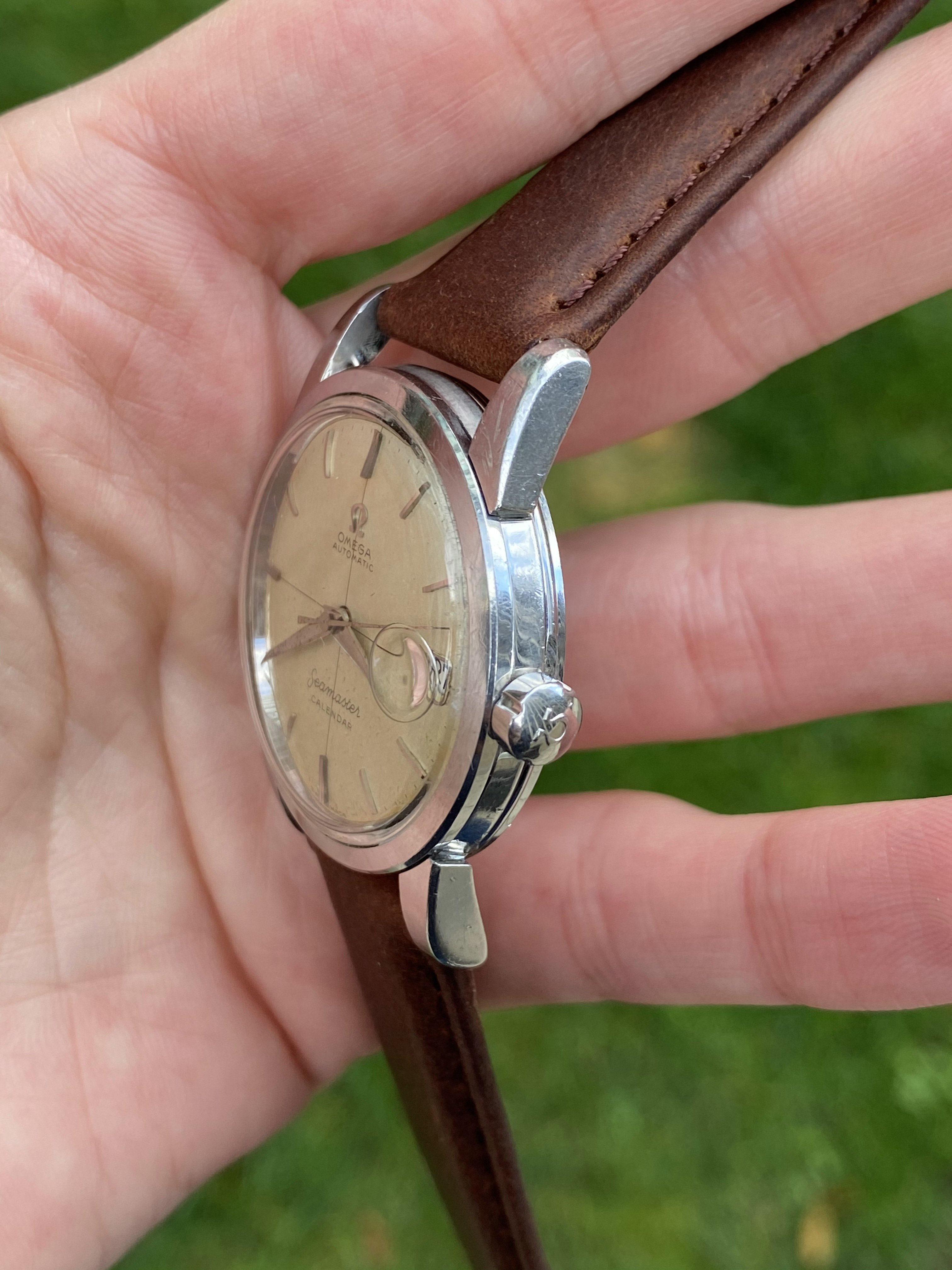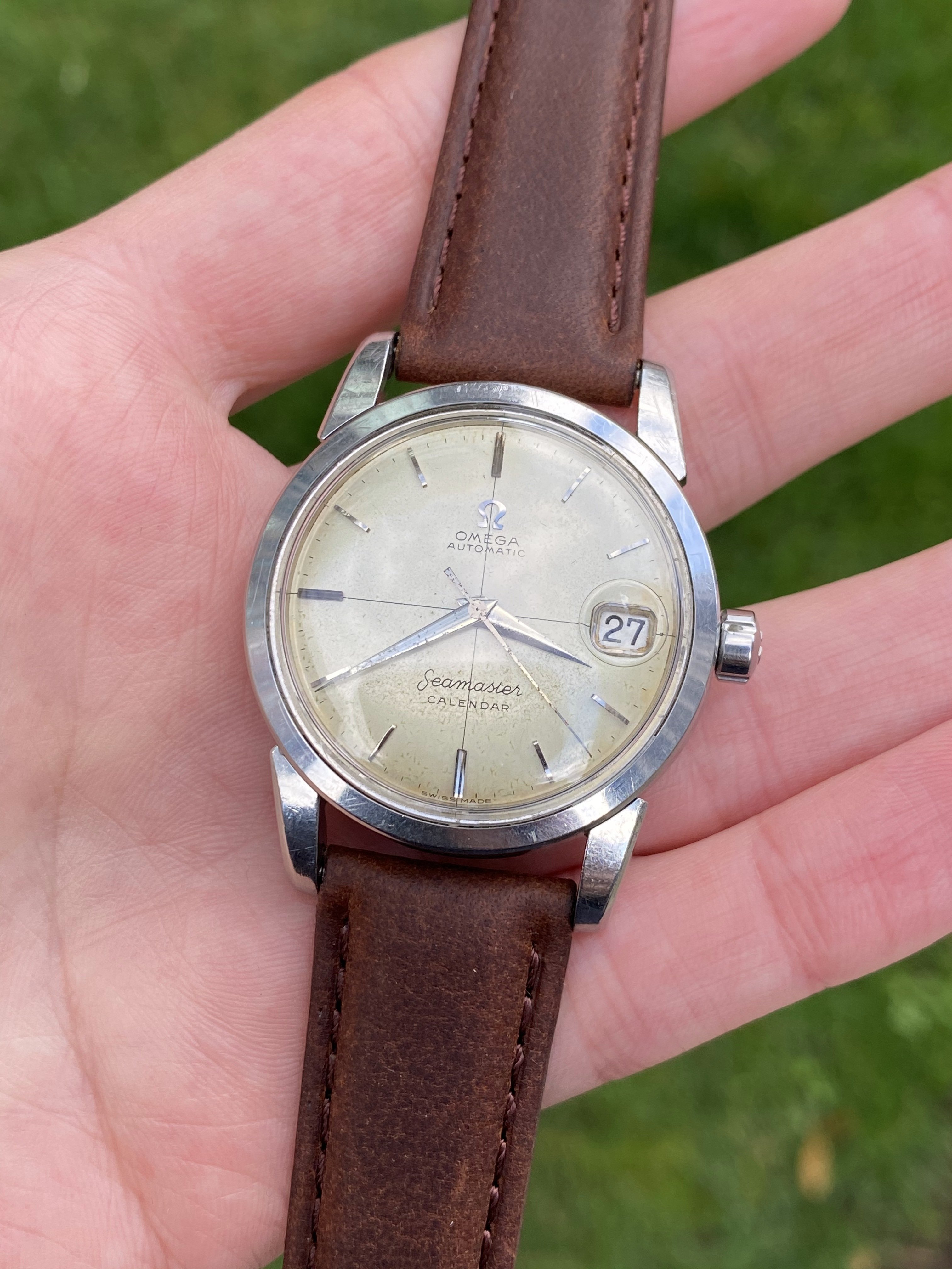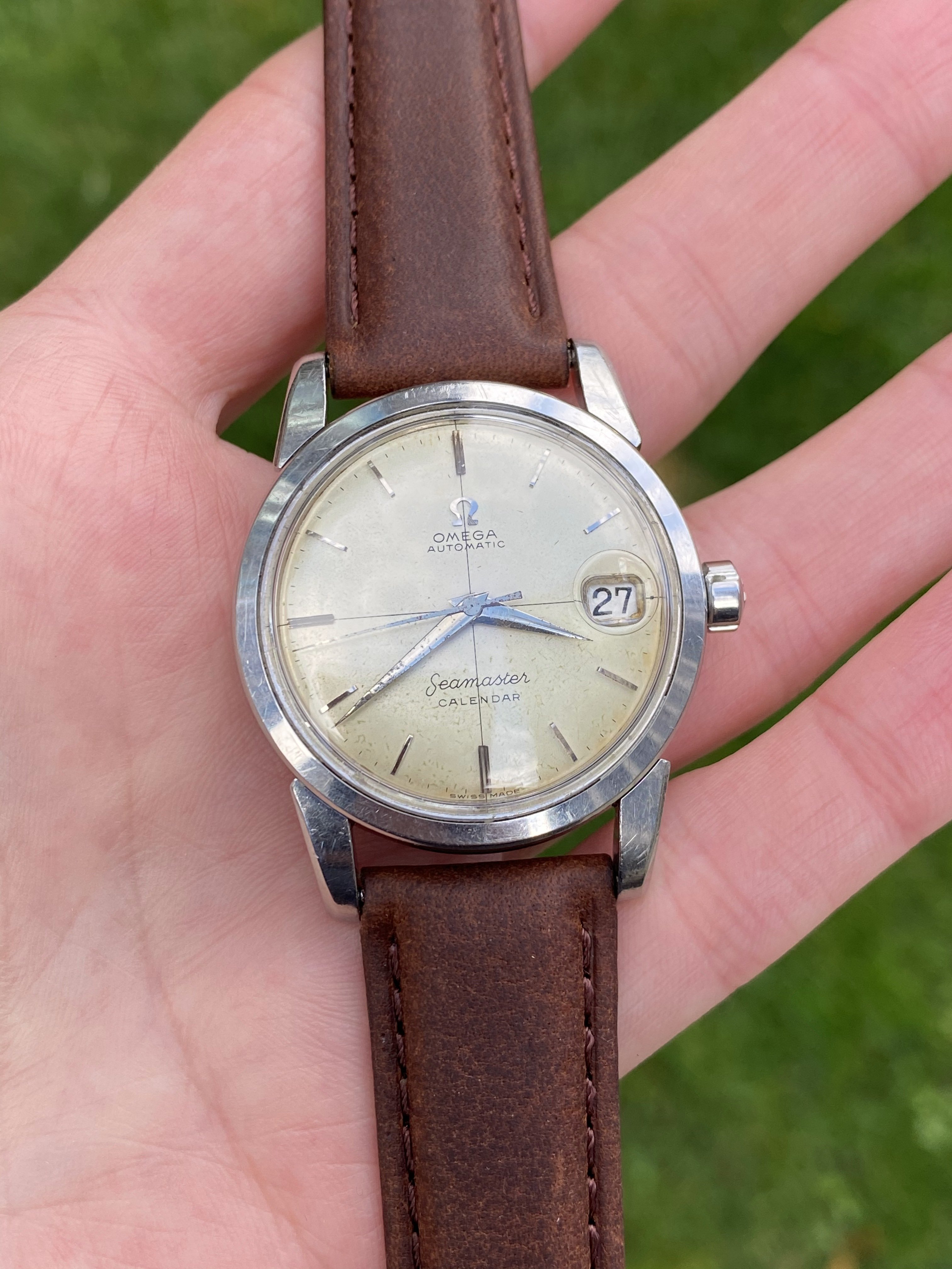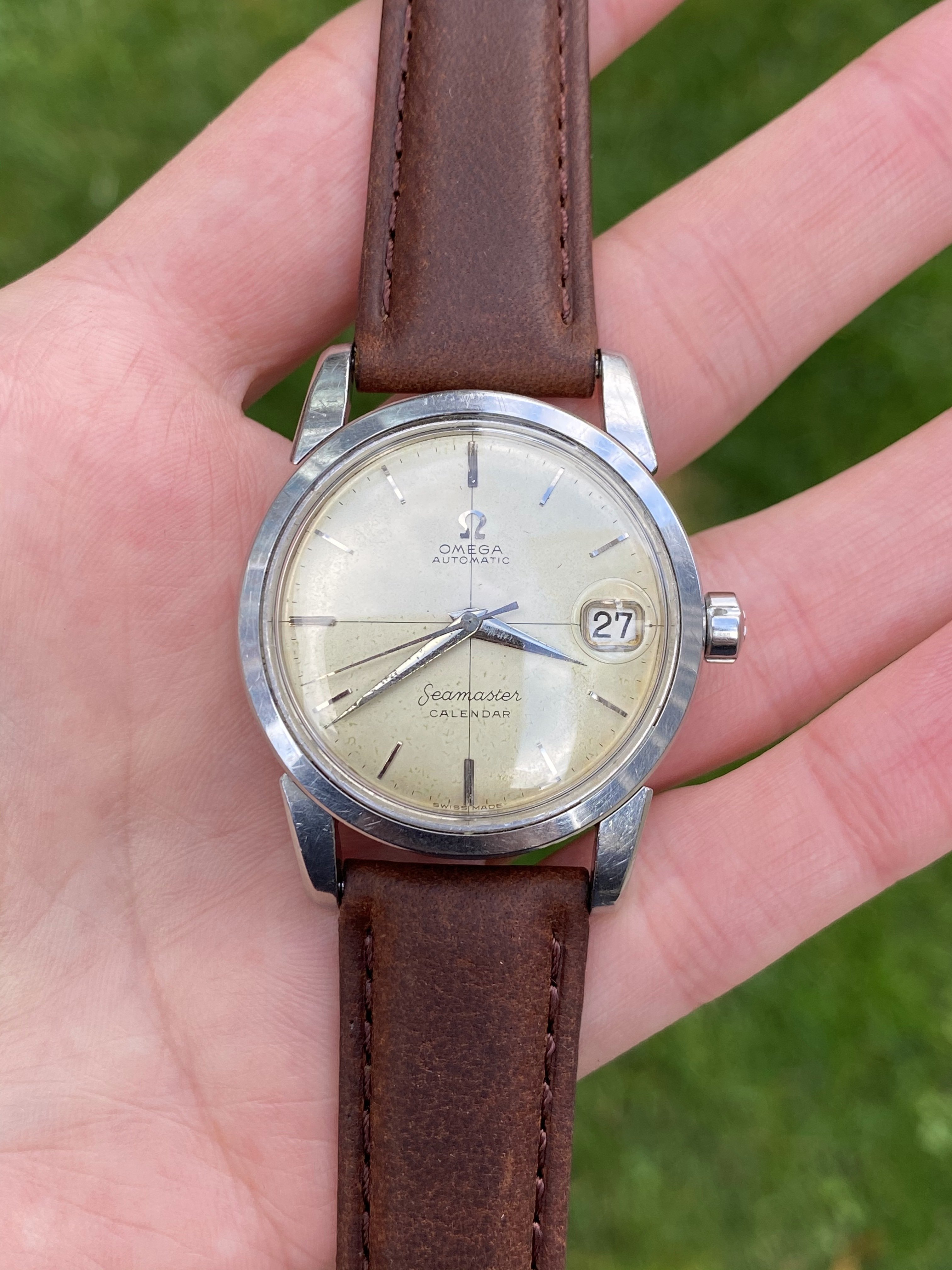 ·For sale or trade is a 1957 2849 reference Omega Seamaster Calendar. The case is in nice condition, unpolished or close to it. The dial has developed a light patina. The 503 caliber movement runs, winds, and sets well, however service history is unknown. Price is $750.
