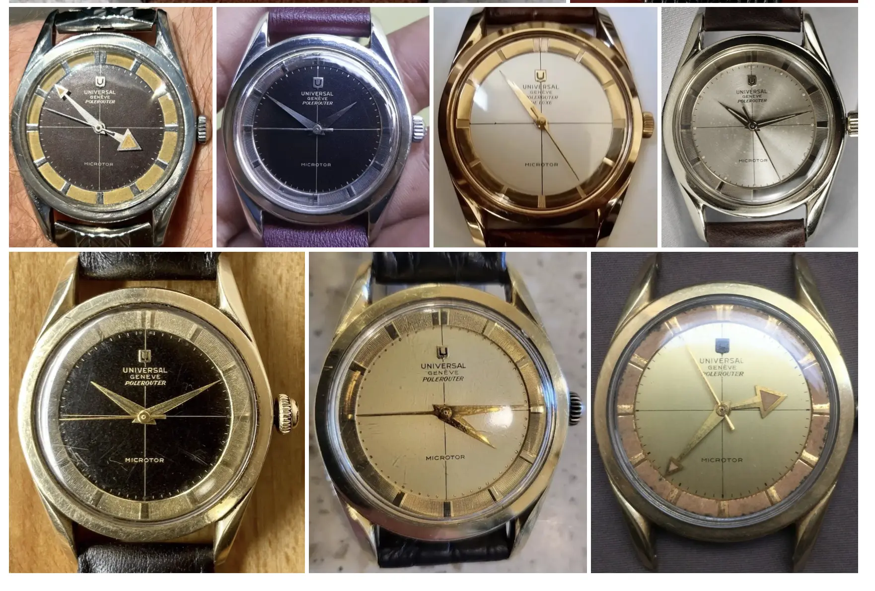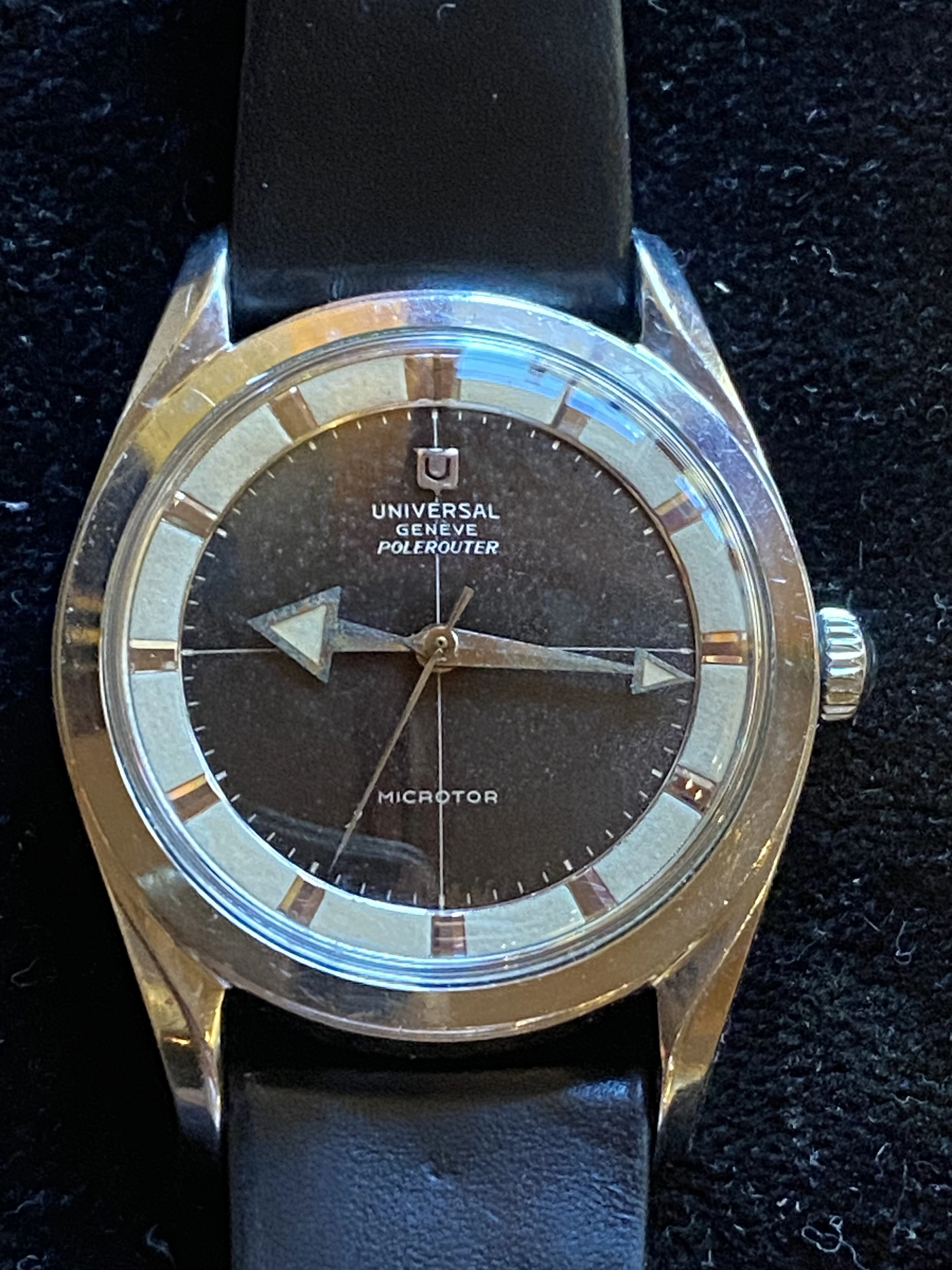 ·Bought this U.G. Polerouter with some other watches in a estate. Have had it serviced at vintage watch specialist and realized it is a rare piece. Have looked online and have not found one with exactly same setup 1957 UG Polerouter broad arrow hands and microtor only dial, in very good condition, not polished case just cleaned and light patina on dial. Original period correct leather strap, has the patent pending mark on the movement. Thinking of selling, but unsure if I should wait for the release of the new Polerouter. Have had some estimates from watch specialist, but unsure of value. Anyone here have a suggestion towards value.