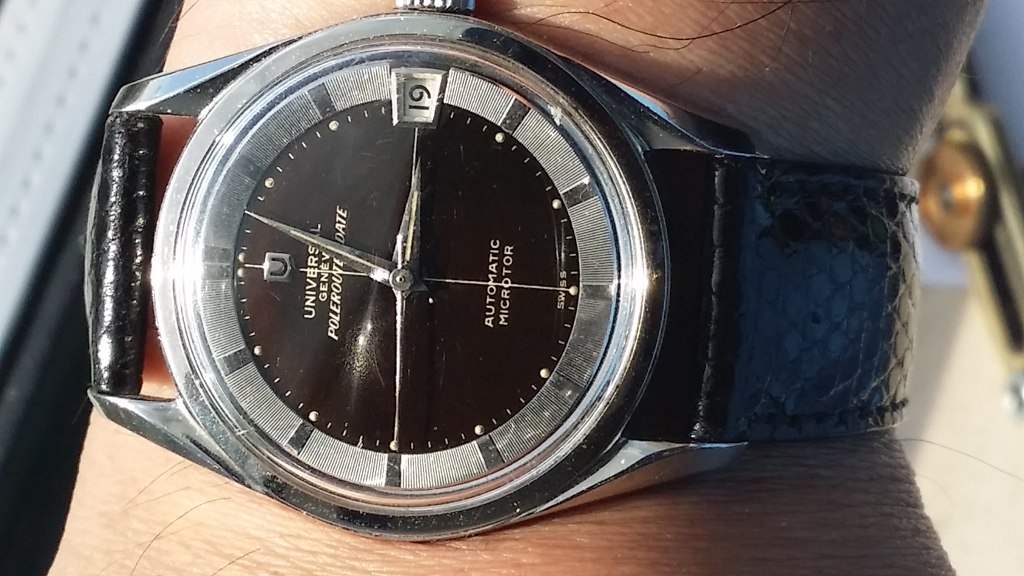 Check out the original black dial on this puppy. Logo crown too. The crystal will need a light buffing (have it done while it's being serviced) and the case has some minor scratches, but all in all it's in very nice shape with great edges on the bombe lugs and bezel. The microrotor caliber 215-1 is in good shape but as mentioned at the start of this listing YOU MUST HAVE IT SERVICED BEFORE WEARING. As usual, I've shot these in harsh light to magnify any imperfections.