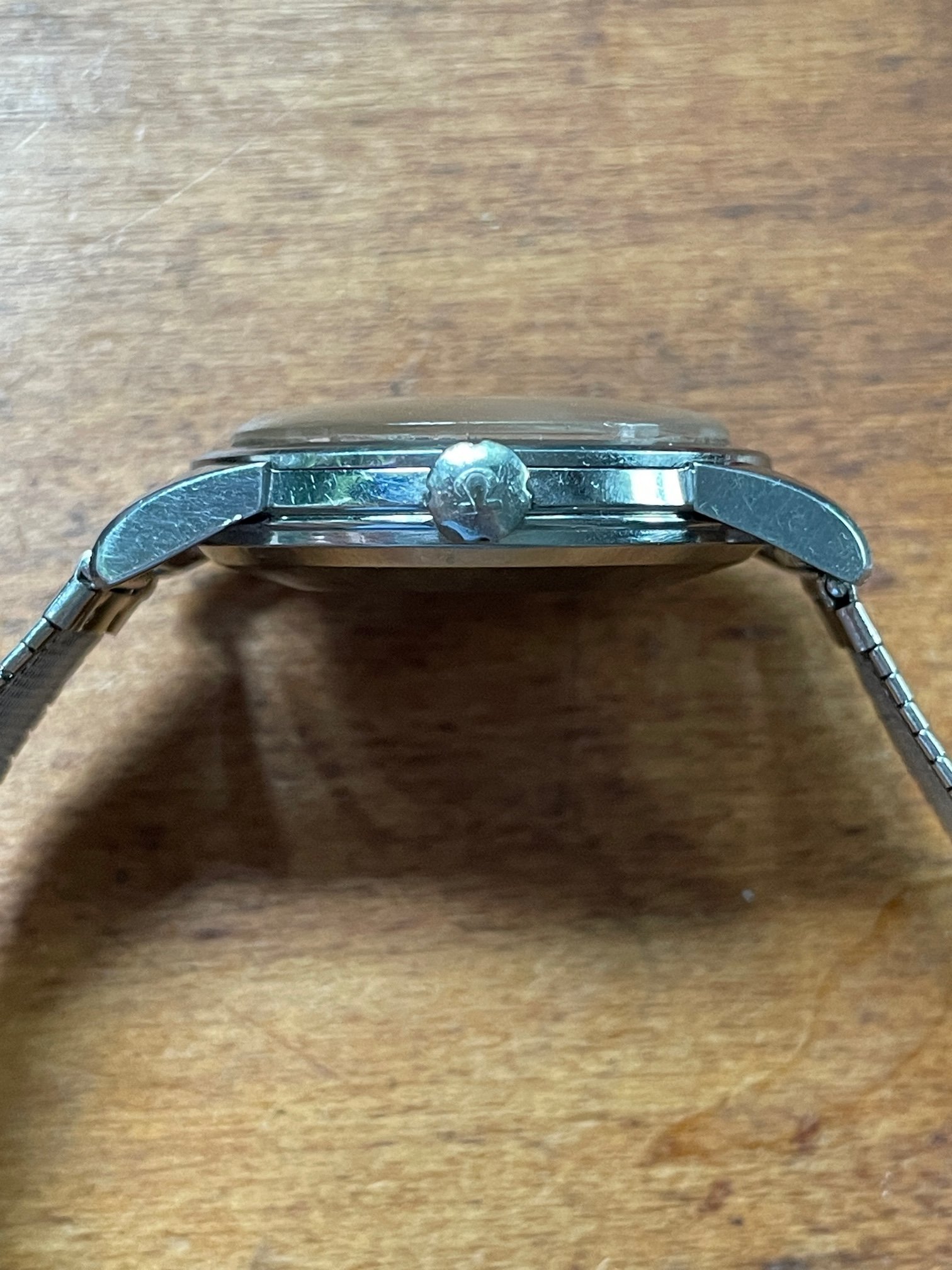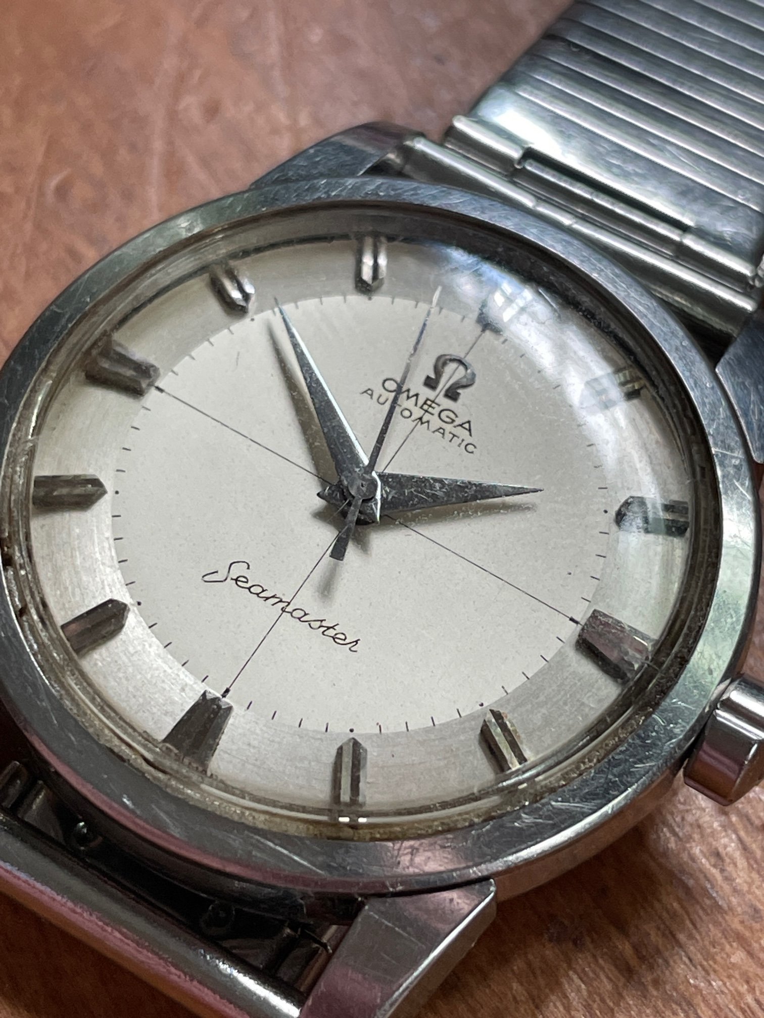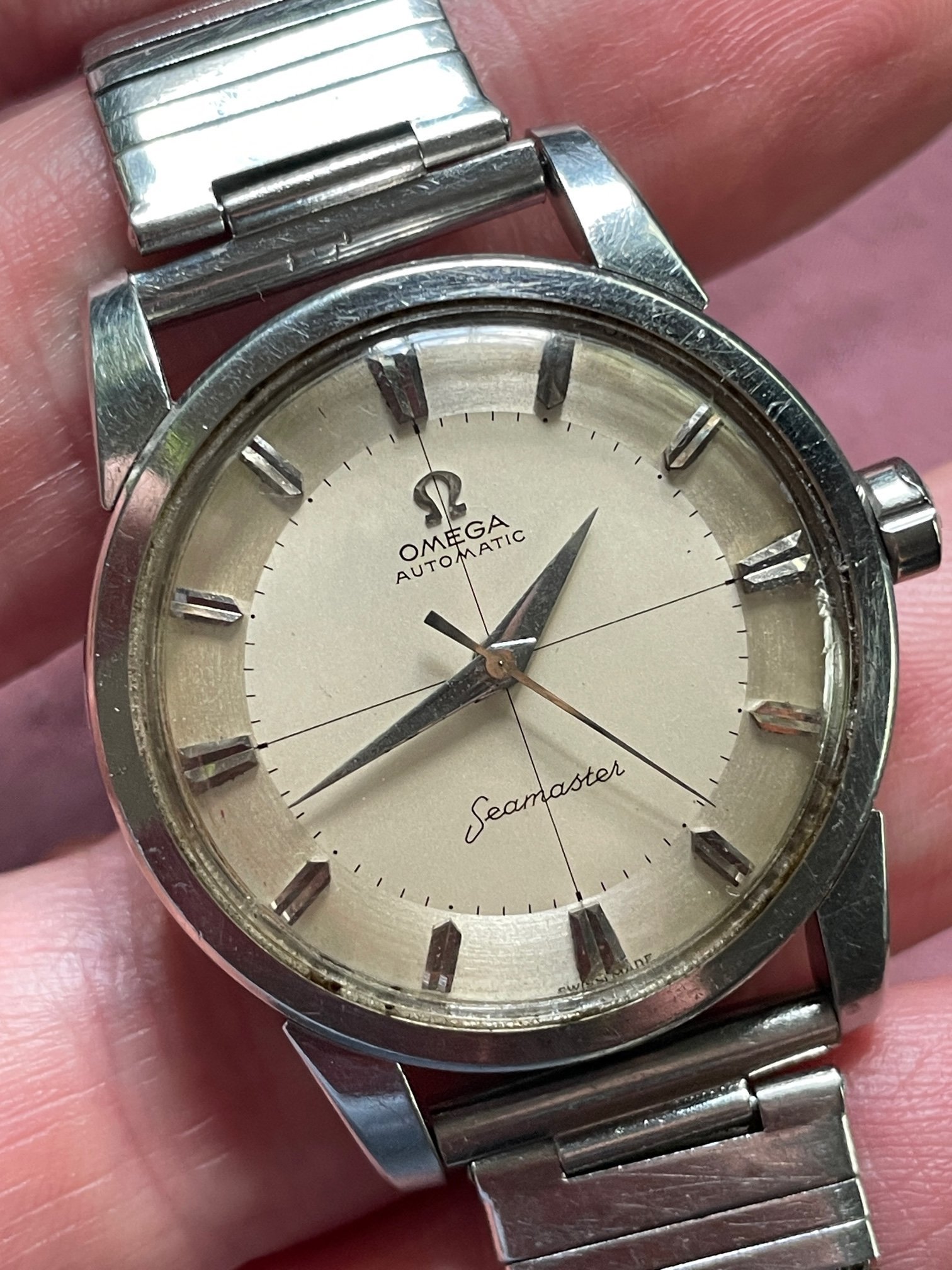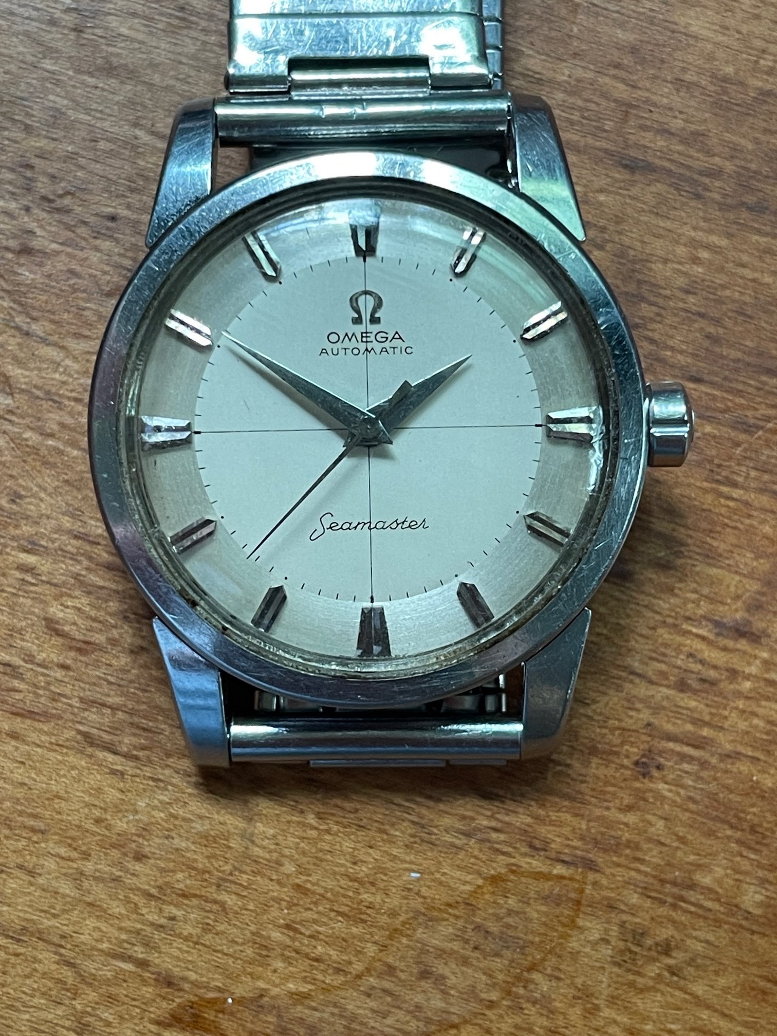 ·CASE: the 34mm steel case is in good condition, with a few scuffs as would be expeced after nearly 70 years. It seems to be unpolished, but obviously I'm not the original owner. The acrylic crystal has an Omega symbol (and is a little worn at the edge from 3-5), and the crown is the original clover leaf. The caseback etching's clear. The watch comes on the JB Champion bracelet pictured, which works just fine.
