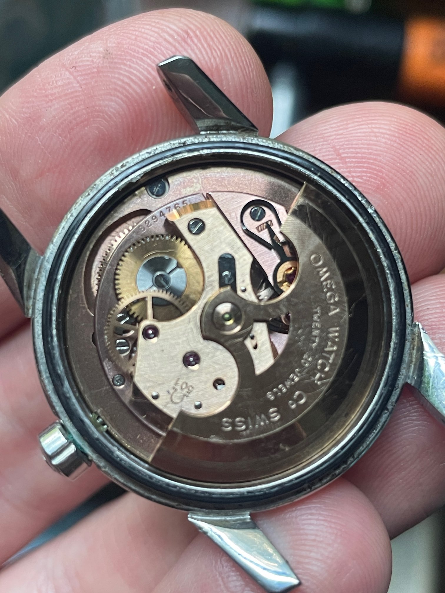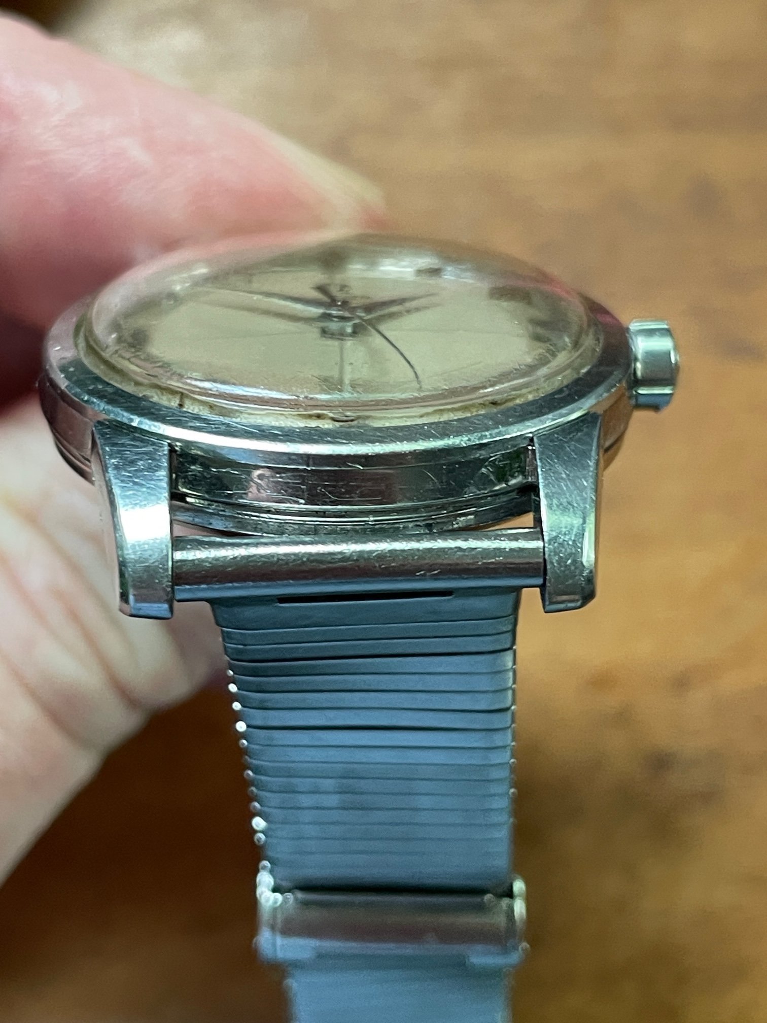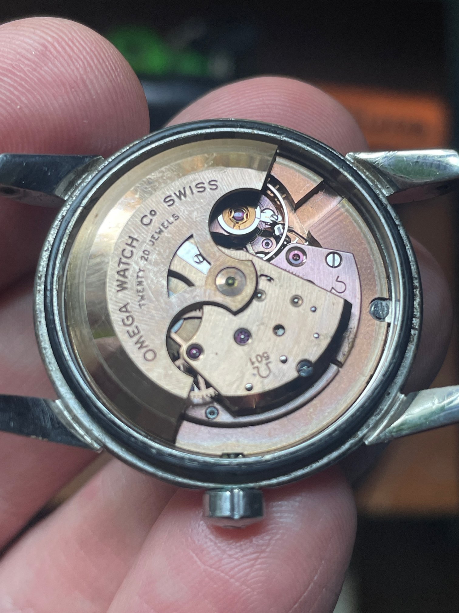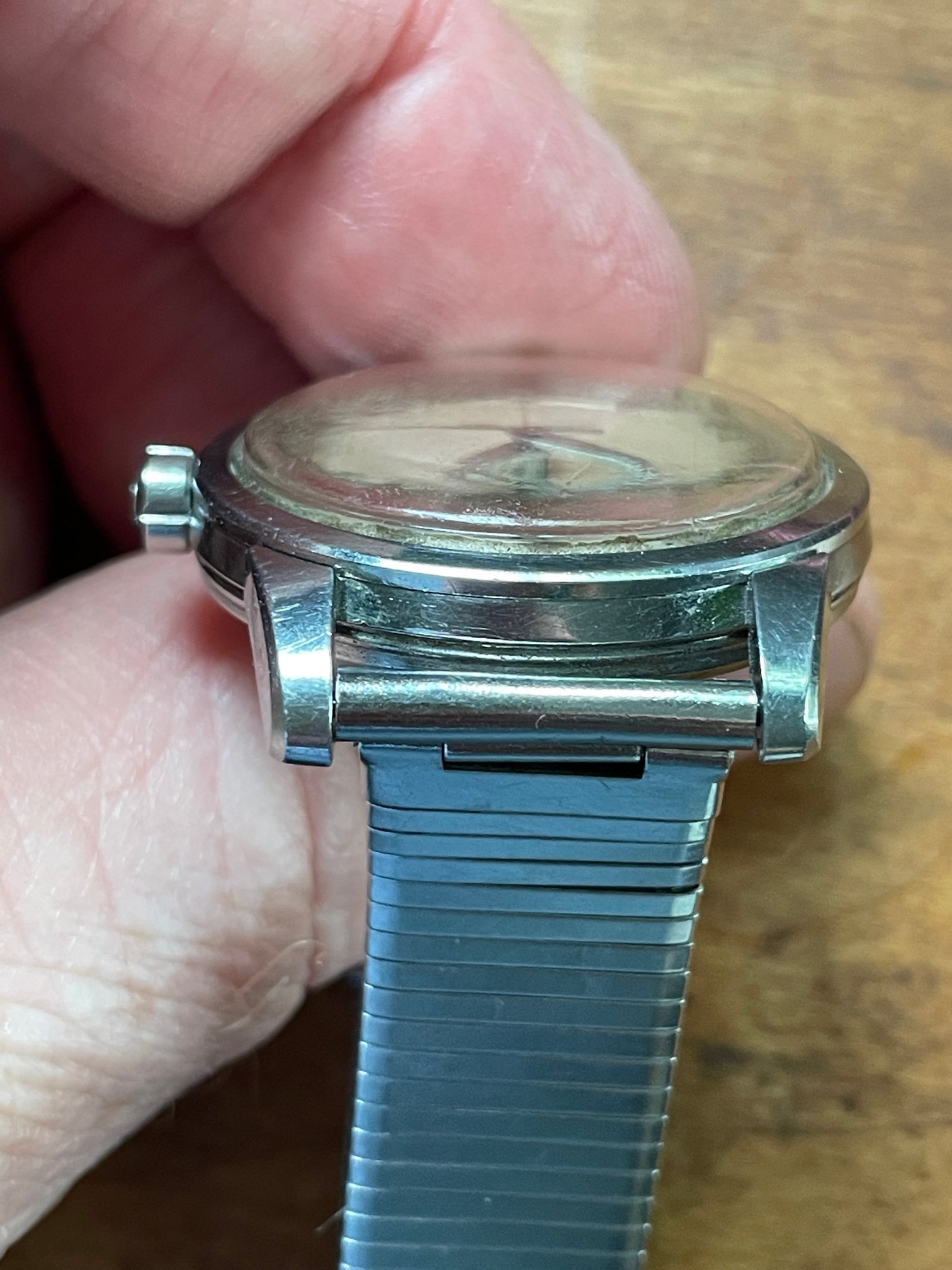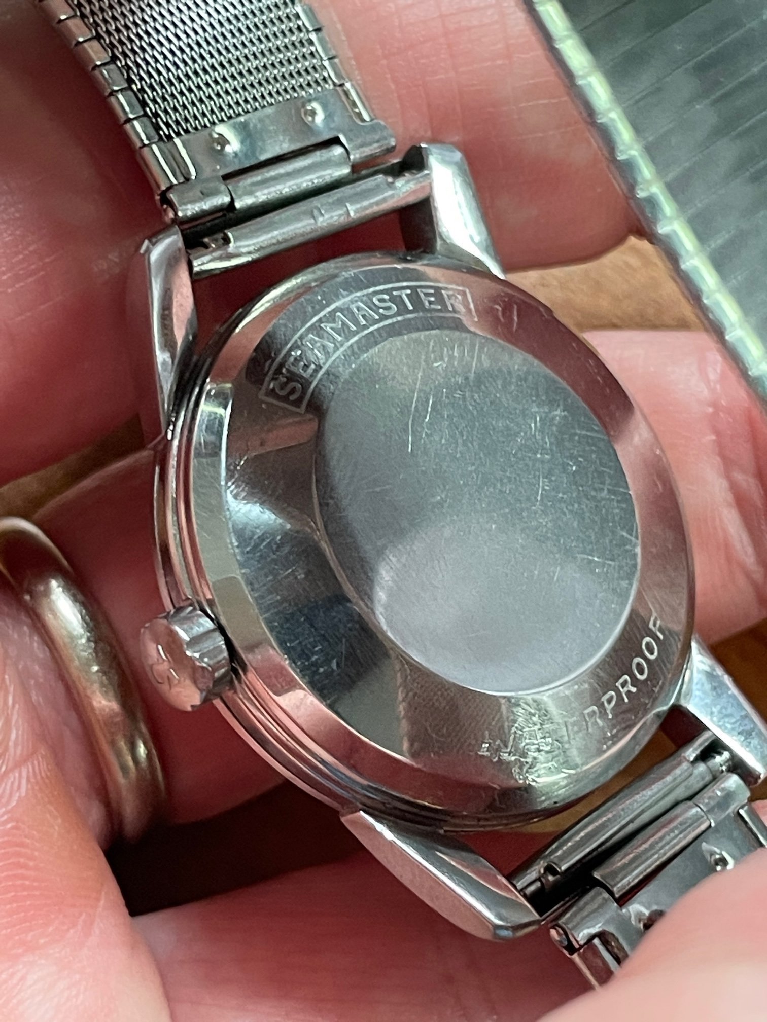 ·CASE: the 34mm steel case is in good condition, with a few scuffs as would be expeced after nearly 70 years. It seems to be unpolished, but obviously I'm not the original owner. The acrylic crystal has an Omega symbol (and is a little worn at the edge from 3-5), and the crown is the original clover leaf. The caseback etching's clear. The watch comes on the JB Champion bracelet pictured, which works just fine.