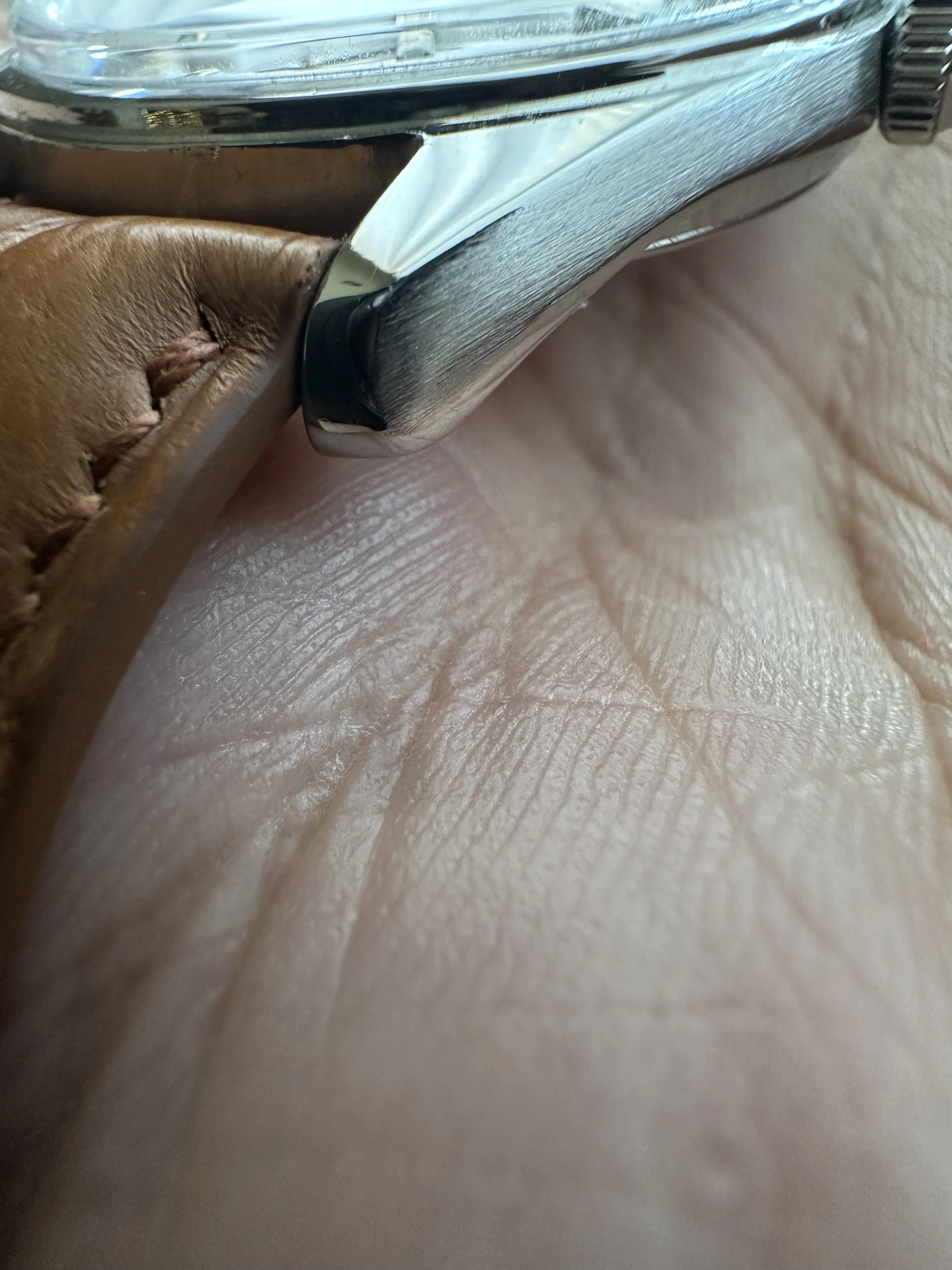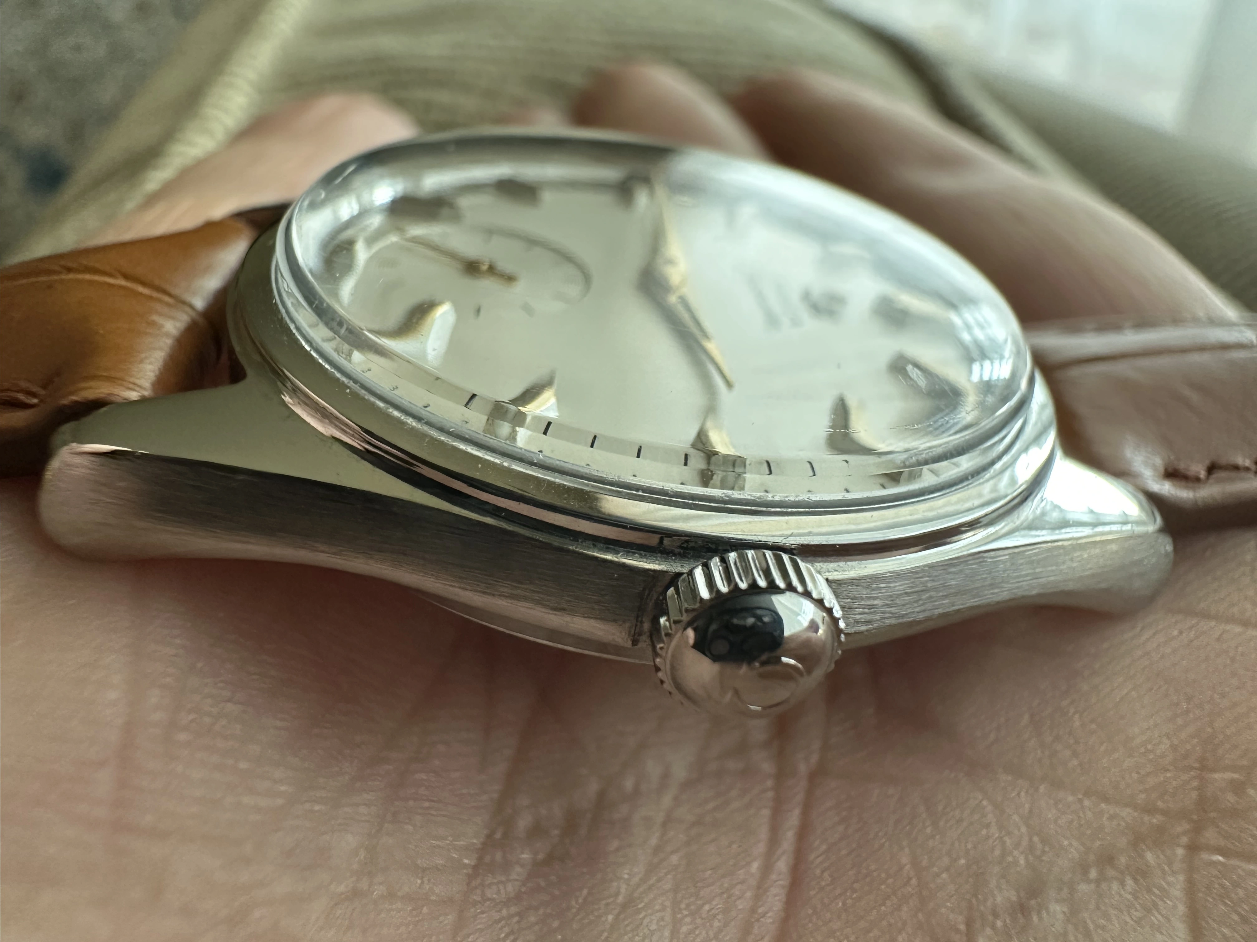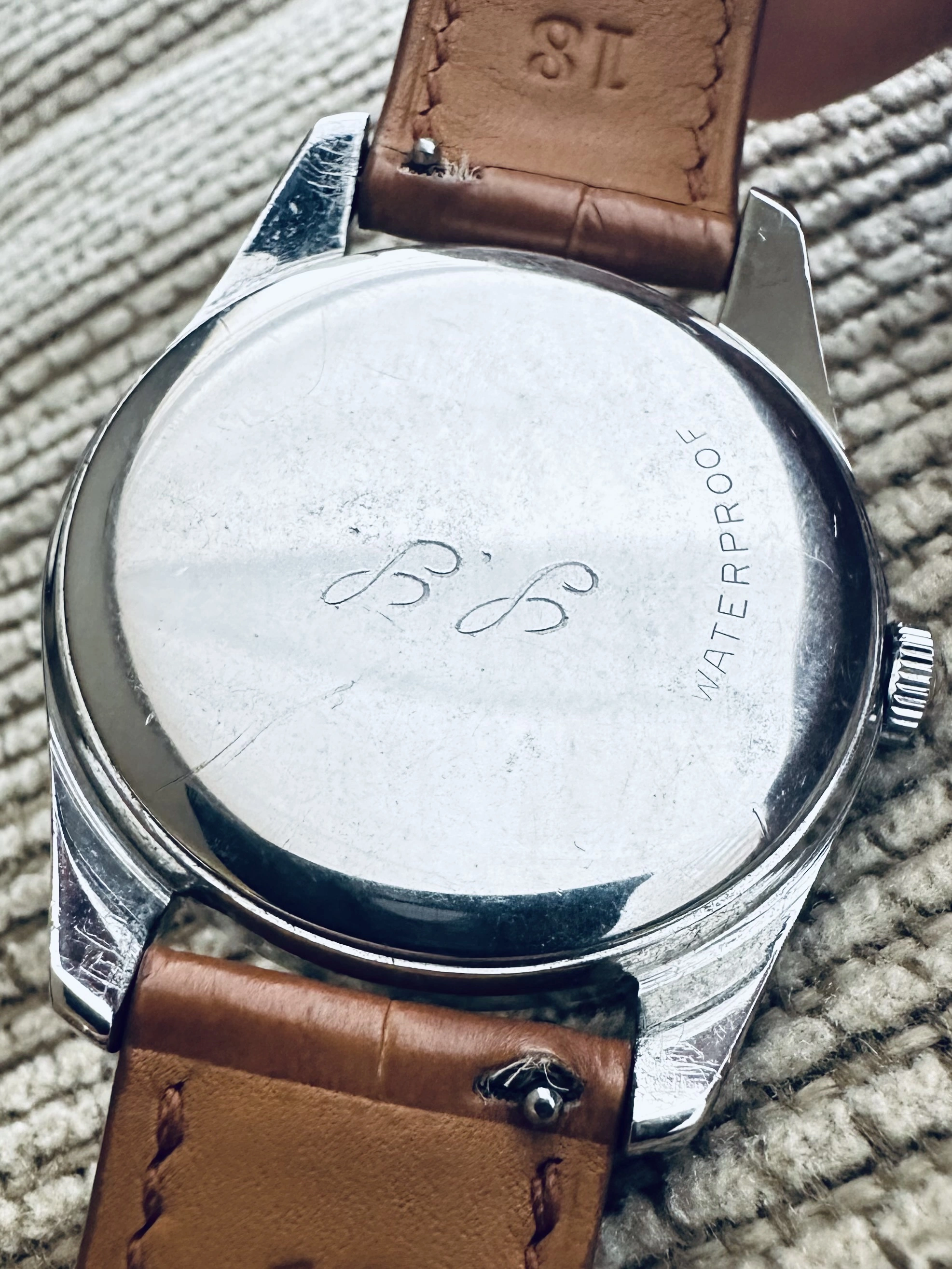 Case: Original stainless steel case with a diameter of 36mm, a lug to lug measurement of 44mm and a lug width of 18mm. The overall condition of the case is in excellent. I don't believe that it has been polished, but if it waa done it was done with a good hand. There are no glaring flaws that I can see. The case back has a few light scratches and there are two initial marked from the case back.