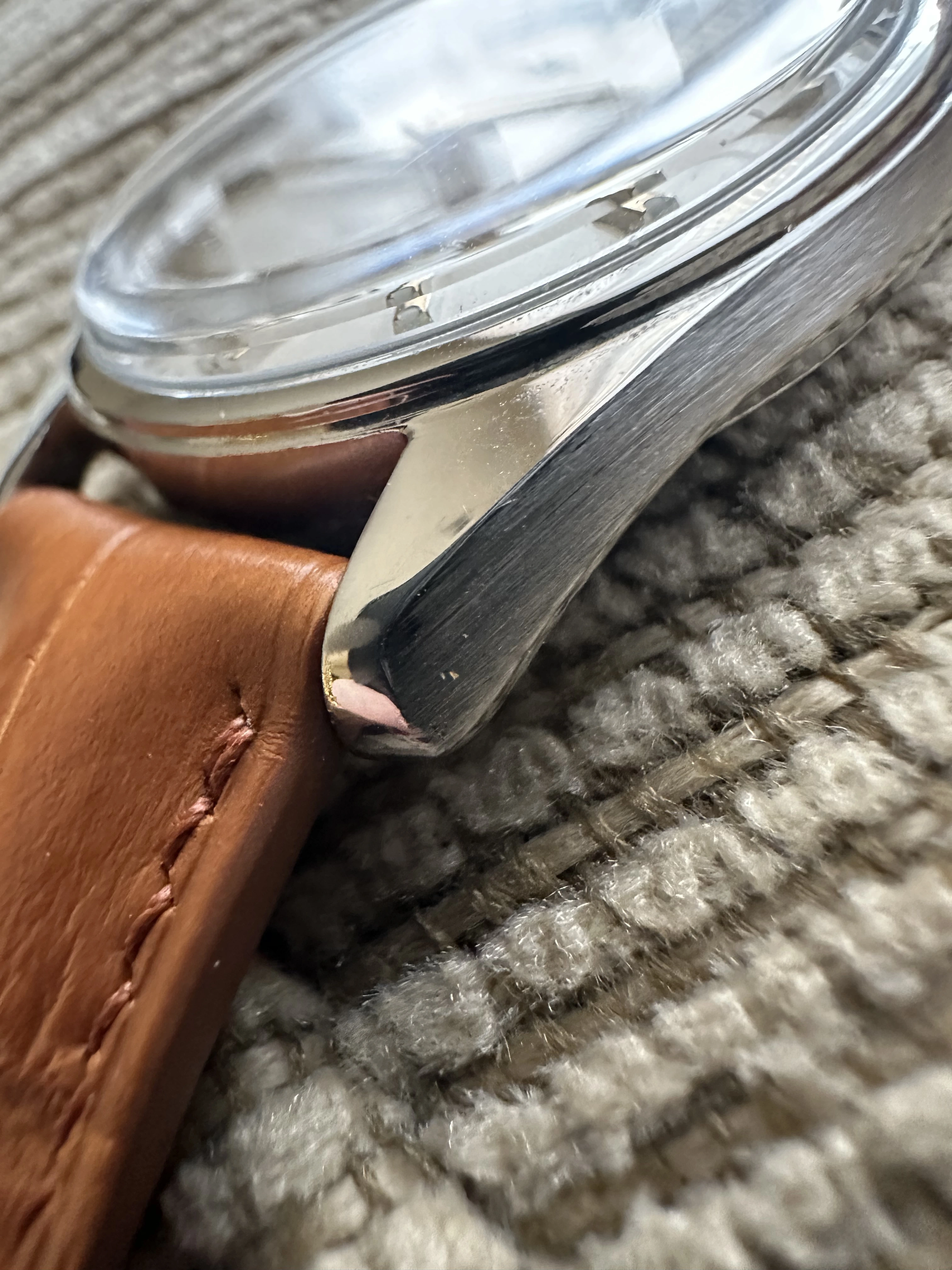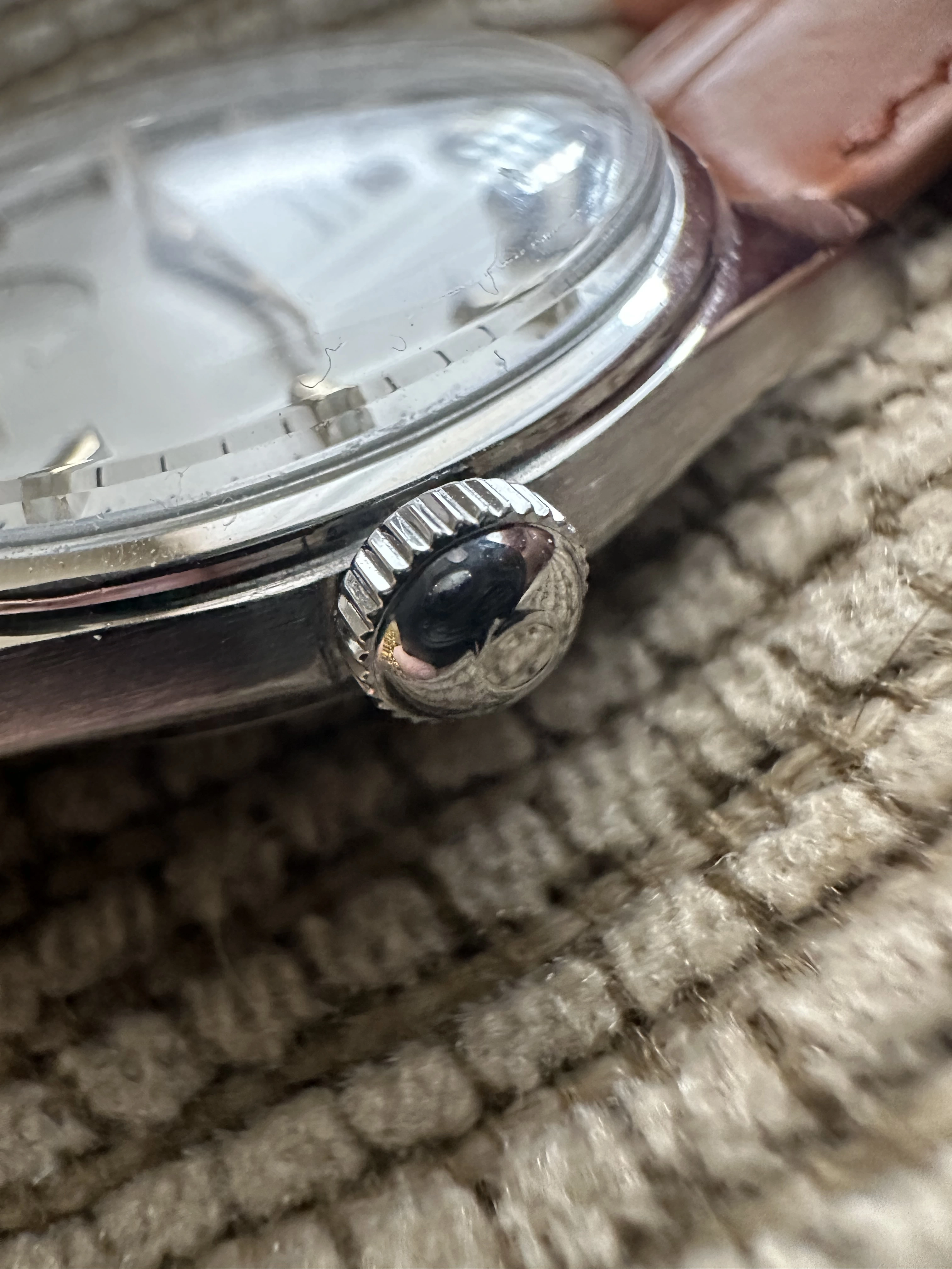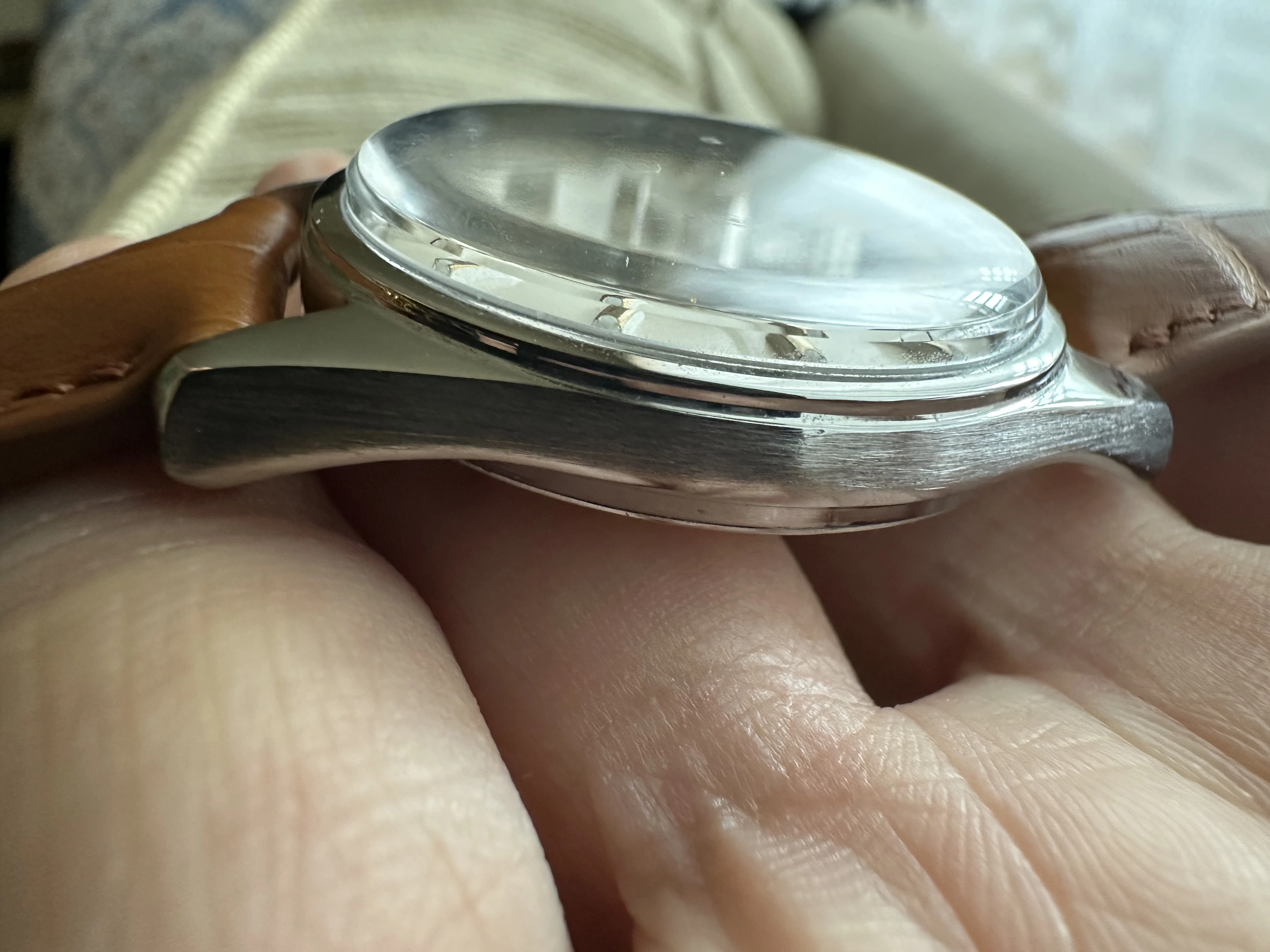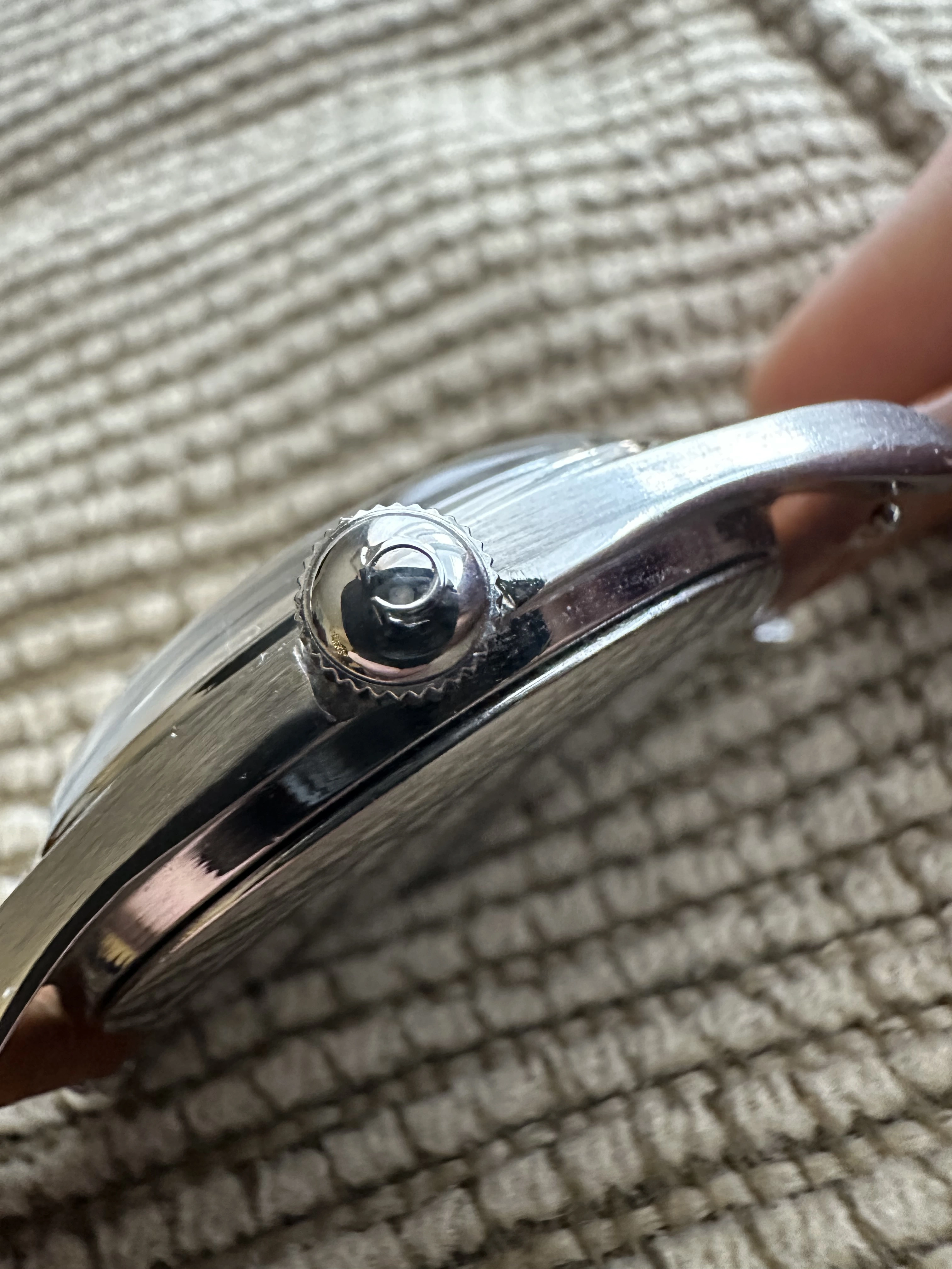 Case: Original stainless steel case with a diameter of 36mm, a lug to lug measurement of 44mm and a lug width of 18mm. The overall condition of the case is in excellent. I don't believe that it has been polished, but if it waa done it was done with a good hand. There are no glaring flaws that I can see. The case back has a few light scratches and there are two initial marked from the case back.