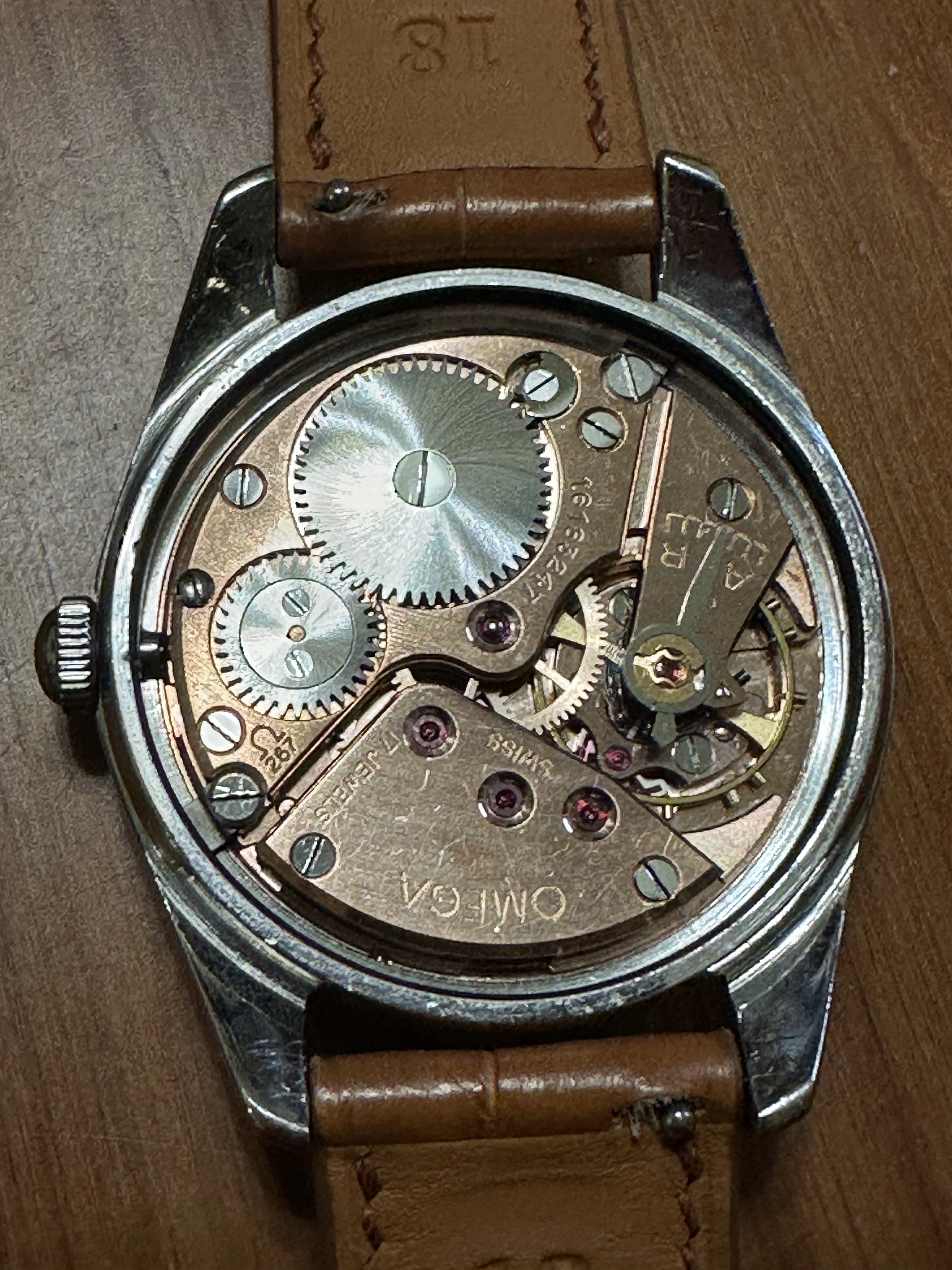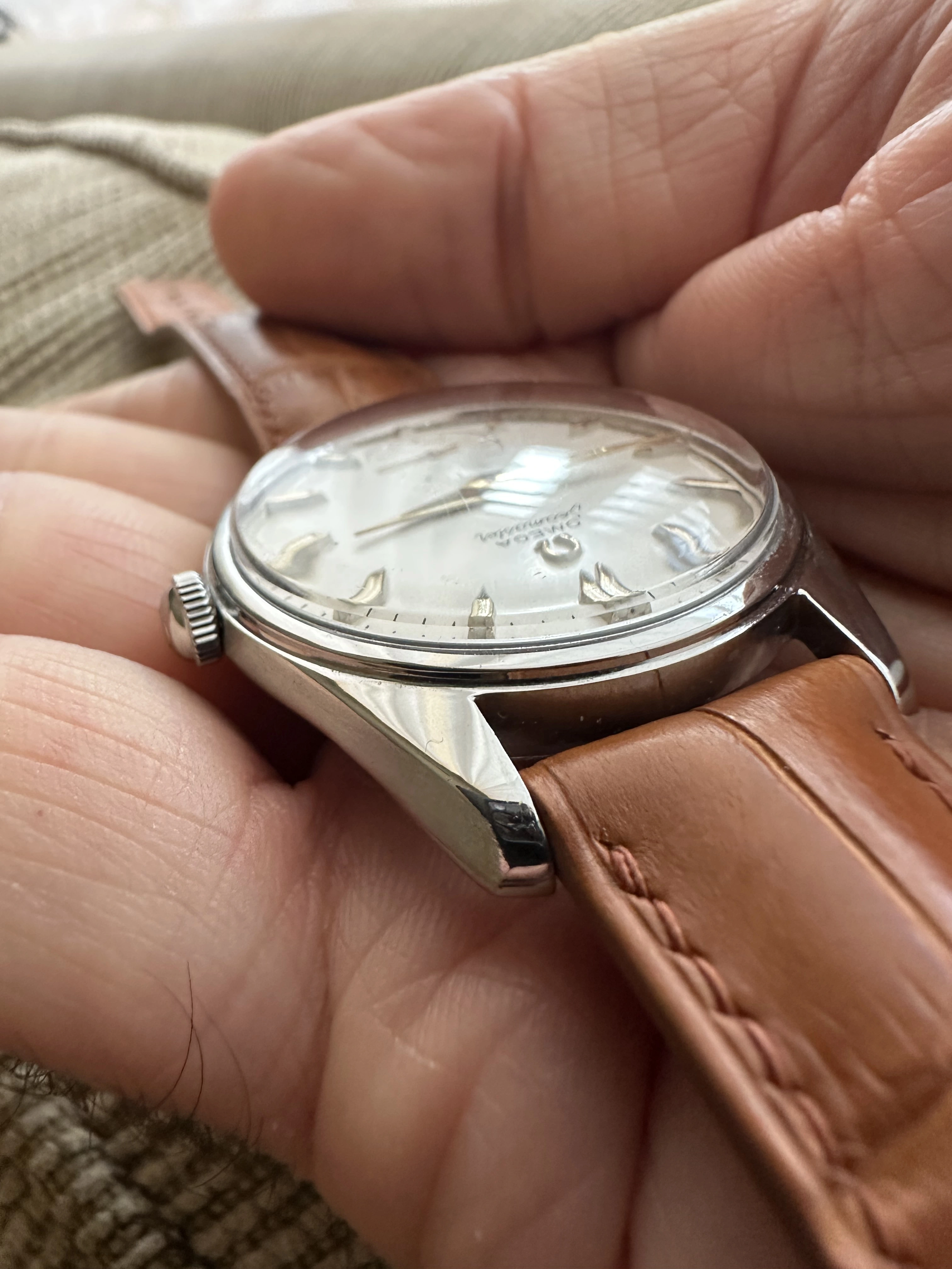 Movement: Omega automatic caliber 267 with 17 jewels. The movement is clean and in excellent condition and was recently completely serviced from my watchmaker about two years ago. The watch is running smoothly with strong amplitude, no beat error, excellent power reserve and is keeping very good time at +3 to +6 SPD depending upon position. The watch winds up very smoothly and both the crown action and hand setting is very precise.
