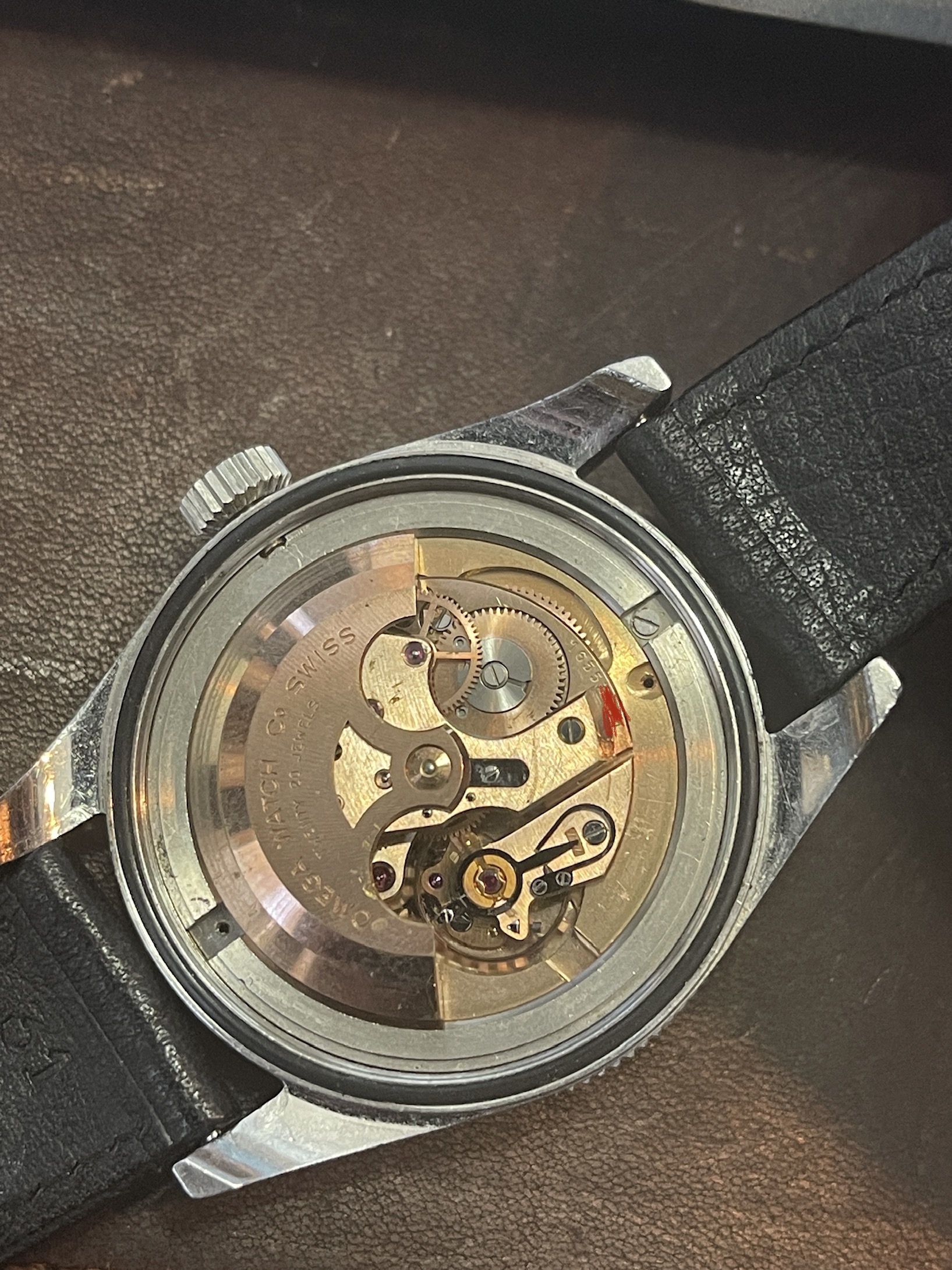 Movement: Omega Cal 501, it’s been serviced in the past (case back marking), but I don’t know when. It winds smoothly and keeps good time, but please buy it assuming it needs a service. One of the case clamps is missing, but it wasn’t when I bought it (I have the original pictures), so my watchmaker must’ve neglected to put one back in when he changed the crystal. Grr.