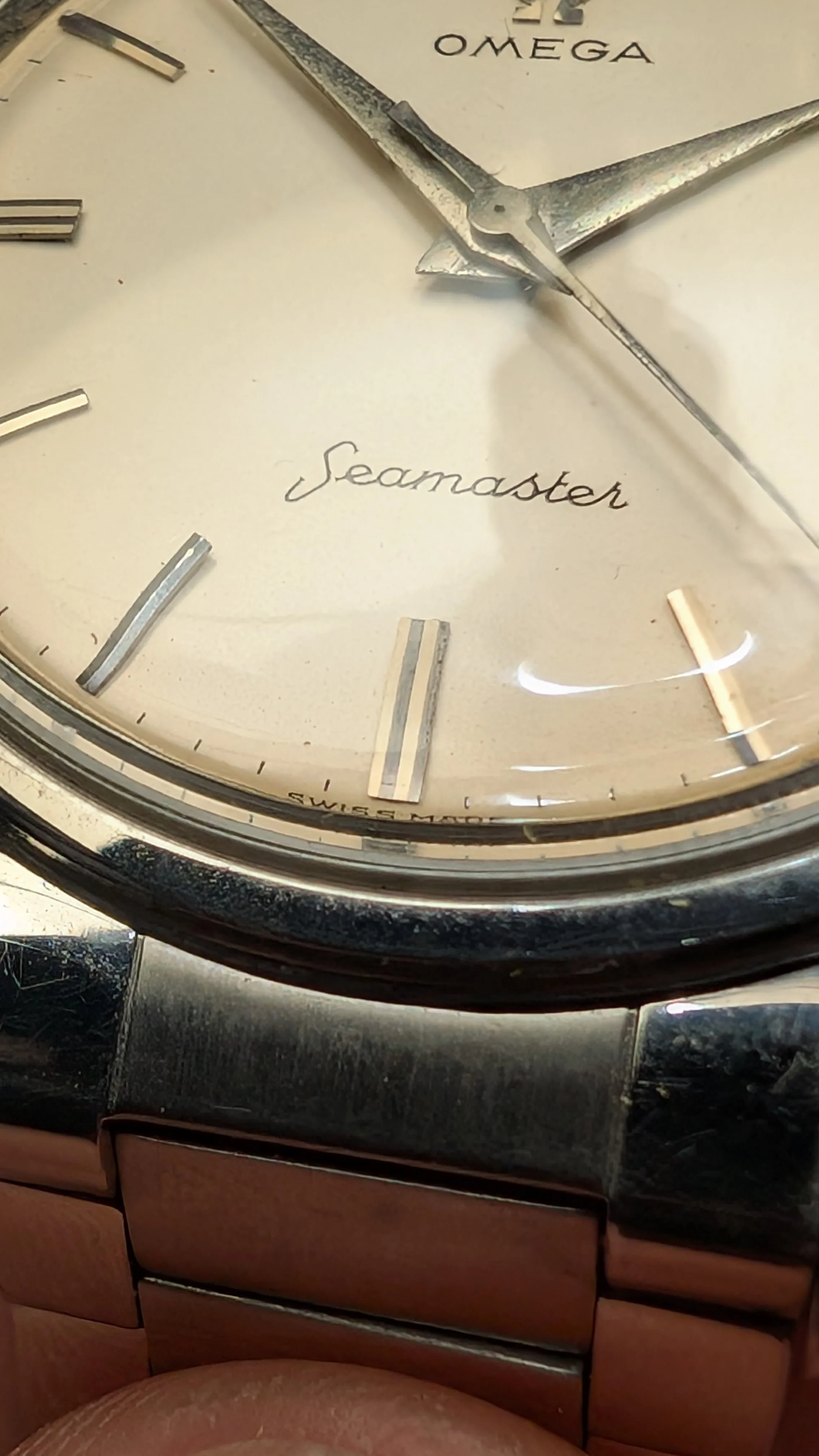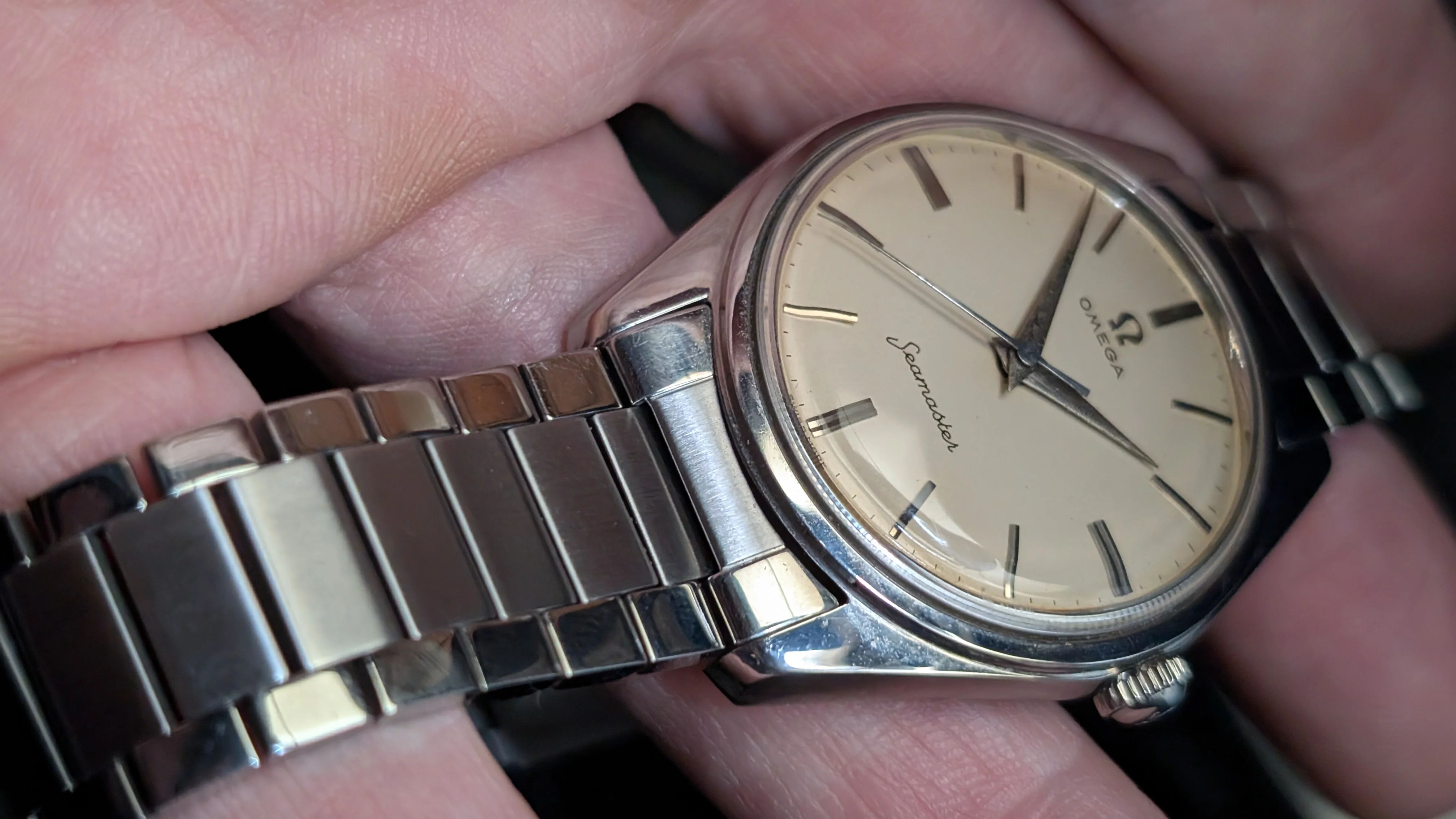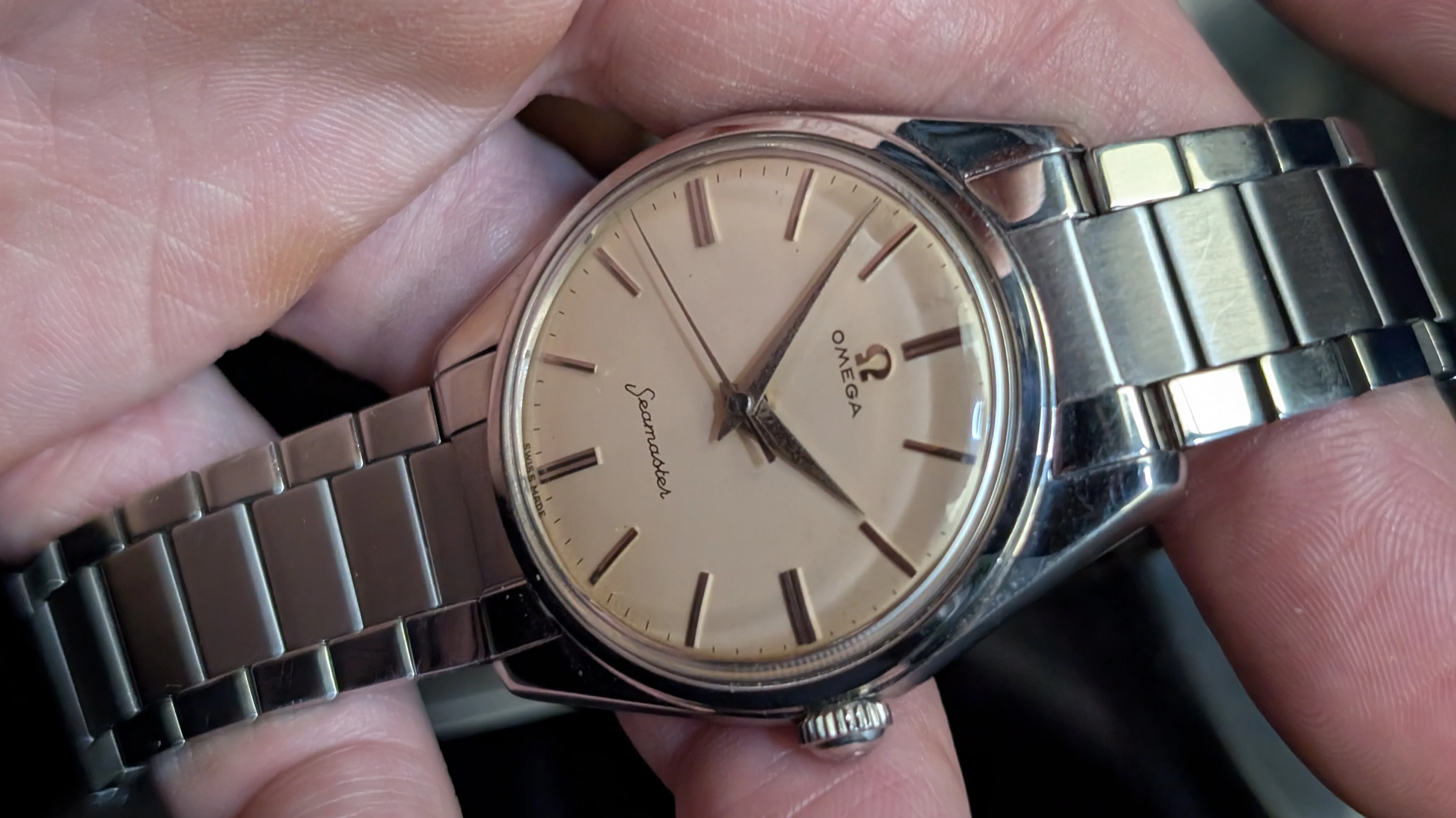 Here's a lovely 1959 Omega "Seachero" as they are known in collector circles. This is a very clean, original Seamaster dial with a cal 285 movement in the 17xxxxxx range in a 2990-1 SC / 2996 case that's, IMHO, in beautiful condition with only slight patina. Paired with this Uncle Straps (Seiko) flat link bracelet, it's vintage charm is on full display.