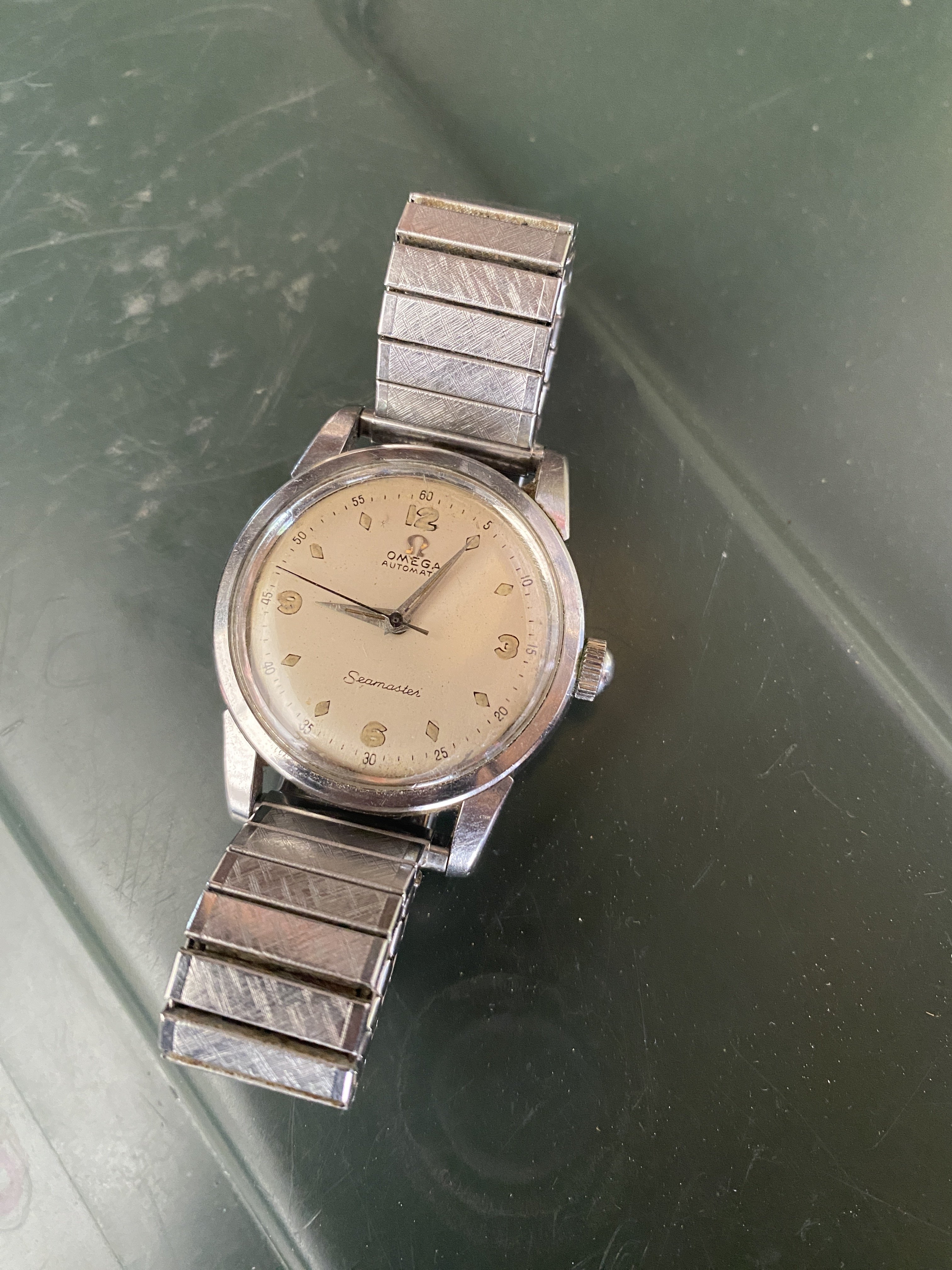 ·Hello, -not an Omegaphile - yet! Met my neighbor, 91 year old gentleman full of incredible D.C. stories. He found his Omega buried away and is open to selling it to me. But I can not I.D. it after scouring the net. (I’m aware of the dimestore band) and he said he asked his jeweler to refresh the lume and it looks like a botched job. The dial face is unlike anything I can find, secondary mkt piece? He doesn’t want me to open it and I’m moving in 3 days, so this is all I have. ANY INFO would be appreciated.