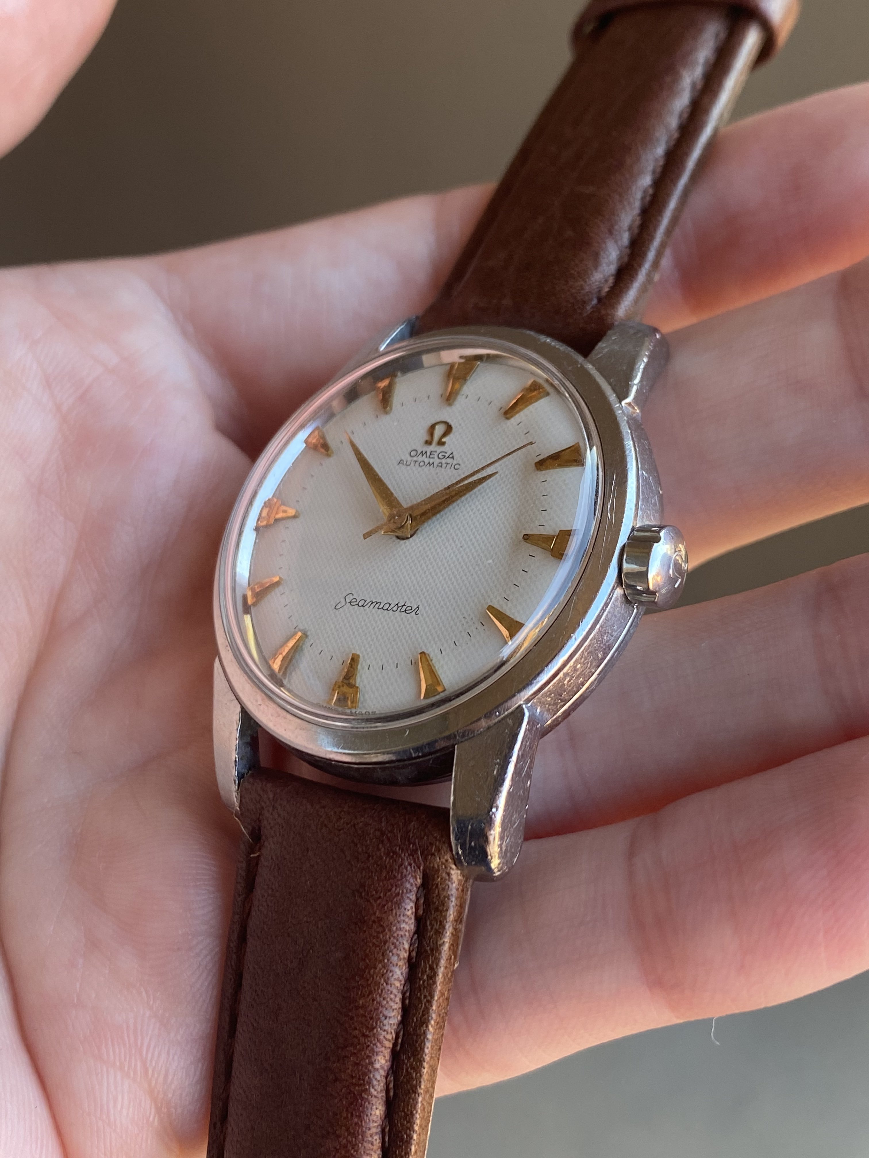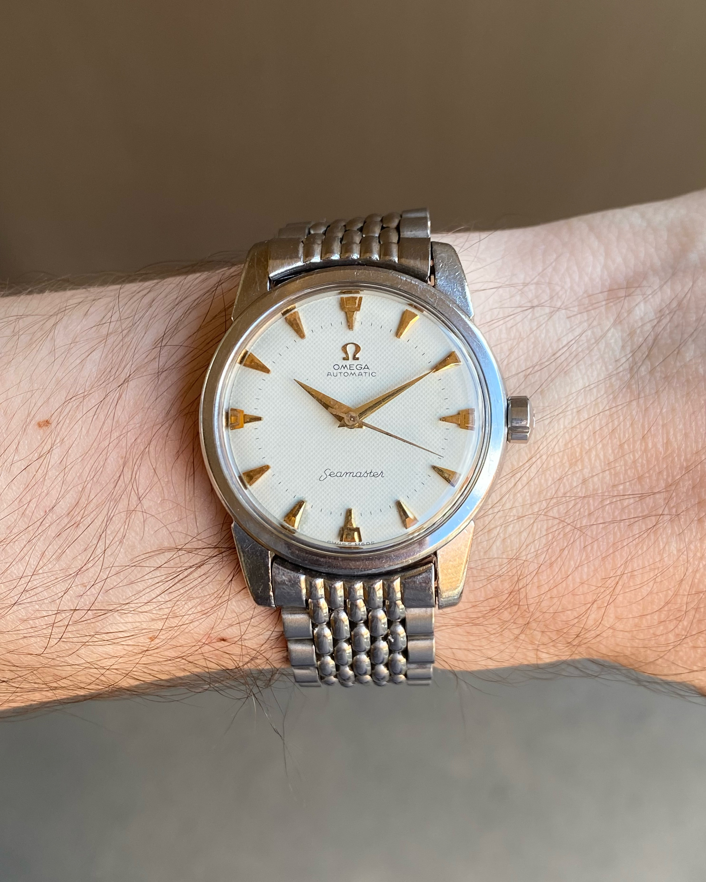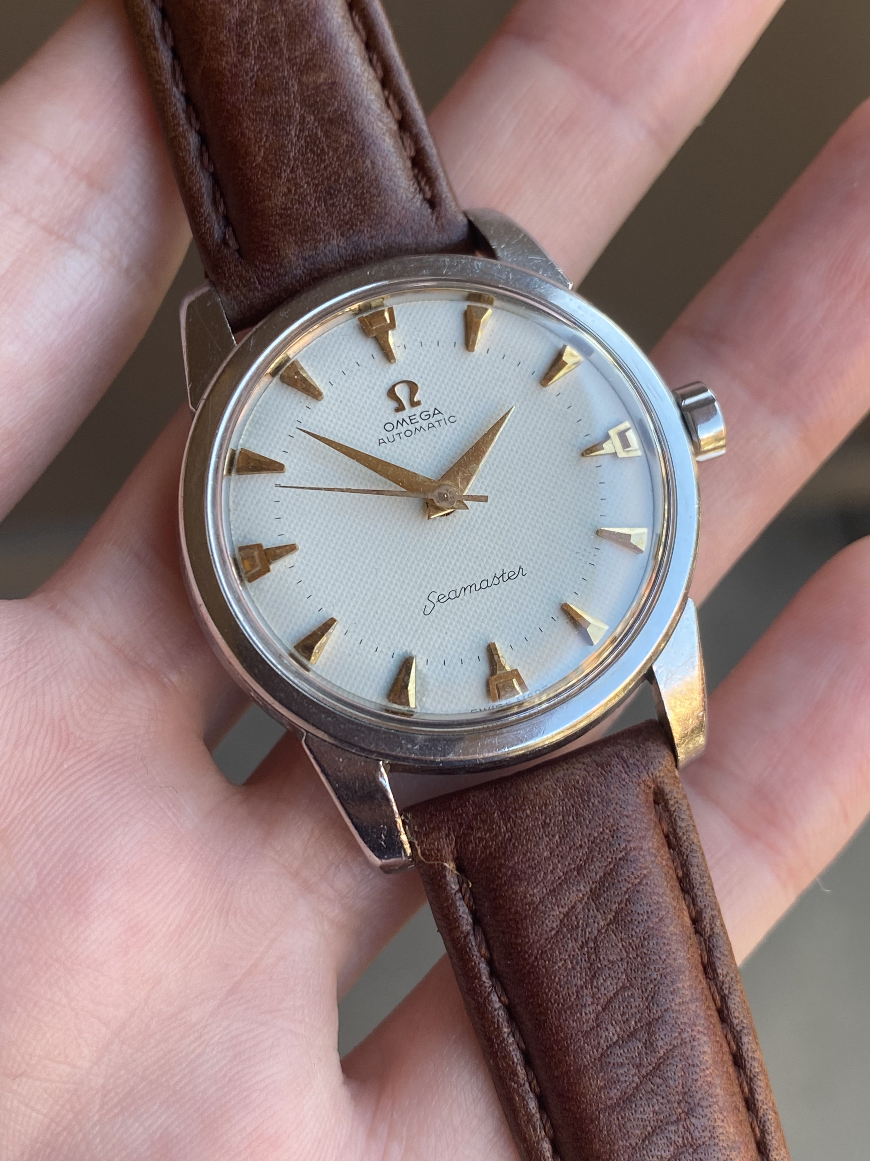 ·Up for sale is a 1959 stainless steel 2846 reference Omega Seamaster with an original white waffle dial and very uncommon trident shaped gold markers. I’ve only seen a few of these over the years, and the watch was recently fully serviced. See below for more information, and don’t hesitate to message me with questions.