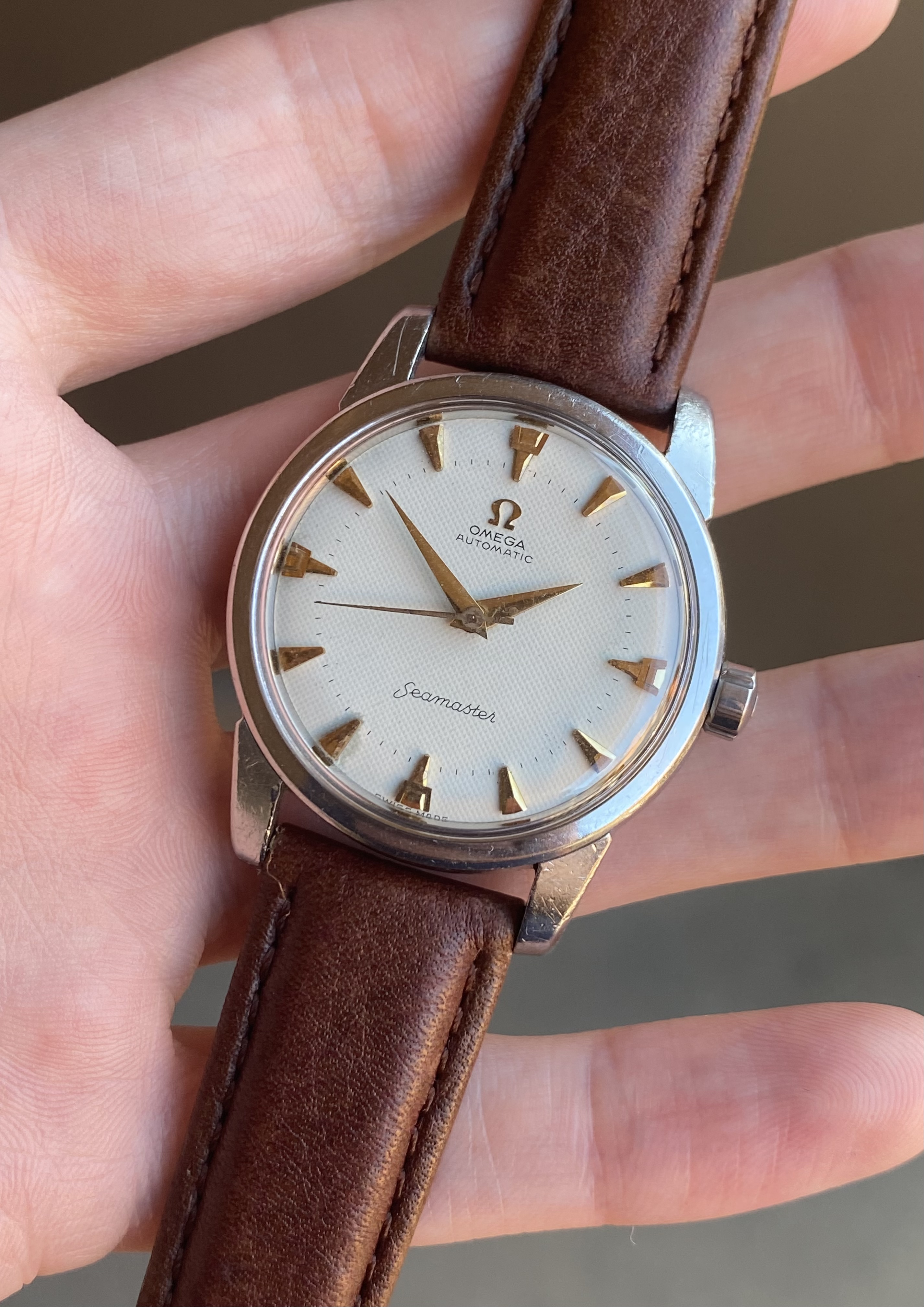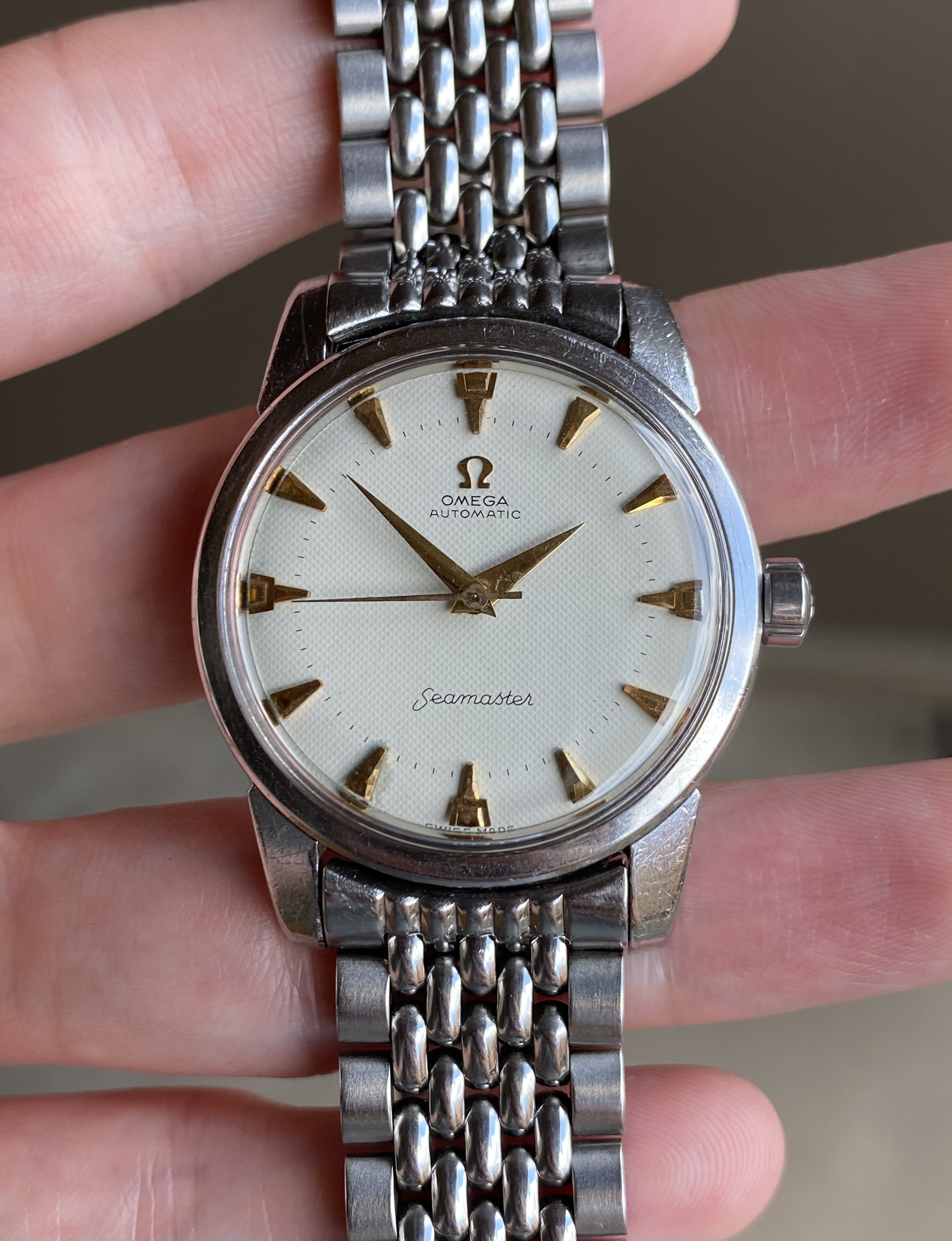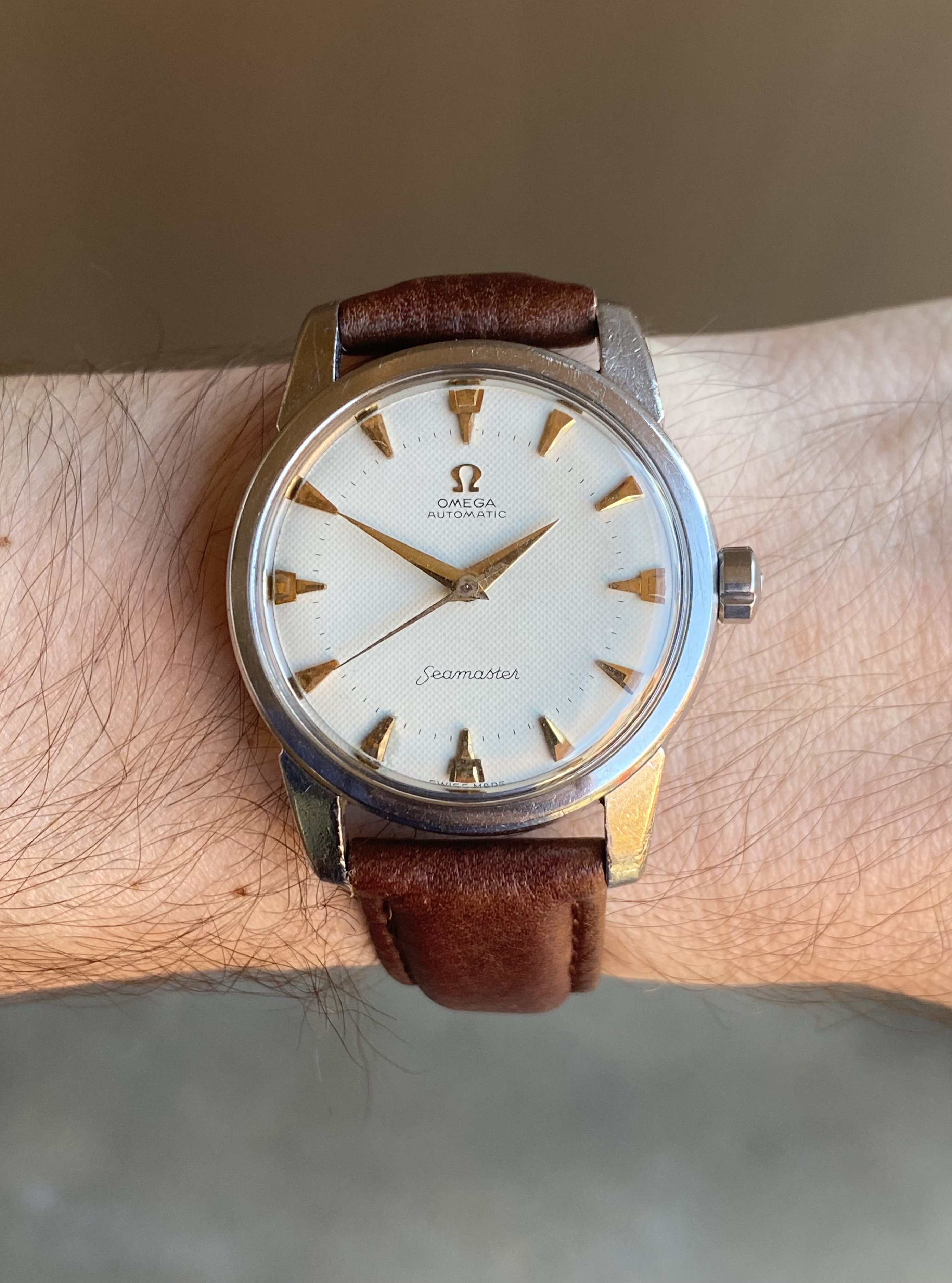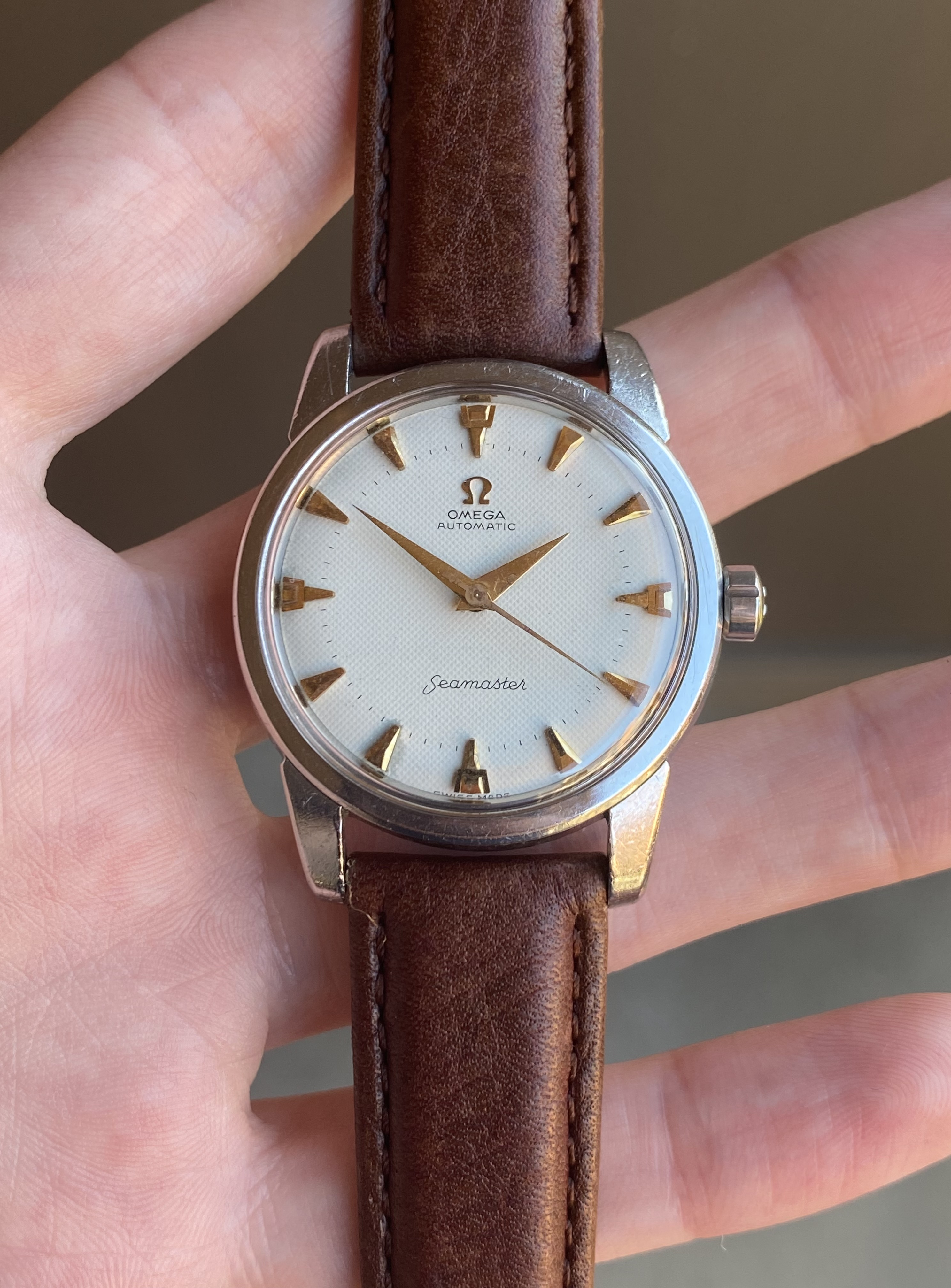 ·Up for sale is a 1959 stainless steel 2846 reference Omega Seamaster with an original white waffle dial and very uncommon trident shaped gold markers. I’ve only seen a few of these over the years, and the watch was recently fully serviced. See below for more information, and don’t hesitate to message me with questions.