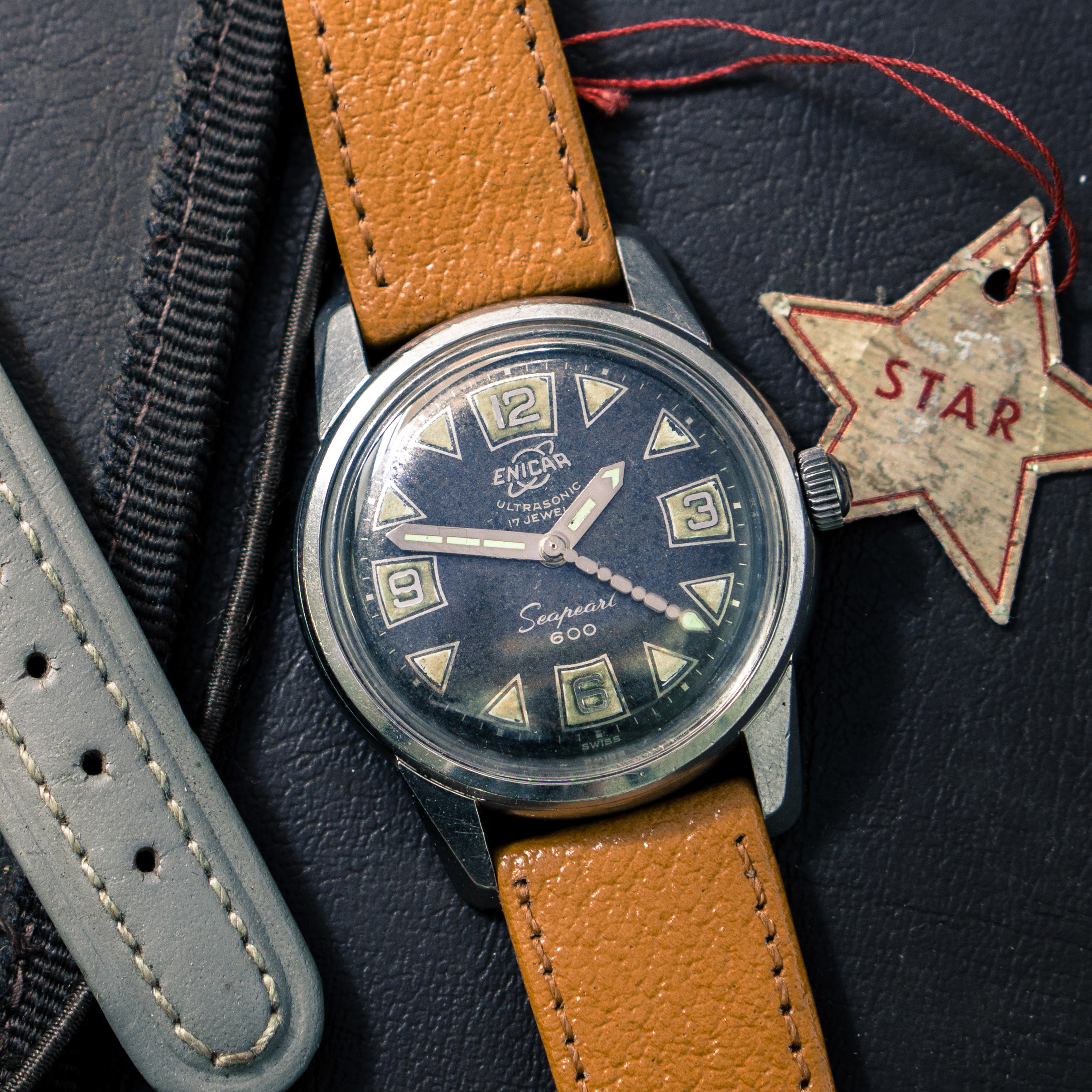 I am selling this little (a bit under 35mm) Enicar from the early diving days. Build in 1959. this watch has all the signs of an early diver: Big Radium markers and unique hands. And of cause the Enicar proven Bayonet compressor case.