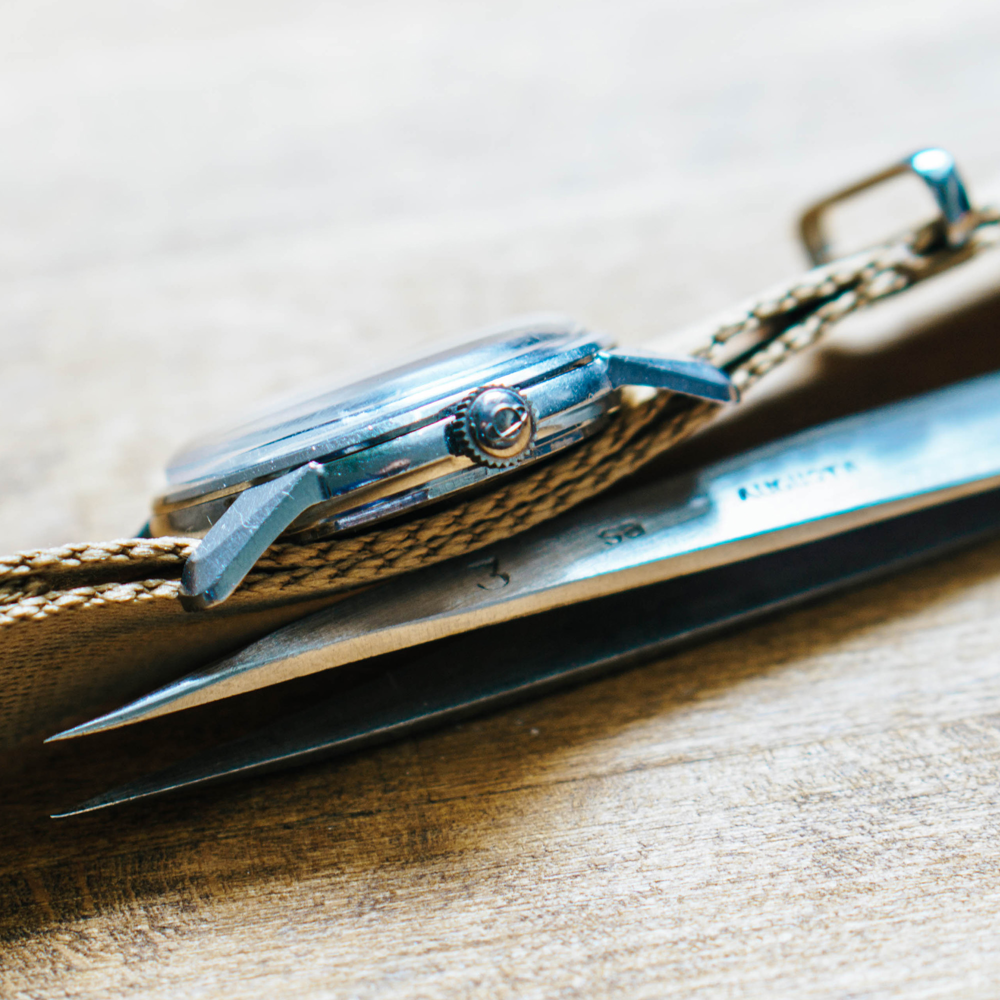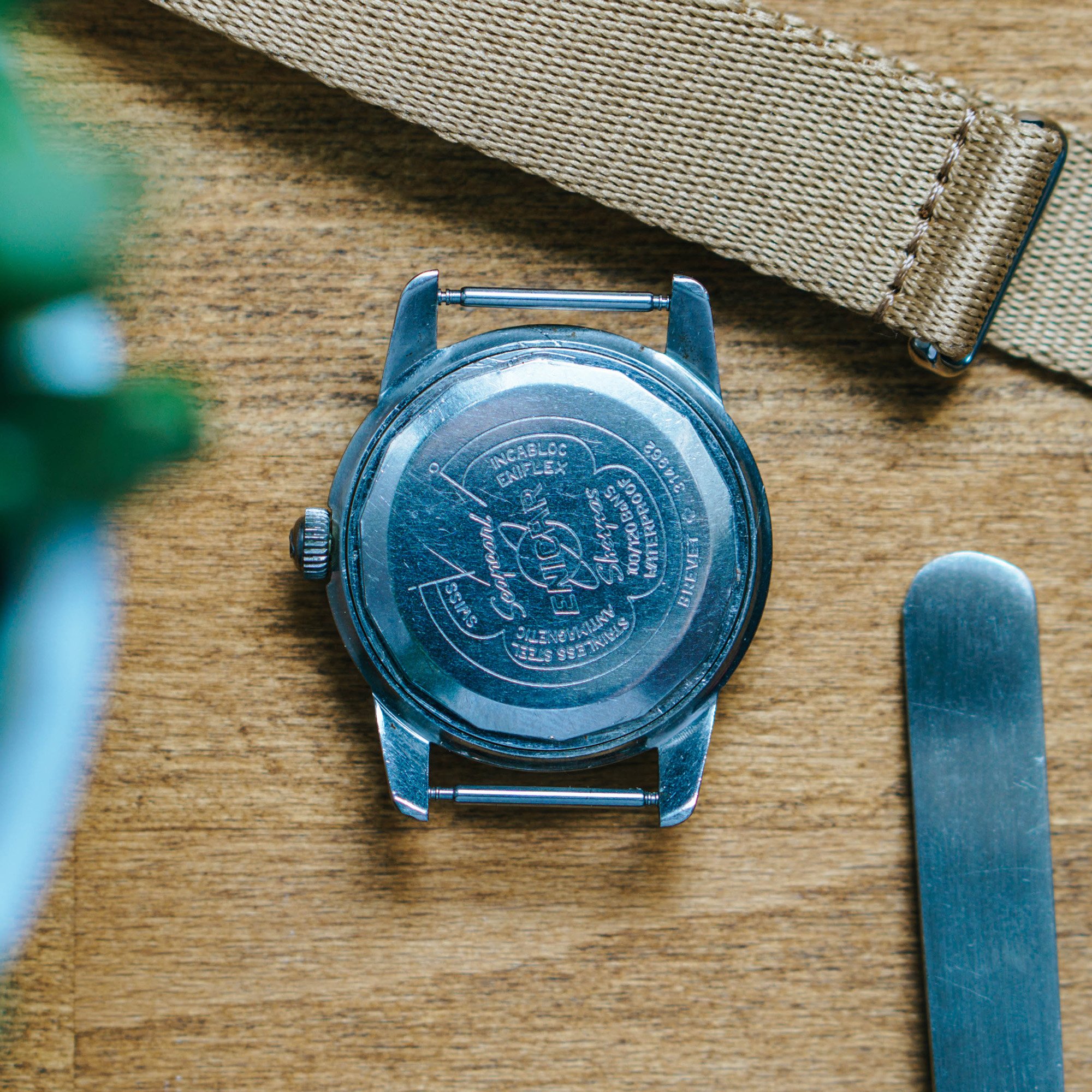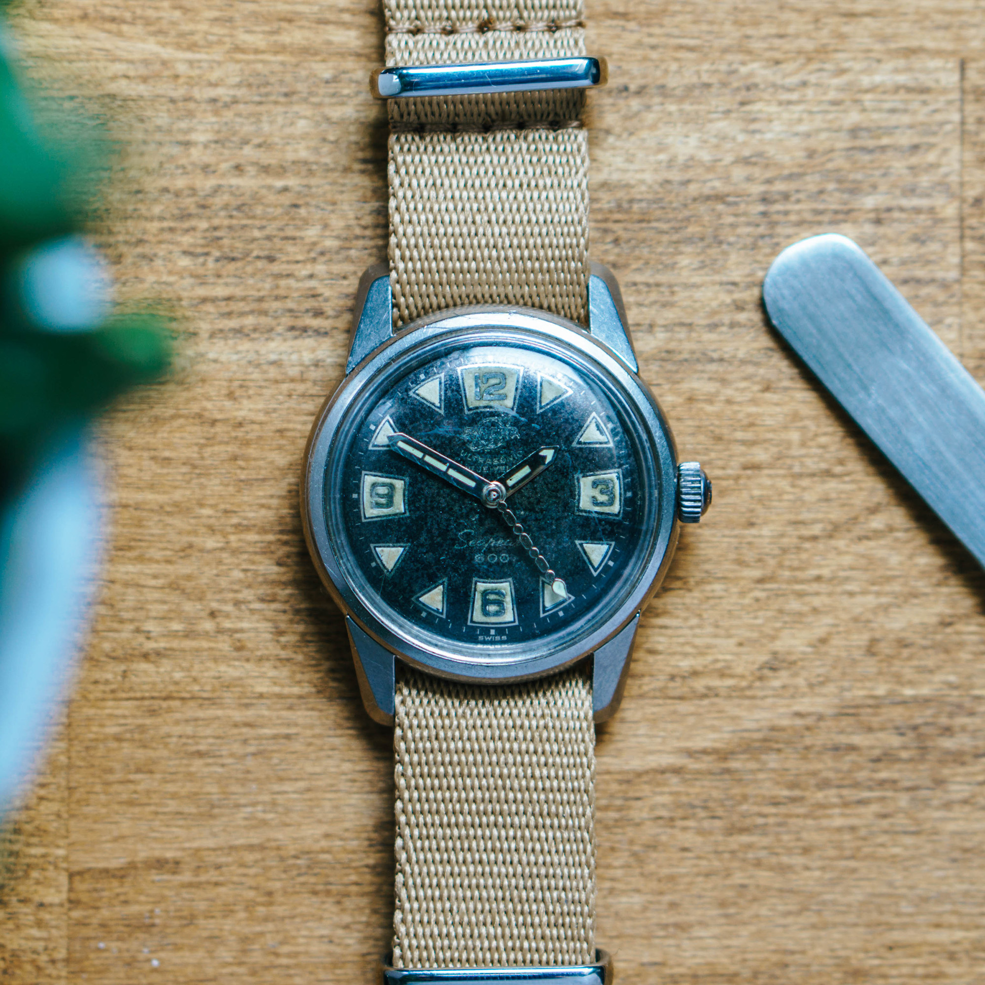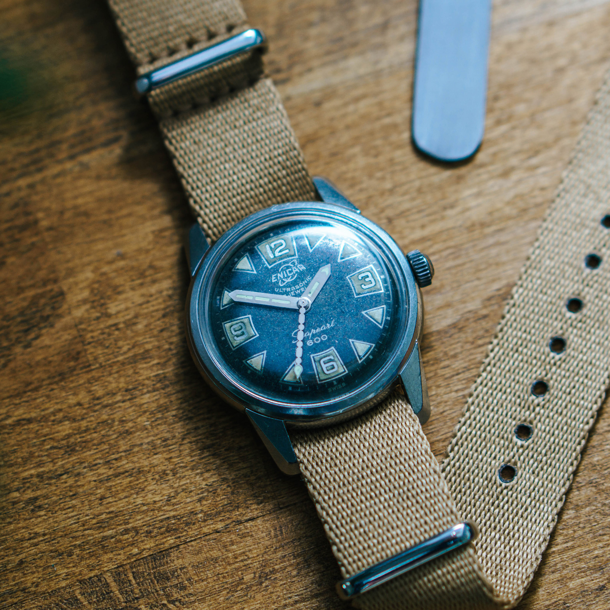 The watch itself is in a good state. It got a service a few months ago and the Cal. AR 1010 is running fine. The dial looks nice with a patina mix of stardust and tropic 😁 It has the same styling as the famous Enicar 100 fathoms crab lug diver. The crown is marked and I include the sand colored NATO strap.
