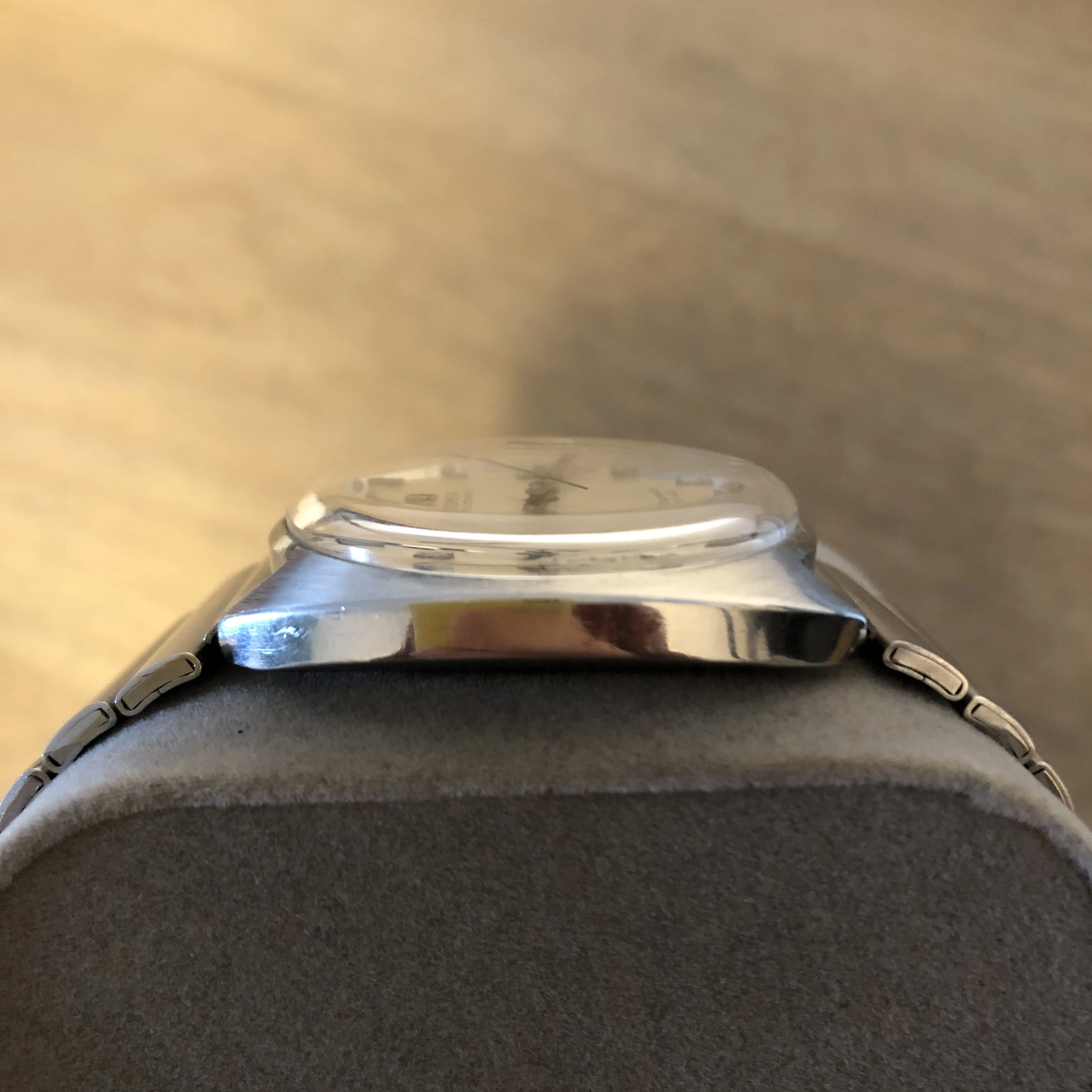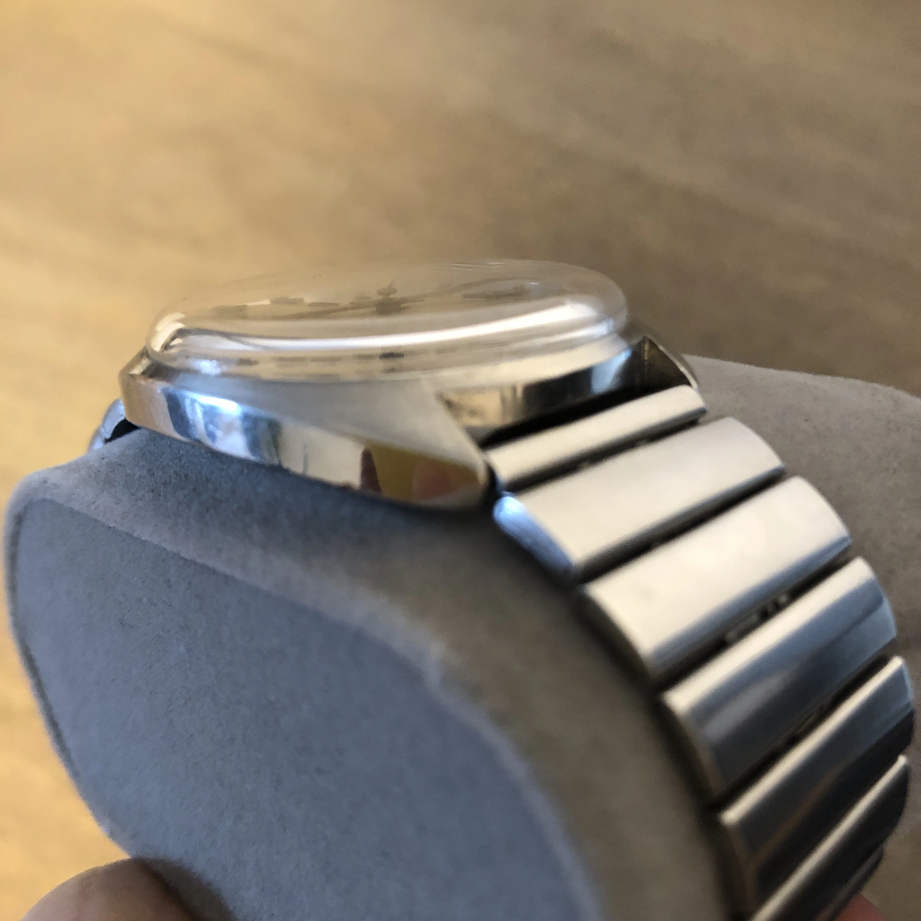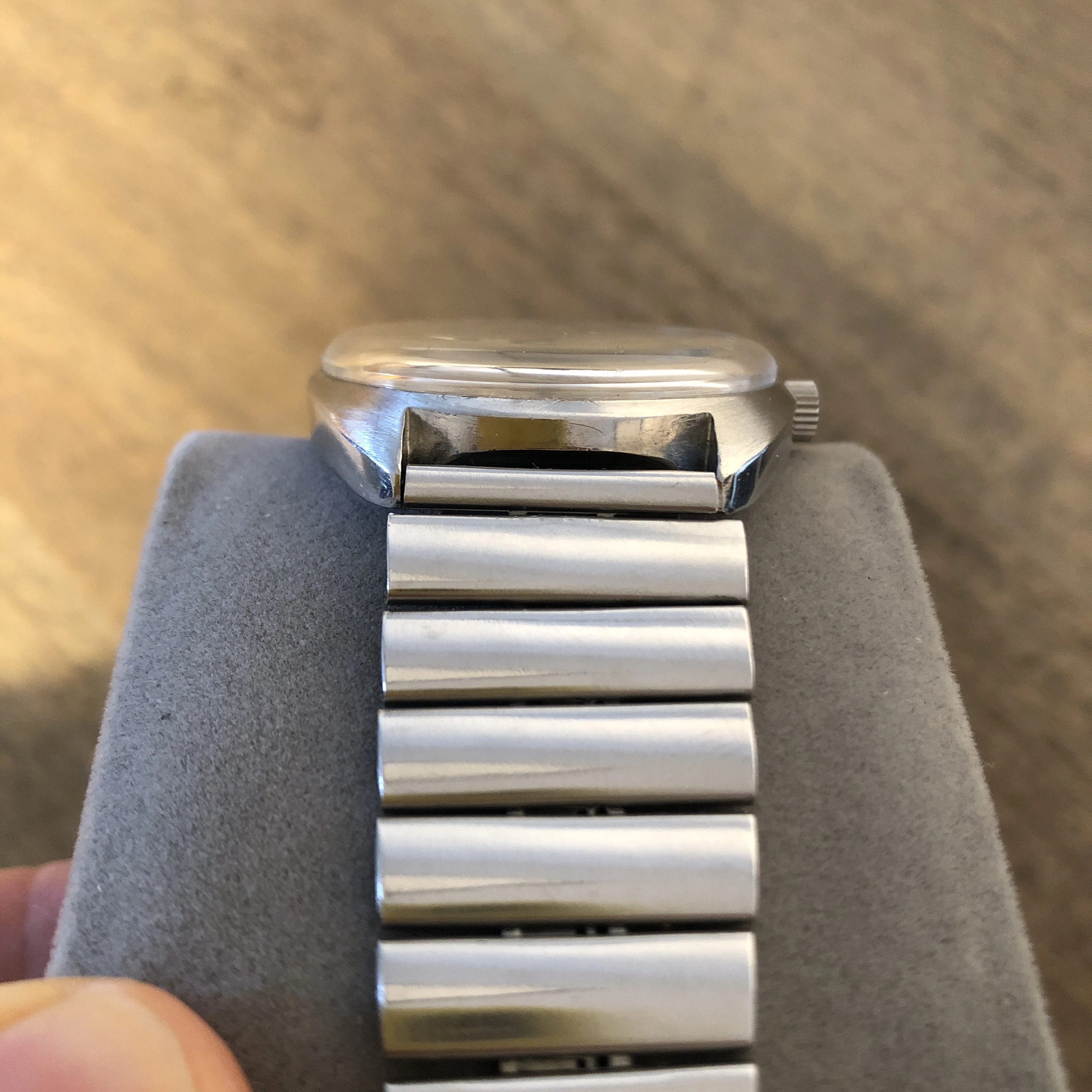This example is 18mm lug width and features the characteristic ultra-flat, lightweight expandable construction typical of Holzer-supplied pieces. It wears very slim and sits particularly well on mid-60s Omega dress cases.