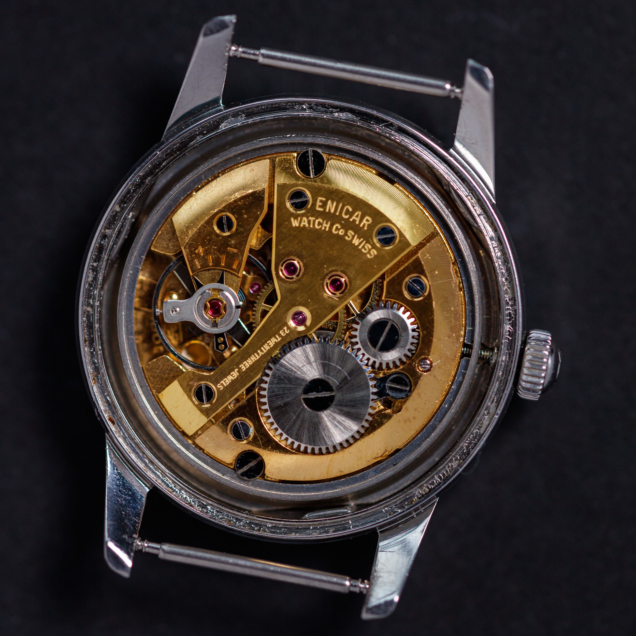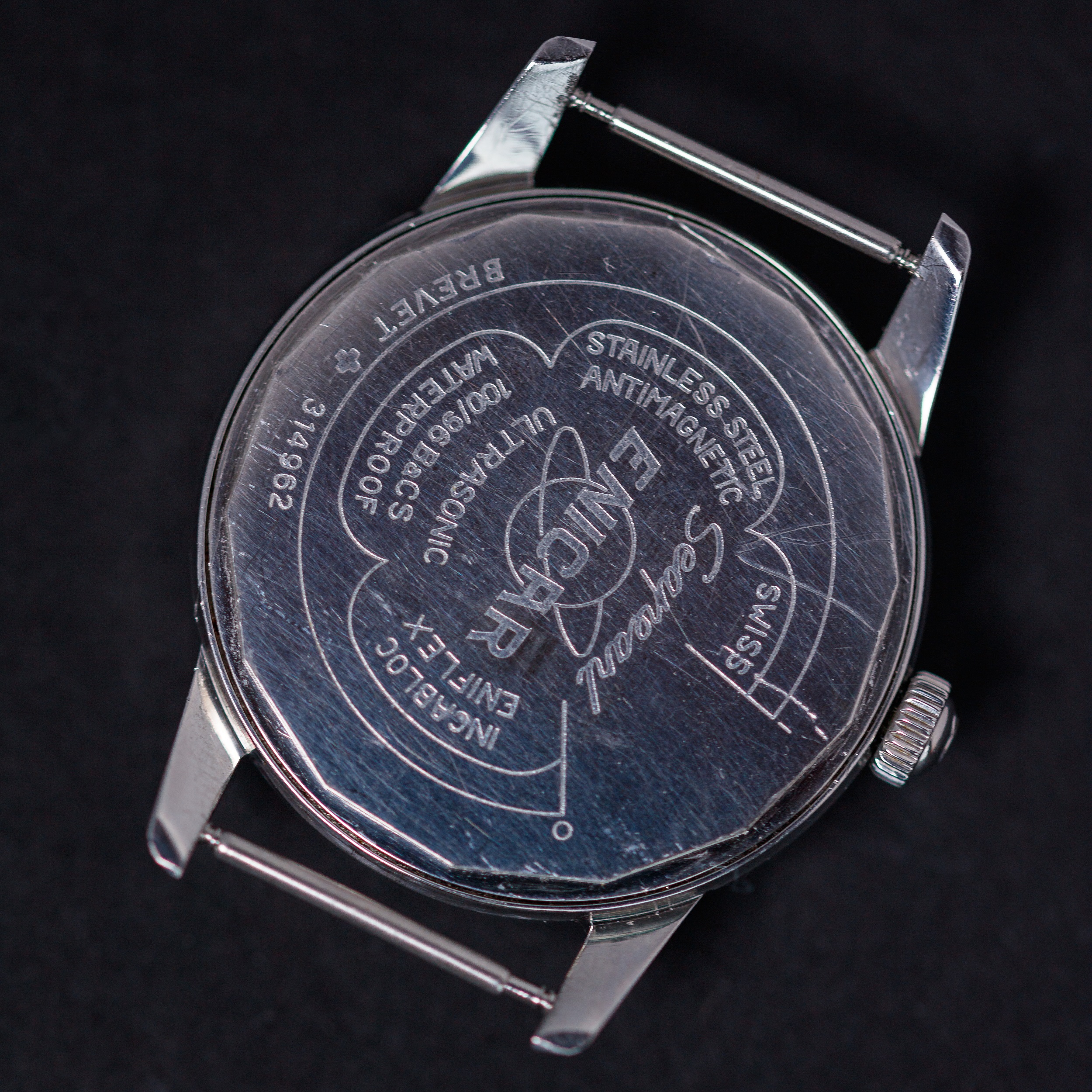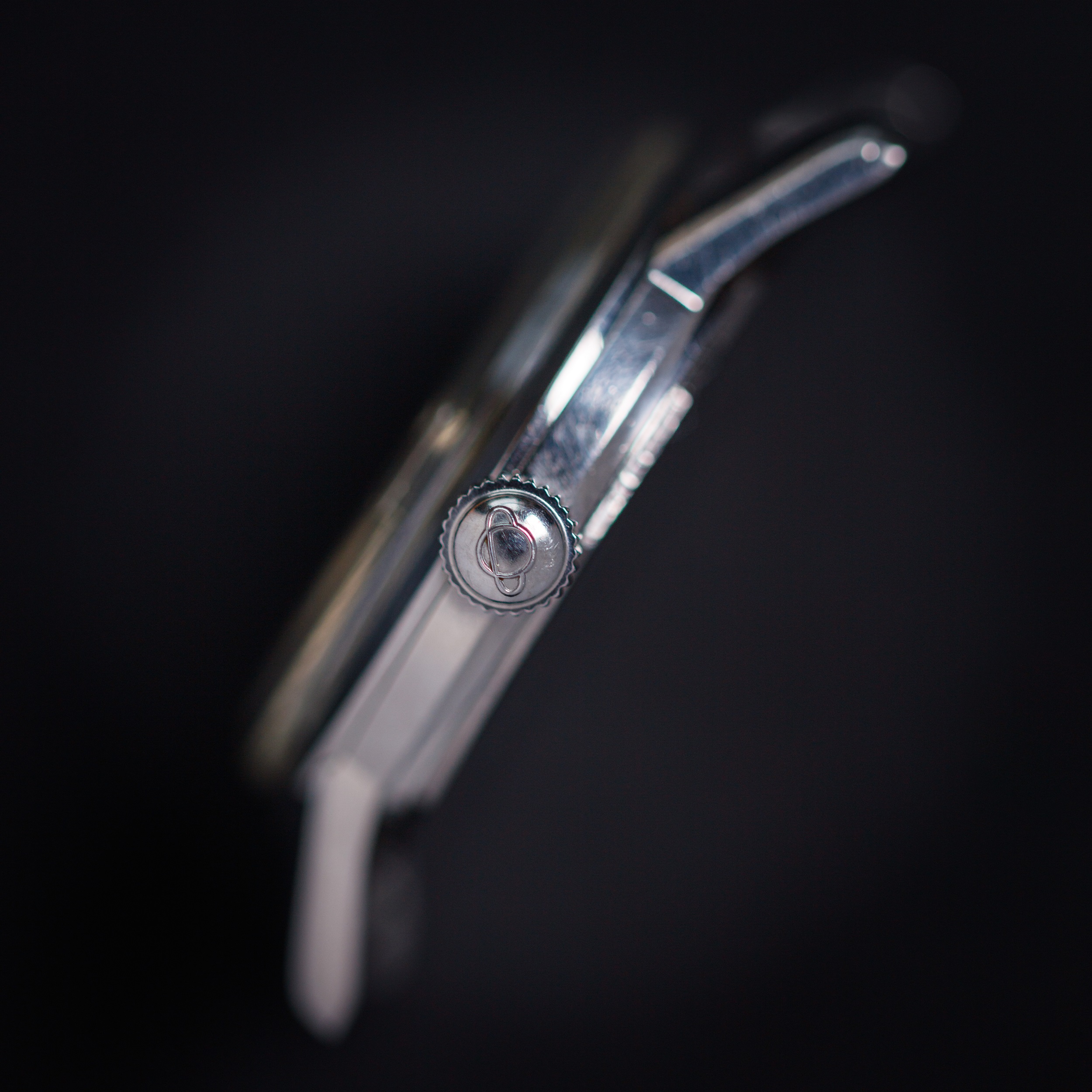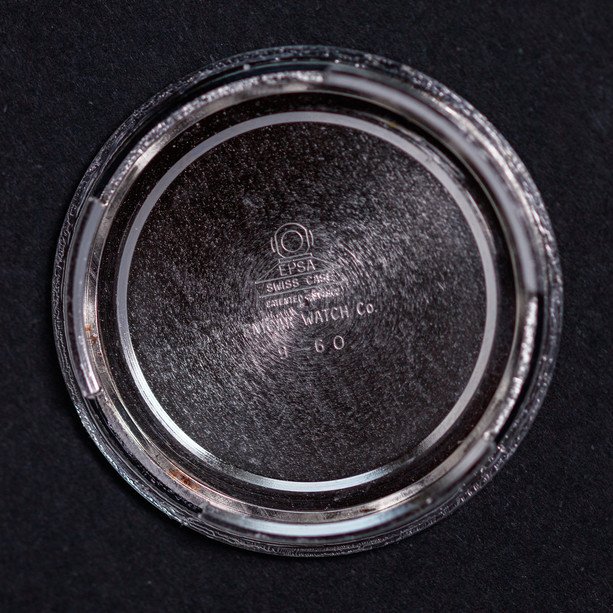 Original stainless steel EPSA case measures 35mm excluded original signed crown and appears untouched to me, with sharp edges and very light signs of wear here and there. Screw down caseback retains all factory inscriptions which are still perfectly readable outside and inside, where we find the production mark 9-60 that allows us to date the watch back to september, 1960. Lug width 18mm.