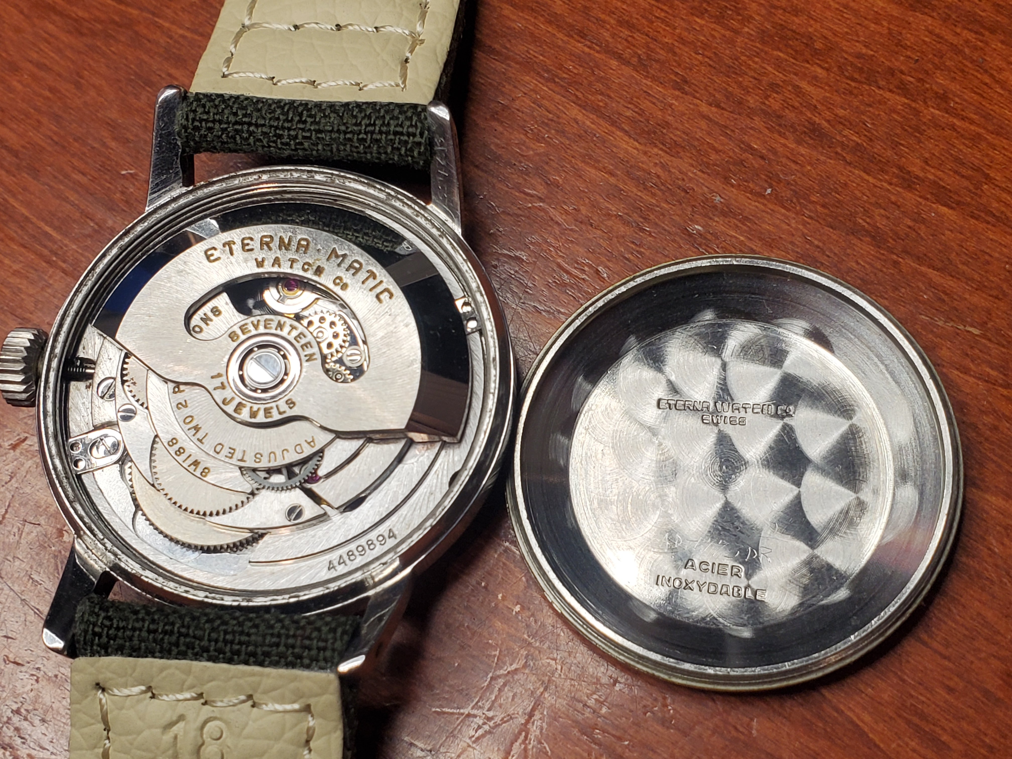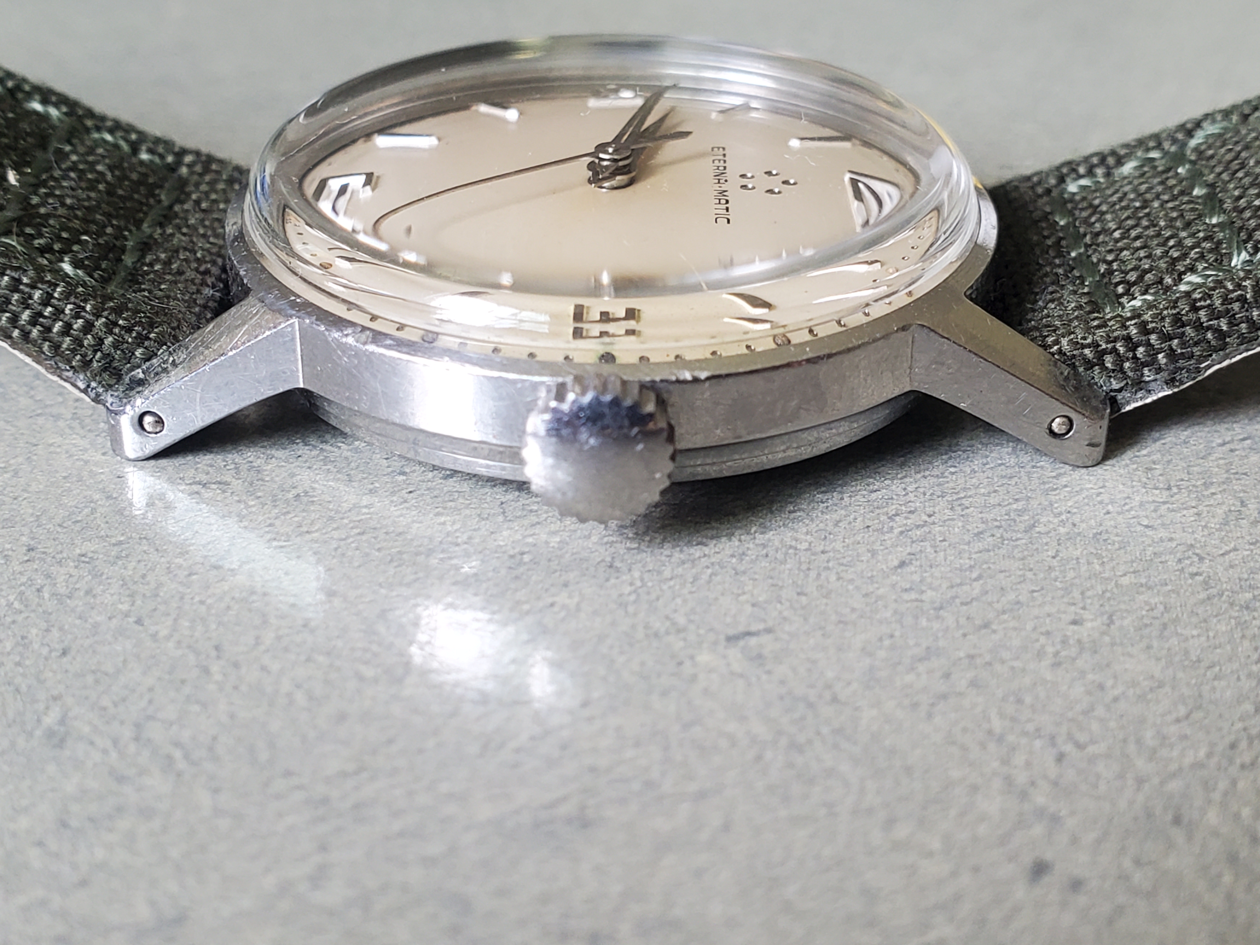 ·I just got this nice-looking watch off eBay. I was about to share it in the Eterna Matic thread, but I realized after looking through the entire thread and a Google image search that I couldn't find a similar dial. In particular no other examples I've come across have numerals like this. The numerals are what attracted me to it in the first place (damage at 3 notwithstanding), but I can't tell if they're just unusual or problematic.