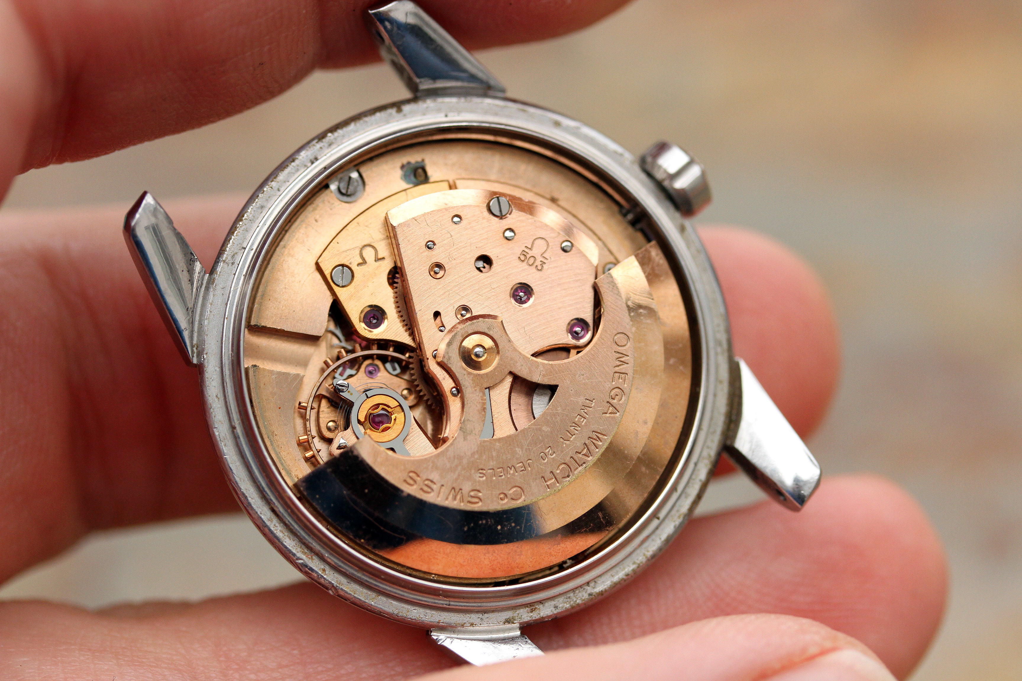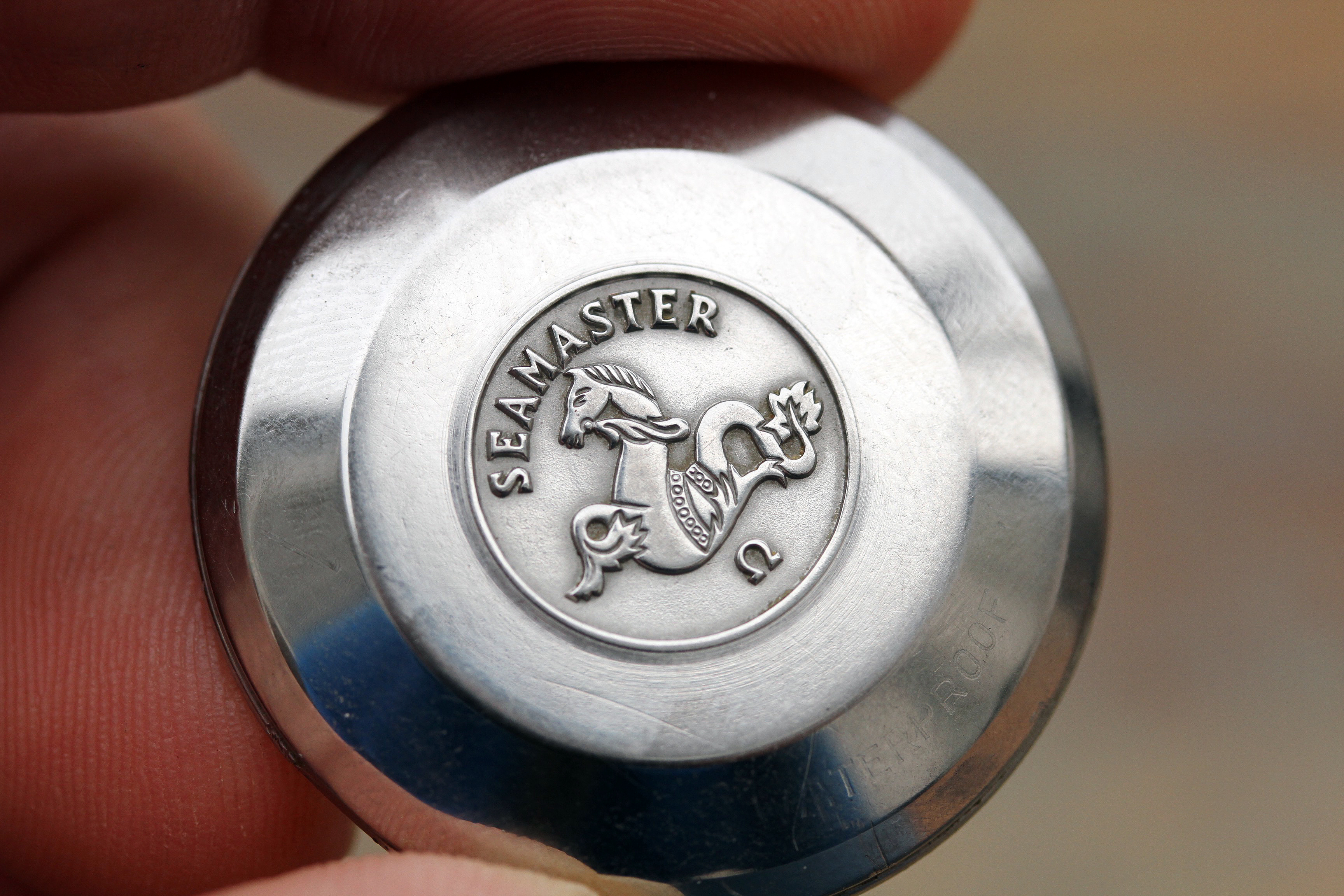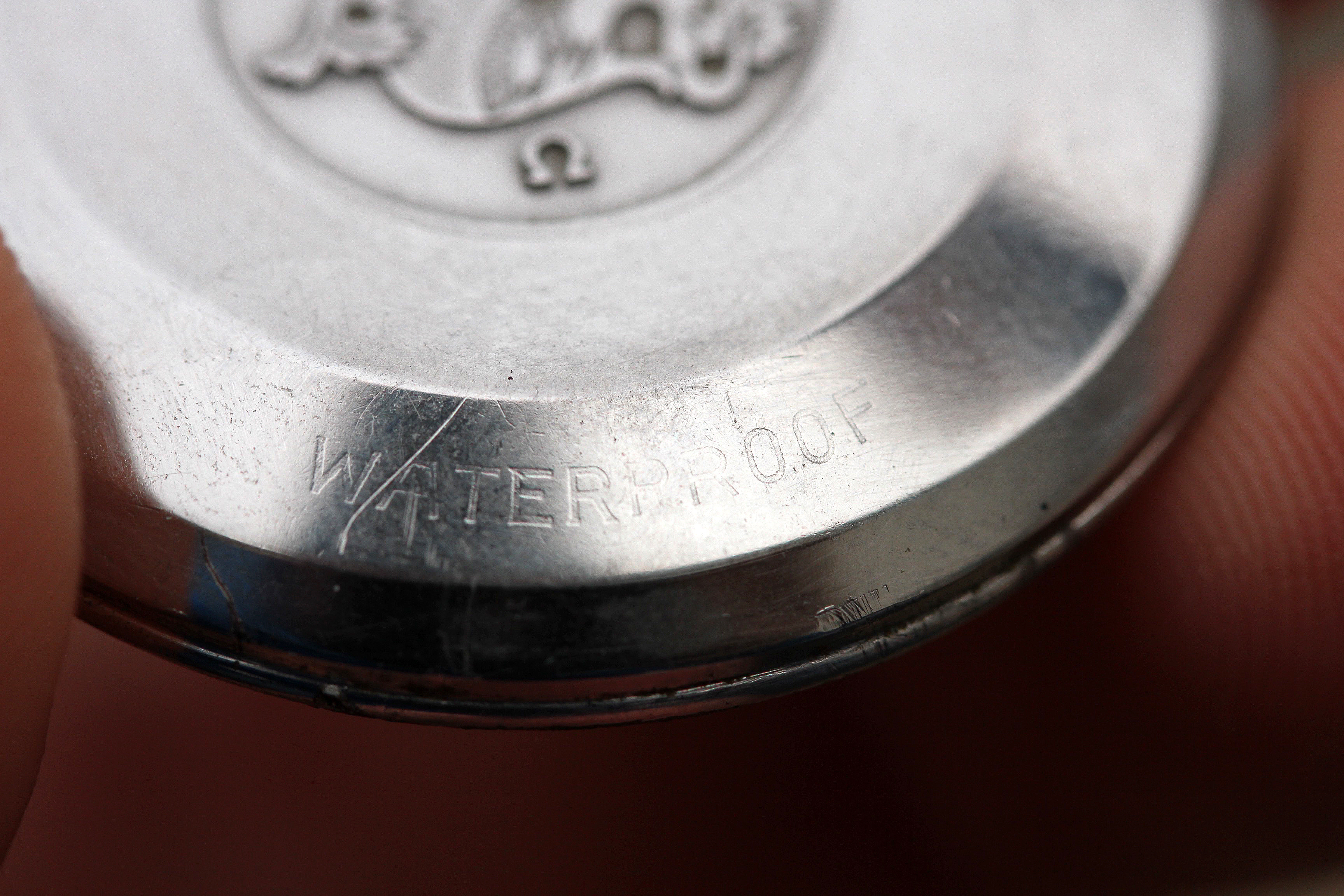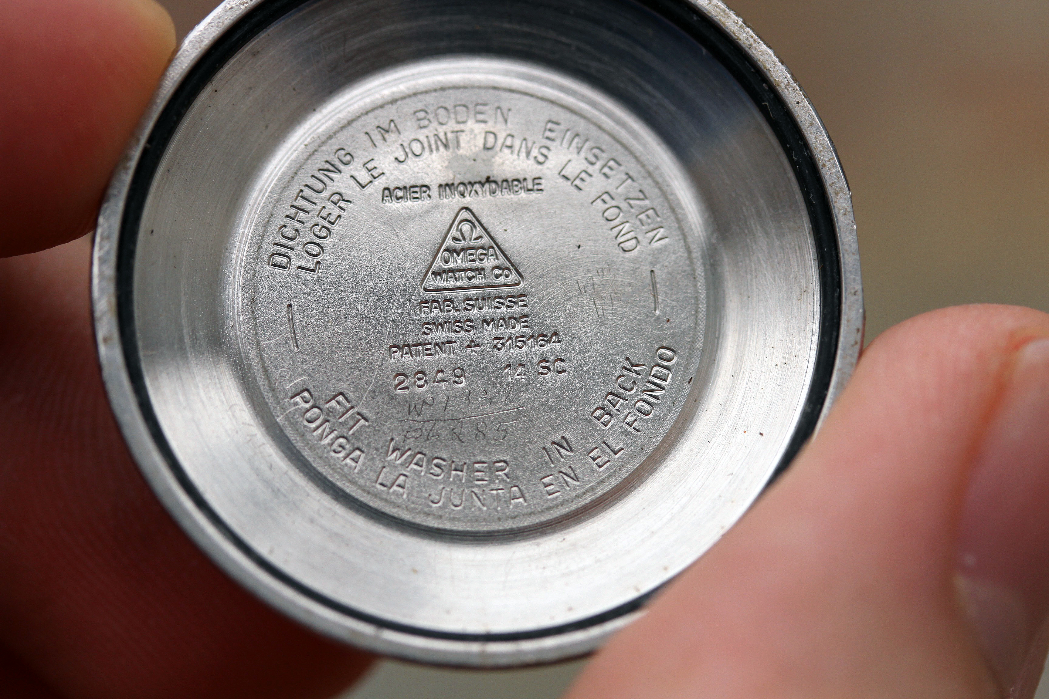 Caseback is original and is in excellent vintage condition. Very crisp outer engraving, inside is stamped 2849, the "waterproof" engraving is still clearly visible. It is usually worn down or polished off.