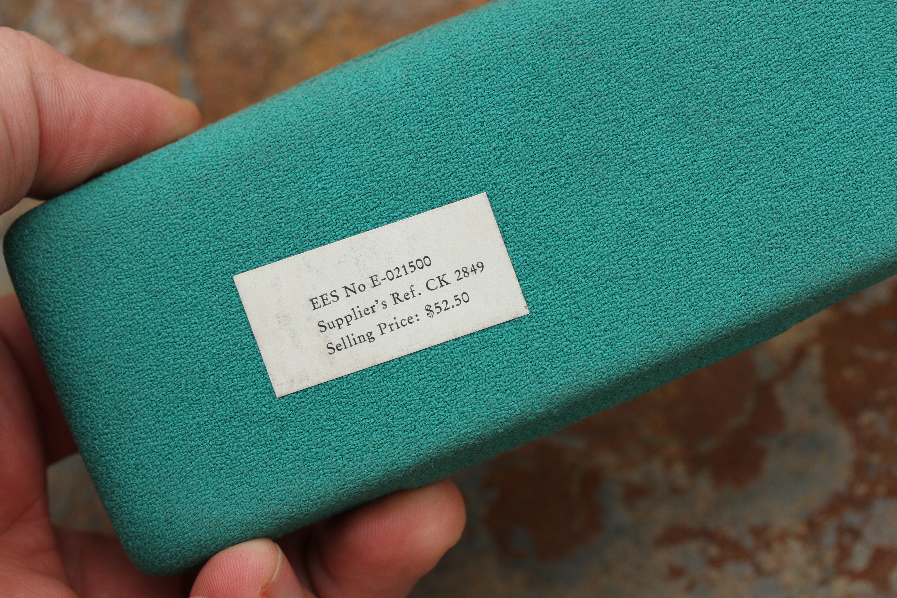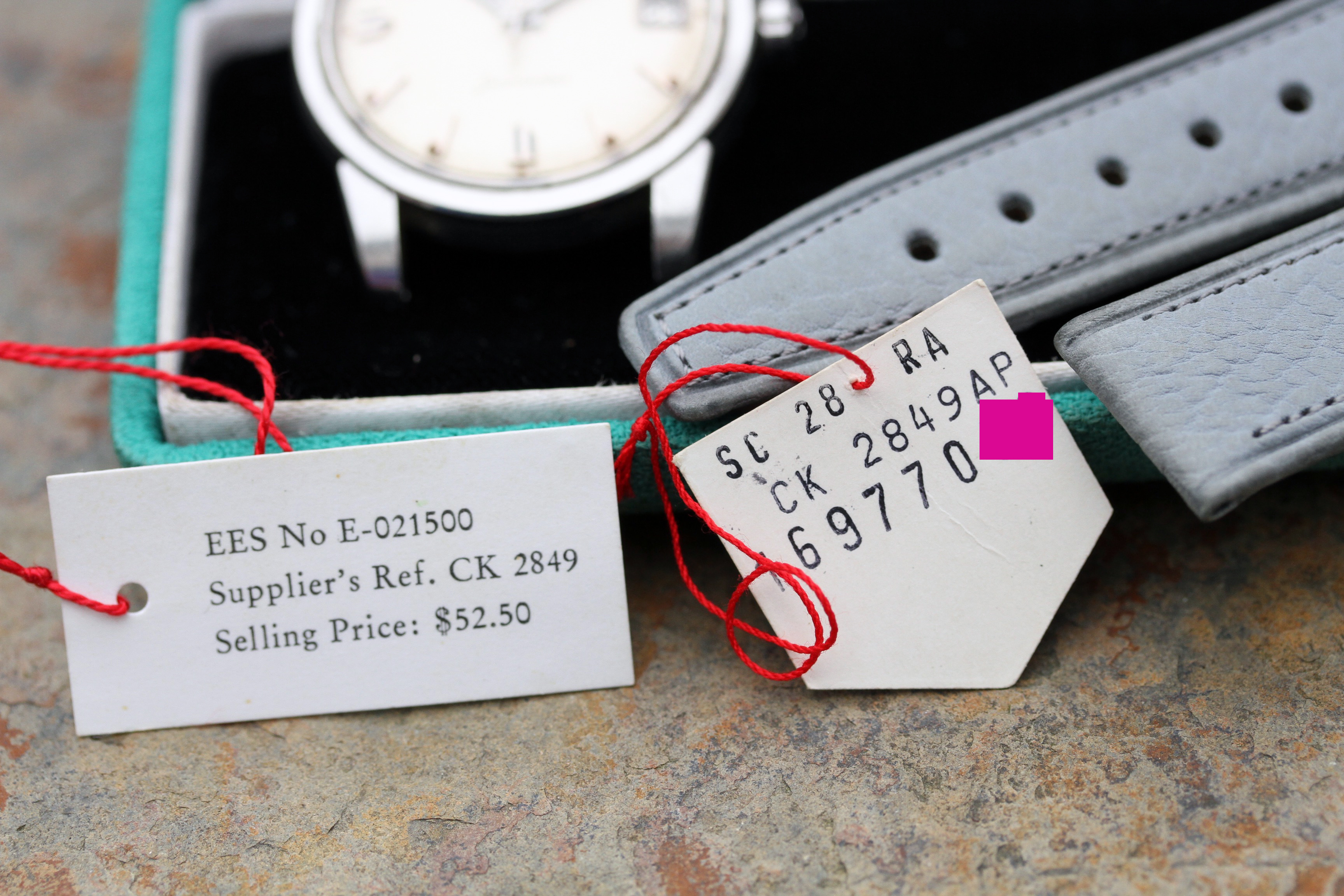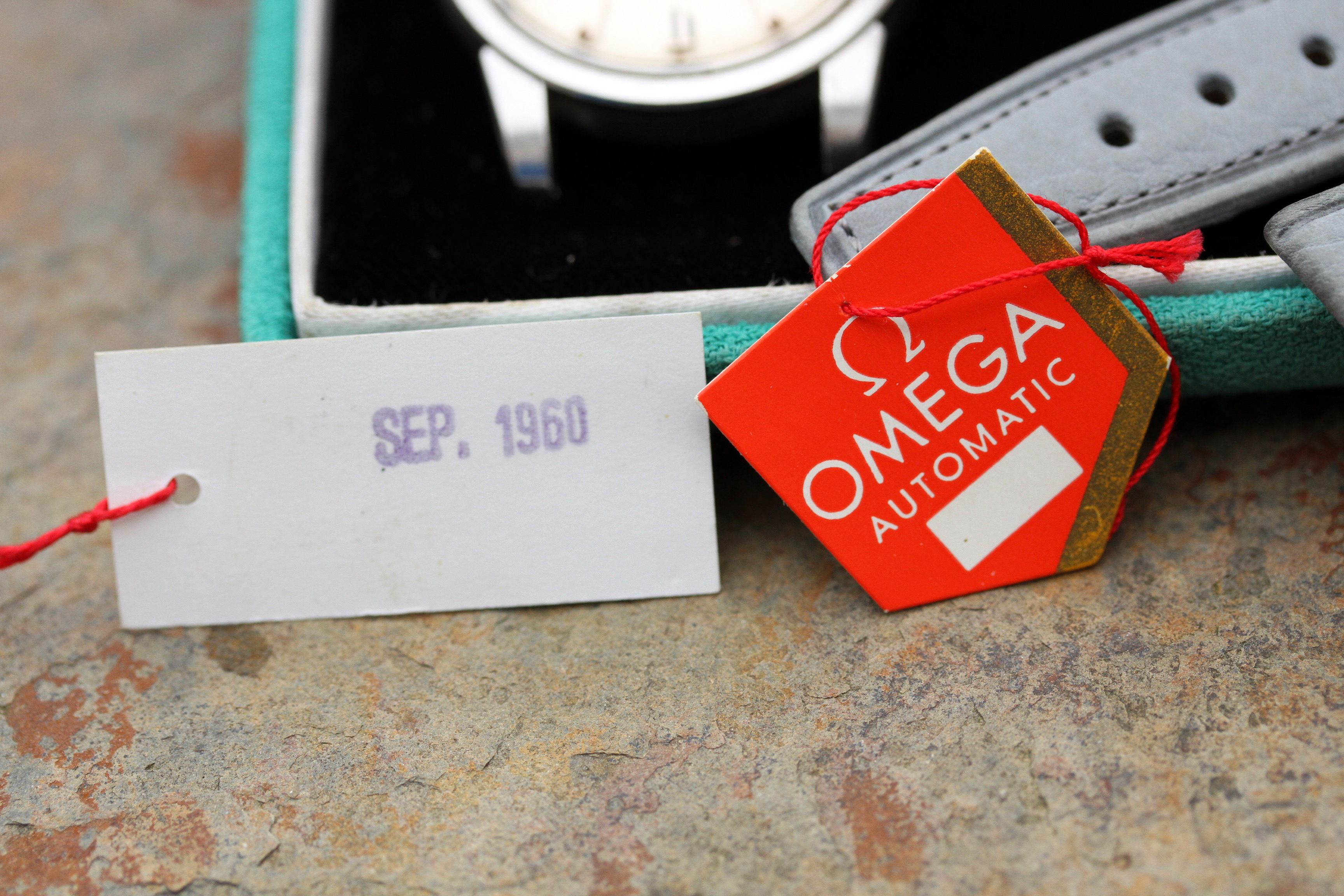 Watch comes with what seems to be original Omega box to this watch. Bottom has a matching sticker to the watch. This watch is also accompanied by original hang tags. One contains the reference and matching serial numbers to the watch, other has reference, original selling price of $52.50 as well as date stamp Sept. 1960, which is probably when this watch was shipped to the AD from Omega.