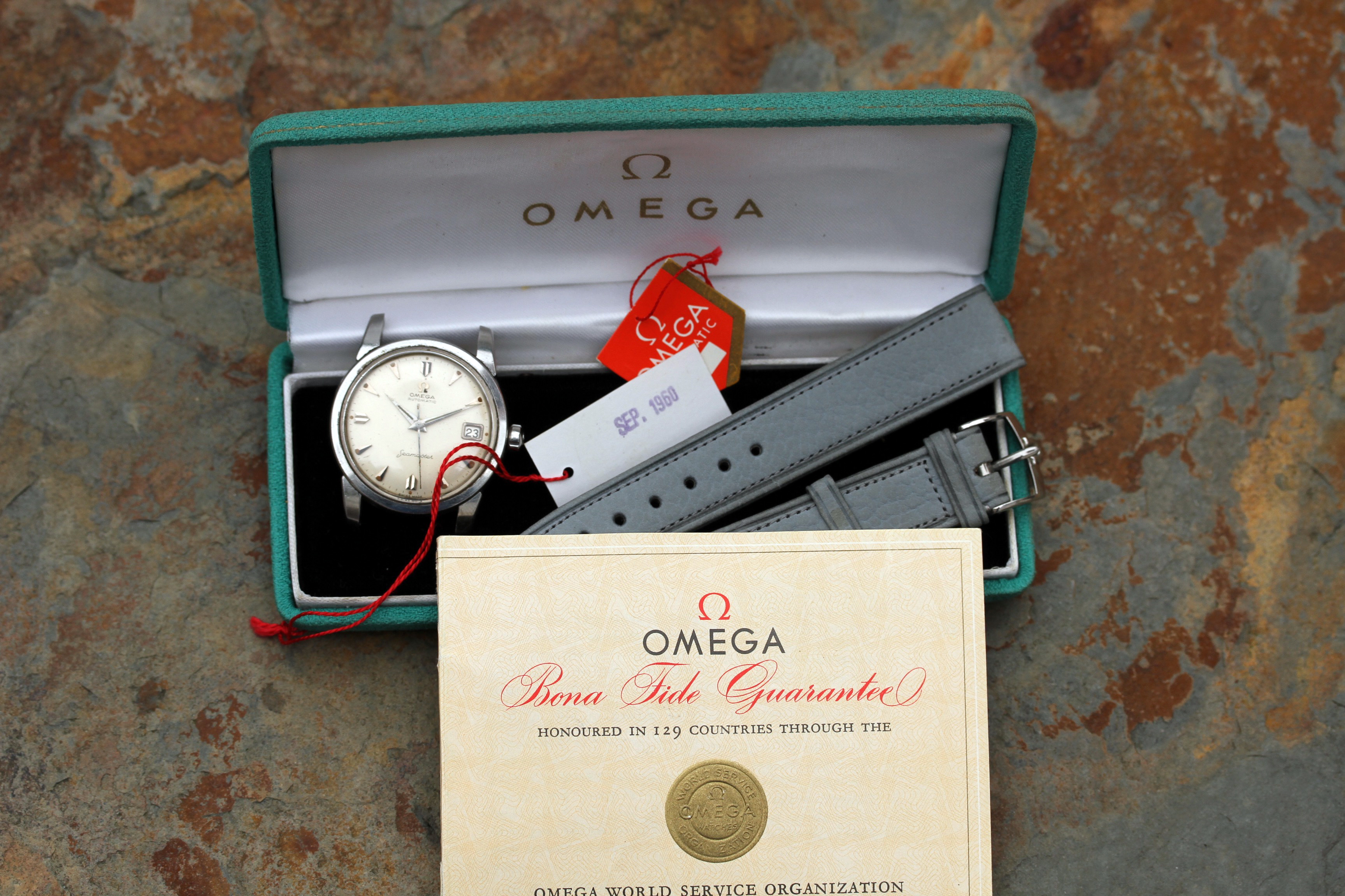 An NOS condition, unworn and unmounted Omega gray leather strap is included, also believed to be original to this set. Strap is signed Omega and has a steel Omega signed buckle.
