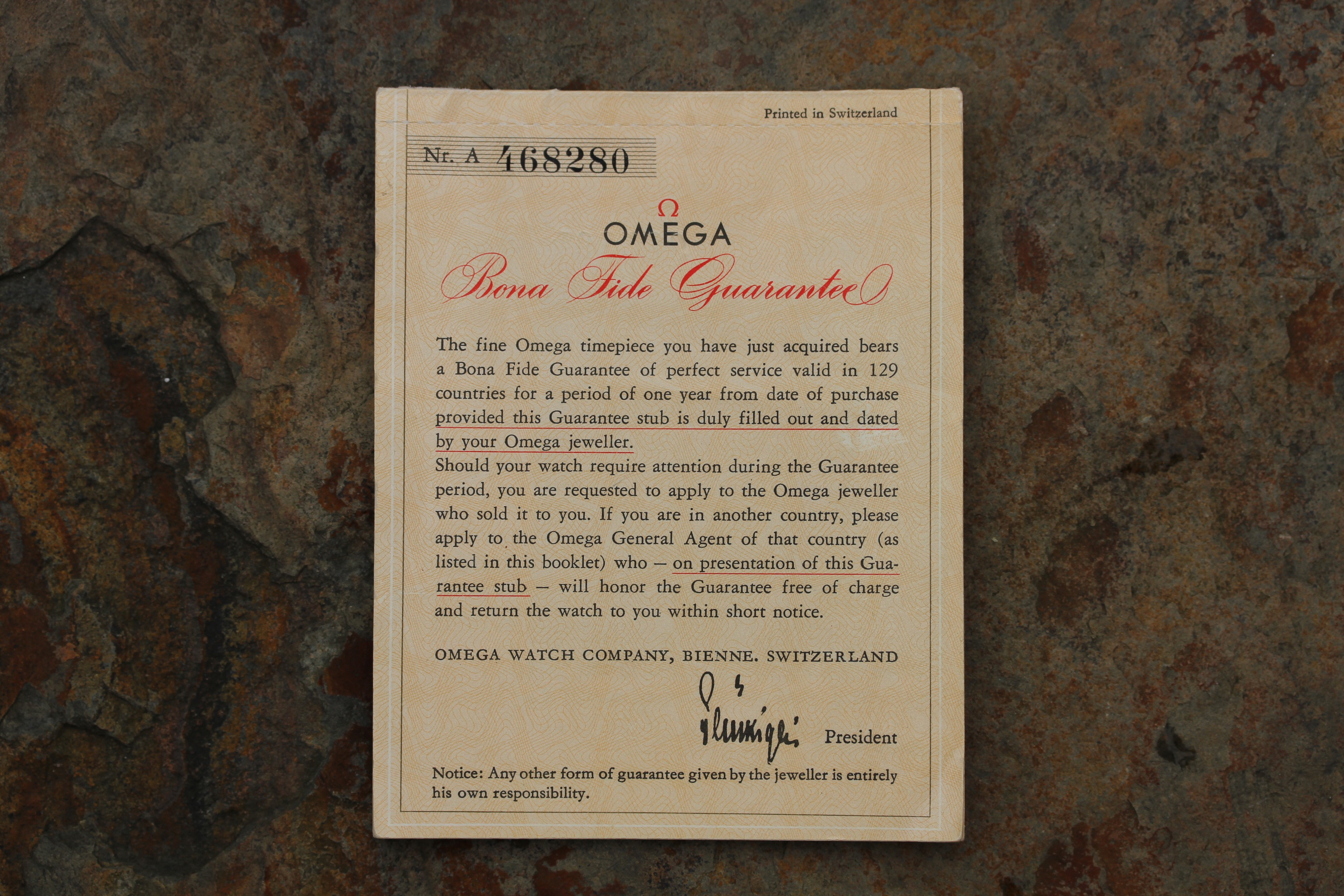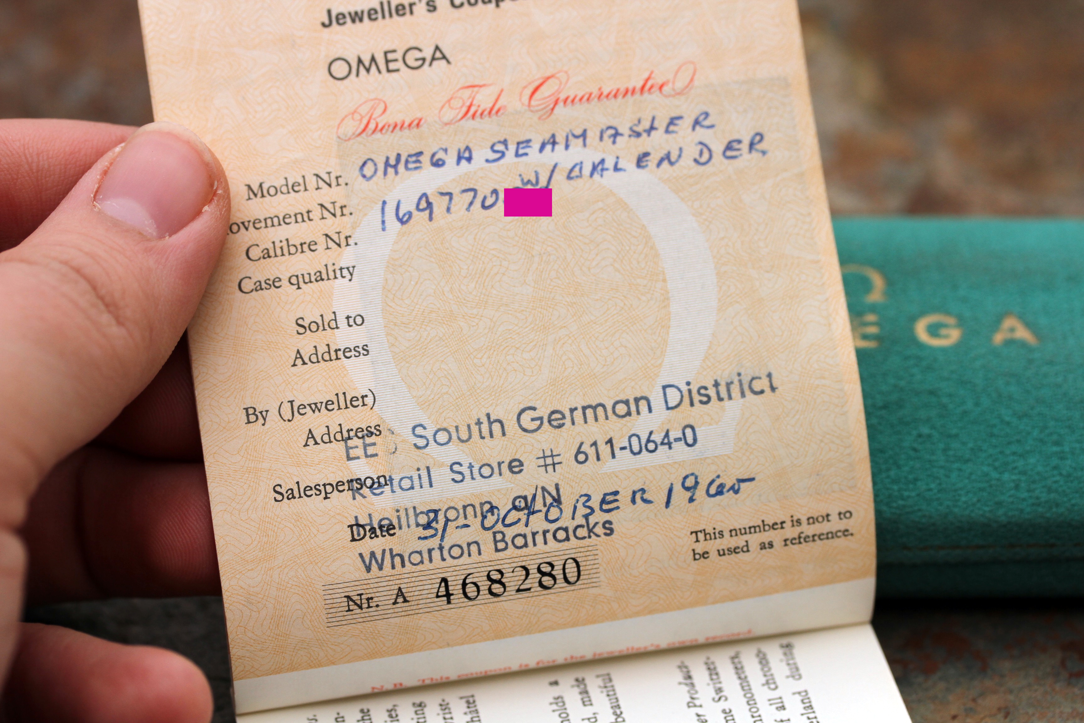 The warranty booklet is also included. It is signed and dated in 1965 with matching serial number to the watch.