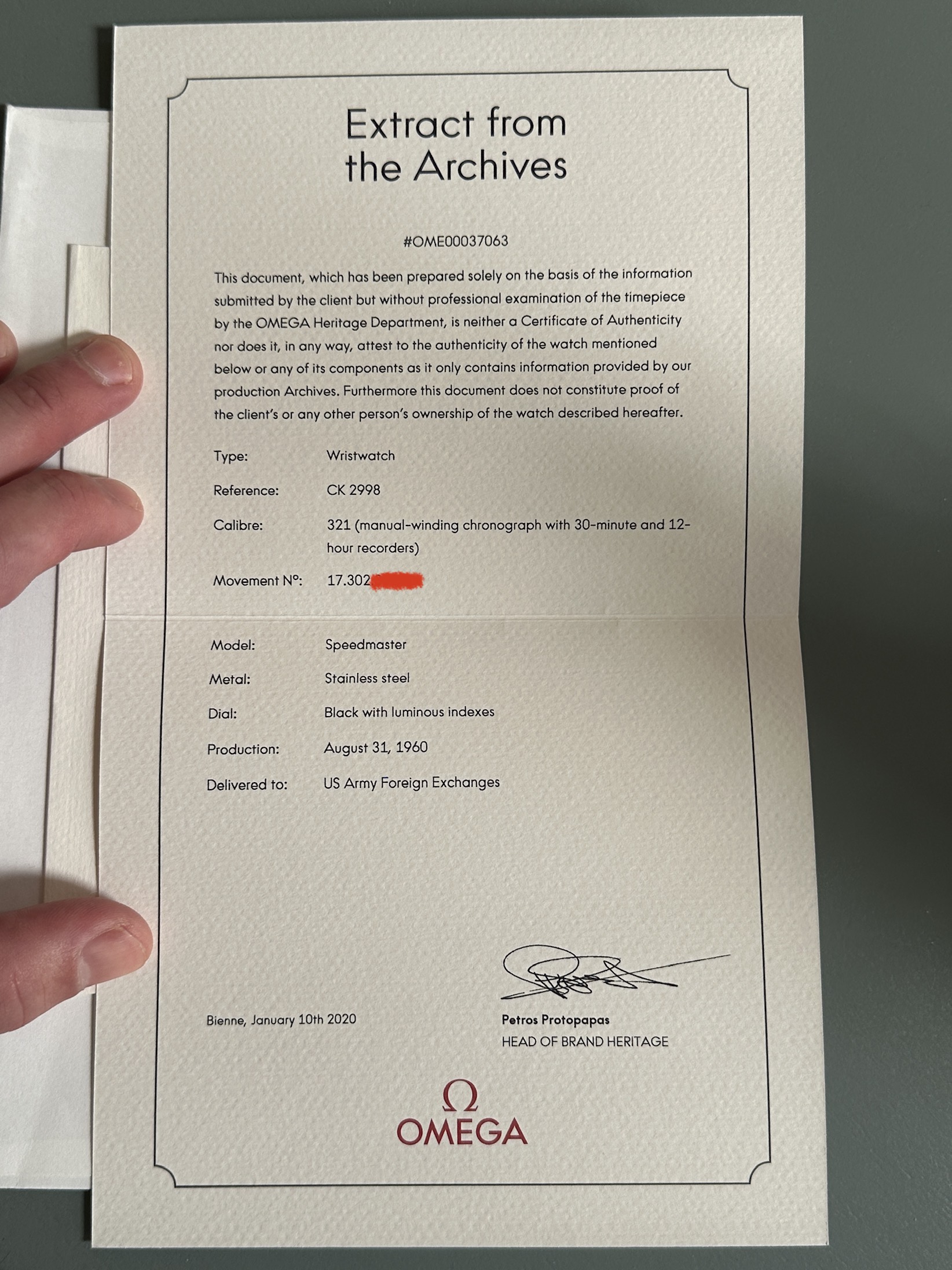 ·Up for grabs is a 2998-2 Speedmaster, August 31,1960 extract with delivery to the US Army Foreign Exchanges