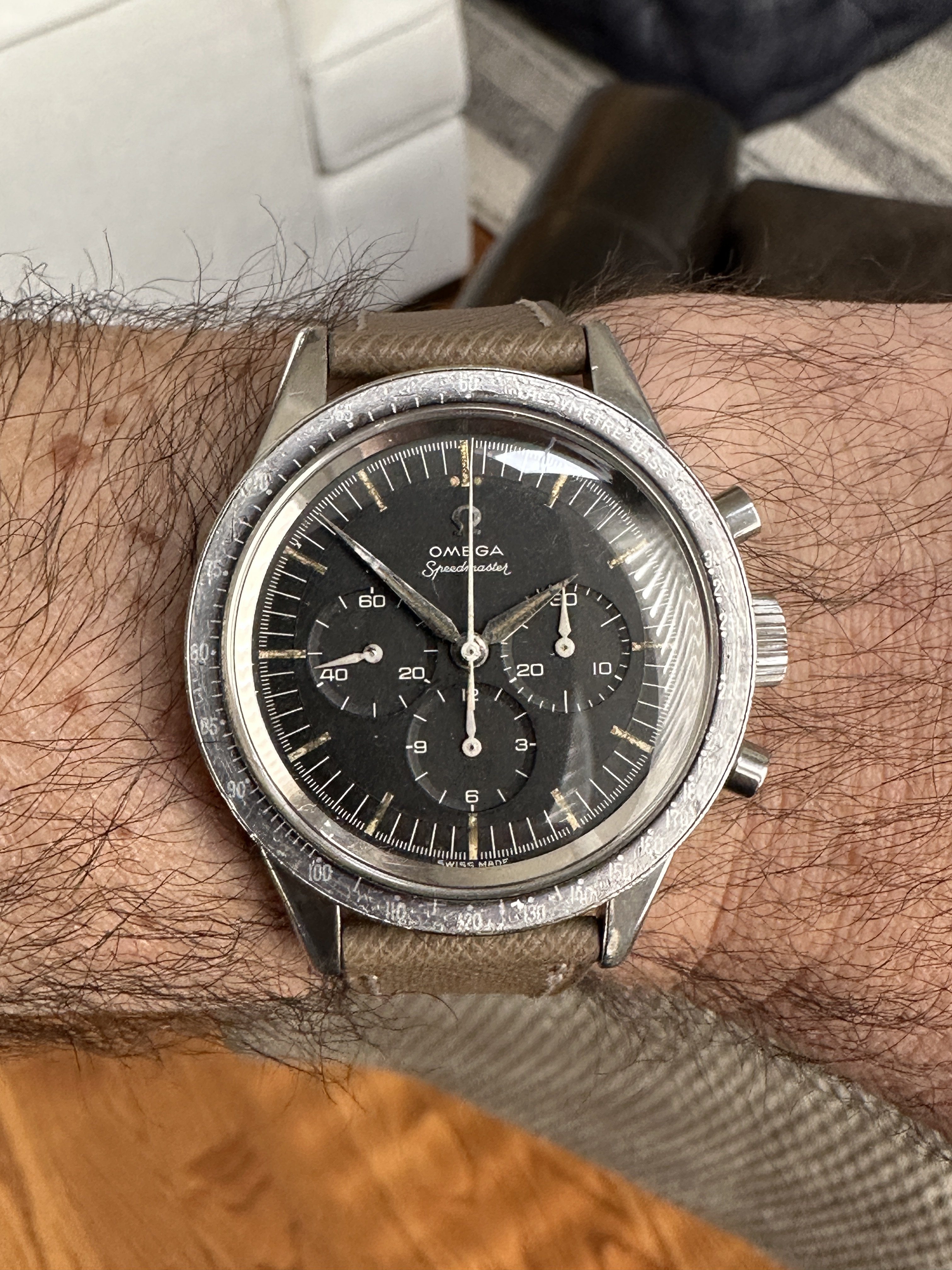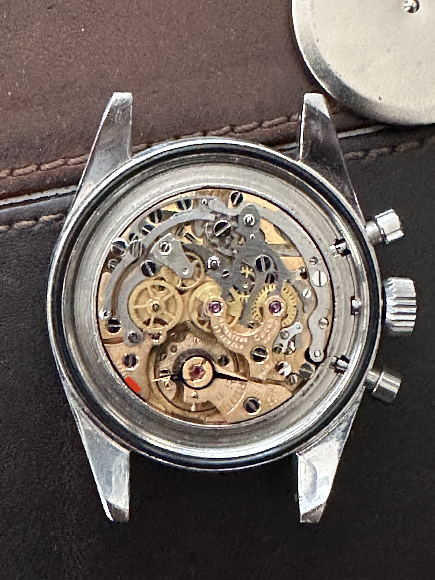 Movement: 321 looks to be in good condition, service history unknown. It winds smoothly and keeps good time, chrono functions work.