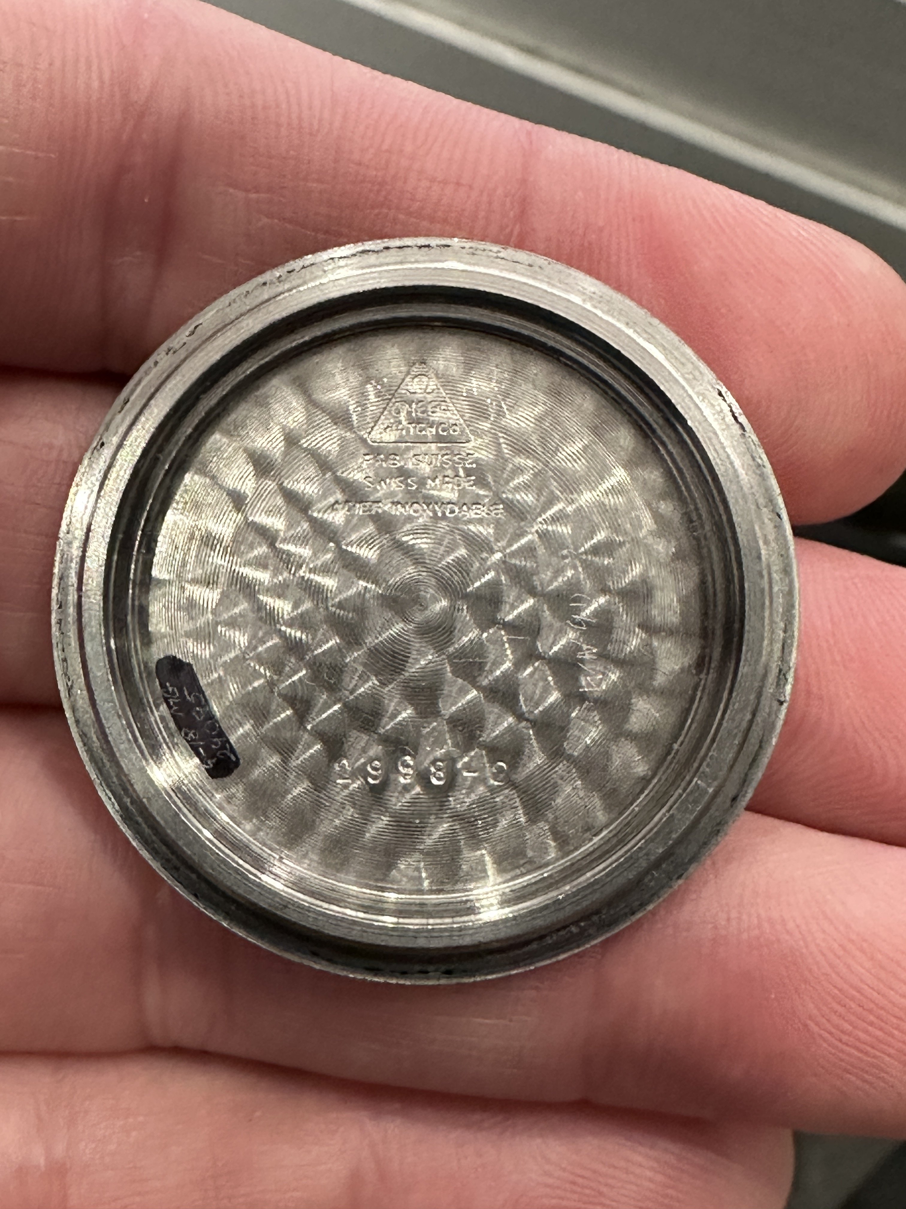 Dial/Hands: Original and correct 2998-2 dial (A4 style from MWO), with short minute counter subdial indices. It’s a very and even black, lume plots have nice patina. Original lume barely lights up in a couple very small spots under UV. I get a reading of 5 uSv/h on an inexpensive Geiger counter. White hands may have been repainted at some time over their life and show marks from removal/reassembly, but match the patina of the watch nicely.