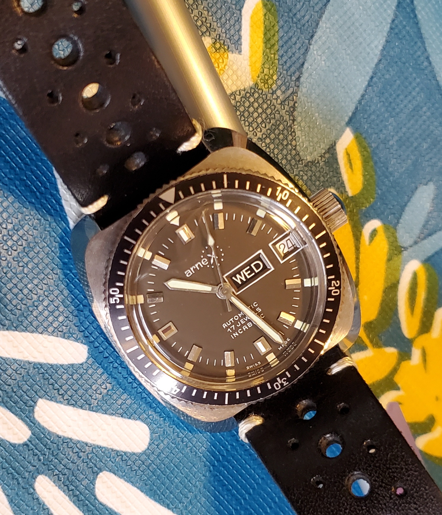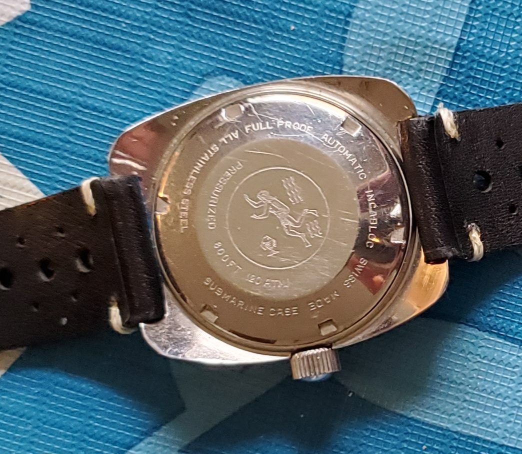 The cushion-style case is clean with sharp corners. The case is 36mm wide without the crown and 40mm lug to lug. The lug width is 19mm. The screw-down crown functions properly and the skin diver engraving on the case back is visible. The water resistance indicated on the case back is 20 atmospheres but at over 50 years of age, this watch is no longer water resistant.