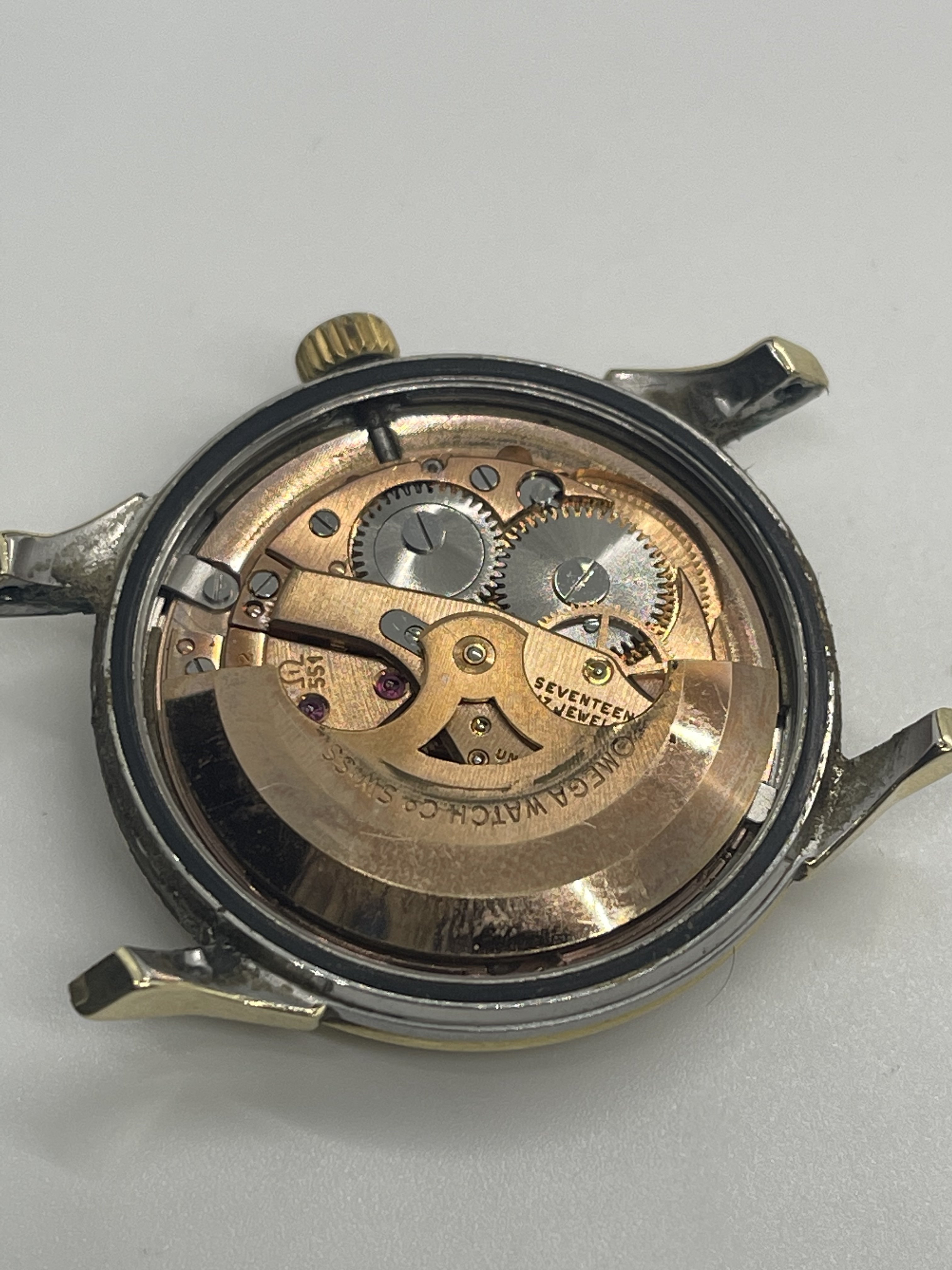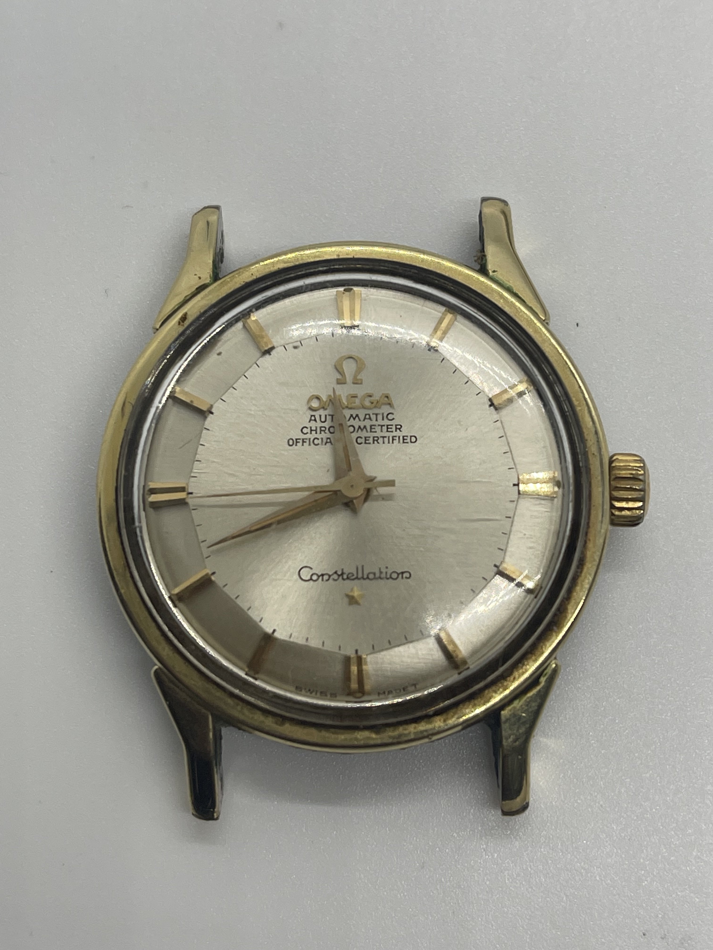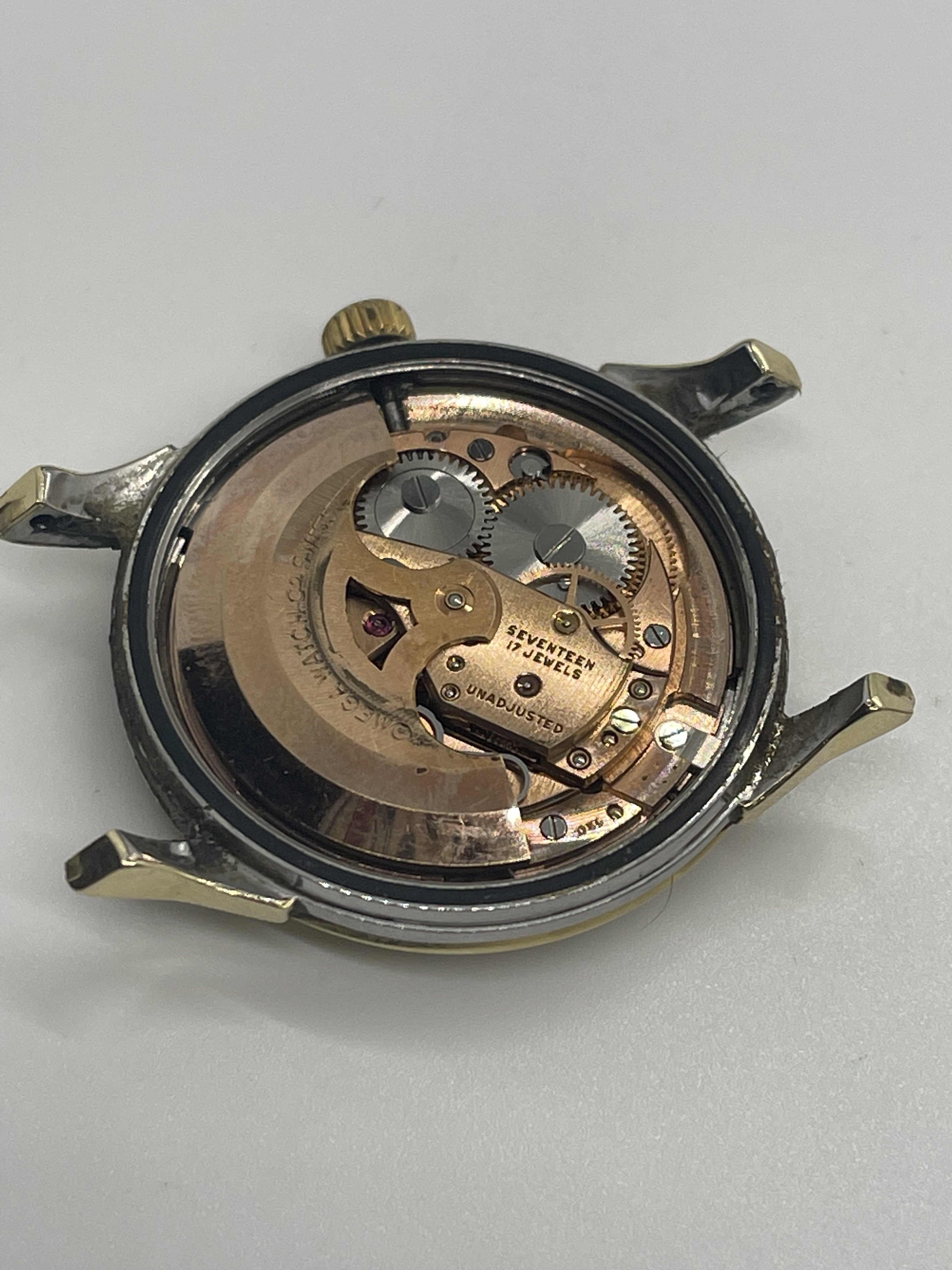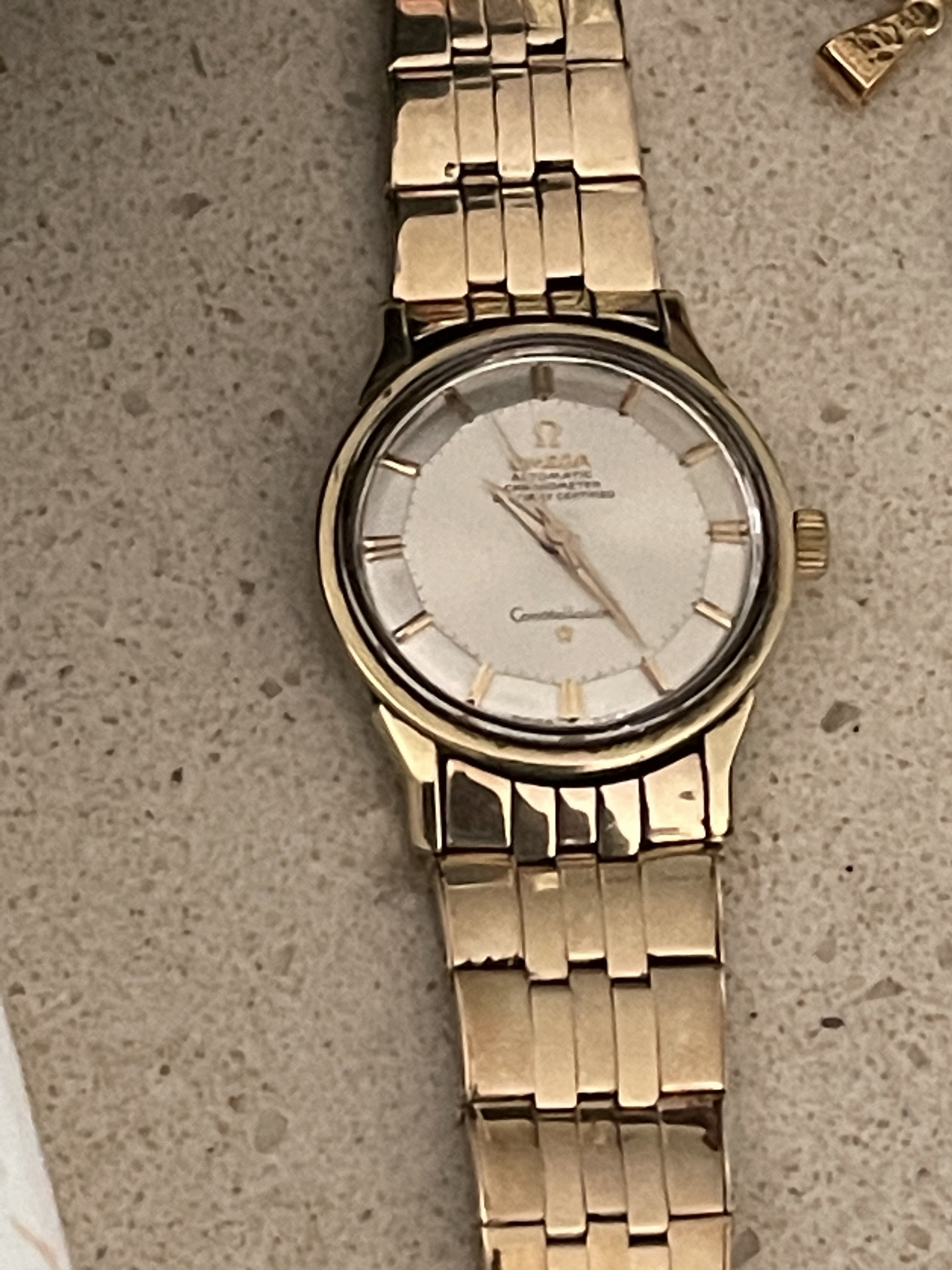 ·It has been a few years since I posted or commented. And hadn’t really had a reason or anything to post. I used to come across vintage Omegas for cheap at least once or twice a year. By cheap I mean under $100US. Pretty spoiled until the stores I frequented started examining their donated goods a bit closer. Anyway, I was checking out a store last week and imagine my surprise at seeing a Connie in a jar for $12.99! I immediately thought “take a picture for the forum!”. It needs a bit of work and since I still have some regret for selling the Pie Pan in my avatar, I am considering investing the time in getting this fixed. Several questions come to mind. The case back has a dent that is rubbing on the movement and you can see that in the pics. I suspect this must have happened in recent times or maybe happened and the owner stopped wearing the watch. Can this be fixed by a professional as well as the movement damage (if needed)? Also, this beauty came on a CDL 14K bracelet. Yes, I was simply shocked and went out to buy some lottery tickets after this! The bracelet is stretched and missing the end pin and I have no idea of the cost of having it repaired/serviced and I’m not even sure at this point if I would keep the bracket on this watch anyway. Gray & Sons in Florida offers gold bracelet repair but I have not contacted them yet and based on the damage that was done to a previous barn find (67 Speedmaster that I regrettably sold), I would rather have any work done by folks suggested by this forum. Any suggestions would be appreciated. Oh…and before I took these picks, I dropped the watch (minus) the bracelet on the cement floor of my basement! While small, there is damage to the top right lug of watch that reminds me I can be an idiot sometimes. Anyway, any info about this model or suggestions would be greatly appreciated!