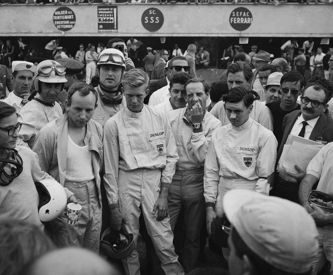 Besides Jim Clark, also Innes Ireland and Stirling Moss are allready known for their link to the company with the Saturn. While I havn't found anything new to Moss (seems like he was just wearing the Enicar at the day he got it and prefered his oversize, black dial monopusher for the rest of its career) it is different with Ireland. He was using the chronograph on several occasion from 1962 to 1965. Like at the following pic, taken at Monza in 1962:
