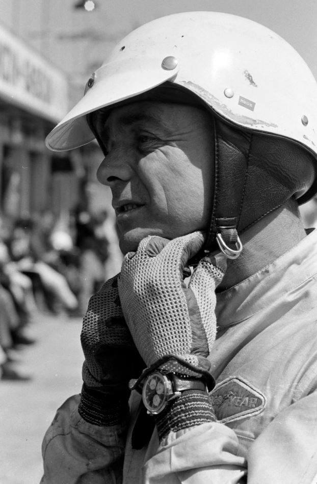 Number four wasn't really connected to Enicar until these days. I am speaking about US-American driver Phil Hill, who was e.g. driving for Ferrari or Ford on long distance races like the GT40. At the following image we can clearly see what kind of Sherpa Graph he is wearing. Like Clark he decided for a MK1b reference, this time with the black-white reverse Panda dial.