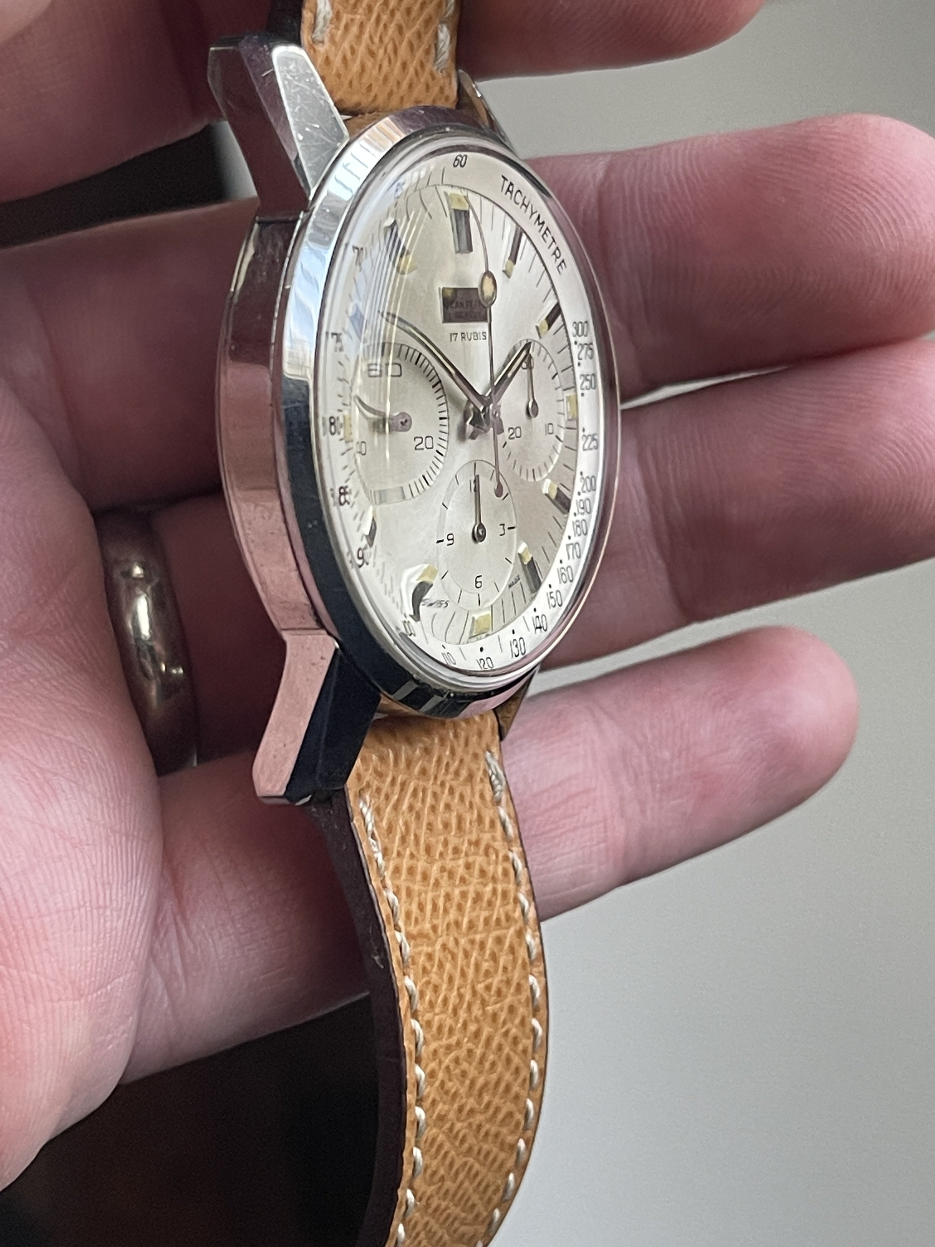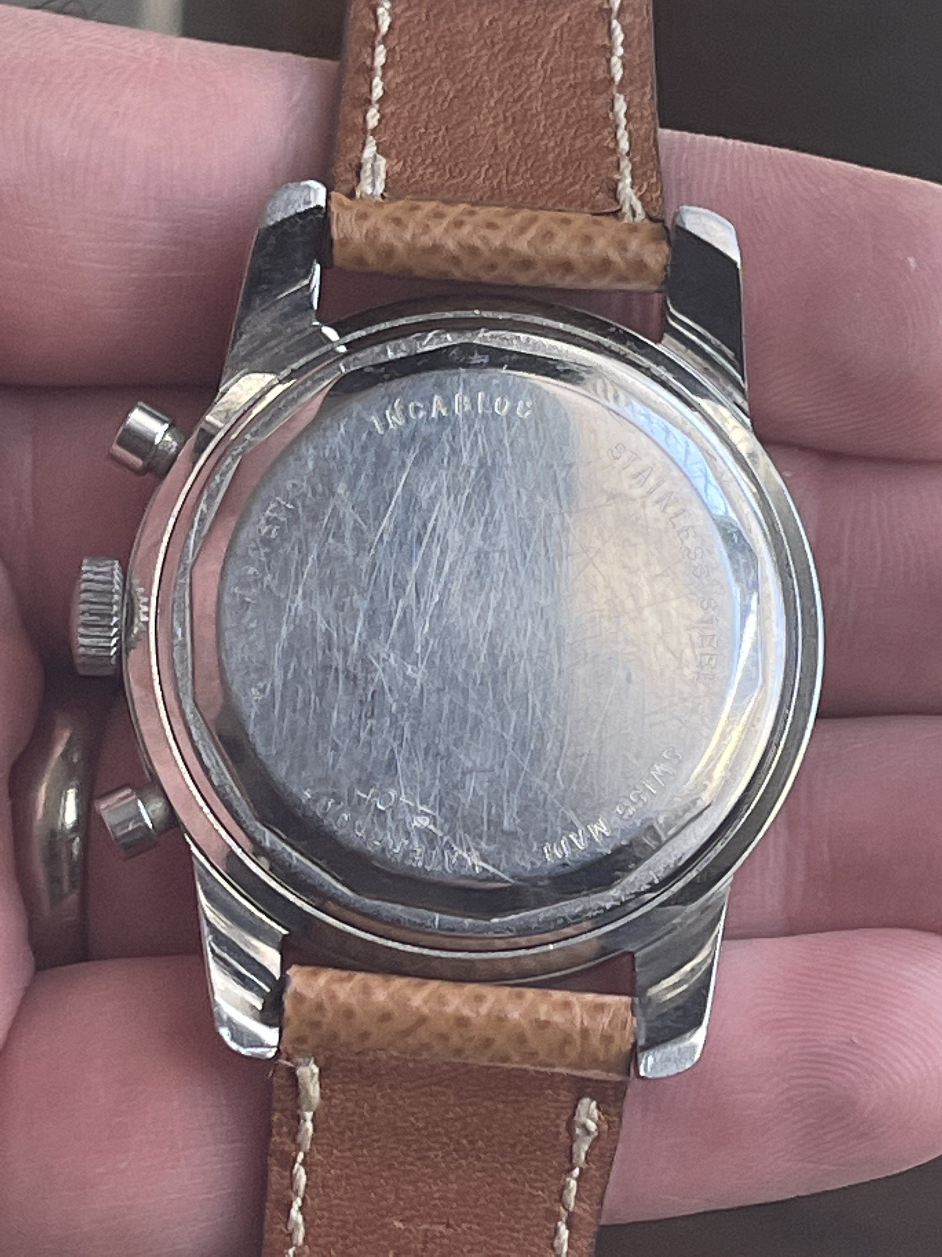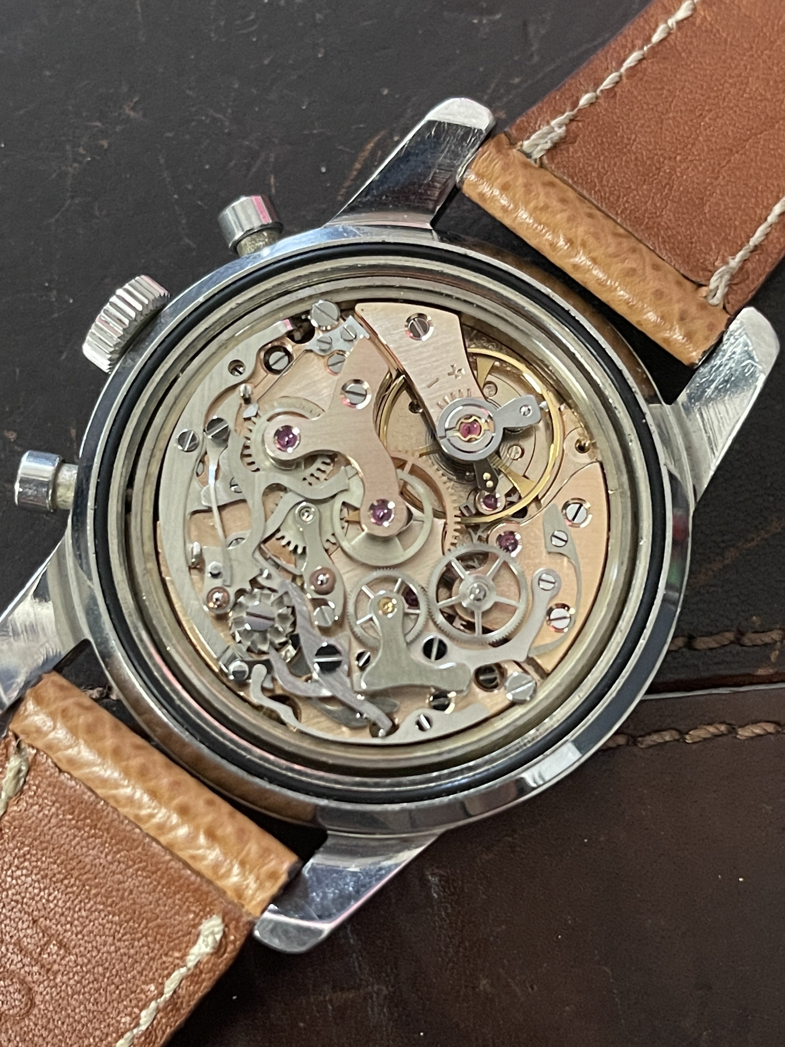 Movement - Movement is really clean. The dealer selling it to me listed it was a Valjoux 726, but when I look at the movement with a loupe I can only see a “V72.” I know the 726 was an improved version of the 72, but am not certain how to tell which it is. It was serviced for the prior owner by Sean Yates at abouttimerepair in the UK in late 2020/early 2021. The warranty has lapsed.