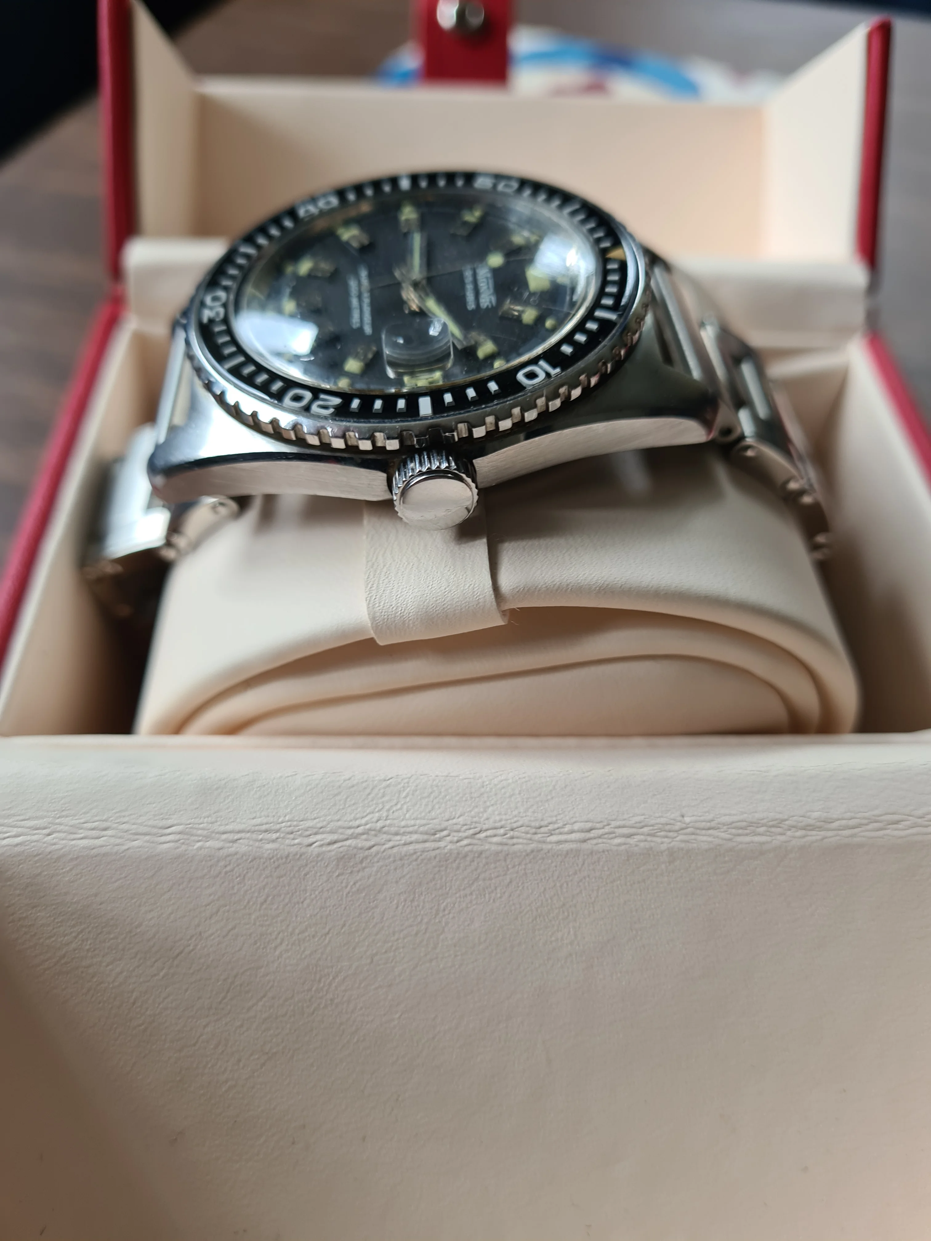 This is, to my knowledge, one of only two Super-Plongeurs available on the market, and one of only a few Sous Marines. The majority have been snaffled up already, and finding a black-dialed one in condition like this is increasingly difficult (there's an Evilard SP on Ebay, asking 1300 Euros).