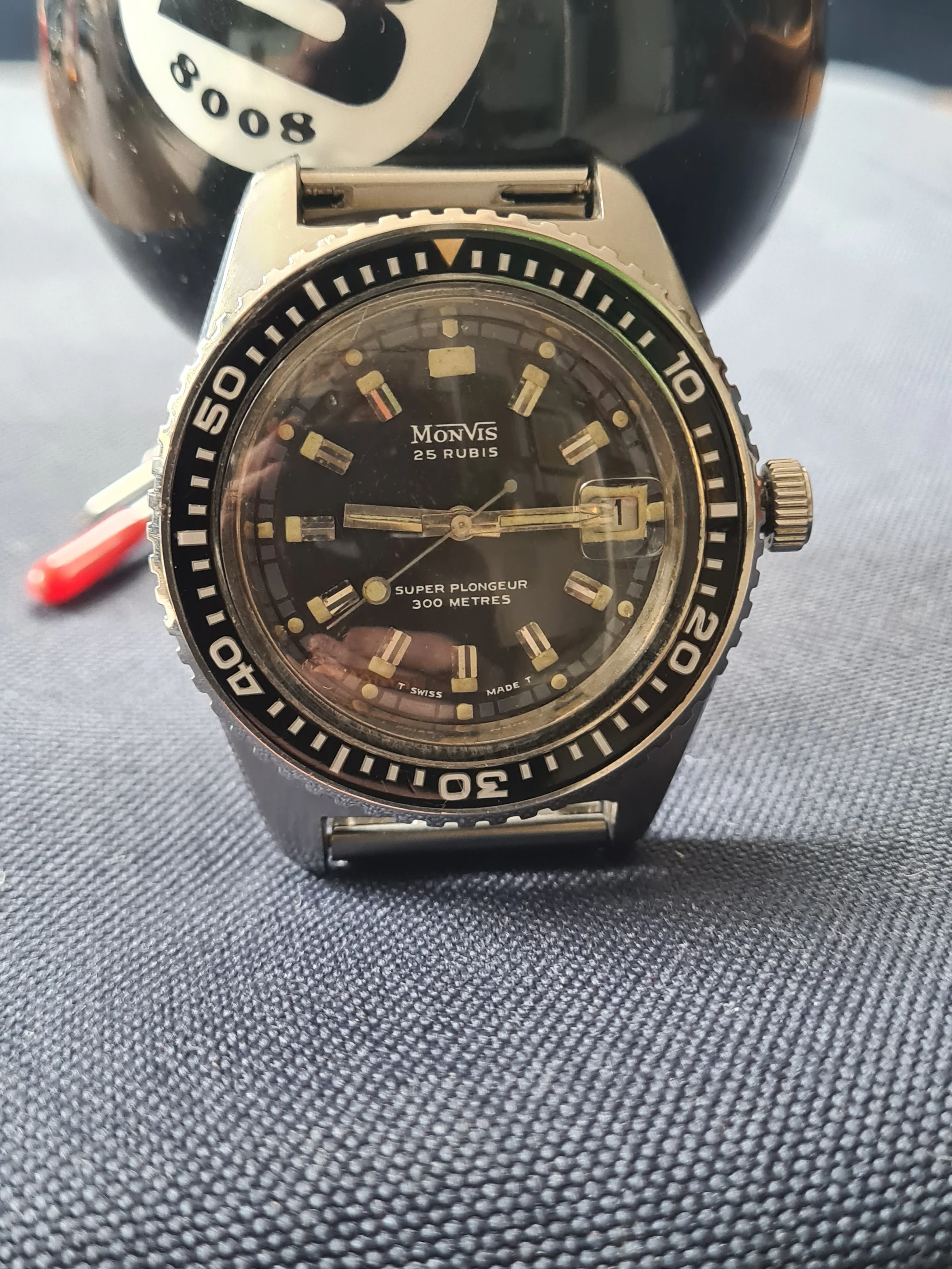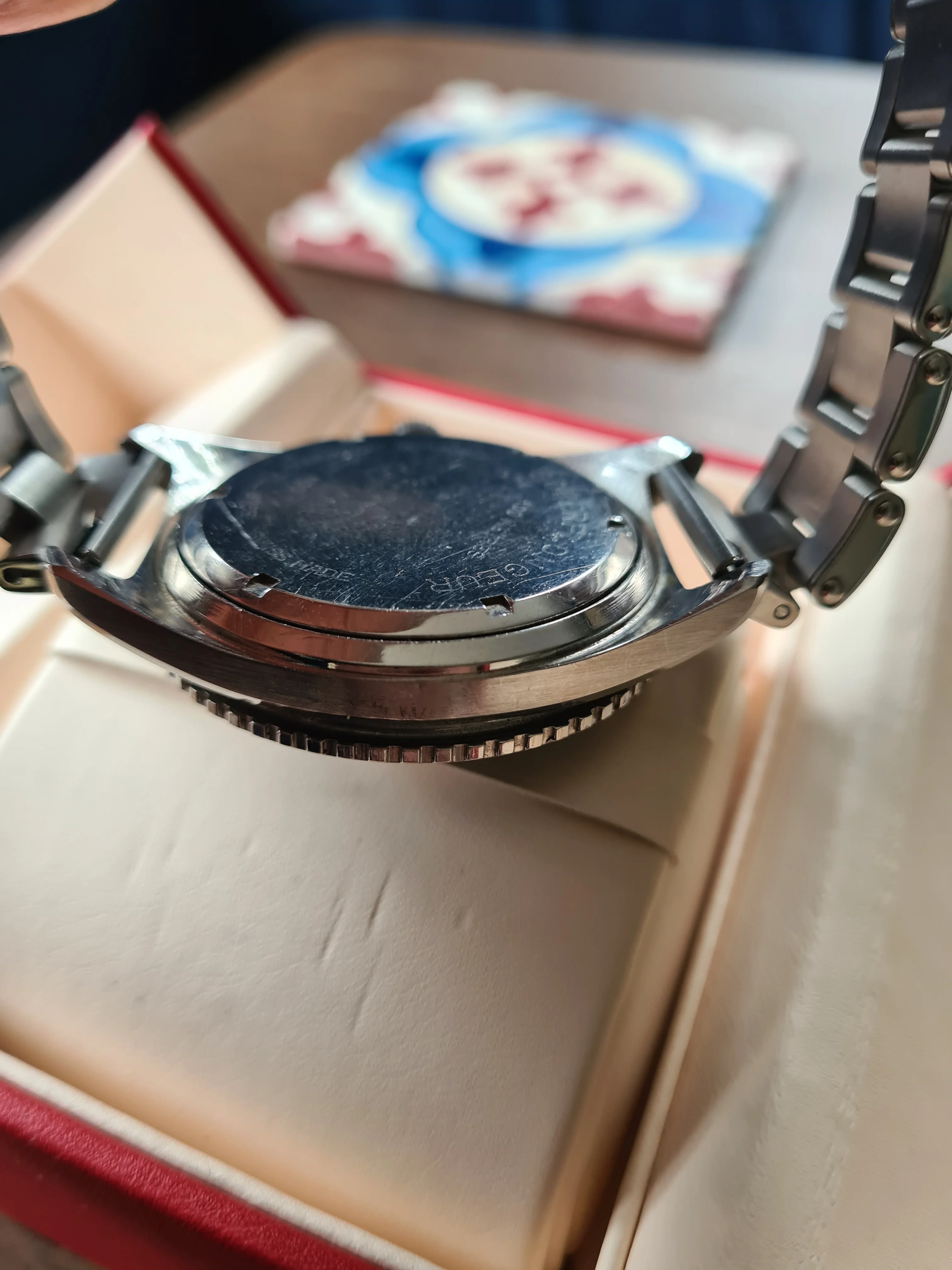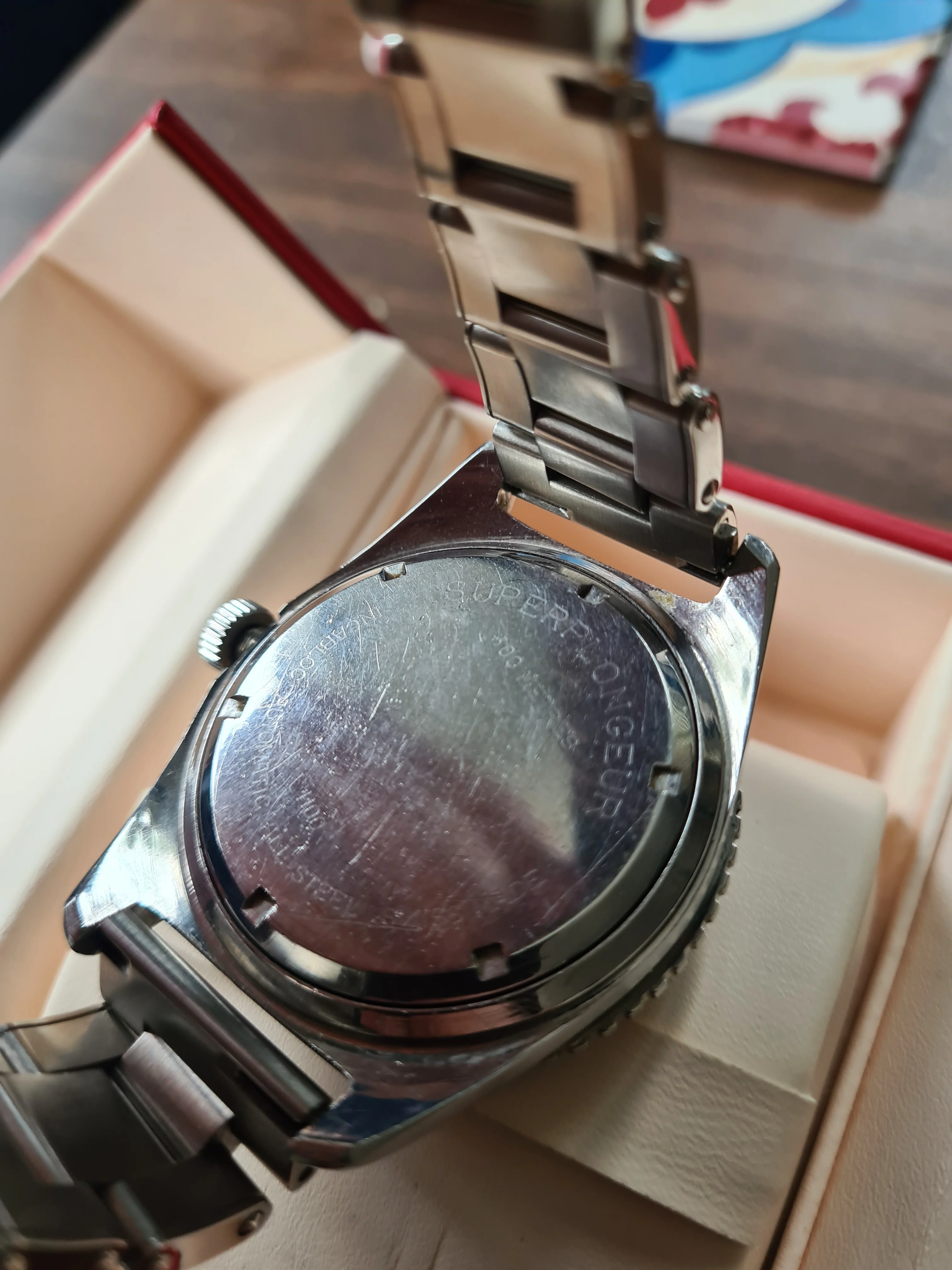 ·On offer from my person collection is a proper mid-1960s tool watch in excellent condition. The Super-Plongeur is the hard to obtain, high-end version of the Sous Marine made famous by Yema in the 1960s. The SPs were produced by various makers, and all share the same dial and furniture, along with the all-steel Sous Marine case and the 300m depth rating. Case is super-sharp, with no polishing, and only a bit of honest wear on the caseback, where the lettering is easily readable. Inside is a workhorse A. Schild 1712 automatic movement, keeping good time.