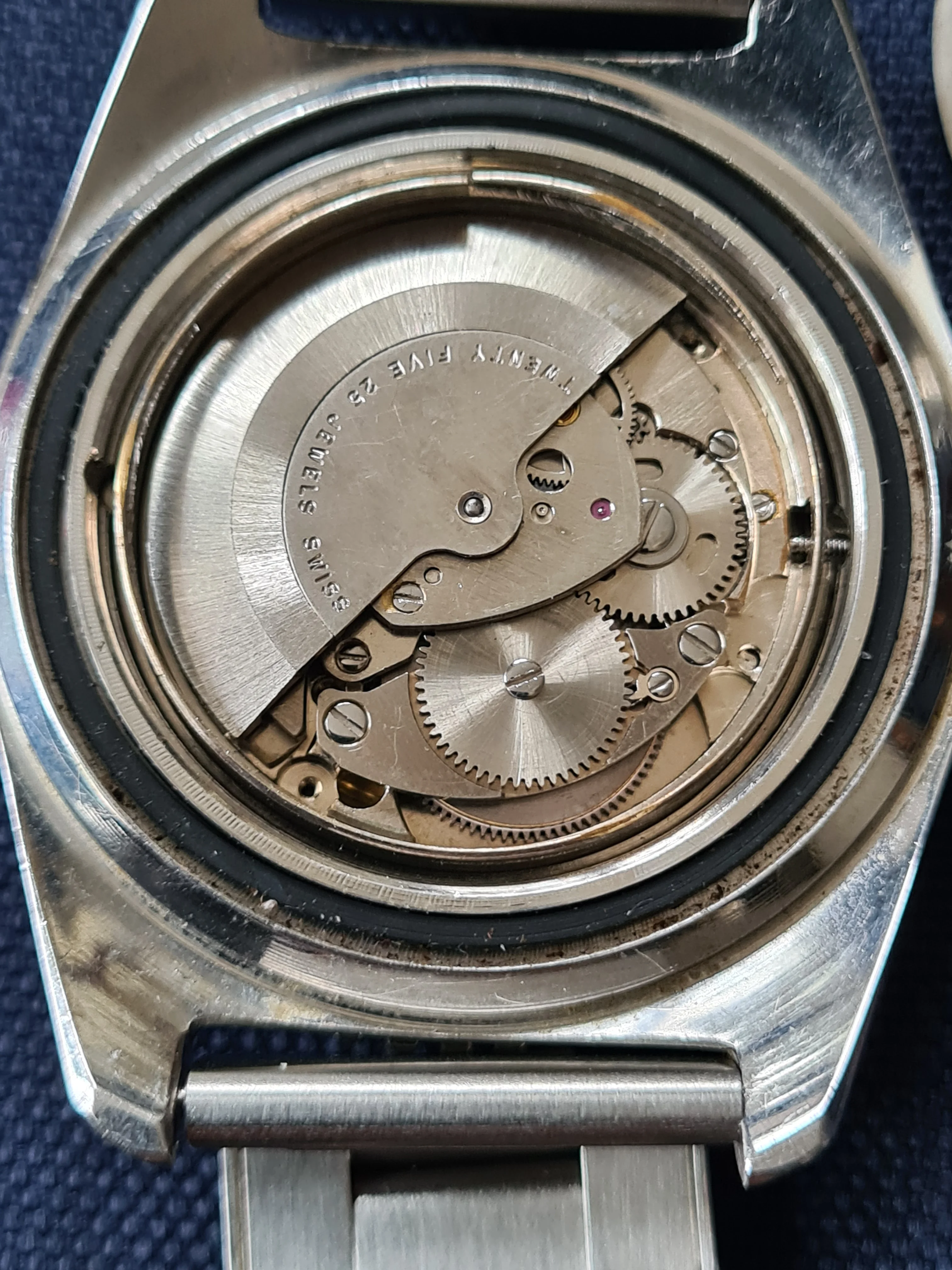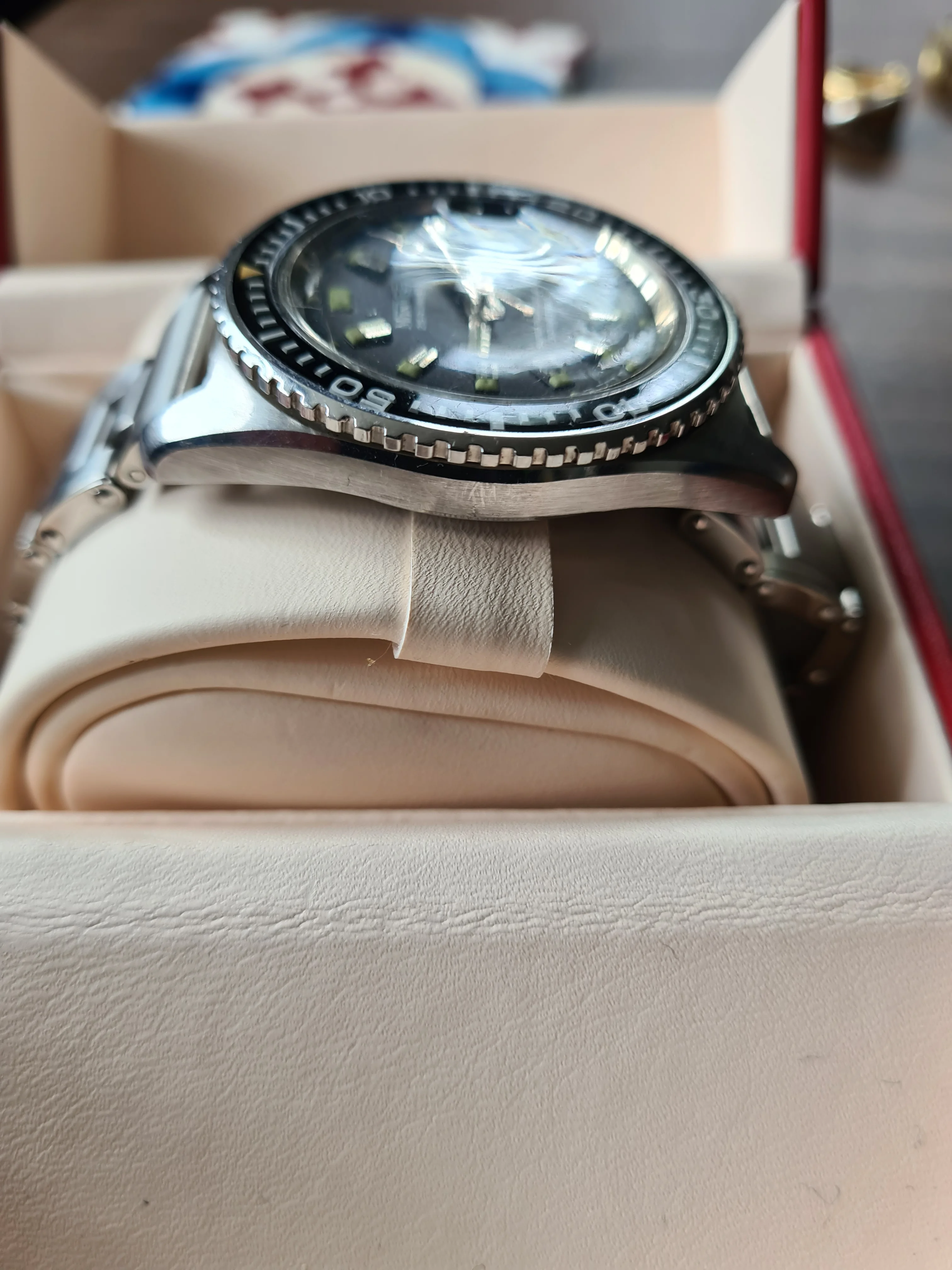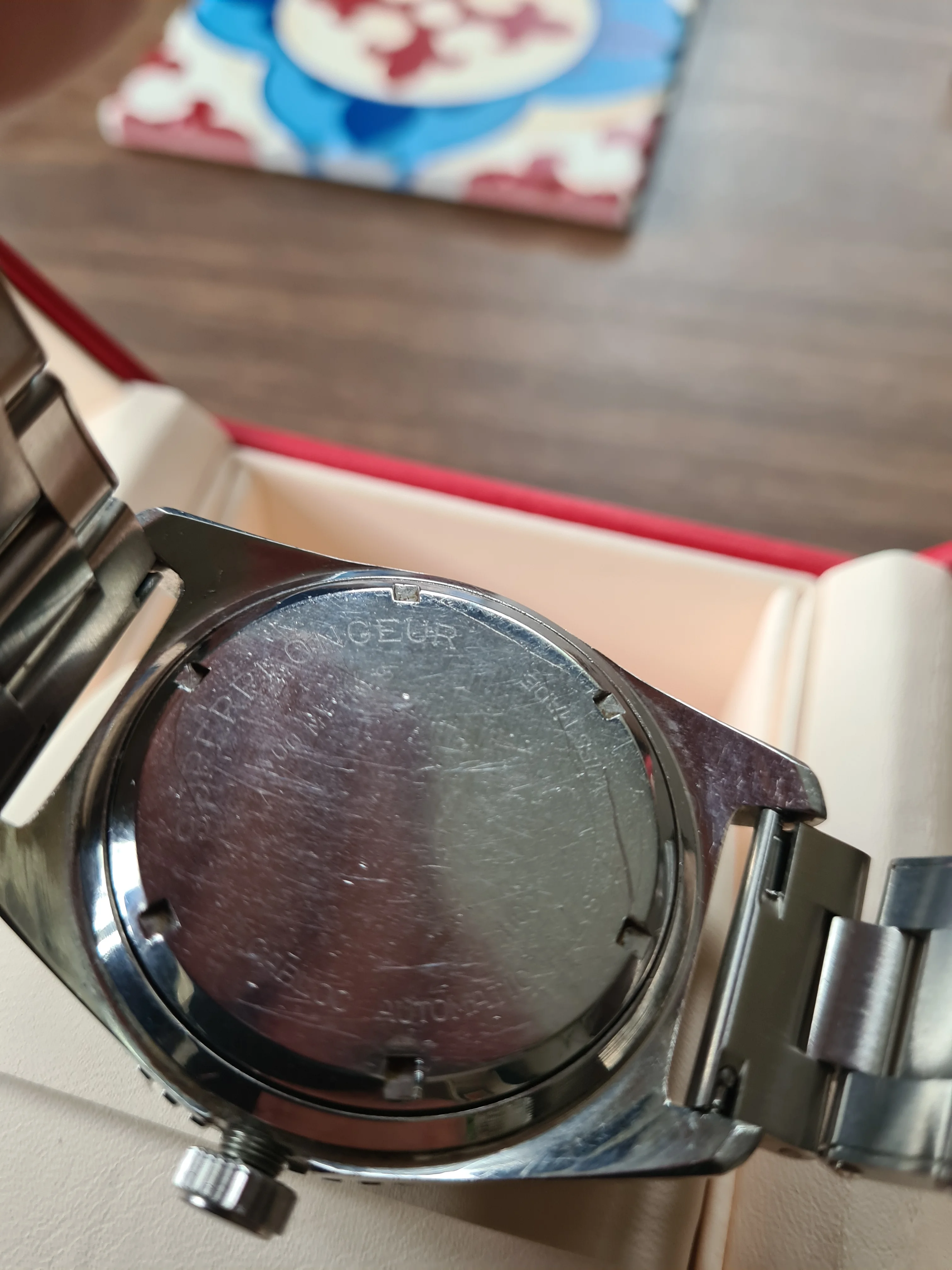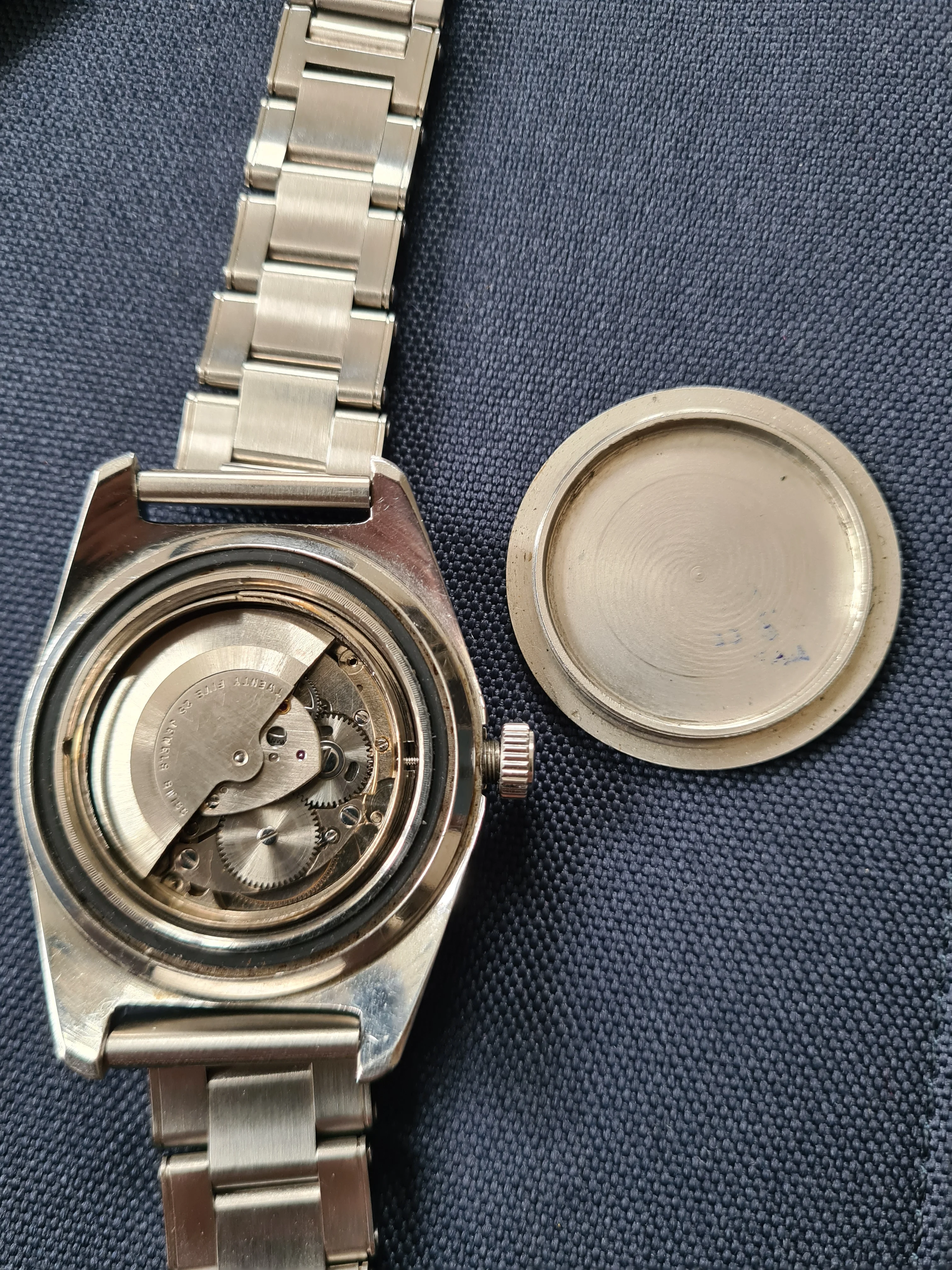 ·On offer from my person collection is a proper mid-1960s tool watch in excellent condition. The Super-Plongeur is the hard to obtain, high-end version of the Sous Marine made famous by Yema in the 1960s. The SPs were produced by various makers, and all share the same dial and furniture, along with the all-steel Sous Marine case and the 300m depth rating. Case is super-sharp, with no polishing, and only a bit of honest wear on the caseback, where the lettering is easily readable. Inside is a workhorse A. Schild 1712 automatic movement, keeping good time.