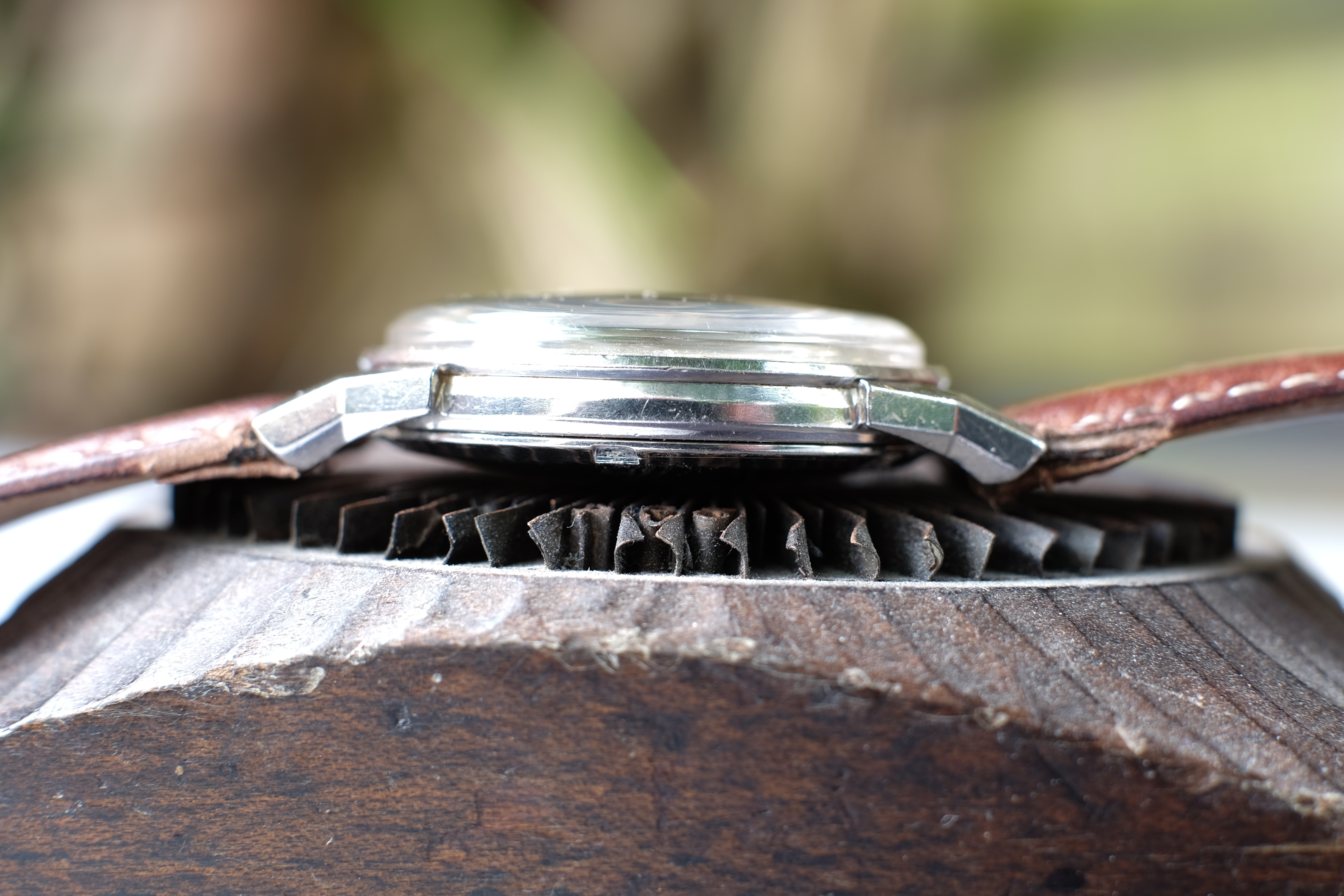It has a sharp, SS case which appears to have never been polished and also has the signed crown. Although generally not a fan of caseback engraving, I do like this particular, evocative message which often leaves me pondering on the watch鈥檚 past. Dial is also in really nice condition and the indices are onyx inlay.