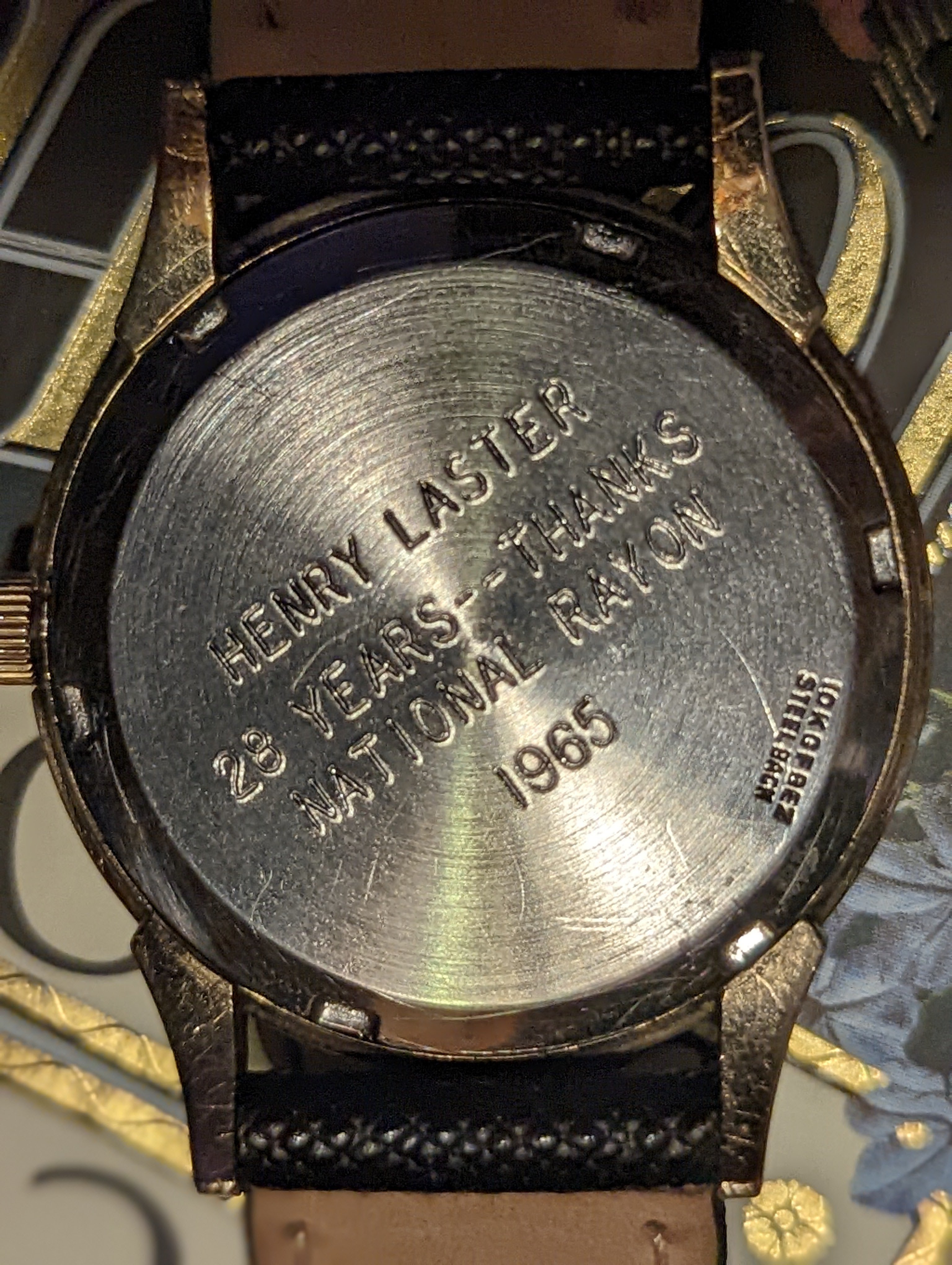 Special Details: Caseback inscription reads “HENRY LASTER 28 YEARS - THANKS NATIONAL RAYON 1965”