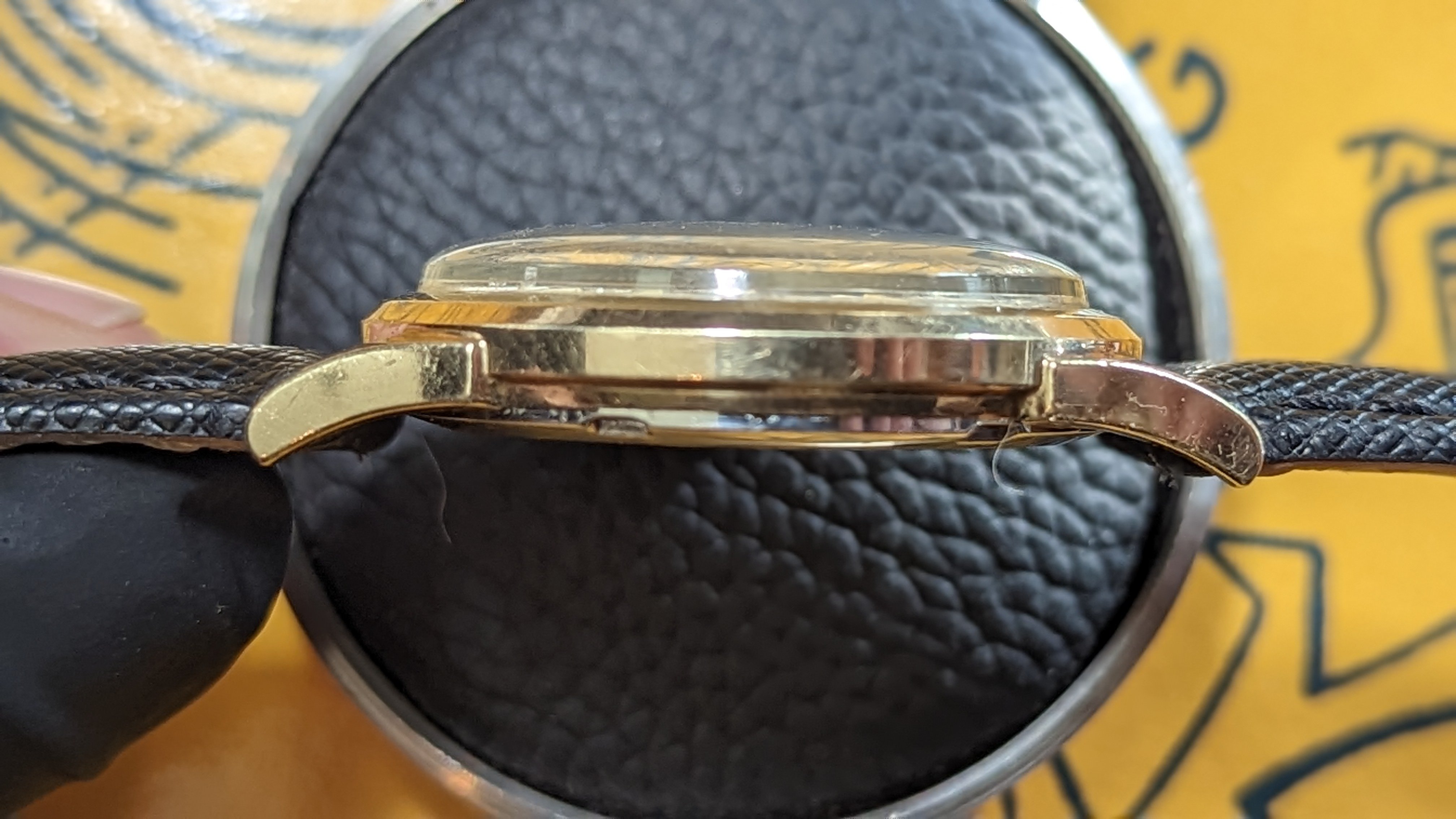 Case: 10K Gold filled case and bezel with stainless steel back. Unpolished in my hands but not sure prior to my ownership. Examine the photos of each lug carefully. No damage beyond typical scratches of a watch that was worn proudly. Caseback stamped