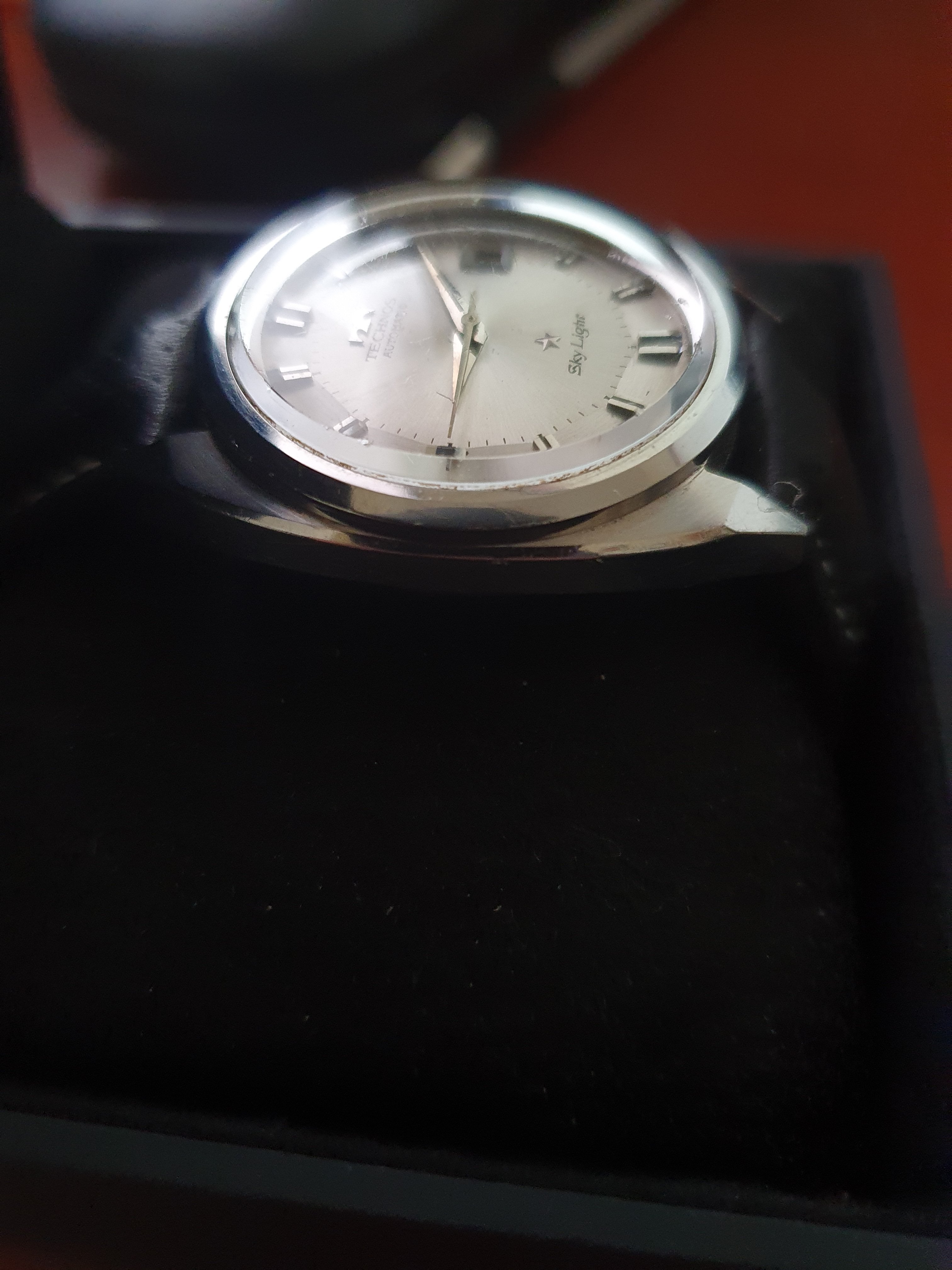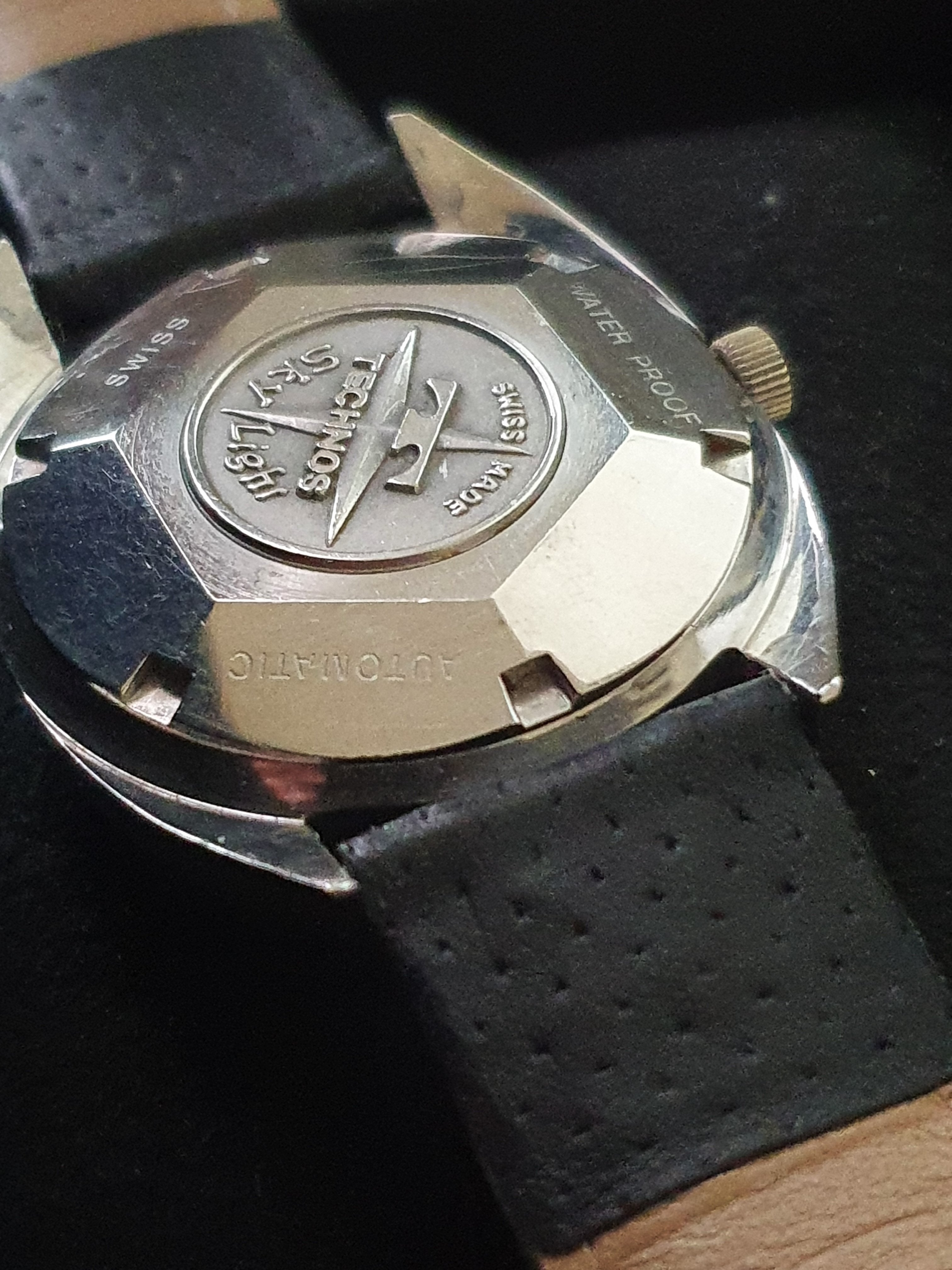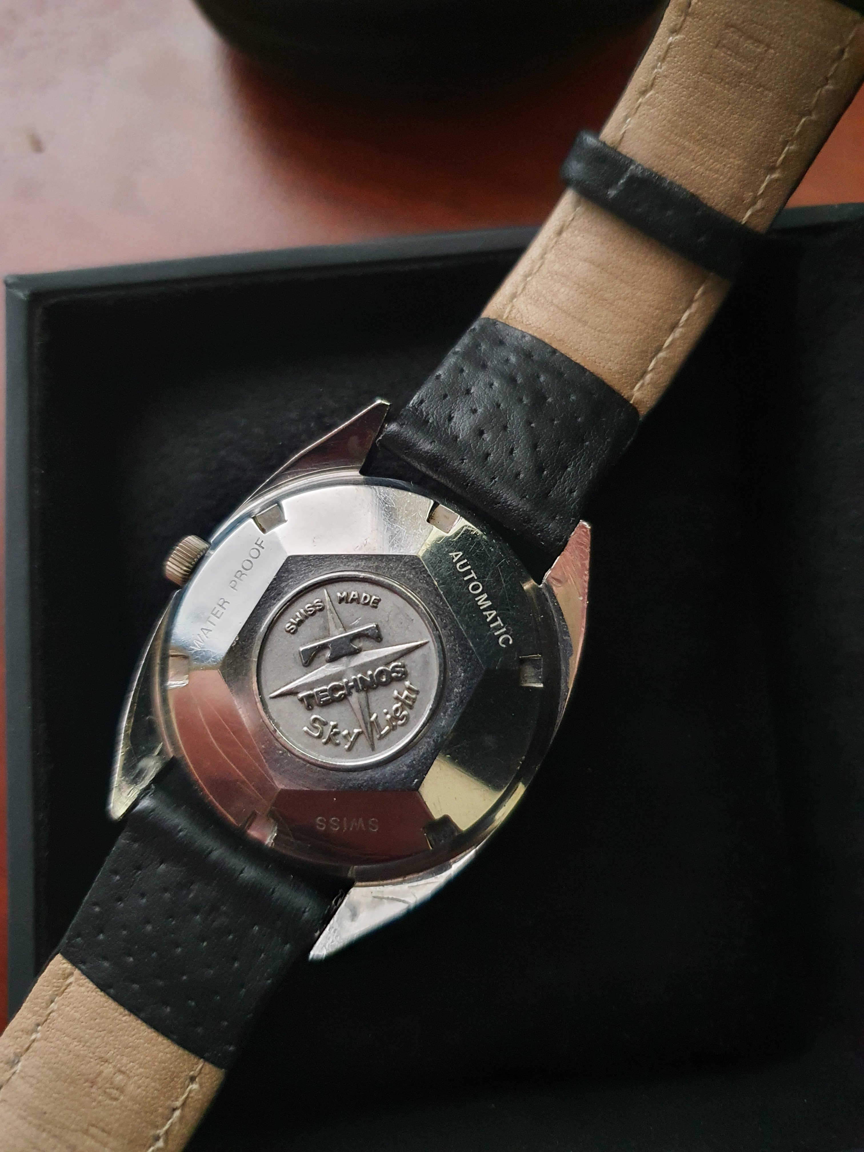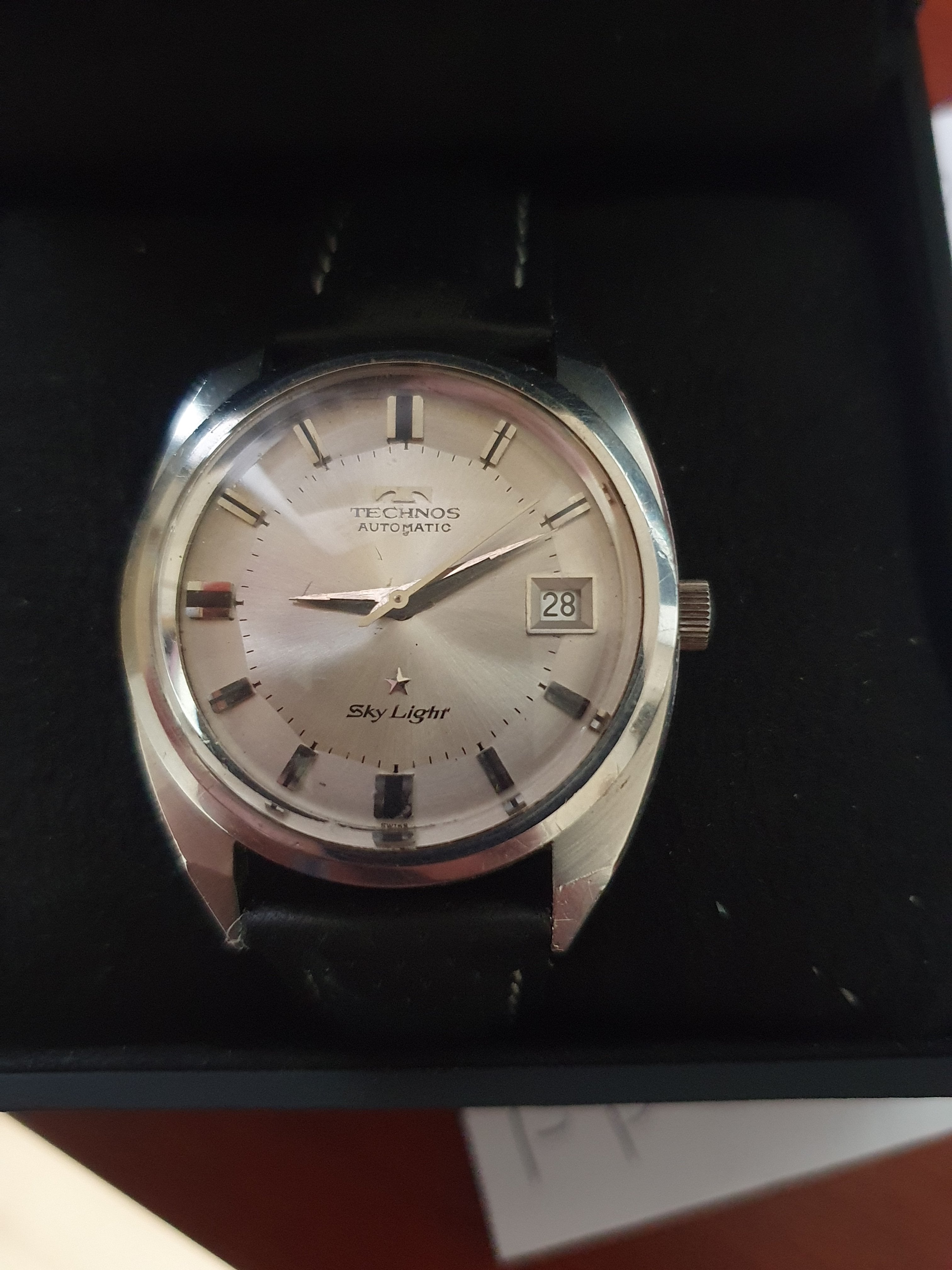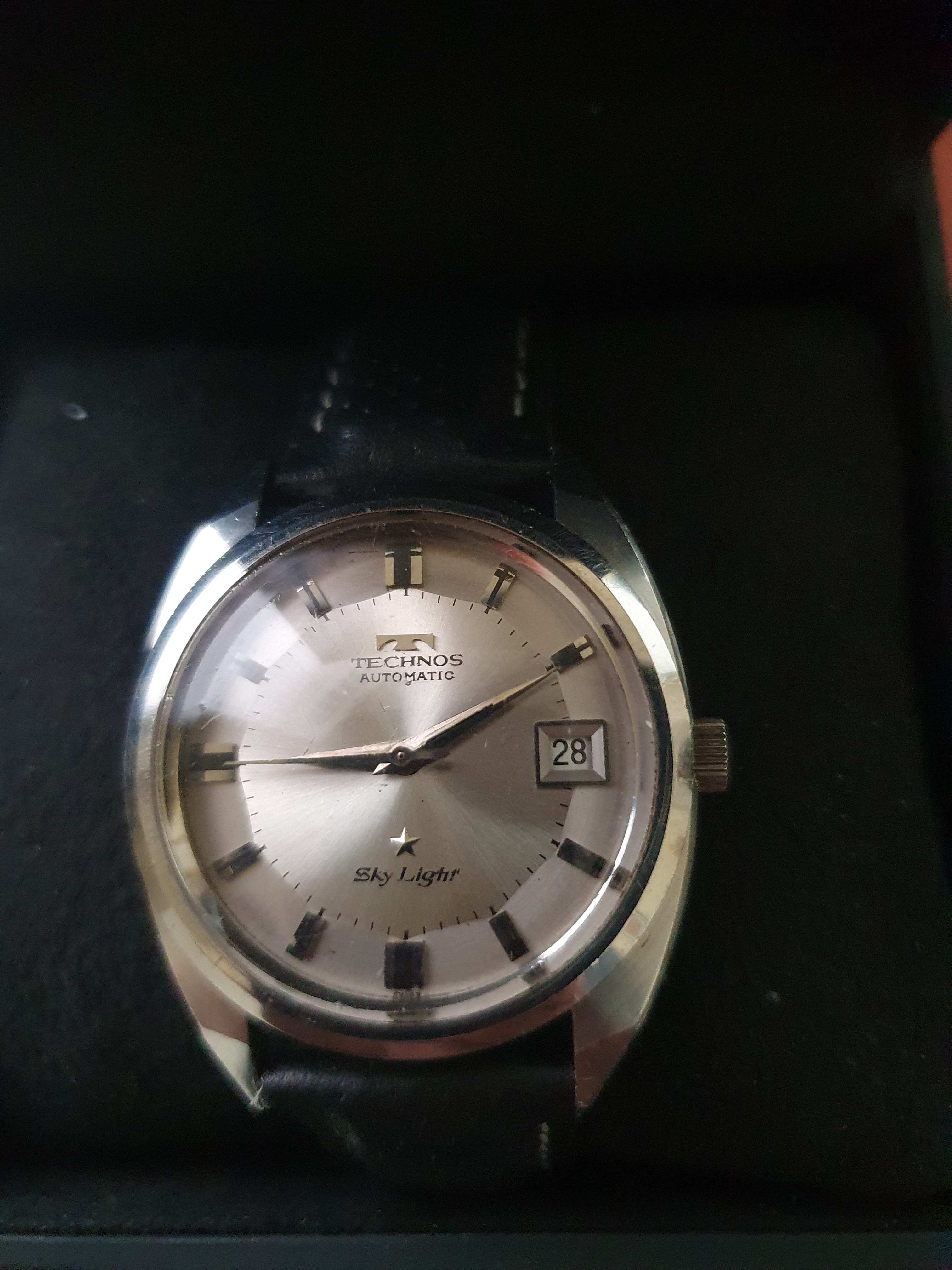 ·Up for sale is a very nice Technos Sky Light automatic watch. The silver pie-pan dial is in great condition. The SS case is unpolished and in great shape. Steel furniture contrasts with onyx inserts, a layout replicated in the batons. The original mineral-glass crystal and the deeply engraved medallion complement this elegant piece.
