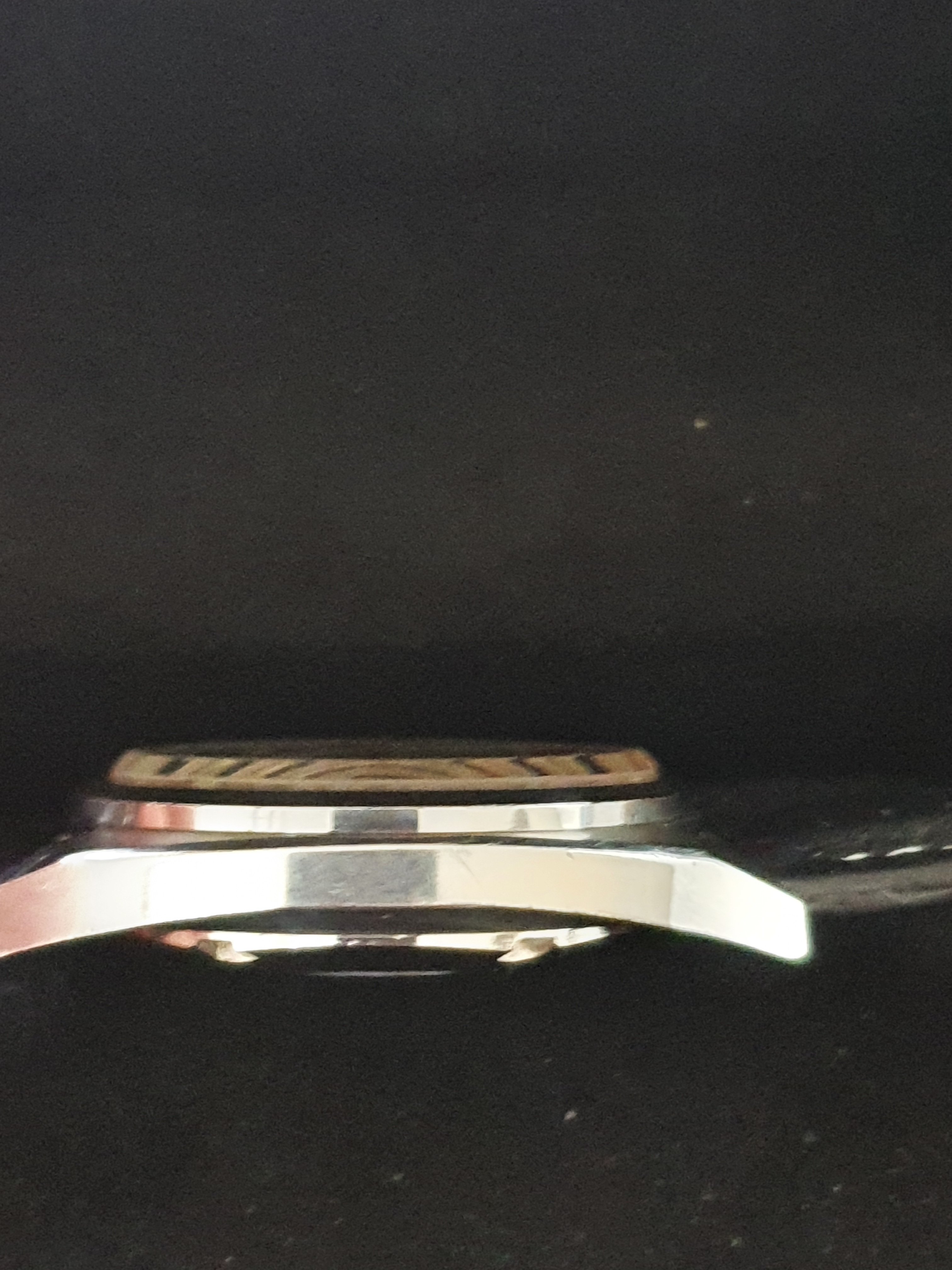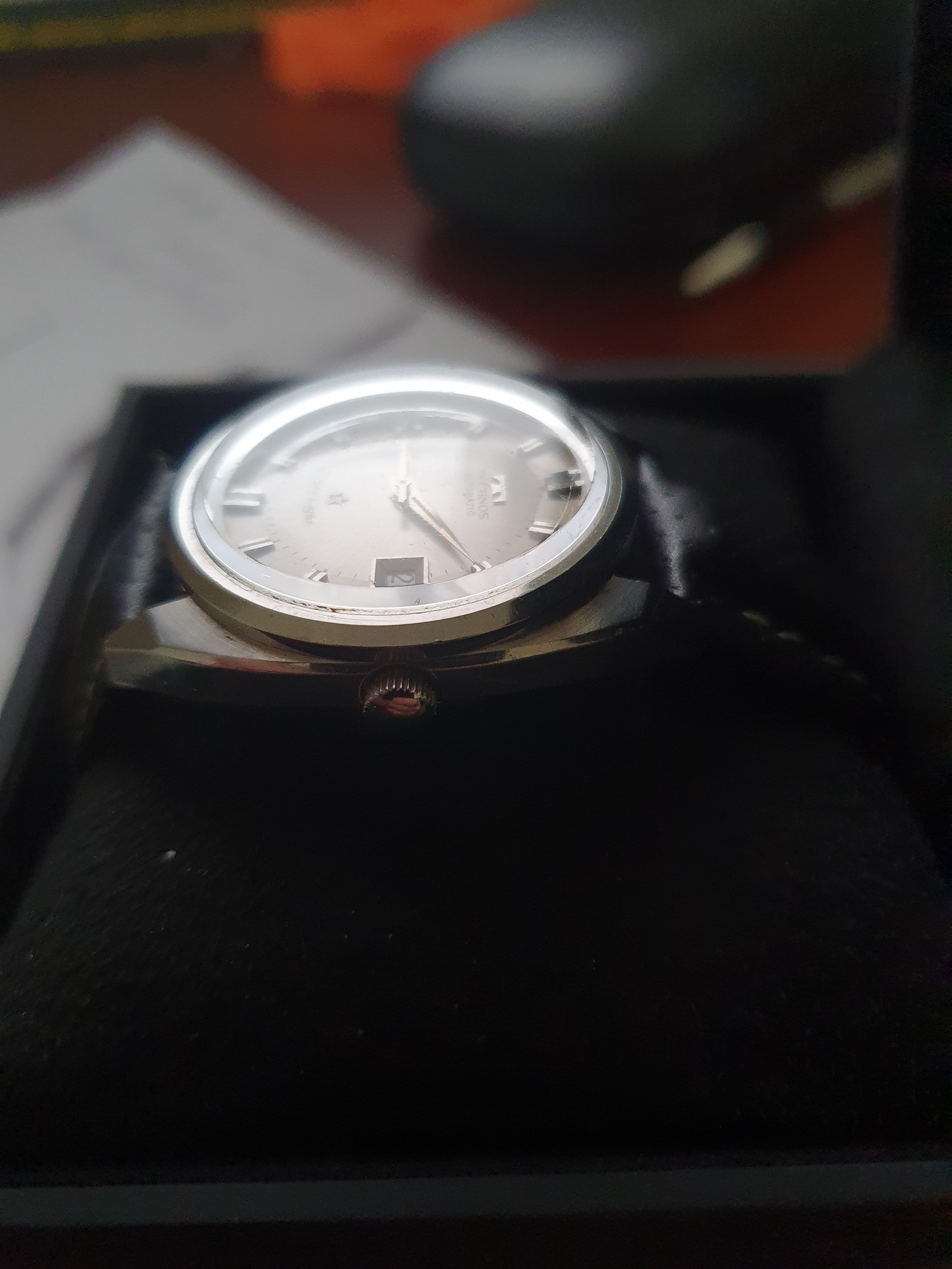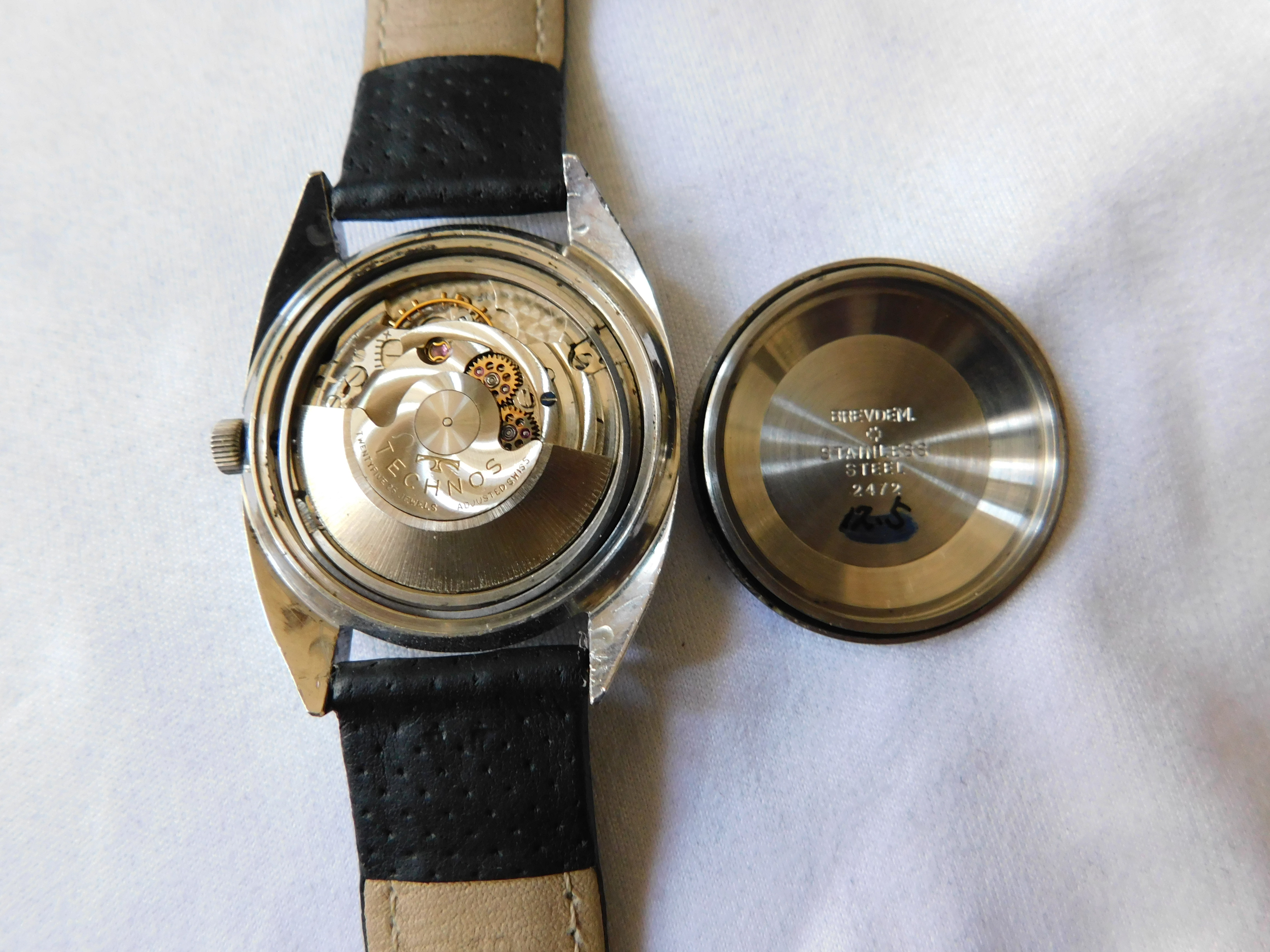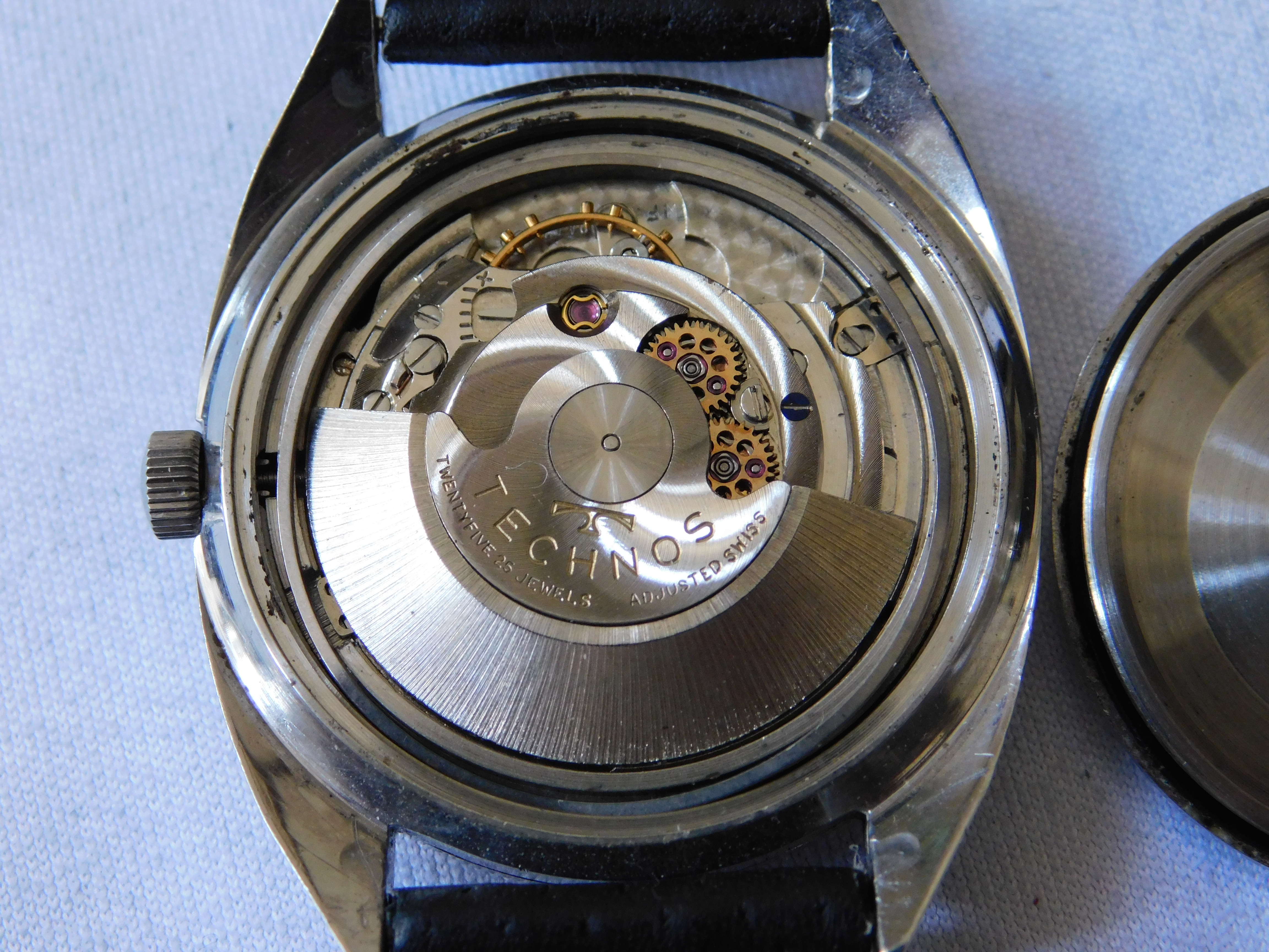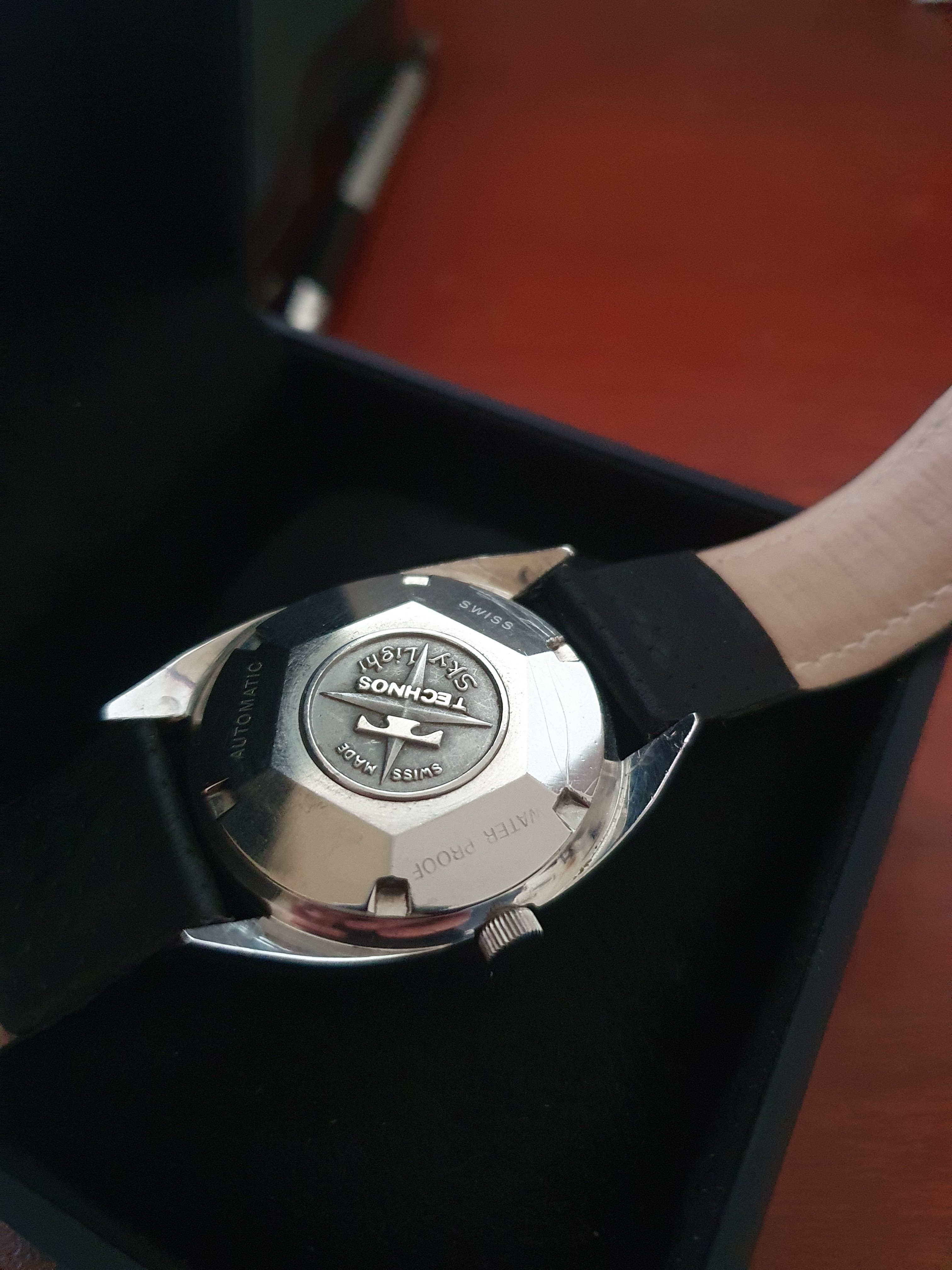 ·Up for sale is a very nice Technos Sky Light automatic watch. The silver pie-pan dial is in great condition. The SS case is unpolished and in great shape. Steel furniture contrasts with onyx inserts, a layout replicated in the batons. The original mineral-glass crystal and the deeply engraved medallion complement this elegant piece.