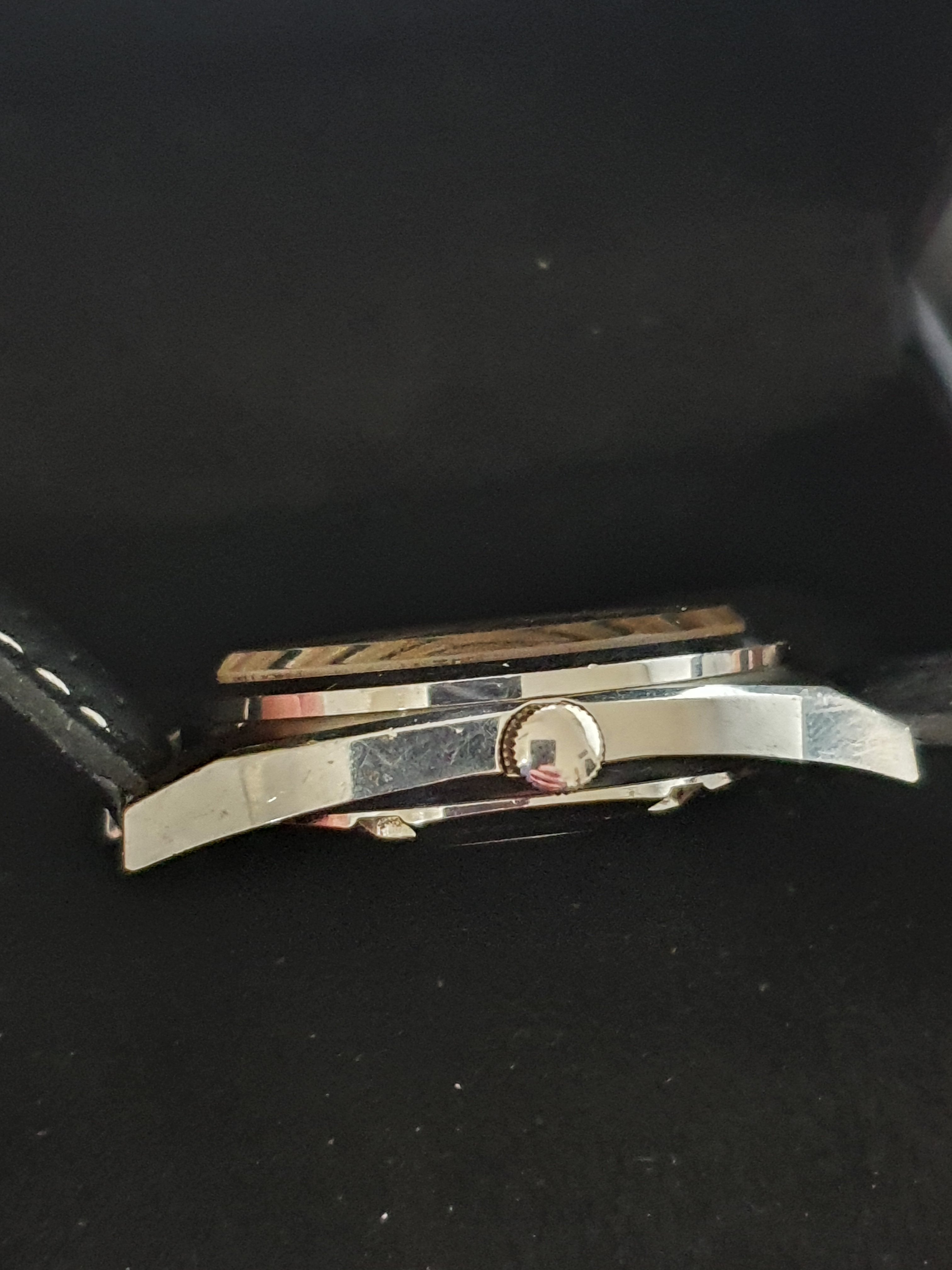 It measures 35mm wide without crown and 42.5mm lug to lug, lug width is 19mm. This one is powered by an ETA 2522. The service history unknown but the movement looks clean, and it's running strong & keeping decent time. Sports a replacement crown now, but a signed one is fairly easy to source (and cheap!).