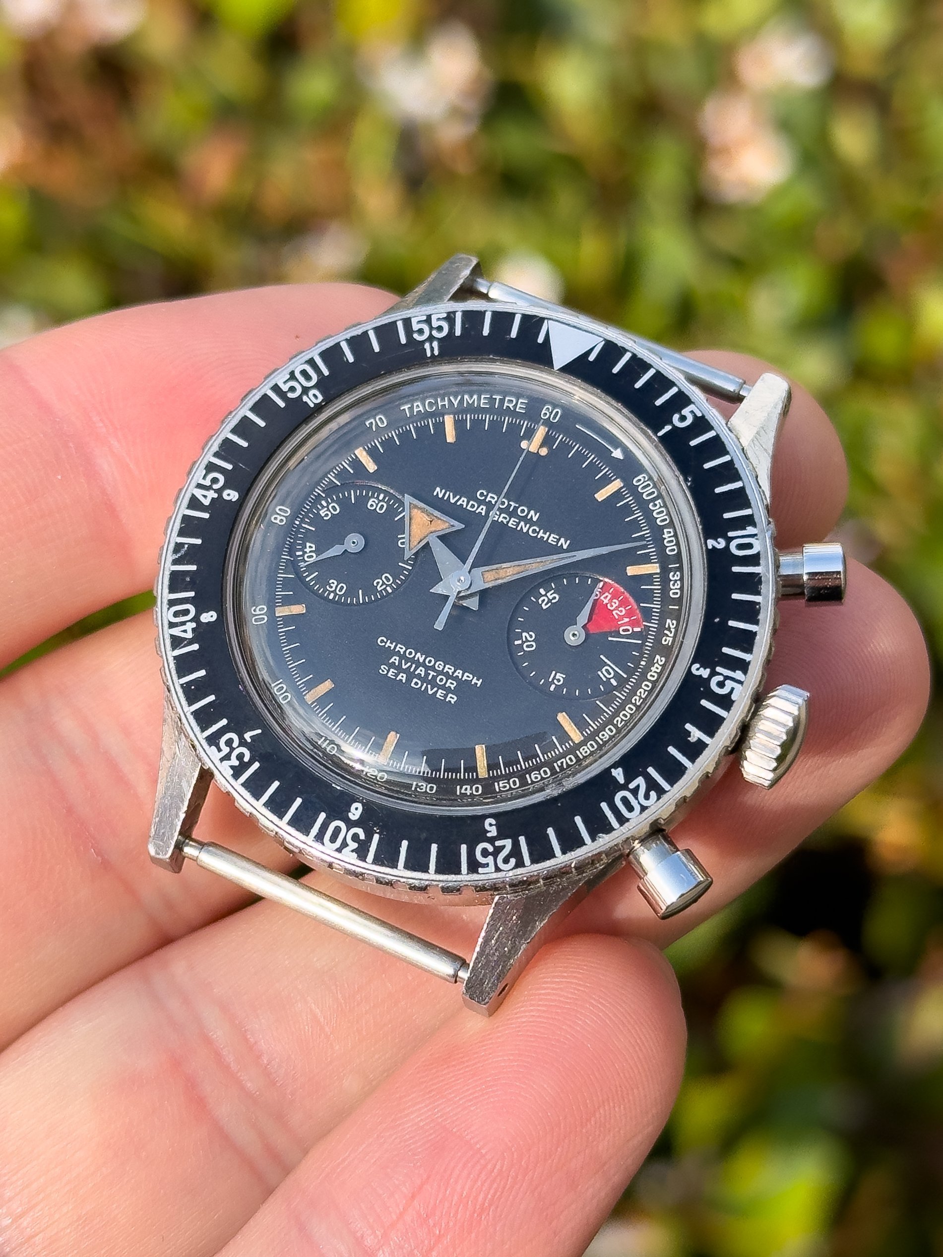 . Oof bad joke… 😁 Well, as the joke alludes to, this is the first generation CASD known as “Chronograph” before it was later renamed to “Chronomaster.” I will see myself out.Overall, for being 63 years young, this piece is in great condition. As I haven’t been with it since new, I can’t say it is unpolished, but I can say it retains its sharp case lines. However, it does of course show wear commensurate with age. The 38mm case accepts 20mm straps and is a very comfortable size to wear. The bezel rotates in both directions as it should. The matte black dial is in excellent condition, and like the hands, retains the original radium lume. The start/stop & reset pusher engage nicely, operate as they should, and the hands reset precisely. The crown winds smoothly. If you have any questions, please don’t hesitate to reach out. I have run out of straps to give away, so this is being offered as head only.