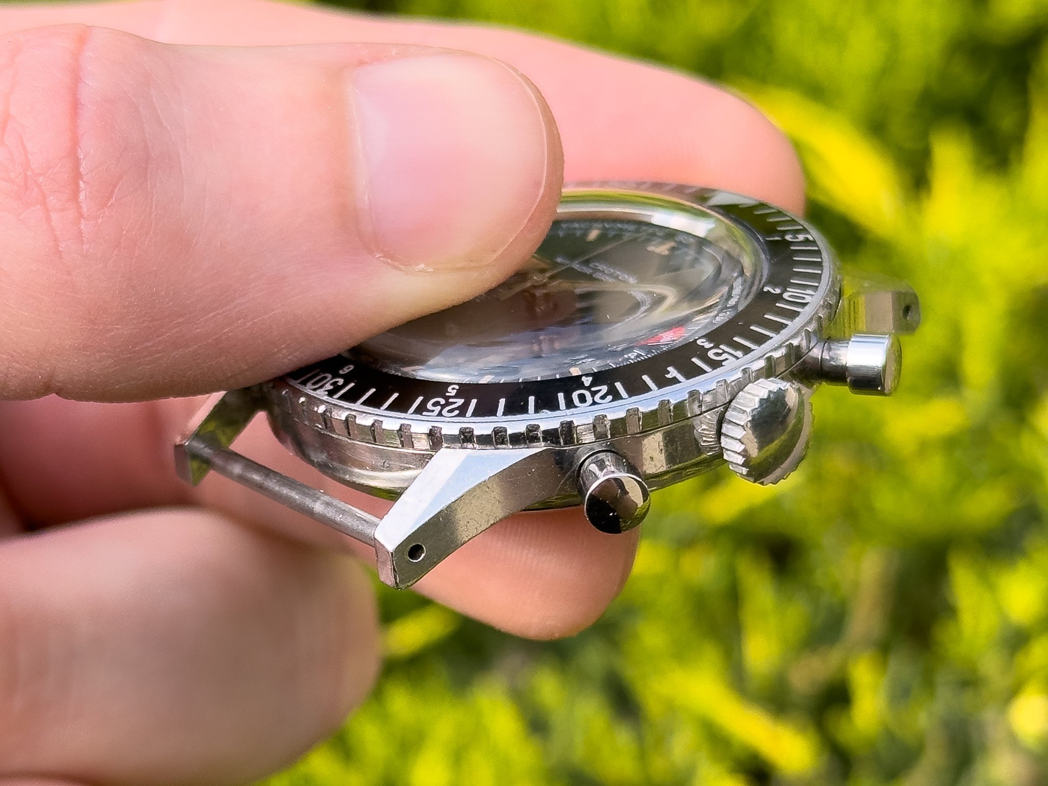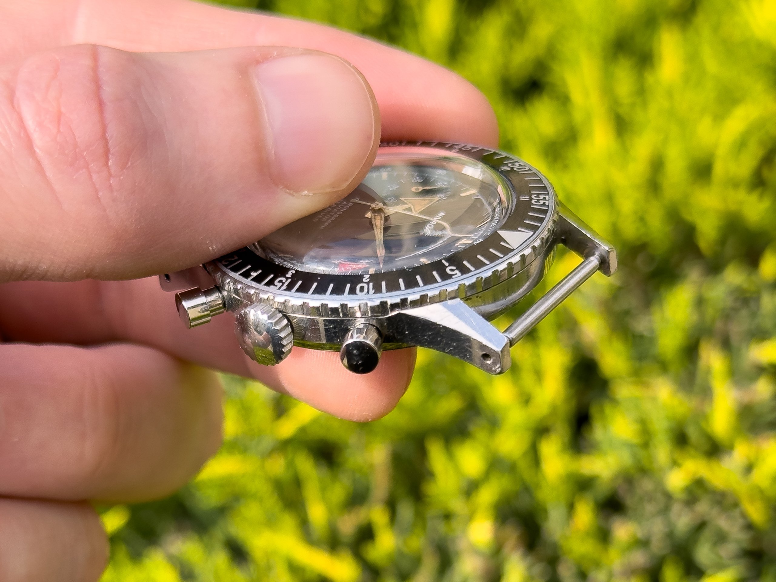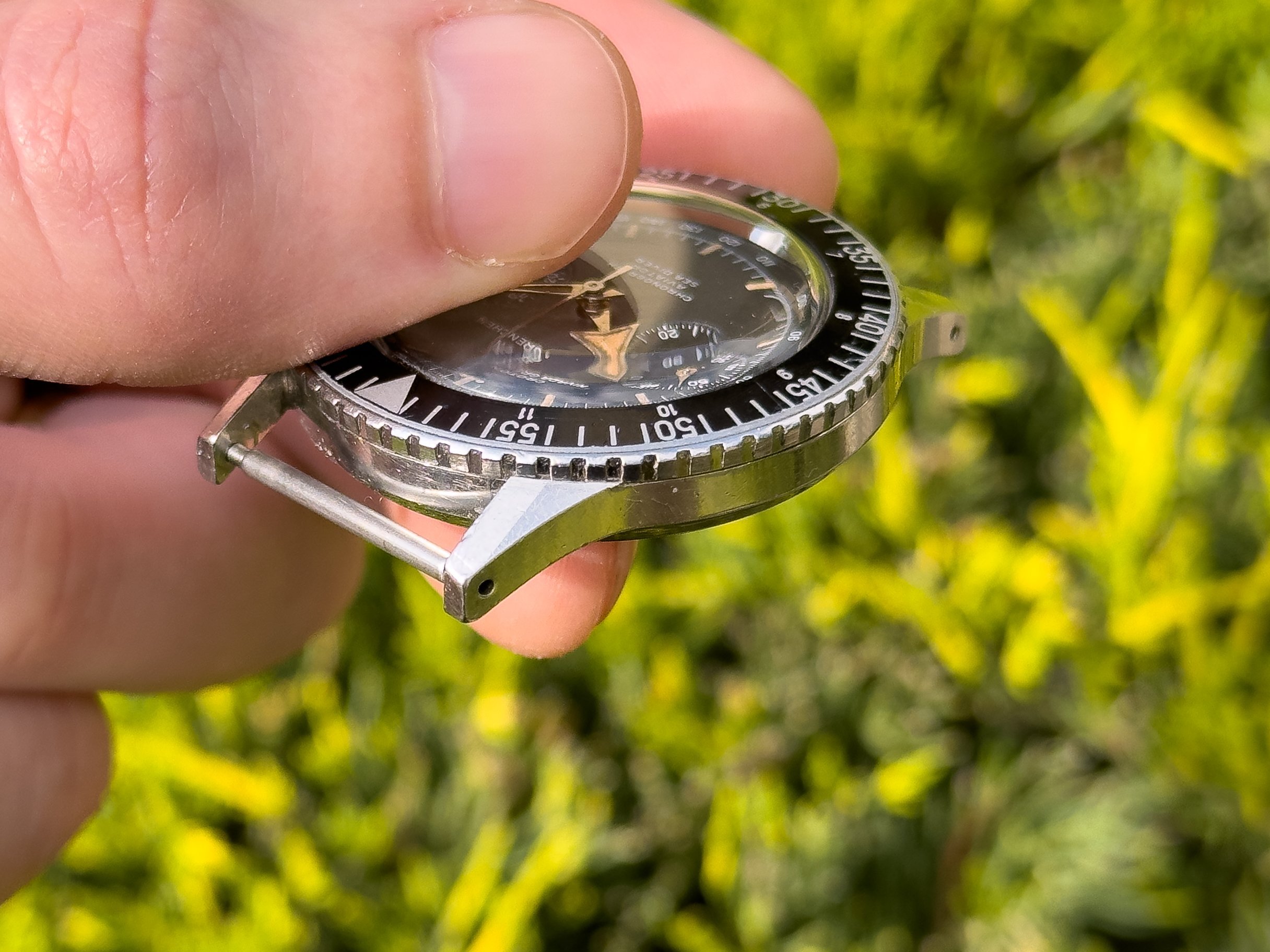Overall, for being 63 years young, this piece is in great condition. As I haven’t been with it since new, I can’t say it is unpolished, but I can say it retains its sharp case lines. However, it does of course show wear commensurate with age. The 38mm case accepts 20mm straps and is a very comfortable size to wear. The bezel rotates in both directions as it should. The matte black dial is in excellent condition, and like the hands, retains the original radium lume. The start/stop & reset pusher engage nicely, operate as they should, and the hands reset precisely. The crown winds smoothly. If you have any questions, please don’t hesitate to reach out. I have run out of straps to give away, so this is being offered as head only.