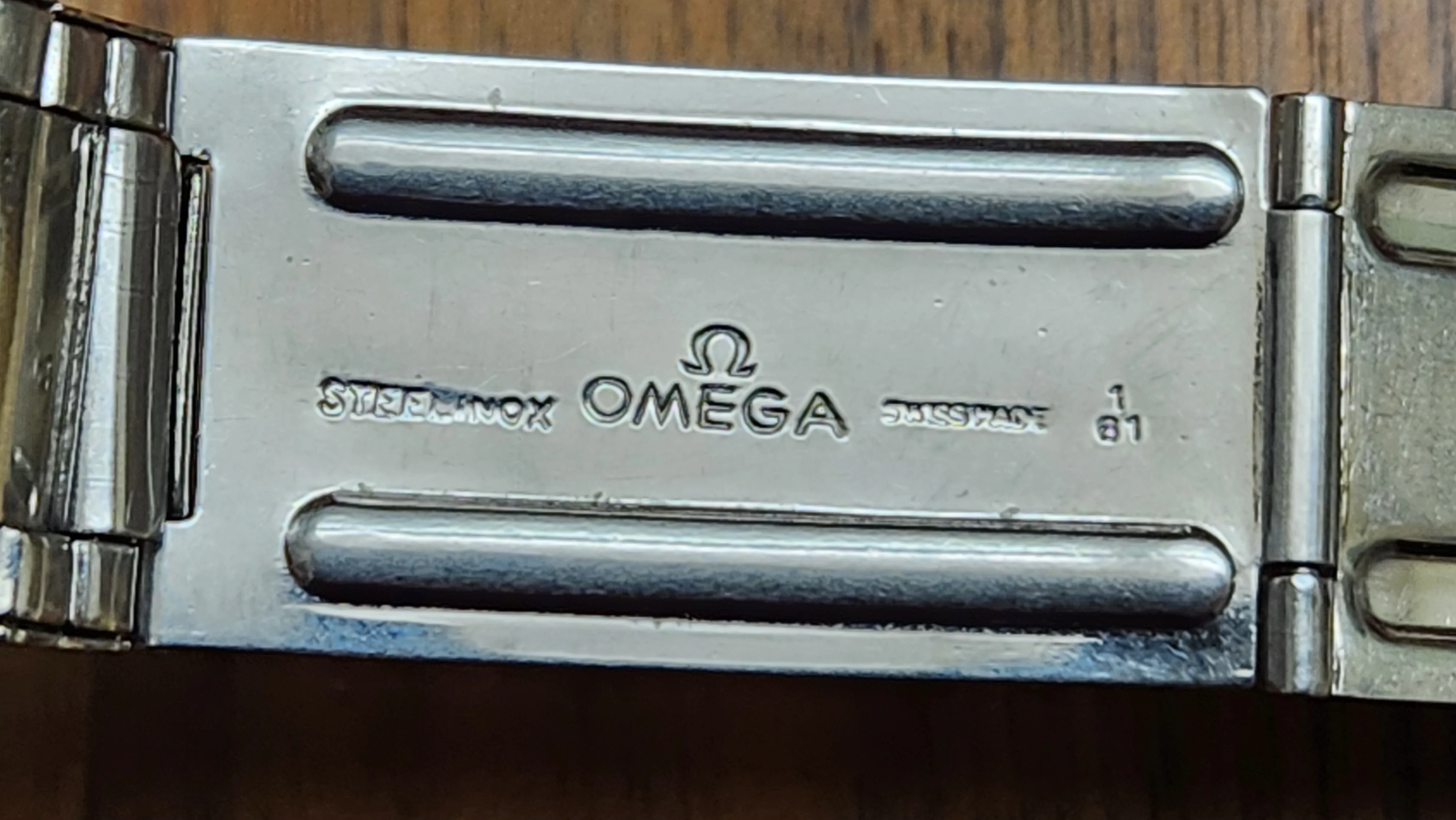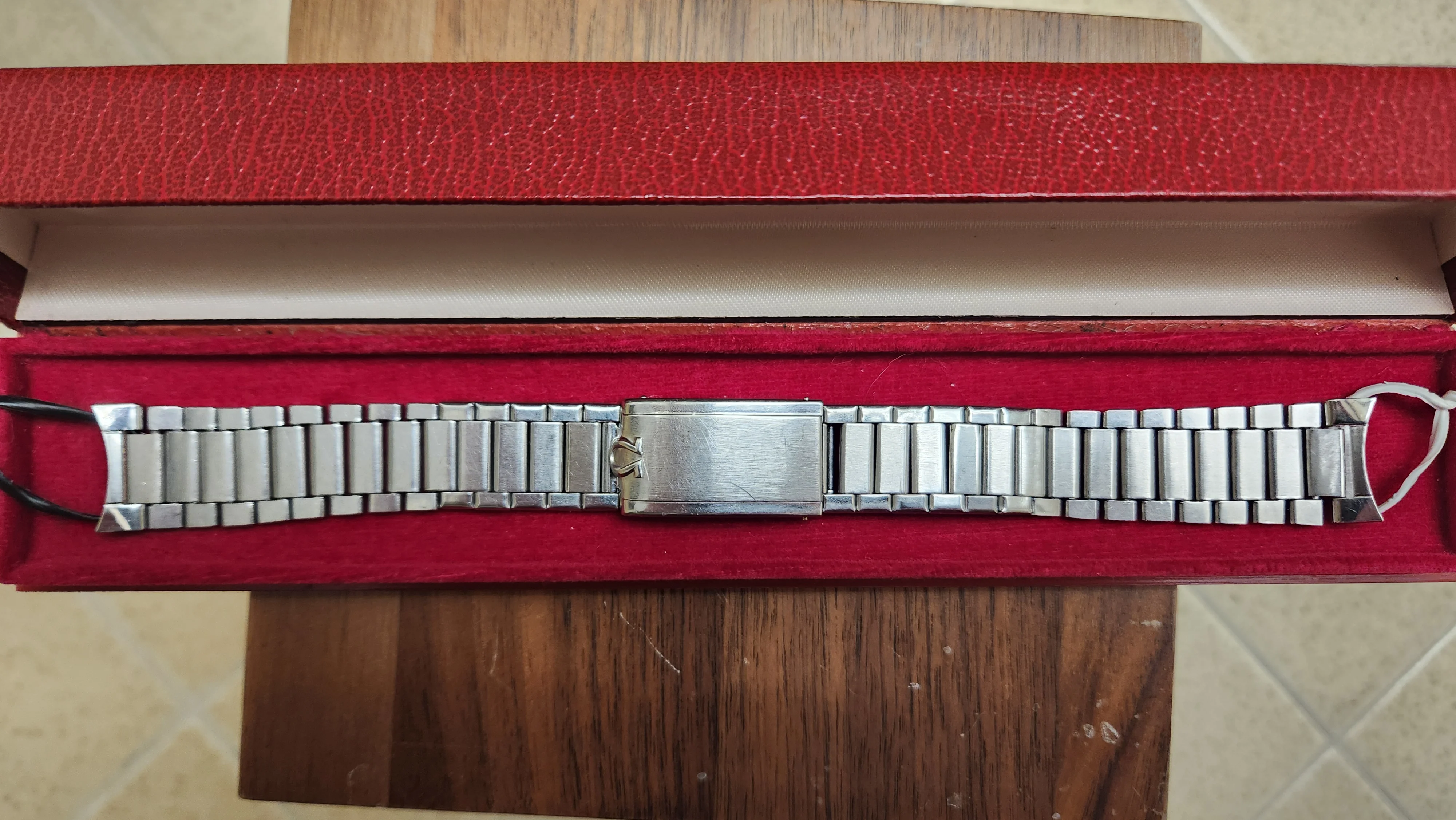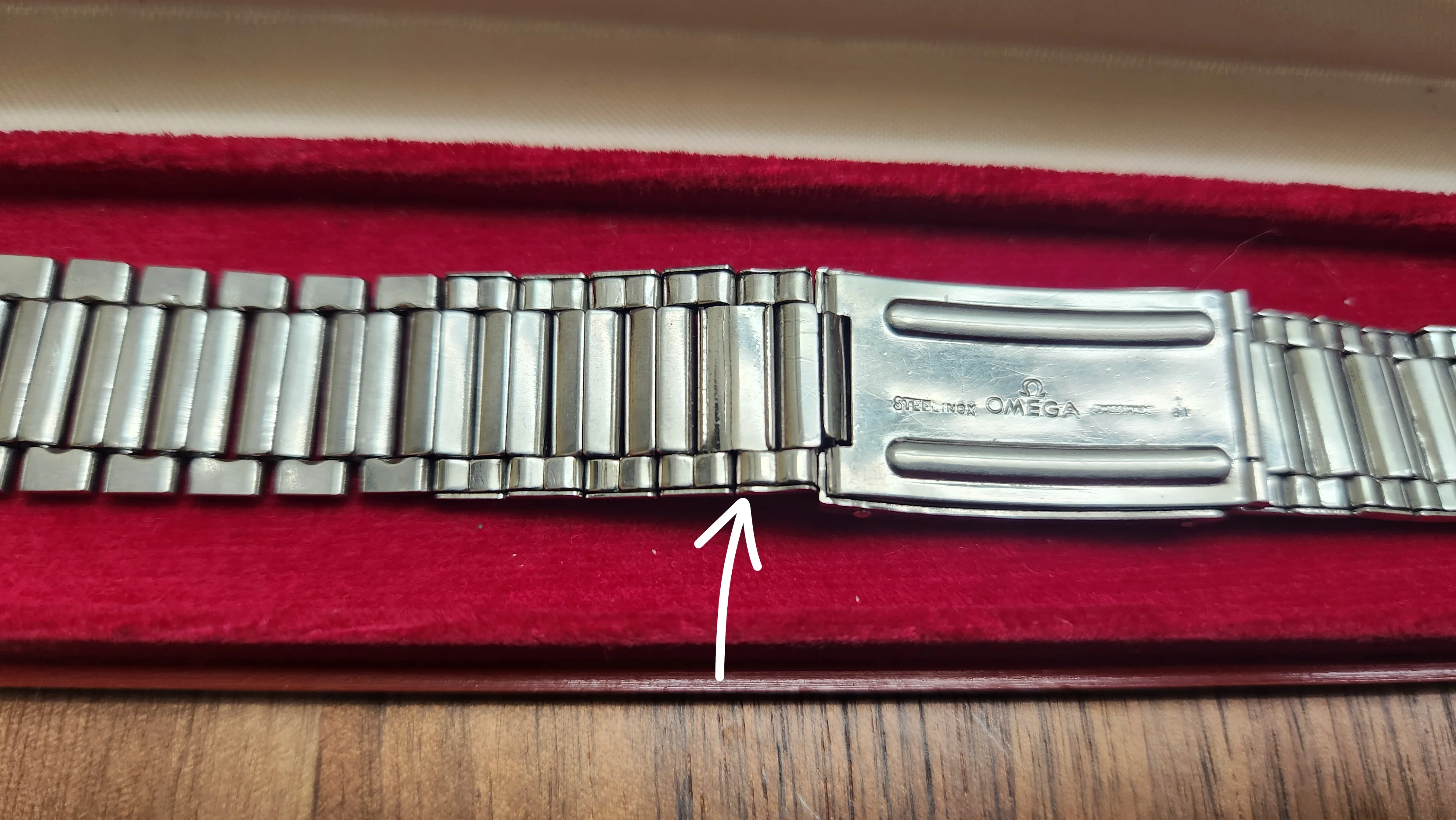 ·Here is a very nice a full length transitional Omega Flatlink 7077 stainless steel bracelet from the first quarter of 1961. It is complete with 16 (8+8) permanent solid tapering links and 10 (6+4) spring links plus one added quick-remove spring link. The bracelet has relatively tight links and its original alternating brushed and polished finish and has seen very little if any re-polishing. This is especially evident on the very sharp clasp cover which is the long version (ie. transitioning to the 7912).