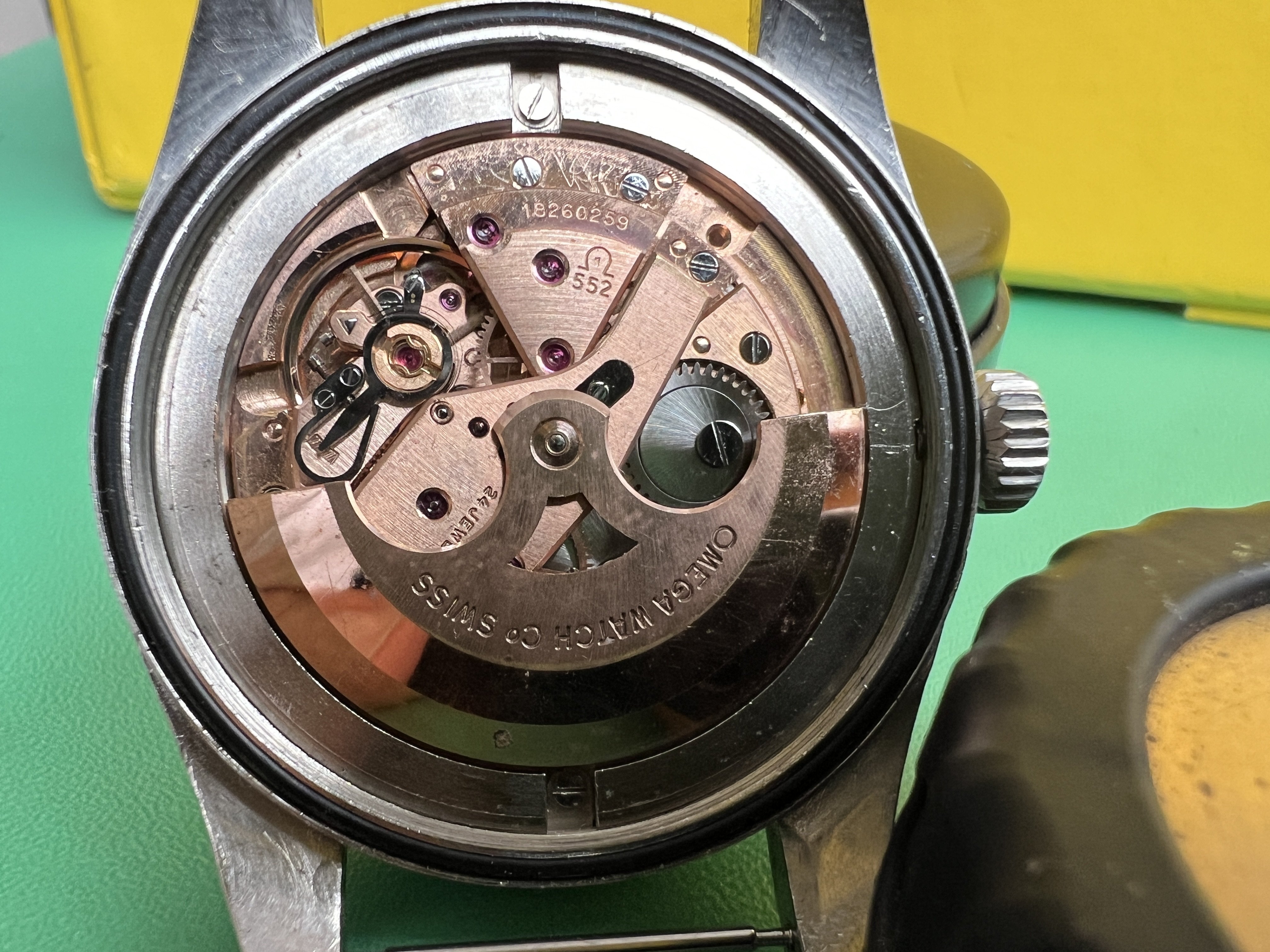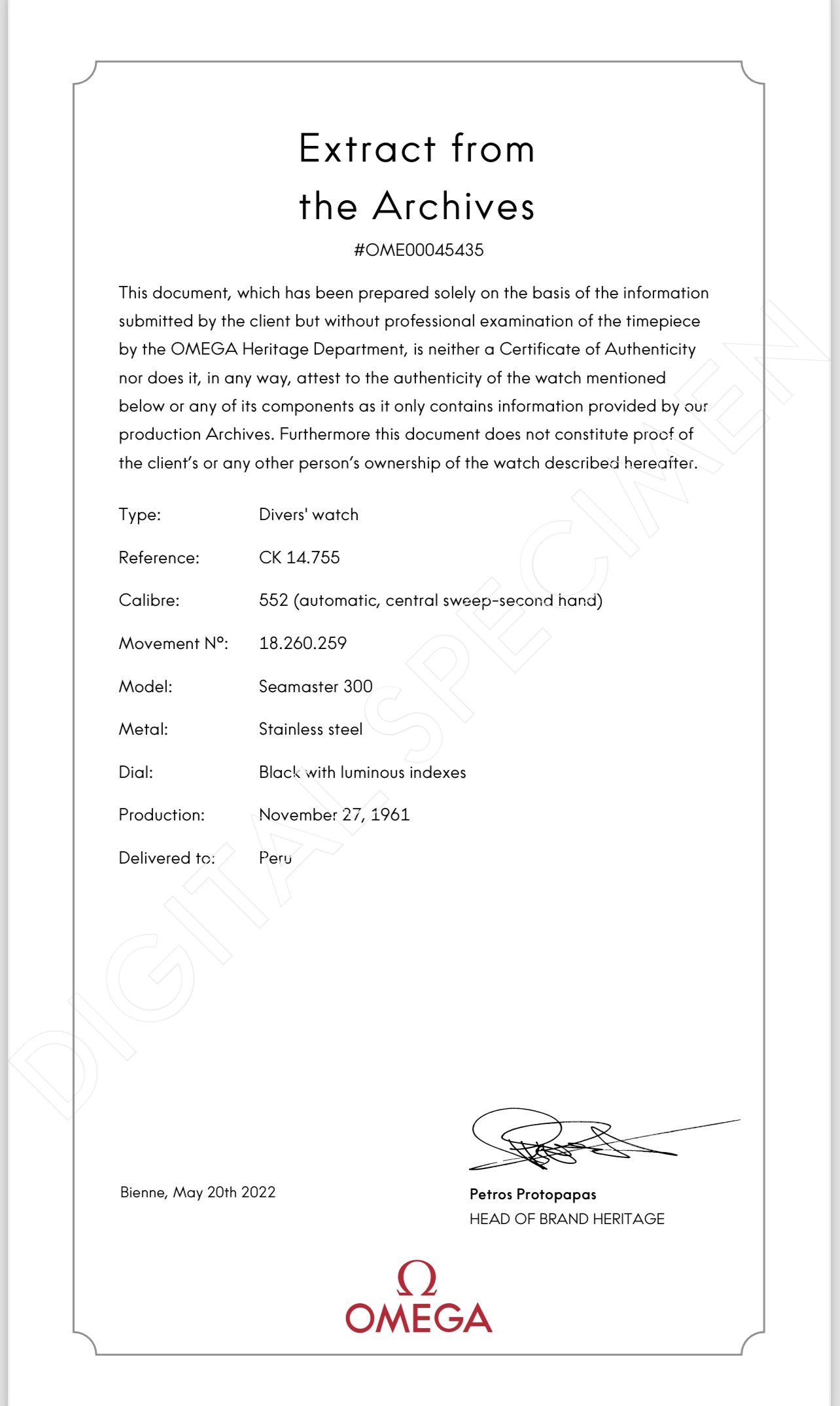 The watch was recently serviced by Simon Freese in November of 2022. It comes with an extract of the archives from Omega.