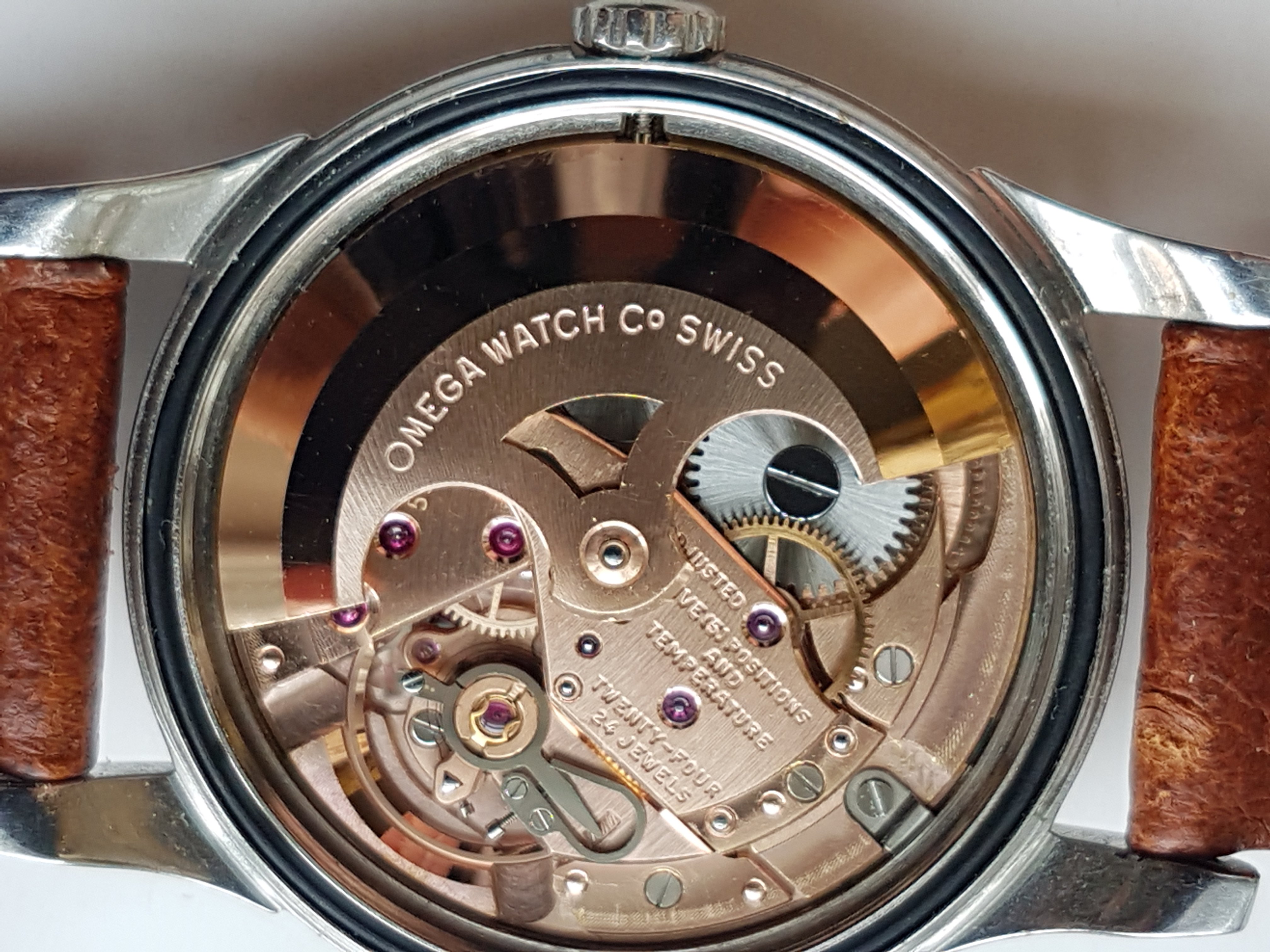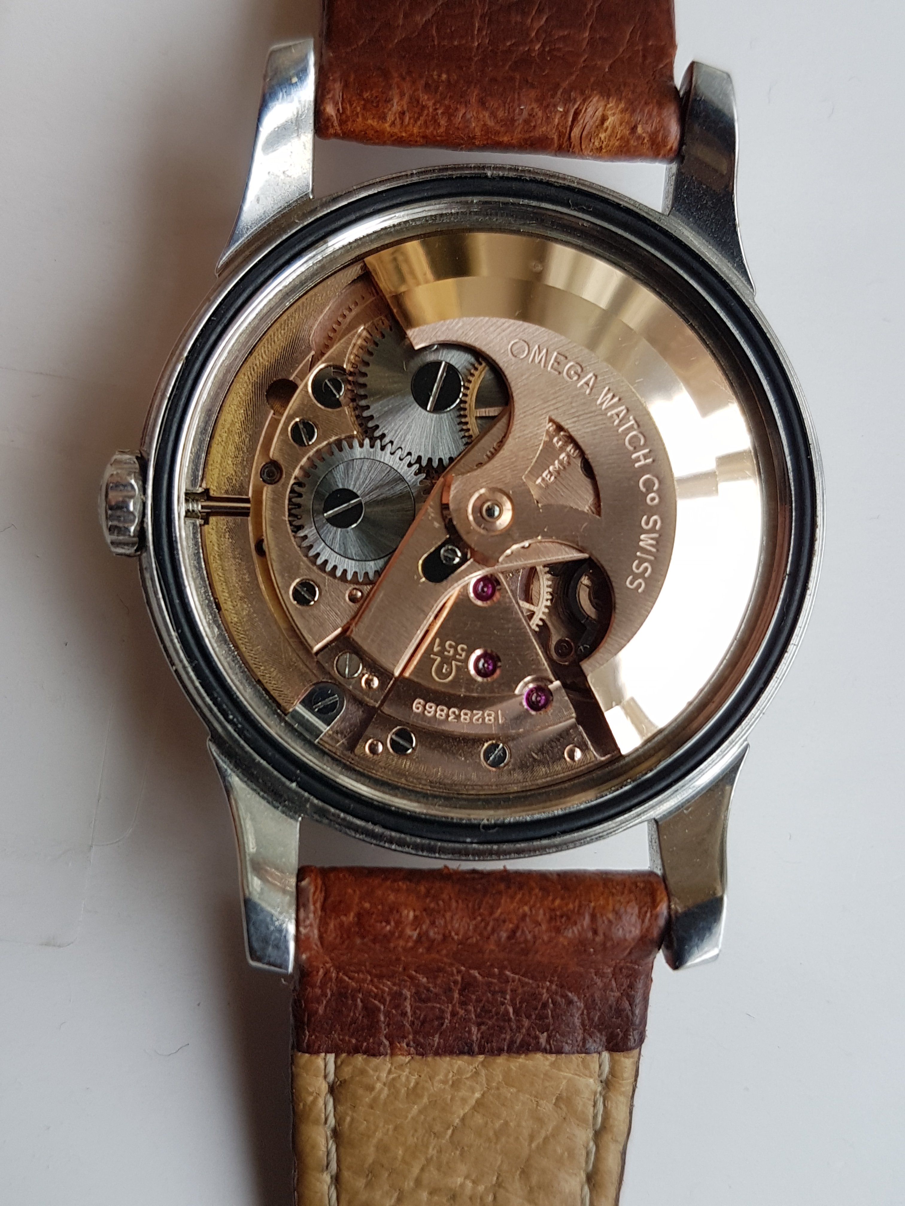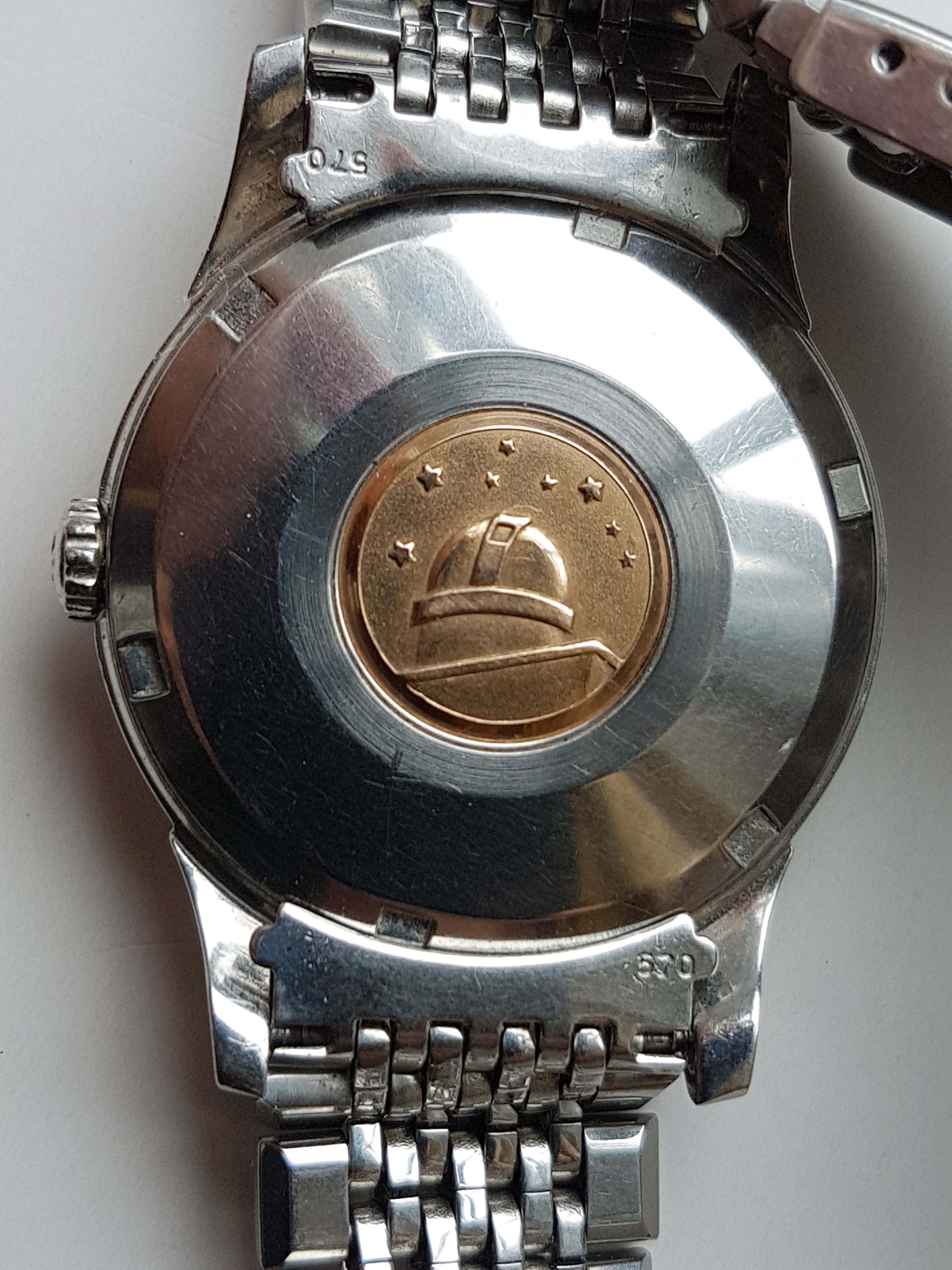 ·I am only selling this watch because I hardly ever wear it (my 2852 gets the pie pan wrist time). It was last serviced in September 2017 by Richard Askham and has kept time very nicely on the few occasions I've worn it since. The 551 movement dates to around 1961. It comes with a genuine 1068 Omega BOR with 570 end links which I put on it after buying it head only in 2012. The crown is almost certainly original to the watch. The furniture on the original, unrefinished dial and medallion are rose gold. You can see the sharpness of the case in the photos.